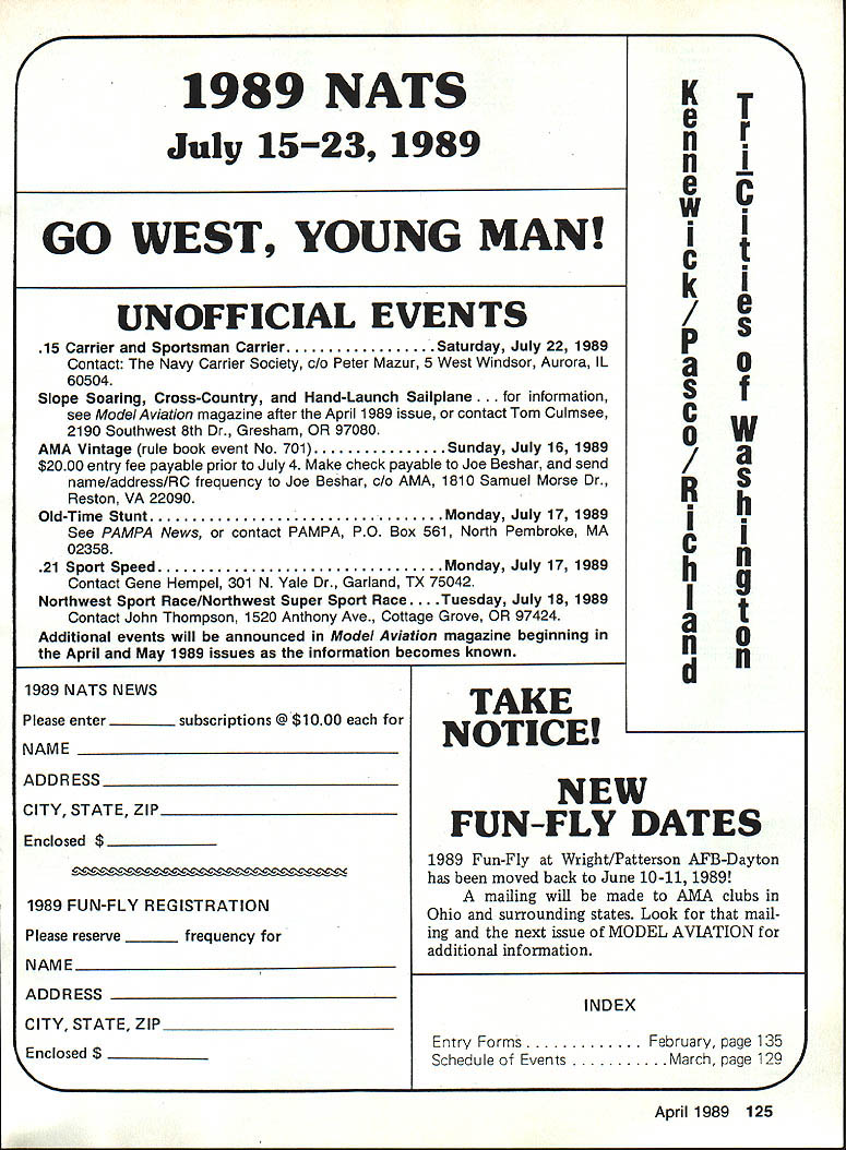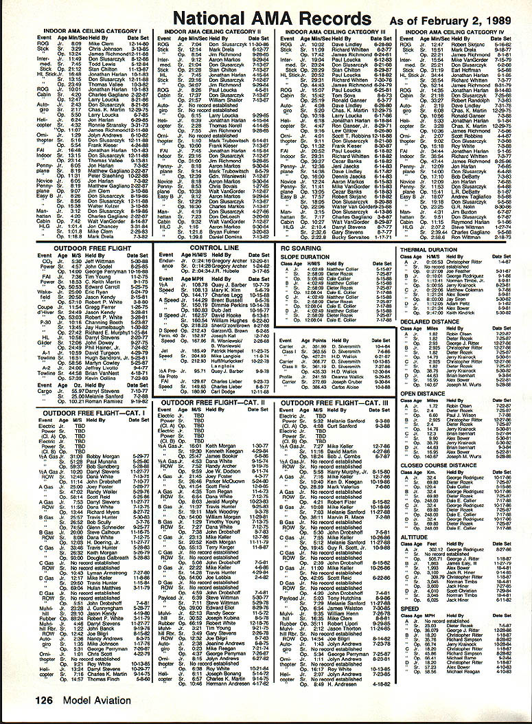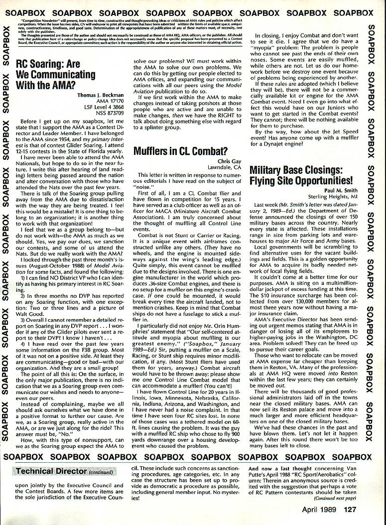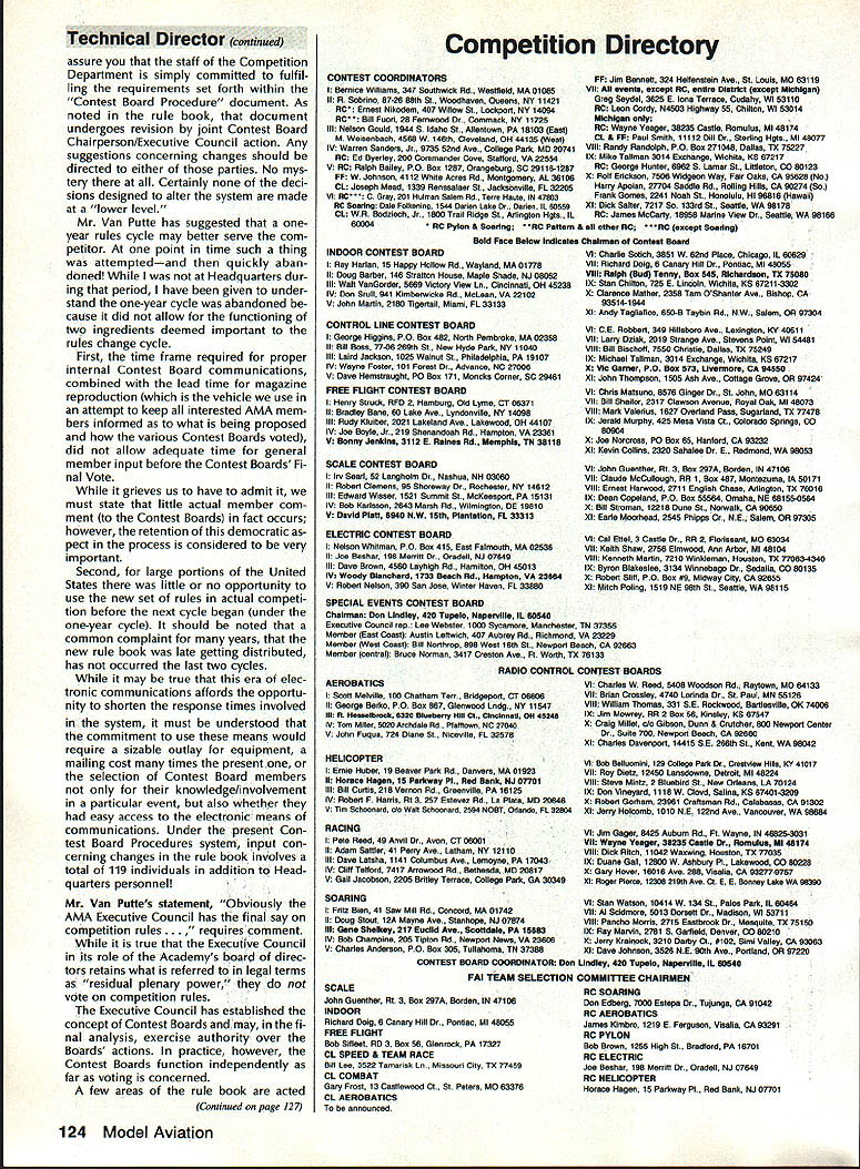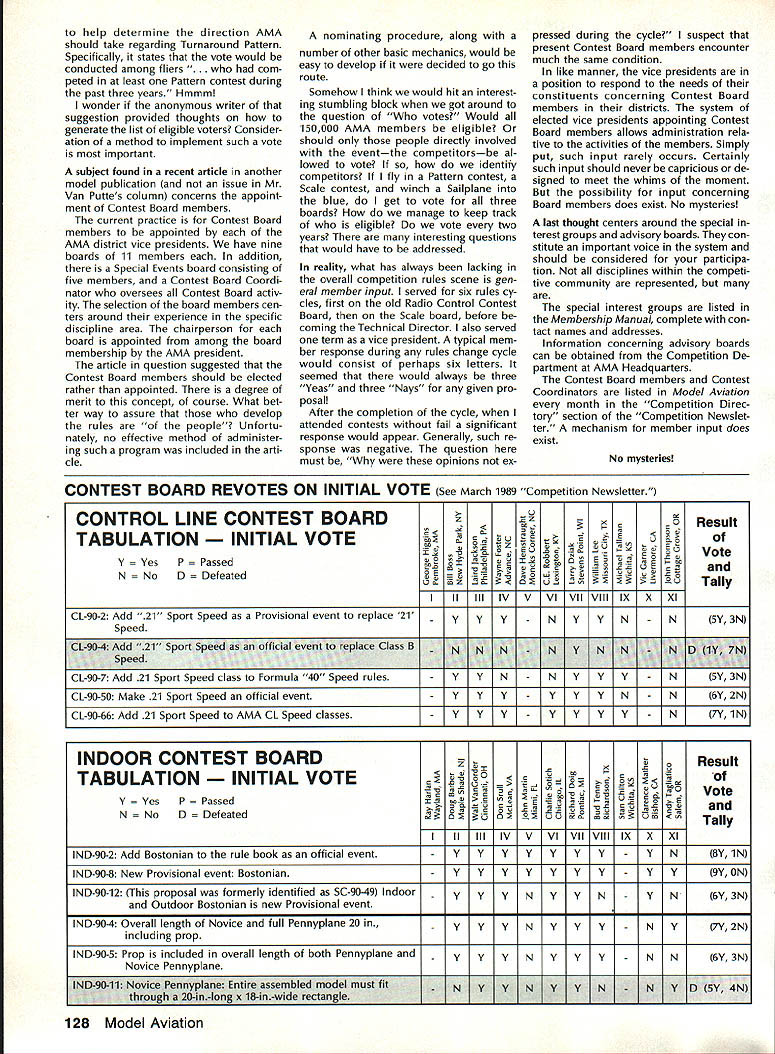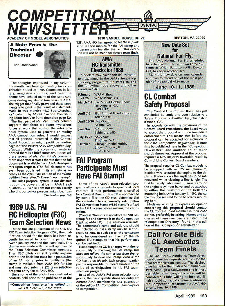 COMPETIT~ w NE WSLETT&i ACADEMY OF MODEL AERONAUTICS Note Technical Director Bob Underwood thoughts expressed column month have germinating con siderable period time Comments let ters magazine columns over phone have echoed same con cerns during almost four years AMA trigger finally provoked com ments print result statements made months RC Sport/Aerobat ics column Model Aviation Contribut ing Editor Ron Van Putte found page 52 first part Mr Van Puttes column suggests some mysterious forces work control rules pro posal system used generate modify AMA competition rules would suggest persons interested Contest Board Procedures might profit reading page 2 1988/89 AMA Competition Reg ulations column material printed brief summary does ad dress several Mr Van Puttes concerns important states therein full document available AMA Headquar ters upon request full document has published its entirety re cently April 1988 edition Com petition Newsletter no mystery rules proposal system dictated .by powers AMA Head quarters certain exactly person persons might can Continued page 124 1989 US FAI RC Helicopter F3C Team Selection News Due late publication US FAI F3C Team Selection Program TSP qual ification period finals has re cently increased cover period tween January 1988 team finals change made full approval Team Selection Committee members Thus F3C pilots can still qualify anytime prior finals must possession FAI stamp prior qualifying stamp available AMA HQ $10 must also submit $20 team selection program entry fee AMA HQ Since some pilots have qualified contests held prior publication U AkA* U 1810 SAMUEL MORSE DRIVE TSP AMA HQ has agreed let pilots send monies FAI stamp program entry fee after fact excep tion will made future team finals Some AMAs team-selection pro grams allow contestants qualify local contestsif performance certified Contest Director CD approached such flier CD must determine contestant has currently valid yellow FAI Competition Stamp $10 stamp affixed AMA license before making certifi cation Contest Directors may collect $10 FAI stamp fee forward Competition Dept AMA HQ situation warrants contestants name address should included stamp may sent di rectly him such cases contestant considered having re quired FAI stamp performance can certified though CD charged re sponsibility checking FAI stamp does relieve contestant re sponsibility have stamp CD fails job program partici pant responsible inform himself rules participation FAI teamselection program AMAs FAI team-selection pro grams basic qualifications entry current AMA membership possession yellow FAI Competition Stampprior competition RESTON VA 22090 CL Combat Safety Proposal Control Line Contest Board has just concluded its study vote relative Safety Proposal submitted John Salvin Orinda CA accordance provisions Contest Board Procedures Board voted accept proposal no immediate enforcement means before proposal can accepted inclusion AMA Competition Regulations must first published Competition Newsletter another ballot taken shortly thereafter Approval proposal requires 60% majority favorable result Control Line Contest Board members proposal requires CL Combat models equipped 027 minimum braided wire securing engine air plane also allows airplanes ma neuvered clearing line tangle braided safety cable must fit snugly around engines cylinder barrel attached either pushrod bellcrank mounting bolt After January 1 1990 ca ble must secured bellcrank mount ing bolt Modelers wishing express opinion concerning proposal should contact CL Contest Board member AMA district preferably writing Names ad dresses members listed Competition Directory found edi tion Competition Newsletter April 1989 123 FAI Program Participants Must Have FAI Stamp Competition Newsletter edited Ross B McMullen AMA 18181 Technical Director co,ued assure staff Competition Department simply committed fulfil ling requirements set forth within Contest Board Procedure document As noted rule book document undergoes revision joint Contest Board Chairperson/Executive Council action Any suggestions concerning changes should directed either parties No mys tery Certainly deci sions designed alter system made lower level Mr Van Putte has suggested oneyear rules cycle may better serve com petitor point time such thing attemptedand quickly aban doned Headquarters dur ing period have given under stand one-year cycle abandoned cause did allow functioning two ingredients deemed important rules change cycle First time frame required proper internal Contest Board communications combined lead time magazine reproduction vehicle use attempt keep interested AMA mem bers informed what being proposed various Contest Boards voted did allow adequate time general member input before Contest Boards Fi nal Vote grieves us have admit must state little actual member com ment Contest Boards fact occurs however retention democratic pect process considered very important Second large portions United States little no opportunity use new set rules actual competi tion before next cycle began under one-year cycle should noted common complaint years new rule book late getting distributed has occurred last two cycles may true era elec tronic communications affords opportu nity shorten response times involved system must understood commitment use means would require sizable outlay equipment mailing cost times present selection Contest Board members knowledge/involvement particular event also whether easy access electronic means communications Under present Con test Board Procedures system input con cerning changes rule book involves total 119 individuals addition Head quarters personnel Mr Van Puttes statement Obviously AMA Executive Council has final say competition rules. requires comment true Executive Council its role Academys board direc tors retains what referred legal terms residual plenary power vote competition rules Executive Council has established concept Contest Boards may fi nal analysis e
