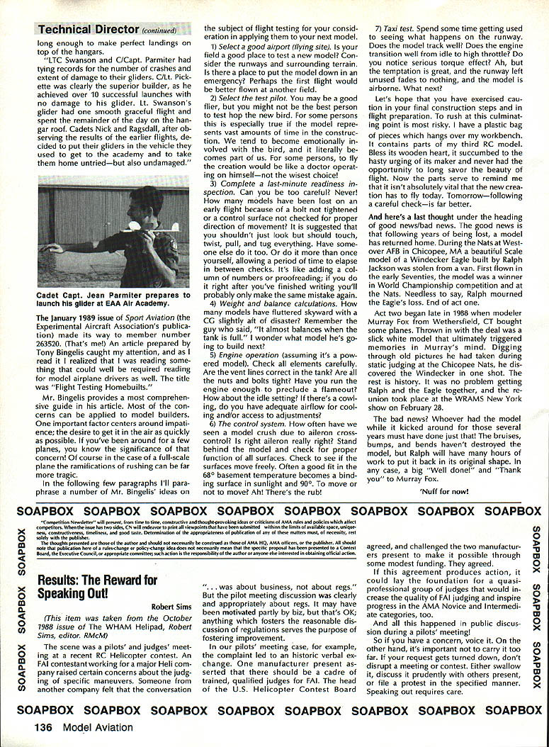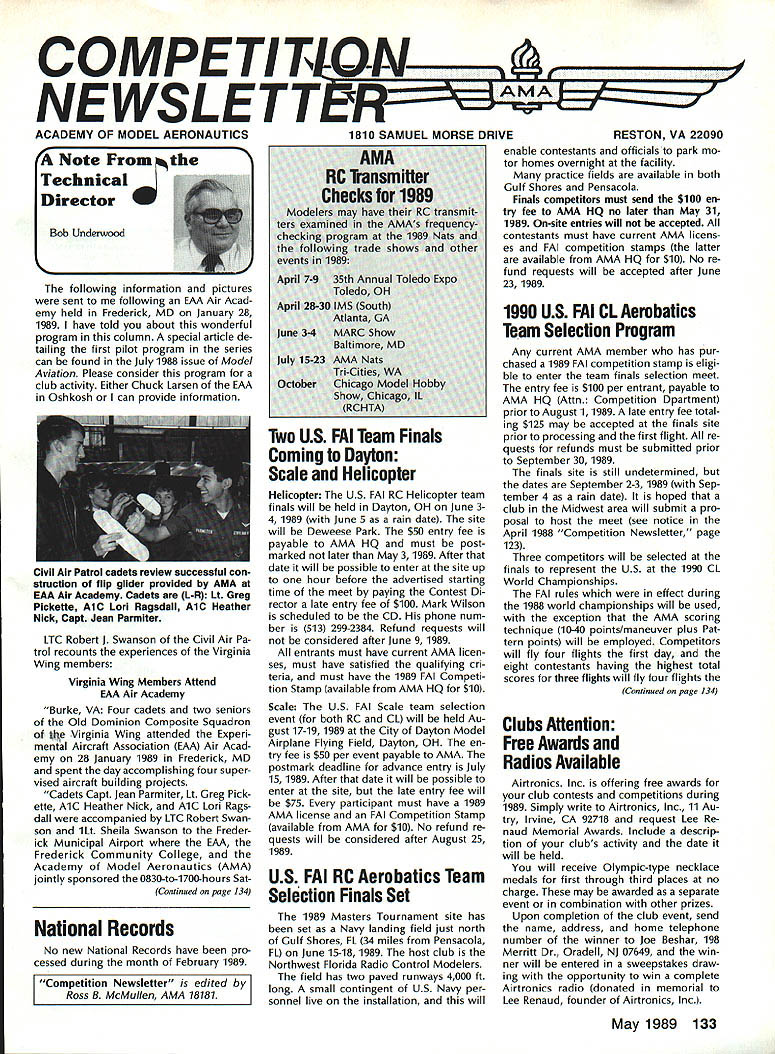 COMPETITION NEWSLETTER ACADEMY OF MODEL AERONAUTICS 1810 SAMUEL MORSE DRIVE RESTON VA 22090 Note Technical Director W Bob Underwood following information pictures sent following EAA Air Acad emy held Frederick MD January 28 1989 have told about wonderful program column special article de tailing first pilot program series can found July 1988 issue Model Aviation Please consider program club activity Either Chuck Larsen EAA Oshkosh can provide information LTC Robert J Swanson Civil Air Pa trol recounts experiences Virginia Wing members Virginia Wing Members Attend EAA Air Academy Burke VA Four cadets two seniors Old Dominion Composite Squadron e Virginia Wing attended Experi mental Aircraft Association EAA Air Acad emy 28 January 1989 Frederick MD spent day accomplishing four super vised aircraft building projects Cadets Capt Jean Parmiter Lt Greg Pick ette AiC Heather Nick AiC Lori Rags dalI accompanied LTC Robert Swan son lit Sheila Swanson Freder ick Municipal Airport EAA Frederick Community College Academy Model Aeronautics AMA jointly sponsored 0830-to-1700-hours SatContinued page 134 National Records No new National Records have pro cessed during month February 1989 Two US FAI Team Finals Coming Dayton Scale Helicopter Helicopter The US FAI RC Helicopter team finals will held Dayton OH June 34 1989 June 5 rain date site will Deweese Park $50 entry fee payable AMA HQ must post marked later May 3 1989 After date will possible enter site up hour before advertised starting time meet paying Contest Di rector late entry fee $100 Mark Wilson scheduled CD phone num ber 513 299-2384 Refund requests will considered after June 9 1989 entrants must have current AMA licen ses must have satisfied qualifying cri teria must have 1989 FAI Competi tion Stamp available AMA HQ $10 Scale The US FAI Scale team selection event both RC CL will held Au gust 17-19 1989 City Dayton Model Airplane Flying Field Dayton OH en try fee $50 per event payable AMA postmark deadline advance entry July 15 1989 After date will possible enter site late entry fee will $75 participant must have 1989 AMA license FAI Competition Stamp available AMA $10 No refund re quests will considered after August 25 1989 US FAI RC Aerobatics Team Selection Finals Set 1989 Masters Tournament site has set Navy landing field just north Gulf Shores FL 34 miles Pensacola FL June 15-18 1989 host club Northwest Florida Radio Control Modelers field has two paved runways 4000 ft long small contingent US Navy per sonnel live installation will enable contestants officials park mo tor homes overnight facility practice fields available both Gulf Shores Pensacola Finals competitors must send $100 en try fee AMA HQ no later May 31 1989 On-site entries will accepted contestants must have current AMA licens es FAI competition stamps latter available AMA HQ $10 No re fund requests will accepted after June 23 1989 1990 US FAI CL Aerobatics Team Selection Program Any current AMA member has pur chased 1989 FAI competition stamp eligi ble enter team finals selection meet entry fee $100 per entrant payable AMA HQ Attn Competition Dpartment prior August 1 1989 late entry fee total ing $125 may accepted finals site prior processing first flight re quests refunds must submitted prior September 30 1989 finals site still undetermined dates September 2-3 1989 Sep tember 4 rain date hoped club Midwest area will submit pro posal host meet see notice April 1988 Competition Newsletter page 123 Three competitors will selected finals represent US 1990 CL World Championships FAI rules effect during 1988 world championships will used exception AMA scoring technique 10-40 points/maneuver plus Pat tern points will employed Competitors will fly four flights first day eight contestants having highest total scores three flights will fly four flights Continued page 134 Clubs Attention Free Awards Radios Available Airtronics Inc offering free awards club contests competitions during 1989 Simply write Airtronics Inc 11 Autry Irvine CA 92718 request Lee Re naud Memorial Awards Include descrip tion clubs activity date will held will receive Olympic-type necklace medals first through third places no charge may awarded separate event combination other prizes Upon completion club event send name address home telephone number winner Joe Beshar 198 Merritt Dr Oradell NJ 07649 win ner will entered sweepstakes draw ing opportunity win complete Airtronics radio donated memorial Lee Renaud founder Airtronics Inc May1989 133 AMA RC Transmitter Checks 1989 Modelers may have RC transmit ters examined AMAs frequencychecking program 1989 Nats following trade shows other events 1989 April 7-9 35th Annual Toledo Expo Toledo OH April 20-30 IMS South Atlanta GA June 3-4 MARC Show Baltimore MD July 15-23 AMA Nats Tn-Cities WA October Chicago Model Hobby Show Chicago IL RCHTA Civil Air Patrol cadets review successful con structIon flip glider provided AMA EAA Air Academy Cadets L-R Lt Greg Pickette AiC Lan Ragsdall AiC Heather Nick Capt Jean Parmiter Competition Newsletter edited Ross B McMullen AMA 18181 CL Aerobatics Prgm ig next day total best three flights determine final placement further information contact FAI CL Aerobatics Team Selection Committee Chairman Pete Bergstrom 4219 201st Ct E Spanaway WA 98387-6714 Teehnlcal Director ctid urday academy During academy videotapes explain ing interests activities EAA AMA shown Aircraft building proj ects supervised attendee individually built full-size working turnand-slip indicator 30-in balsa wing rib 10-in sample styrofoam wing exten sively sanded superglue-bonded light weight flying glider Cleanliness cut edge plas tic tubing used hold mineral oil turn slip indicator either determined leak-fastness instrument re sulted spreading oil slick around cadets uniform pocket less-than leakproof instrument tucked away pocket trip home High winds airport gliderlaunch time produced record-setting flights two dimensions less-thanaeronautically-balanced aircraft f