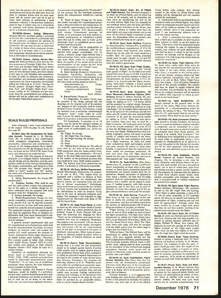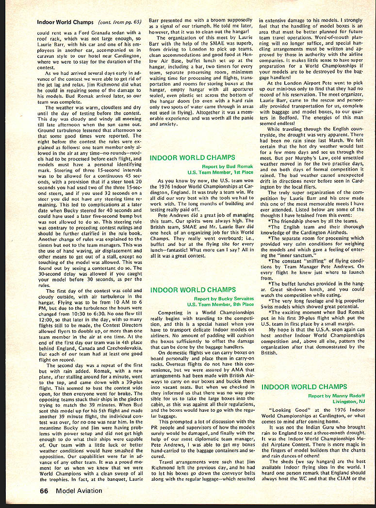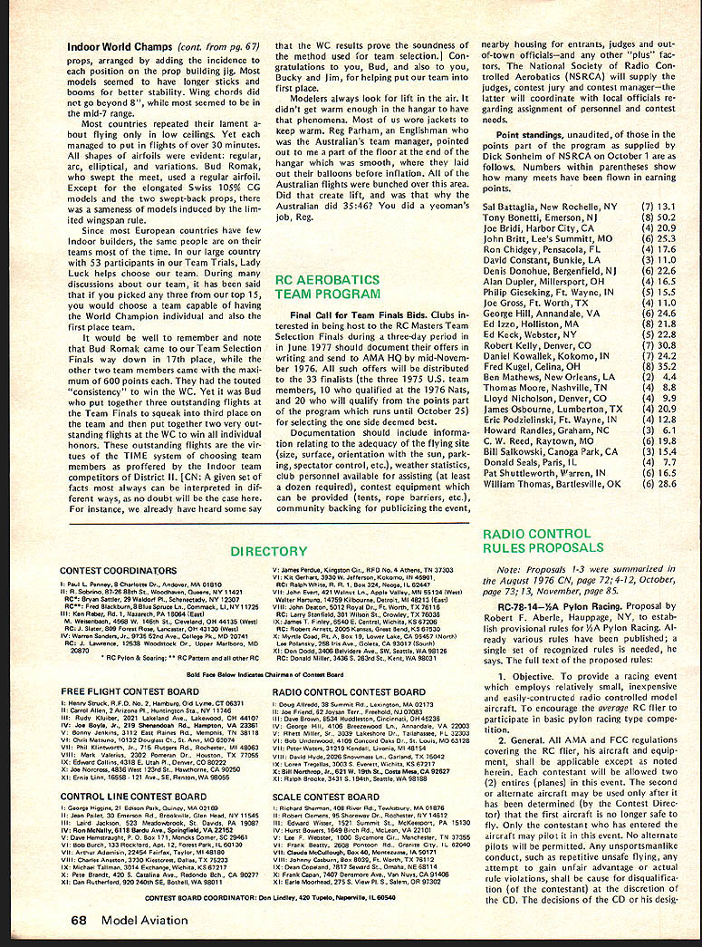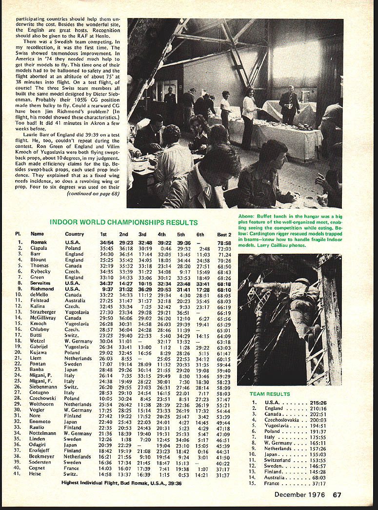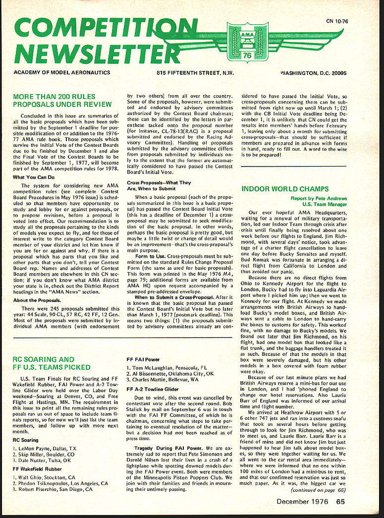 COM PETI TW&I NE WSLETTEREU~ ACADEMY OF MODEL AERONAUTICS MORE THAN 200 RULES PROPOSALS UNDER REVIEW Concluded issue summaries basic proposals have sub mitted September 1 deadline pos sible modification addition 197677 AMA rule book proposals survive Initial Vote Contest Boards due finished December 1 also Final Vote Contest Boards finished September 1 1977 will become part AMA competition rules 1978 What Can system considering new AMA competition rules see complete Contest Board Procedures May 1976 issue sched uled members have opportunity study lobby against proposals propose revisions before proposal voted effect recommendation study proposals pertaining kinds models expect fly interest write category Contest Board member district let him know against proposal has parts like other parts dont tell Contest Board rep Names addresses Contest Board members elsewhere CN sec tion dont know what AMA district state check out District Report headings AMA News section About Proposals 245 proposals submitted year 44 Scale 90 CL 57 RC 42 FF 12 Gen Most proposals submitted dividual AMA members endorsement RC SOARING AND FF US TEAMS PICKED US Team Finals RC Soaring FF Wakefield Rubber FAI Power A-2 Towline Glider held over Labor Day weekendSoaring Denver CO Free Flight Hastings MN requirement issue print remaining rules pro posals ran us out space include team fi nals reports now well just list team members follow up next month RC Soaring 1 LeMon Payne Dallas TX 2 Skip Miller Boulder CO 3 Dale Nutter Tulsa OK FF Wakefield Rubber 1 Walt Ghio Stockton CA 2 Phedon Tsiknopoulos Los Angeles CA 3 Robert Piserchio San Diego CA 815 FIFTEENTH STREET NW two others over country Some proposals however submit ted endorsed advisory committees authorized Contest Board chairman can identified letters par enthese tacked onto proposal number instance CL-78-13RAC proposal submitted endorsed Racing Ad visory Committee Handling proposals submitted advisory committee differs proposals submitted individuals ly extent former automat ically considered have passed Contest Boards Initial Vote Cross ProposalsWhat Are Submit basic proposal propo sals summarized issue basic propo sal has passed Contest Board Initial Vote has deadline December 1 crossproposal may submitted seek modifica tion basic proposal other words perhaps basic proposal pretty good maybe little twist change detail would improvementthats cross-proposals main purpose Form Use Cross-proposals must sub mitted standard Rules Change Proposal Form same used basic proposals form printed May 1976 MA page 79 additional forms available AMA HQ upon request accompanied stamped pre-addressed envelope Submit Cross-Proposal After known basic proposal has passed Contest Boards Initial Vote no later March 1 1977 postmark deadline means two things 1 proposals submit ted advisory committees already conFF FAI Power 1 Tom McLaughlan Pensacola FL 2 Al Bissonnette Oklahoma City OK 3 Charles Martin Bellevue WA FF A-2 Towline Glider Due wind event cancelled contestant vote after second round Bob Stalick mail September 6 touch FAI FF Committee chairman concerning what steps take per taining eventual resolution matter decision reached press time Tragedy During FAI Power ex tremely sad report Pete Simonson Darold Nilsen lost lives crash lightplane spotting downed models dur ing FAI Power event Both members Minneapolis Piston Poppers Club join families friends mourn ing untimely passing WASHINGTON DC 20005 sidered have passed Initial Vote cross-proposals concerning can sub mitted right now up until March 1 2 CB Initial Vote deadline being De cember 1 unlikely CN could get results members hands before February 1 leaving about month submitting cross-proposalsthat should sufficient members prepared advance forms hand ready fill out word wise prepared INDOOR WORLD CHAMPS Report Pete Andrews US Team Manager ever hopeful AMA Headquarters waiting renewal military transporta tion led Indoor Team through crisis after crisis until finally being resolved about week before flights England Jim Rich mond several days notice took advan tage charter flight cancellation leave day before Bucky Servaites myself Bud Romak fortunate arranging di rect flight California London thus avoided panic Because no direct flights Ohio Kennedy Airport flight London Bucky fly Laguardia Air port picked him up went Kennedy flight Kennedy made arrangements British Airways handload Buckys model boxes British Air ways sent cable London hand-carry boxes customs safety worked fine no damage Buckys models found out later Jim Richmond flight model box looked like flat trunk baggage handlers treated such Because models box severely damaged other models box covered foam rubber okay Because last minute plans British Airways reserve mini-bus use London phoned England change hotel reservations Also Laurie Barr England informed arrival time flight number arrived Heathrow Airport 5 6 other 747 jets ran customs snafu took us several hours before getting through look Jim Richmond meet us Laurie Barr Laurie Barr friend did know Jim just happened hear Jim talk about model box es together waiting us went car rental area immediately informed no within 100 miles London mini-bus rent confirmed reservation just much paper As biggest car continued page 66 December1976 65 CN 10-76 Indoor World Champs cant pg 65 could rent Ford Granada sedan roof rack large enough Laurie Barr car em ployees another car accompanied us caravan style hotel near Cardington stay duration contest As arrived several days early ad vance contest able get rid jet lag relax Jim Richmond did what could repairing some damage models Bud Romak arrived later team complete weather warm cloudless dry until day testing before contest day cloudy windy morning till late afternoon sun came out Ground turbulence lessened afternoon some good times reported night before contest rules ex plained follows team member al lowed air timeno roundsmod els processed before flight models must have pe