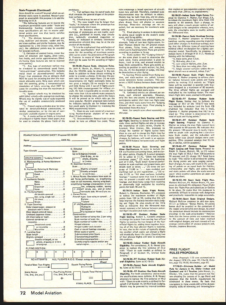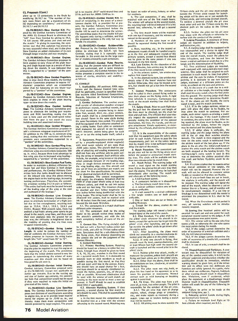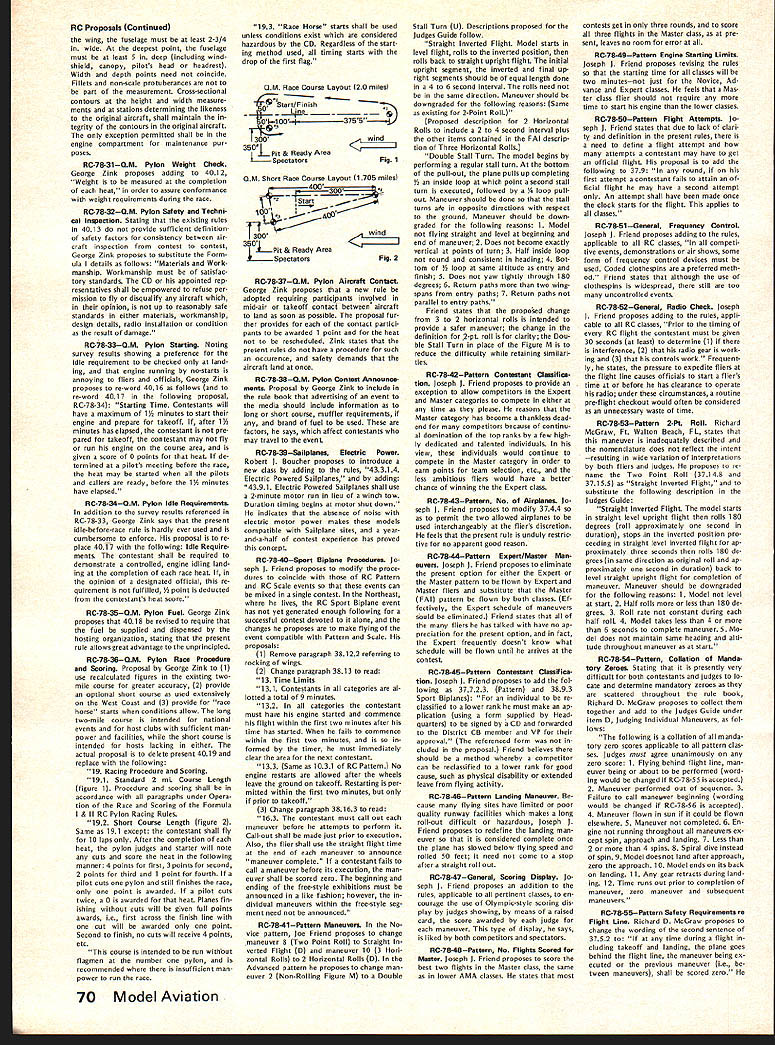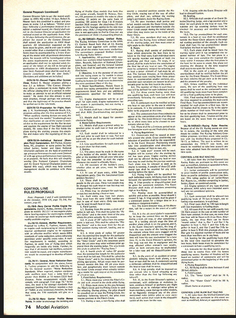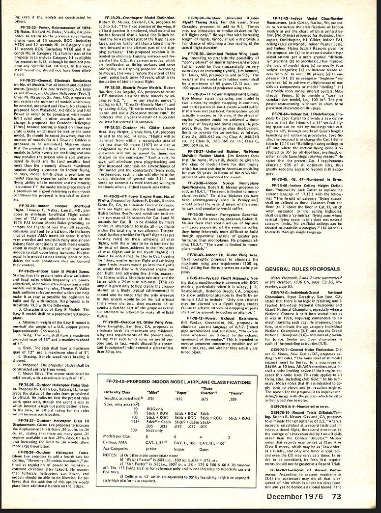 COM PETI TW&I NE WSLETTEREU~ ACADEMY OF MODEL AERONAUTICS MORE THAN 200 RULES PROPOSALS UNDER REVIEW Concluded issue summaries basic proposals have sub mitted September 1 deadline pos sible modification addition 197677 AMA rule book proposals survive Initial Vote Contest Boards due finished December 1 also Final Vote Contest Boards finished September 1 1977 will become part AMA competition rules 1978 What Can system considering new AMA competition rules see complete Contest Board Procedures May 1976 issue sched uled members have opportunity study lobby against proposals propose revisions before proposal voted effect recommendation study proposals pertaining kinds models expect fly interest write category Contest Board member district let him know against proposal has parts like other parts dont tell Contest Board rep Names addresses Contest Board members elsewhere CN sec tion dont know what AMA district state check out District Report headings AMA News section About Proposals 245 proposals submitted year 44 Scale 90 CL 57 RC 42 FF 12 Gen Most proposals submitted dividual AMA members endorsement RC SOARING AND FF US TEAMS PICKED US Team Finals RC Soaring FF Wakefield Rubber FAI Power A-2 Towline Glider held over Labor Day weekendSoaring Denver CO Free Flight Hastings MN requirement issue print remaining rules pro posals ran us out space include team fi nals reports now well just list team members follow up next month RC Soaring 1 LeMon Payne Dallas TX 2 Skip Miller Boulder CO 3 Dale Nutter Tulsa OK FF Wakefield Rubber 1 Walt Ghio Stockton CA 2 Phedon Tsiknopoulos Los Angeles CA 3 Robert Piserchio San Diego CA 815 FIFTEENTH STREET NW two others over country Some proposals however submit ted endorsed advisory committees authorized Contest Board chairman can identified letters par enthese tacked onto proposal number instance CL-78-13RAC proposal submitted endorsed Racing Ad visory Committee Handling proposals submitted advisory committee differs proposals submitted individuals ly extent former automat ically considered have passed Contest Boards Initial Vote Cross ProposalsWhat Are Submit basic proposal propo sals summarized issue basic propo sal has passed Contest Board Initial Vote has deadline December 1 crossproposal may submitted seek modifica tion basic proposal other words perhaps basic proposal pretty good maybe little twist change detail would improvementthats cross-proposals main purpose Form Use Cross-proposals must sub mitted standard Rules Change Proposal Form same used basic proposals form printed May 1976 MA page 79 additional forms available AMA HQ upon request accompanied stamped pre-addressed envelope Submit Cross-Proposal After known basic proposal has passed Contest Boards Initial Vote no later March 1 1977 postmark deadline means two things 1 proposals submit ted advisory committees already conFF FAI Power 1 Tom McLaughlan Pensacola FL 2 Al Bissonnette Oklahoma City OK 3 Charles Martin Bellevue WA FF A-2 Towline Glider Due wind event cancelled contestant vote after second round Bob Stalick mail September 6 touch FAI FF Committee chairman concerning what steps take per taining eventual resolution matter decision reached press time Tragedy During FAI Power ex tremely sad report Pete Simonson Darold Nilsen lost lives crash lightplane spotting downed models dur ing FAI Power event Both members Minneapolis Piston Poppers Club join families friends mourn ing untimely passing WASHINGTON DC 20005 sidered have passed Initial Vote cross-proposals concerning can sub mitted right now up until March 1 2 CB Initial Vote deadline being De cember 1 unlikely CN could get results members hands before February 1 leaving about month submitting cross-proposalsthat should sufficient members prepared advance forms hand ready fill out word wise prepared INDOOR WORLD CHAMPS Report Pete Andrews US Team Manager ever hopeful AMA Headquarters waiting renewal military transporta tion led Indoor Team through crisis after crisis until finally being resolved about week before flights England Jim Rich mond several days notice took advan tage charter flight cancellation leave day before Bucky Servaites myself Bud Romak fortunate arranging di rect flight California London thus avoided panic Because no direct flights Ohio Kennedy Airport flight London Bucky fly Laguardia Air port picked him up went Kennedy flight Kennedy made arrangements British Airways handload Buckys model boxes British Air ways sent cable London hand-carry boxes customs safety worked fine no damage Buckys models found out later Jim Richmond flight model box looked like flat trunk baggage handlers treated such Because models box severely damaged other models box covered foam rubber okay Because last minute plans British Airways reserve mini-bus use London phoned England change hotel reservations Also Laurie Barr England informed arrival time flight number arrived Heathrow Airport 5 6 other 747 jets ran customs snafu took us several hours before getting through look Jim Richmond meet us Laurie Barr Laurie Barr friend did know Jim just happened hear Jim talk about model box es together waiting us went car rental area immediately informed no within 100 miles London mini-bus rent confirmed reservation just much paper As biggest car continued page 66 December1976 65 CN 10-76 Indoor World Champs cant pg 65 could rent Ford Granada sedan roof rack large enough Laurie Barr car em ployees another car accompanied us caravan style hotel near Cardington stay duration contest As arrived several days early ad vance contest able get rid jet lag relax Jim Richmond did what could repairing some damage models Bud Romak arrived later team complete weather warm cloudless dry until day testing before contest day cloudy windy morning till late afternoon sun came out Ground turbulence lessened afternoon some good times reported night before contest rules ex plained follows team member al lowed air timeno roundsmod els processed before flight models must have pe