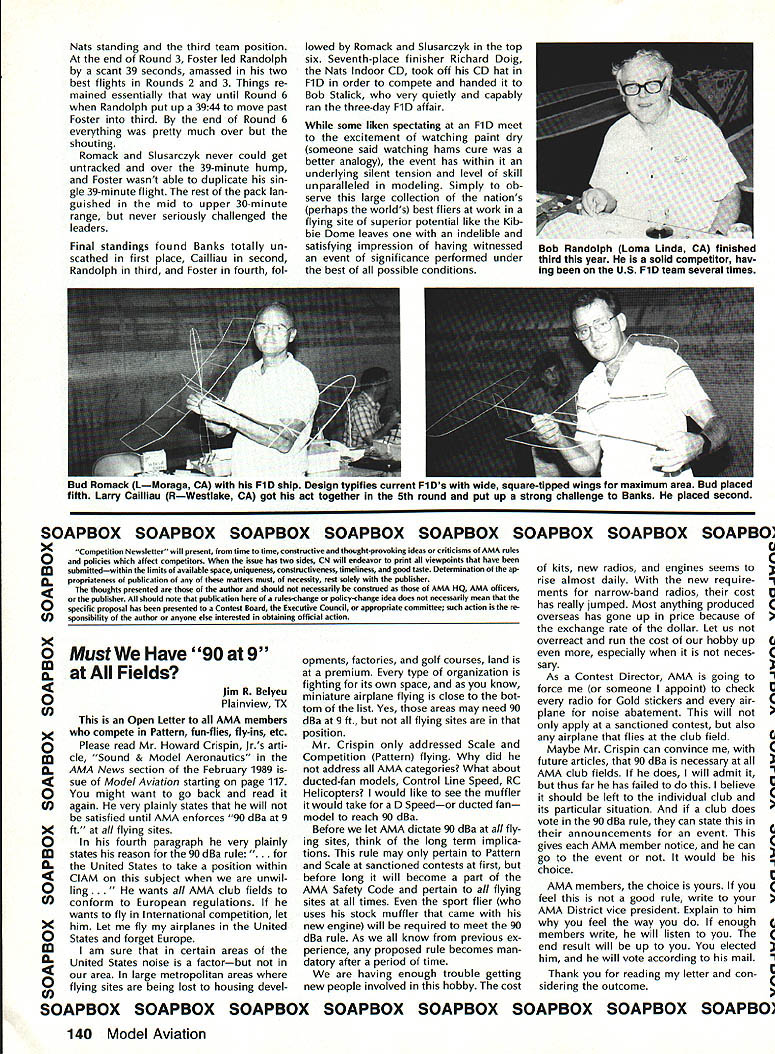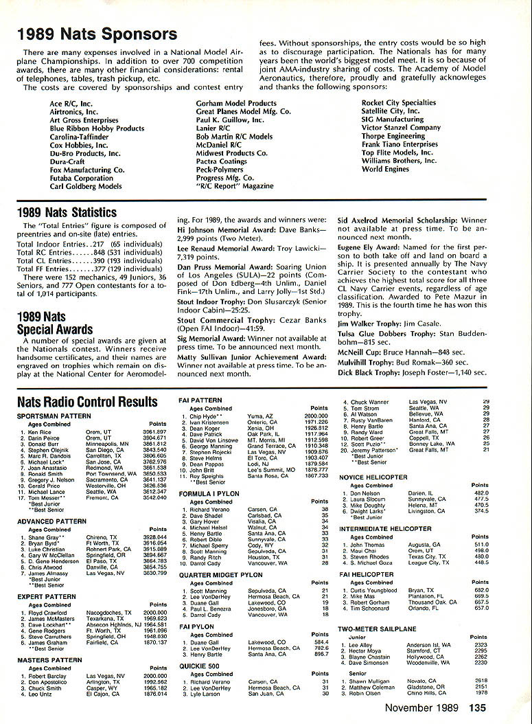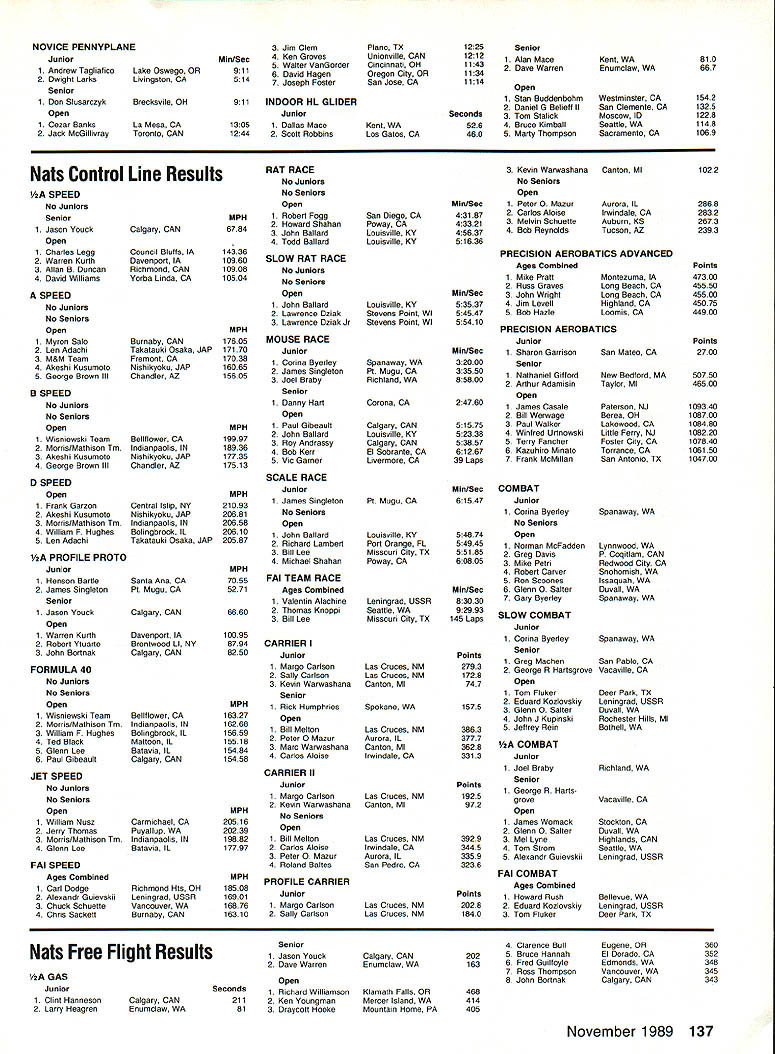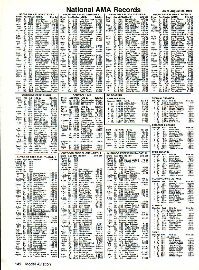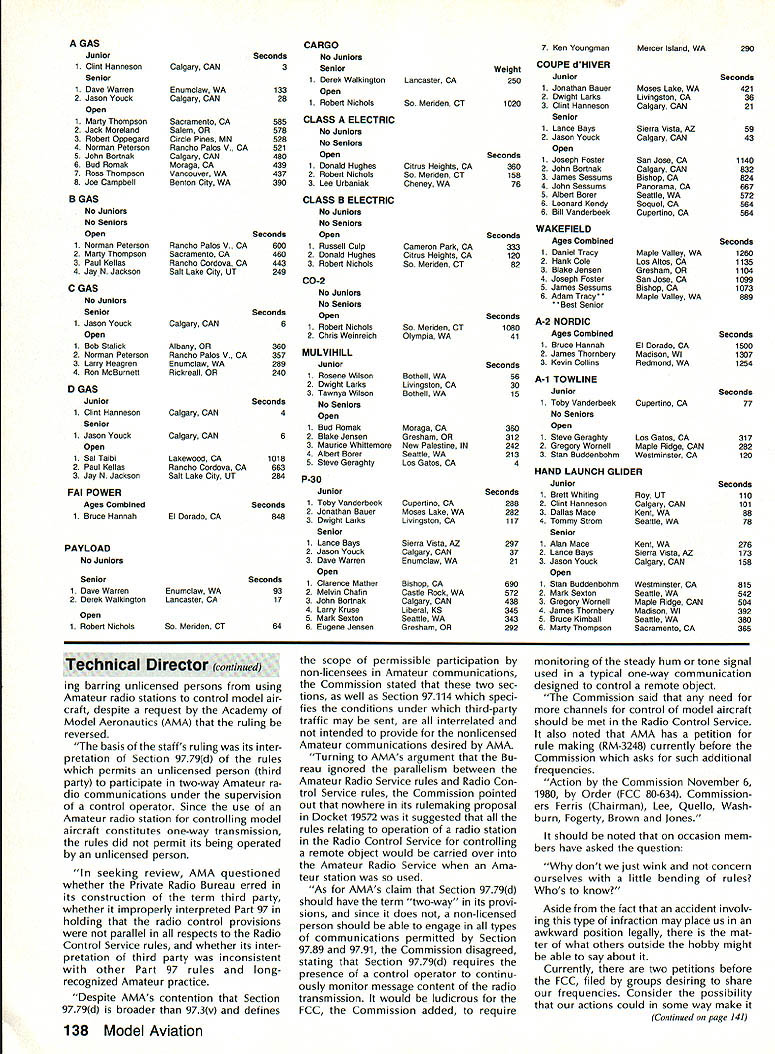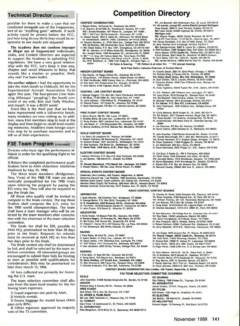 COMPETI TO NEWSLETT2II ACADEMY OF MODEL AERONAUTICS U AMA 1810 SAMUEL MORSE DRIVE RESTON VA 22090 Note Technical Directo Bob Underwood things change stay same Thats original thought course fact cant recall moment coined statement ever knew Actually Im certain care ever knew statement true As frequency concerns chug along changes come go fact re mains same going fly six meters Ham band have have proper FCC license legally part column month oc casioned phone call Contest Di rector learned possible partic ipant event CD did have FCC Amateur license going fly using six meters case indi vidual intended invoke rule found Part 97 FCC regulations rule 9779d states licensee may permit third party participate amateur radio communications station provided control operator present contin uously monitors supervises radio communication insure compliance rules Note italicized words Contest Director informed office use Amateur frequen cies control model op erator does have proper FCC license third-party manner violation FCC regulations AMA Safety Code should noted AMA liability protection predicated adherence Safety Code Contest Directors should therefore check carefully see dividual using Amateur band has cur rent Technician General Advanced Ex tra Class FCC license before allow person operate transmitter event CD ignore issue tan tamount condoning action November 1980 FCC Report No 2143 reprinted below Please note re port clearly states FCC position matter after Academy attempted gain favorable decision allowing third-party op eration Refusal FCC based fact operation model does consti tute two-way radio communication FCC AFFIRMS STAFF RULING BARRING UN LICENSED PERSONS FROM USING AMA TEUR RADIO STATIONS TO CONTROL MODEL AIRCRAFT Commission has affirmed staff rul Continued page 138 Indoor Rules Interpretations Effectivity Date Correction effectivity date three Indoor rules interpretations reported last months Competition Newsletter error three interpretations affecting Helicopters Cabin models Easy B come effective january 1 1990 Scale Team Program News Scale Team Selection Committee re cently voted overwhelmingly favor creasing Scale team selection program entry fee $75 late entry fee $100 effective January 1 1990 1990 F3E Team Selection Program Schedule Deadline qualification May 31 1990 postmark deadline Deadline site bids host finals March 15 1990 postmark deadline Finals contest held during June 1990 date location TBA Date location world champion ships announced Beginning January 1 1990 team selection program participants must members NAAsee New Cost Factors FAI Partic ipation July 1989 AMA News page 107 1990 FAI stamps will cost $18NAA mem bership will inclusive Participants qualifying 1989 must pur chase 1989 FAI stamp prior attempt participate team selection con testant must current AMA member possess current FAI competition stamp available AMA HQ Qualify Finals Contest 1 Submit $15 entry fee AMA HQ Atten tion M Madison official registration performance qualification form pro gram details 2 Achieve 450 points accordance published FAI Sporting Code553 Electric Powered Motor Gliders Qualifica tion must witnessed AMA Contest Continued page 141 1989 RC Sailplane F3B World Championships Results Summary Team Standings 1 Austria 2 Netherlands 3 FR Germany 4 UK 5 USA 4276826 pt 4248757 pt 4244571 Pt 4218483 Pt 4153452 pt Individual Standings 1 N Wright UK 2 P Hoffman Austria 3 J Ten Holt Netherlands 7 5 Dawson USA 10 L jolly USA 31 R Spicer USA 1474212 Pt 1440571 pt 1437744 Pt 1414665 Pt 1407584 Pt 1331203 pt Pacific FF Champs No 3 NZMAA FF Technical Committee vites interested modelers Third Pa cific Free Flight Championships sponsored Futaba held February 3-4 1990 Carterton New Zealand contest rec ognized FAI both Open Interna tional FF World Cup event Competition events include tradi tional F1A/B/C plus P-30 A-i Towline FFOXY Juniors organizers note XlVth Com monwealth Games will held Auckland New Zealand during time frame Jan uary 24 through February 3 1990 essentially mini-Olympics Also noted occasion First Pacific Con trol Line Championships held Car terton February 4-5 1990 see nouncement Competition Newslet ter September 1989 page 128 Any other information relating con test including questions about travel ac commodations car rental etc should re ferred directly Organizing Commit tee Pacific EF Championships Rod Lewis 17 Walters Rd Mt Albert Auckland 3 New Zealand telephone 0064-9-606396 Call Site Bid FAI Electric F3E Team Finals US FAI Electric Team Selection Com mittee requests site bids final teamselection contest desired time frame contest during month June 1990 Clubs willing host finals should contact Micheline Madison Competi tion Department AMA HQ Team Selec tion Committee Chairman Joe Beshar 198 Merritt Dr Oradell NJ 07649 phone 1201/261-1281 postmark deadline submitting bids March 15 1990 134 Model Aviation to AMA N rng Competition Newsletter edited Ross B McMullen AMA 18181 1989 Nats Sponsors expenses involved National Model Air plane Championships addition over 700 competition awards other financial considerations rental telephones tables trash pickup etc costs covered sponsorships contest entry fees Without sponsorships entry costs would high discourage participation Nationals has years worlds biggest model meet because joint AMA-industry sharing costs Academy Model Aeronautics therefore proudly gratefully acknowleges thanks following sponsors Ace RIC Inc Airtronics Inc Art Gross Enterprises Blue Ribbon Hobby Products Carolina-Taffinder Cox Hobbies Inc Du-Bro Products Inc Dura-Craft Fox Manufacturing Co Futaba Corporation Carl Goldberg Models 1989 Nats Statistics Total Entries figure composed preentries on-site late entries Total Indoor Entries 217 65 individuals Total RC Entries 48 531 individuals Total CL Entries 90 193 individuals Total FF Entries 377 129 individuals 152 mechanics 49 Juniors 36 Seniors 777 Open contestants tal 1014 participants 1989 Nats Special Awards number spec