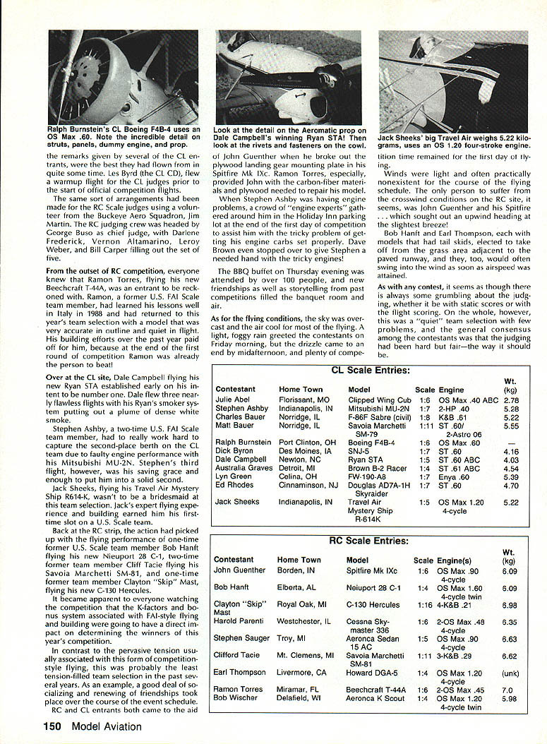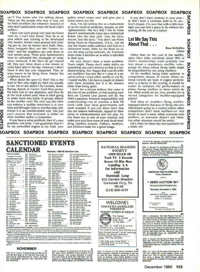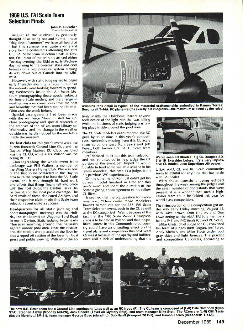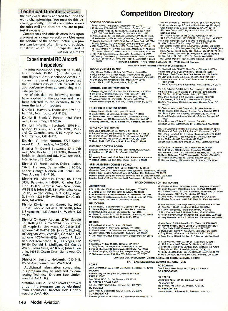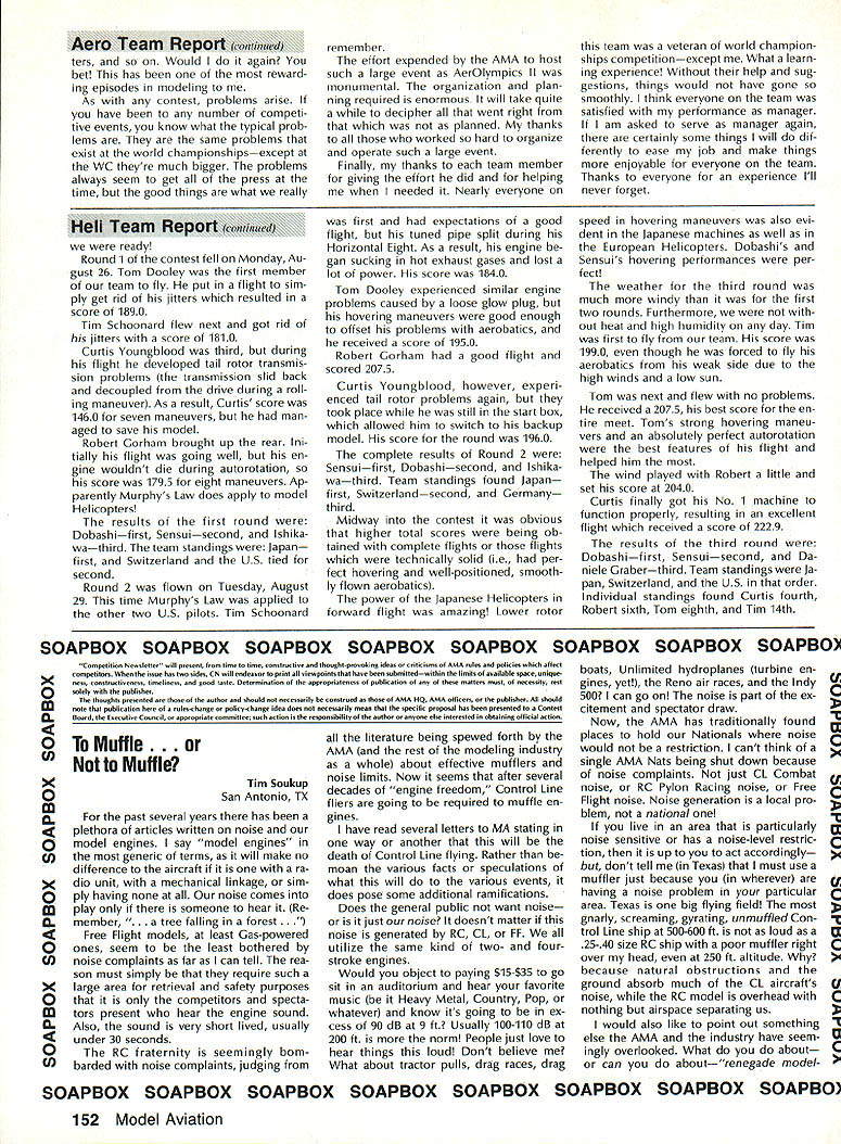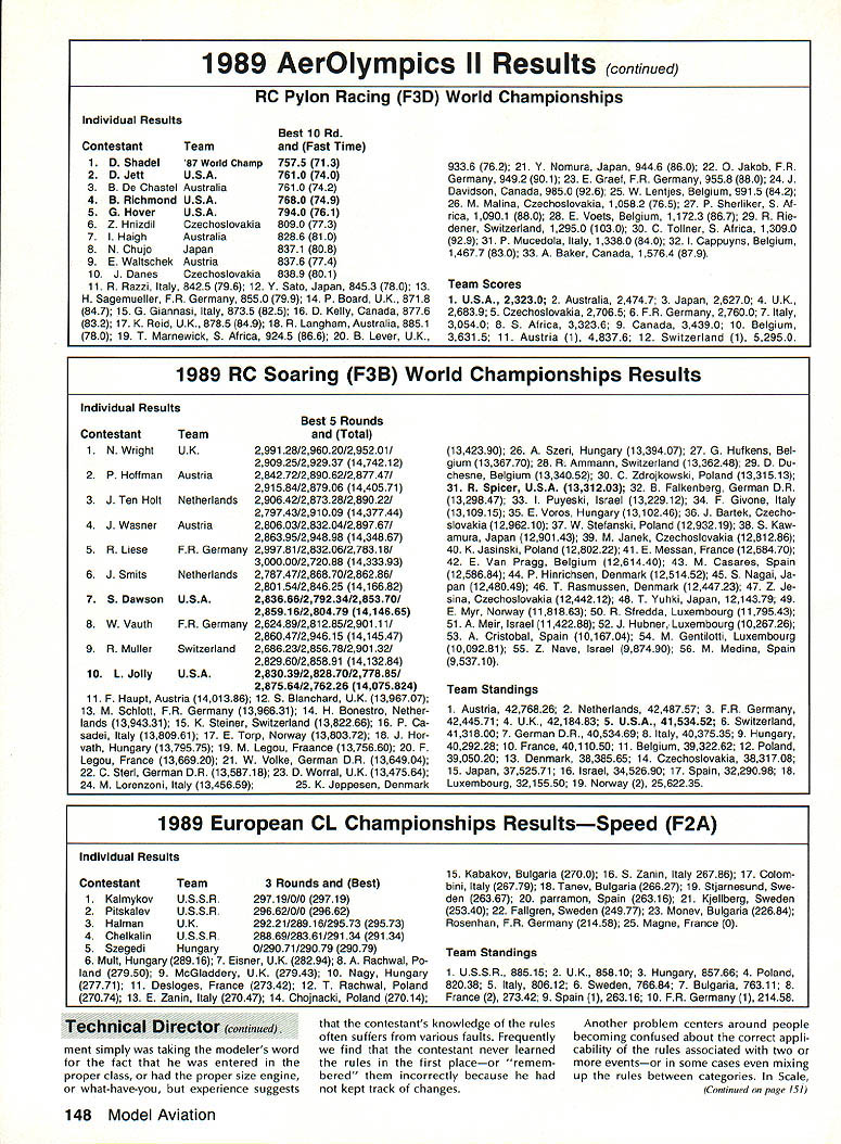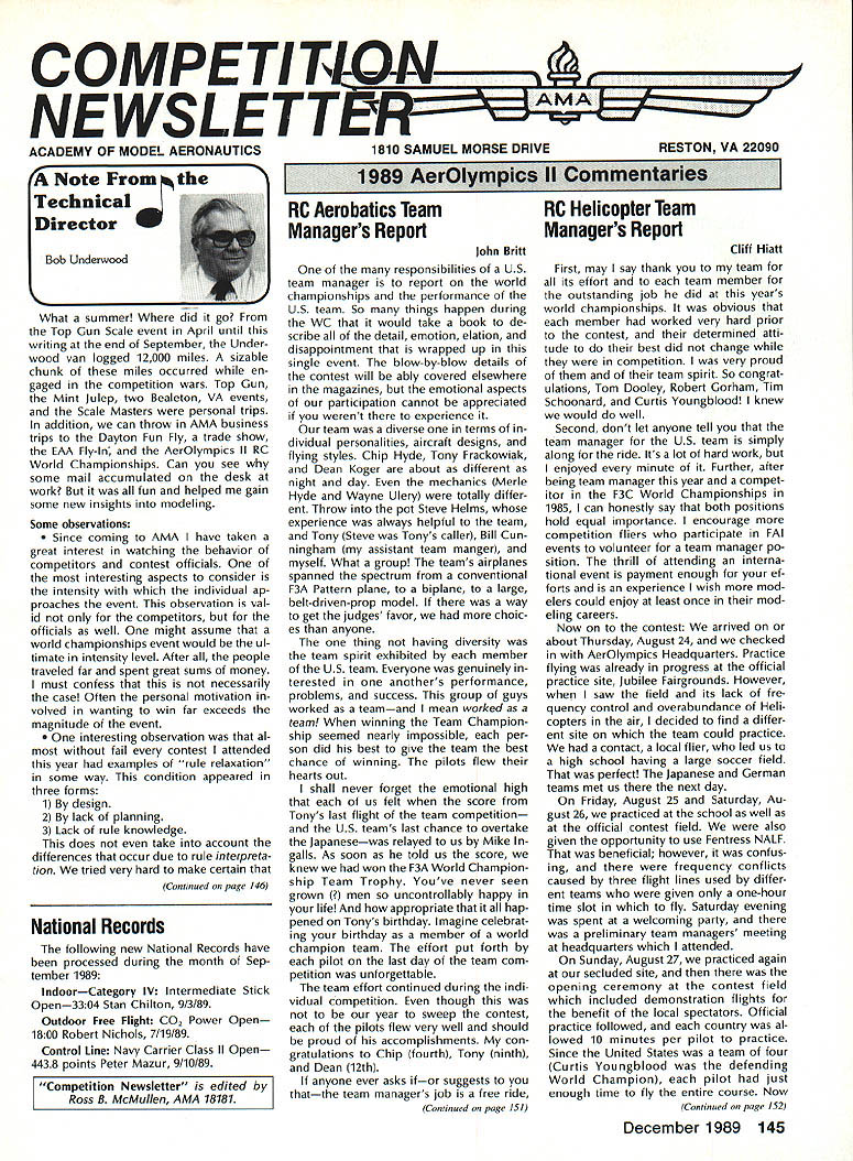 COMPETI TIC NEWSLETTEI ACADEMY OF MODEL AERONAUTICS hAl U U H AMA 1810 SAMUEL MORSE DRIVE RESTON VA 22090 NoteFromthe Technical Director W Bob Underwood What summer did go Top Gun Scale event April until writing end September Under wood van logged 12000 miles sizable chunk miles occurred en gaged competition wars Top Gun Mint Julep two Bealeton VA events Scale Masters personal trips addition can throw AMA business trips Dayton Fun Fly trade show EAA Fly-In AerOlympics II RC World Championships Can see some mail accumulated desk work fun helped gain some new insights modeling Some observations Since coming AMA have taken great interest watching behavior competitors contest officials interesting aspects consider intensity individual ap proaches event observation val id competitors officials well might assume world championships event would ul timate intensity level After people traveled far spent great sums money must confess necessarily case Often personal motivation volved wanting win far exceeds magnitude event interesting observation al fail contest attended year examples rule relaxation some way condition appeared three forms 1 design 2 lack planning 3 Lack rule knowledge does take account differences occur due rule interpreta tion tried very hard make certain fContinued page 146 National Records following new National Records have processed during month Sep tember 1989 IndoorCategory IV Intermediate Stick Open3304 Stan Chilton 9/3/89 Outdoor Free Flight CO2 Power Open 1800 Robert Nichols 7/19/89 Control Line Navy Carrier Class II Open 4438 points Peter Mazur 9/10/89 1889 AerOlympics II Commentaries RC Aerobatics Team Managers Report John Britt responsibilities US team manager report world championships performance US team So things happen during WC would take book de scribe detail emotion elation disappointment wrapped up single event blow-by-blow details contest will ably covered elsewhere magazines emotional aspects participation cannot appreciated werent experience team diverse terms dividual personalities aircraft designs flying styles Chip Hyde Tony Frackowiak Dean Koger about different night day mechanics Merle Hyde Wayne Ulery totally differ ent Throw pot Steve Helms experience always helpful team Tony Steve Tonys caller Bill Cun ningham assistant team manger myself What group teams airplanes spanned spectrum conventional F3A Pattern plane biplane large belt-driven-prop model way get judges favor choic es anyone thing having diversity team spirit exhibited member US team Everyone genuinely terested anothers performance problems success group guys worked teamand mean worked team winning Team Champion ship seemed nearly impossible per son did best give team best chance winning pilots flew hearts out shall never forget emotional high us felt score Tonys last flight team competition US teams last chance overtake Japanesewas relayed us Mike Ingalls As soon told us score knew won F3A World Champion ship Team Trophy Youve never seen grown uncontrollably happy life appropriate hap pened Tonys birthday Imagine celebrat ing birthday member world champion team effort put forth pilot last day team com petition unforgettable team effort continued during indi vidual competition though year sweep contest pilots flew very well should proud accomplishments con gratulations Chip fourth Tony ninth Dean 12th anyone ever asks ifor suggests thatthe team managers job free ride Continued page J51 RC Helicopter Team Managers Report Cliff Hiatt First may say thank team its effort team member outstanding job did years world championships obvious member worked very hard prior contest determined atti tude best did change competition very proud team spirit So congrat ulations Tom Dooley Robert Gorham Tim Schoonard Curtis Youngblood knew would well Second dont let anyone tell team manager US team simply along ride Its lot hard work enjoyed minute Further after being team manager year compet itor F3C World Championships 1985 can honestly say both positions hold equal importance encourage competition fliers participate FAI events volunteer team manager po sition thrill attending interna tional event payment enough ef forts experience wish mod elers could enjoy least once mod eling careers Now contest arrived about Thursday August 24 checked AerOlympics Headquarters Practice flying already progress official practice site Jubilee Fairgrounds However saw field its lack fre quency control overabundance Heli copters air decided find differ ent site team could practice contact local flier led us high school having large soccer field perfect Japanese German teams met us next day Friday August 25 Saturday Au gust 26 practiced school well official contest field also given opportunity use Fentress NALF beneficial however confus ing frequency conflicts caused three flight lines used differ ent teams given one-hour time slot fly Saturday evening spent welcoming party preliminary team managers meeting headquarters attended Sunday August 27 practiced again secluded site opening ceremony contest field included demonstration flights benefit local spectators Official practice followed country al lowed 10 minutes per pilot practice Since United States team four Curtis Youngblood defending World Champion pilot just enough time fly entire course Now Continued page 152 December 1989 145 Competition Newsletter edited Ross B McMullen AMA 18181 Technical Director tfn0d rules strictly adhered during world championships must cause generally FAI competitor knows rules well does hesitate pro test necessary Competitors officials often look upon protest negative actiona blot upon conduct contest Actually pro test can beand often isa very positive constructive action properly used continued page l47 Experimental RC Aircraft Inspectors joint AMA/IMAA program qualify large models 55-100 lb demonstra tion flights AMA-sanctioned events insolves use inspectors oversee qualifications such aircraft approve/certify complying safe practices As date