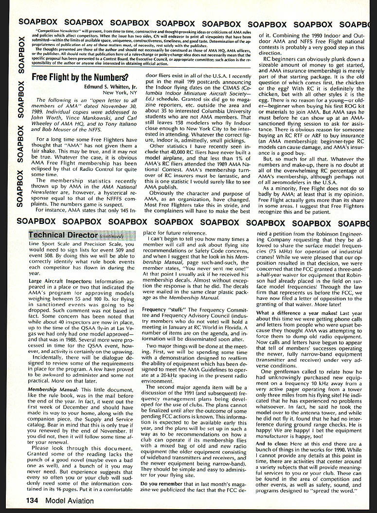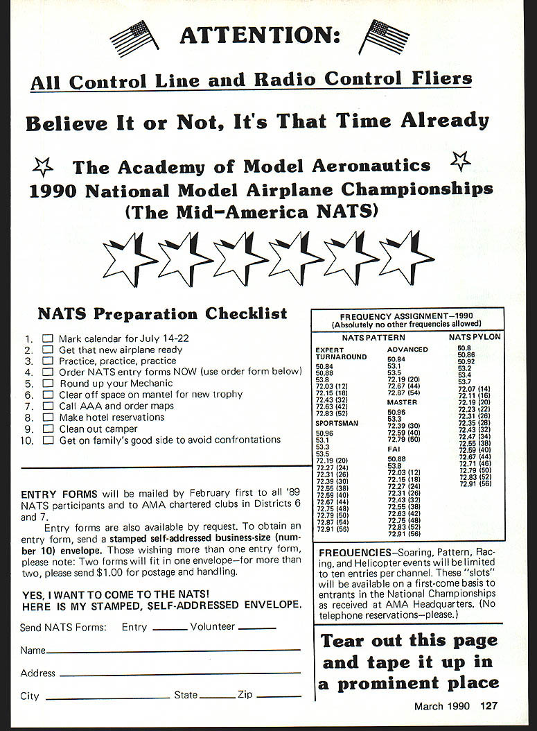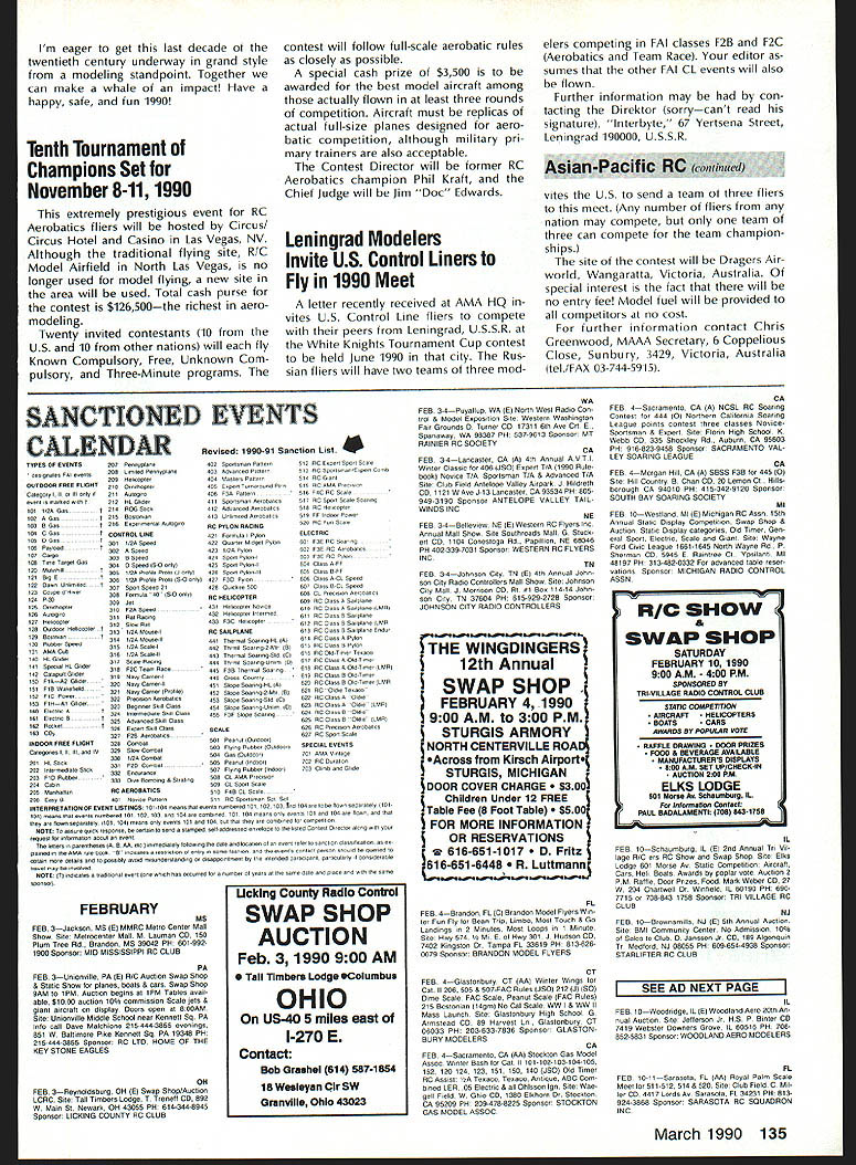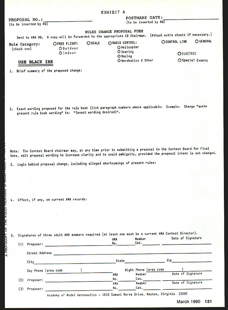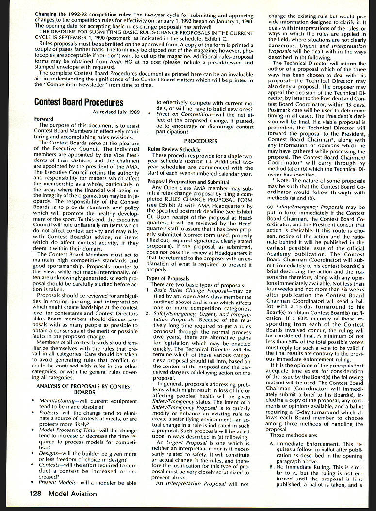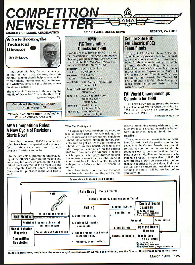 COMPETI TLON NEWSLETT2ft ACADEMY OF MODEL AERONAUTICS1810 SAMUEL MORSE DRIVE Note Technical Director W Bob Underwood has said Variety spice life actually true months column should help remove winter blahs monochromatic whiteness whatever since just bits pieces various subjects rule book mail middle December third cycle Continued poge 32 RESTON VA 22090 FAI World Championships Schedule 1990 FAIs ClAM has approved follow ing calendar World Championships 1990 its meeting November 30December 1 1989 fContinued page J26 AMA Competition Rules New Cycle Revisions Starts Now Now new 1990-91 competition rules have completed ef fect its time new round rules proposals/revisions begin interests promoting understand ing official procedure making amending rules present both sim plified block diagram procedure complete Contest Board Procedures last published April 1988 sue Open-age AMA members urged take active part rule-making pro cess Juniors Seniors eligible submit rules changes although per fectly free get Open-age niember submit items behalf As long rules proposal submitted correct AMA form can use duplicate printed few pages further get two Open members must Contest Director sign AMA member welcome join Lets face itthe modelers ones live rules real experts Something wrong existing rule Propose change make better New rule event needed Send Deadlines rules revision process full dead lines various parties en gaged Contest Boards have several get finished time sub sequent steps done time important deadline modeler sub mitting proposal September 1 1990 A/f new proposals must postmarked before date order considered cy cle So dont sit just think about sending Itll too late before know Commonls Proposed Rule Changes Rule BooklEvery 2 TearsI Publish January Even-Numbered Tearsl AMA Member SU8MTTAt DOADIINE S[PIEME[R 1 1990 Peblished Proposals ISeumarvi Vol Results Model Aviation Magazine Proposals Vile Results C em p etition Newsletter Contest Board CoerdinetienllNcLFFSCELECI Soar Oilier Special Events ProposalCoordination Bleak BallotsContest Beard Member Completed Ballets 11000 iu IN CL FF SC ELEC RC Aem Hell Race Soar Other Special Events 14 regional members March 1990 125 Competition Newsletter edited Ross B McMullen AMA 18181 Can Participate AMA HO 1 Logs proposal 2 Assigns 10 number proposals 3 Sends proposals Contest Board Chairmen A Prepares couch ballots its simplest form heres rules changelproposal system works fine detail see Contest Board Procedures issue 1e World June 11-18 July 9-14 August 6-11 August 20-26 August 31Sept 10 Space Models Kiev USSR Control Line F2A/B/CID Blenod-Les Ponts Mousson France Electroflight F3E Friestadt Austria Junior Free Flight F1AIBIC Mostar Yugoslavia Scale F4BIC Warsaw Poland Team Selected 1990 Junior Free Flight World Champs following young FFers competi tively selected members US team 1990 FAI Junior FF World Cham pionships held Mostar Yugoslavia August 20-26 1990 FlA Towline GliderMatthew Gagliano Floral Park NY Joel Grasmeyer Grand Rap ids Ml Mike Keller Lancaster CA Matthew Mike members 1988 team FiB Wakefield RubberRoderick loerger York PA Christopher Pelatowski An sofia CT Adam Tracy Maple Valley WA Adam member 1988 team FiC PowerTony Hutchins Portland IN Craig Lippman Lansdale PA Jim Troutman Marion TX Tony member 1988 team Asian-Pacific RC Aerobatics Champs Set April 19-22 1990 Model Aeronautical Associaton Au stralia Inc announces proposing establishment new off-year inter national RC Aerobatics championships order get ball rolling has offered host first such meet conjunction its Kraft Masters contest applica tion has already made FAI Open International status 1990 calen dar letter recently received AMA HQ inContinued page 135 Competition Directory CONTEST COORDINATORS FF Jim Benneit 324 Heitenstein Ave Si Louis MO 63119 Robert Wilkie 19 Everett St Rockland MA 02370vs Au events except RC entire District except Michigan II Sobrino 87-26 88th St. Woodhaven Oueens NY 11421 Greg Seydel 3825 E lone Terrace Cudahy WI 53110 RC Ernest Nikodem 407 Witiom Si Lockpori NY 14094 RC Leon Cordy N4503 Highway 55 Chilton WI 53014 RC Bill Fuori 28 Pernwood Dr Commack NY 11725 Michigen oniy iii Nelson Gould 1944 S Idaho Si Ailentown PA 18103 East RC Wayne Yeager 38235 Castle Romulus Ml 48174 M Weixenbach 4568W 146th Cleveland OH 44135 West CL & FF Paul Smiih 11112 Diii Dr Sierling Hgts MI 48077 iv CL & PF Bob Nicks 1211 Brookgrees Dr Cary NC 27511viii Randy Randolph PO Box 271048 Dallas TX 75227 RC Ed Byarley 200 Commander Cove Siattord VA 22554IX Mike Tallman 3014 Exchange Wichila KS 67217 v RC Ralph Bailey PO Boa 1287 Orangeburg SC 29116-1287 RC George Hunter 6962 S Lamar Si Litileton CO 80123 FF W Johnson 4112 White Acres Rd Montgomery AL 36106X Roll Erickson 7506 Widgeon Way Pair Oaks CA 95628 No CL Joseph Mead 1339 Aensxalaer St Jacksonville FL 32205 Harry Apojan 27704 Saddle Rd Rolling Hills CA 90274 So VI RC ay 201 Halman Salem Ad Terre Haute IN 47803 Prank Gomes 2241 Noah Si Honolulu Hi 96816 Hawaii RC Searing Dale Folkenin8 1544 Darien Lake Dr. Deiev IL 60559Xi Dick Salter 7217 So 133rd St Seattle WA 98178 CL WA Bodzioch Jr. 1800 Trail Ridge Si Arlington Hgis IL AC WT Bill Smith 10825 44th Ave SW Seattle WA 981 60004 RC Pylon & SoaringRC Pattern & eli other RCRC except Soaring Boid Face Below indicates Chairman 01 Contest Board INDOOR CONTEST BOARD I Ray Harlan 15 Happy Hollow Ad Wayland MA 01778 II Doug Barber 148 Stratton Hause Maple Shade NJ 08052 III Walt vanoorder 5669 victory view Lx Cincinnati OH 45233 Iv Don SrulI 941 Kimberwicke Ad McLean VA 22102 Vs John Martin 2180 Tigertail Miami FL 33133 CONTROL LINE CONTEST BOARD I George Higgins PO Box 561 North Pembroke MA 02358 II Bill Boss 7706 269th St. New Hyde Perk NY 11040 III Laird Jackson 1100 Walnut Si Philadelphia PA 19107 lv Wayne Poster 101 Forest Dr Advance NC 27006 V Dave Hemniraughi P0 Boa 171 Moncks Corner SC 29461 FREE FLIGHT CONTEST BOARD I Henry Struck 294 156 Lyme CT 06371 II Bradley Bane 80 La