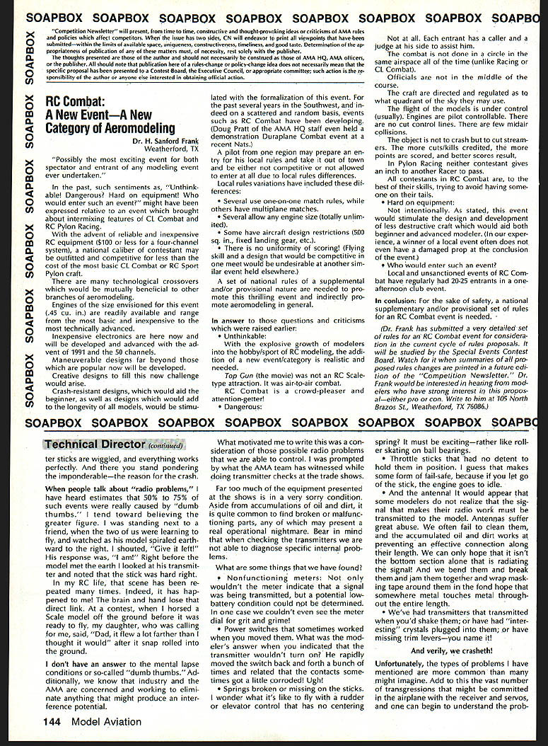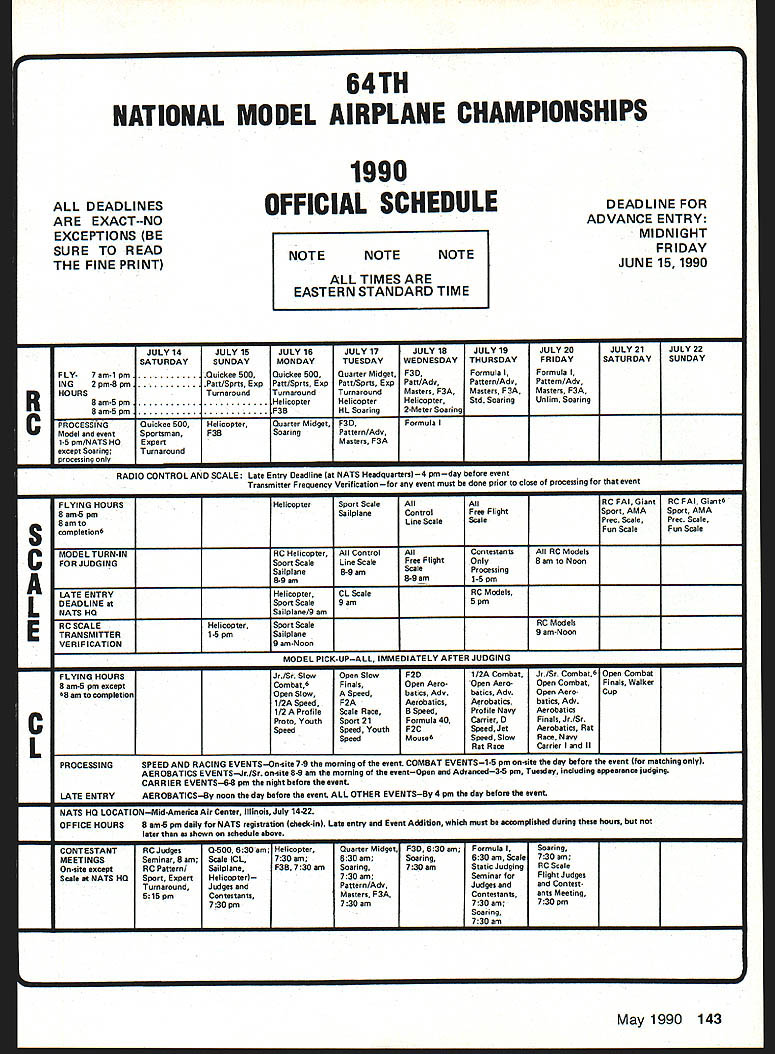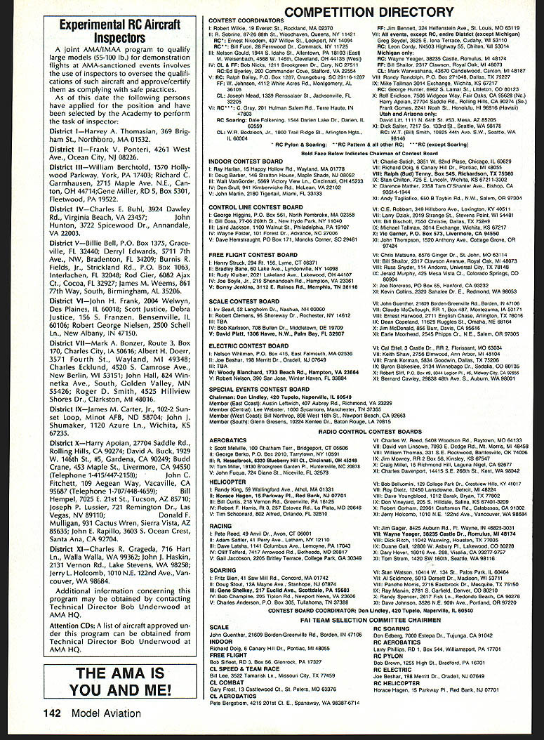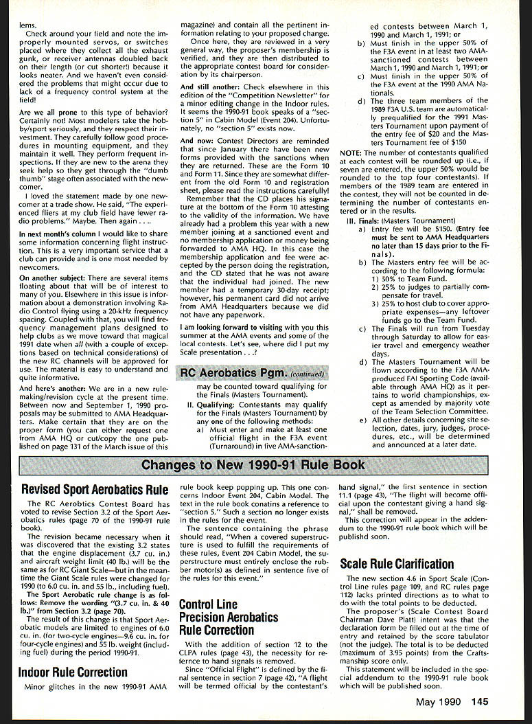 COMPETI Ut NEWSLETT ACADEMY OF MODEL AERONAUTICS hAl U U L AMA 810 SAMUEL MORSE DRIVE -w RESTON VA 22090 NoteFromthe Technical Director W Bob Underwood can very traumatic lavish precious hours building model crashes happens us time anotherand will probably happen again can hope models demise did cause personal injury bring damage anyone elses property cause known act less likely repeated later date Free Flight cause crash often tends apparent assuming design construction techniques have fol lowed carefully Its unexpected gust wind incorrect incidence structural fail ure maybe mental lapse time launch case cause crash can accounted often Well-developed modeling skills includ ing knowledge trimming aerody namic effects abound within Free Flight community isnt luxury its necessity ability determine crash cause also true case Control Line broken line 20-ft-diameter loop 19 ft altitude two Combat models trying occupy same piece sky diffi cult fathom investigative team hits crash scene Radio Control pre cious model does its sky dance end signal normally cannot deter mined ones ordinary senses Oh yes can utilize other electronic devices look signal zillion little pieces connections must work just right flight does work cor rectly find air filled clut ter can give electronics mental breakdown Hence often find air split cry aint got model becomes statistic After models remains carried pits act follows almost univer sal radio unit turned transmitContinued poge /44 National Monthly following new National Records have processed during month Febru ary 1990 Free FlightCategory III Electric Class Open1150 Donald Hughes 1/28/90 Control Line Sport Speed 21 Open 13133 mph Bob Whitney 1/14/90 Correction AMA WRAM Show Handout AMA personnel 1990 WRAM Show handed out some 600 copies flyer con cerning 1991 Frequency Management Plans Individuals clubs directed com pare copy might have obtained material provided AMA News section magazine page 122 two large charts several changes listing frequencies five- six-station plans channel numbers 36 58 60 should have printed bold face WRAM Show handout 1989 FAI Sporting Code Supplement Now Available supplement 1989 FAI Sporting Code rule book now available AMA HQ cost $2 Attn Competitions De partment booklet contains provi sional rules F1GFF Coupe dHiver Fl HFE Gliders Formula A-i F1JFF Power Model1/2A Class Indoor Beginners rules World Cup Free Flight F3HRC Slope Soaring F3HRC Cross Country Racing F31RC Aero-Tow Soaring F3JRC Thermal Duration Gliders Large-Scale RC Flying Scale Models RC Aerobatics Masters Tournament Site Bids Wanted Clubs interested being host 1991 RC Masters Team Selection Finals should document offers writing send AMA HQ Attn Micheline Madi son December 1 1990 finals will held during five-day period summer 1991 Selection site will made among bids vote program fin alists Team selection Committee sometime after January 1 1991 winning site will announced soon possible thereafter well-prepared site bid will include infor mation relating adequacy fly ing site size surface orientation re spect sun parking spectator control etc preferred dates weather statistics club personnel available act assistants least dozen will required contest equipment whfch can provided tents ropes barriers etc community backing publicizing event nearby housing entrants judges out-of-town offi cials other plus factors judges Contest Manager will supplied NSRCA and/or USPIA necessary jury shall ap pointed AMA Fxecutive Council Contest Manager will coordinate local offkials respect assignment personnel other contest needs 1991 RC Aerobatics F3A Team Selection Program RC Aerobatics Team Selection Com mittee recently approved 1991 team se lection program program format es sentially same 1988-89 pro gram details 90-91 pro gram Team selection 1991 RC Aerobatics F3A World Championships will via sin gle team selection contest Masters Tourna ment held summer 1991 exact date site announced soon known eligible enter Masters Tournament contestant must enter team selection program qualify Finals Contest follows I Program entry Program entry must made before September 1 1990 sending $20 program entry fee $18 NAA membership includes FAI competition stamp Micheline Madison AMA Head quarters late entry fee $50 will accepted after September 1 until March 1 1991 entry fees will go F3A Team Fund contest entered prior entering program May 1990 141 Records Update Competition Newsletter edited Ross 8 McMullen AMA 18181 Experimental RC Aircraft Inspectors joint AMA/IMAA program qualify large models 55-100 lb demonstration flights AMA-sanctioned events involves use inspectors oversee qualifi cations such aircraft approve/certify complying safe practices As date following persons have applied position have selected Academy perform task inspector District IHarvey Thomasian 369 Brig ham St Northboro MA 01532 District IlFrank V Ponteri 4261 West Ave Ocean City NJ 08226 District IllWilliam Berchtold 1570 Holly wood Parkway York PA 17403 Richard C Garmhausen 2715 Maple Ave NE Can ton OH 44714Gene Miller RD 5 Box 5301 Fleetwood PA 19522 District IV--Charles E BuhI 3924 Dawley Rd Virginia Beach VA 23457 John Hunton 3722 Spicewood Dr Annandale VA 22003 District VBillie Bell PO Box 1375 Grace ville FL 32440 Derryl Edwards 5711 7th Ave NW Bradenton FL 34209 Burnis R Fields Jr Strickland Rd PO Box 1063 Interlachen FL 32048 Rod Gier 6082 Ajax Ct Cocoa FL 32927 James M Weems 861 77th Way South Birmingham AL 35206 District yEJohn H Frank 2004 Welwyn Des Plaines IL 60018 Scott Justice Debra Justice 156 5 Franzen Bensenville IL 60106 Robert George Nielsen 2500 Schell Ln New Albany IN 47150 District VIEMark Bonzer Route 3 Box 170 Charles City IA 50616 Albert H Doerr 3571 Fourth St Wayland Ml 49348 Charles Ecklund 4520 5 Camrose Ave New Berlin WI 53151 John Hall 824 Win netka Ave South Golden Valley MN 55426 Roger D Smith 4525 Hillview Shores Dr Clarkston Ml 48016 District IXJames M Carter Jr 102-2 Sun set Loop Minot AFB ND