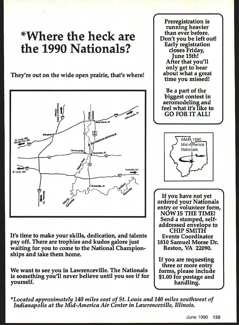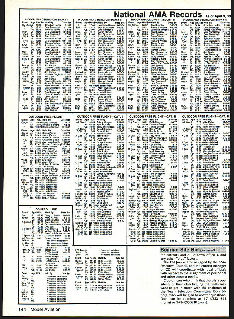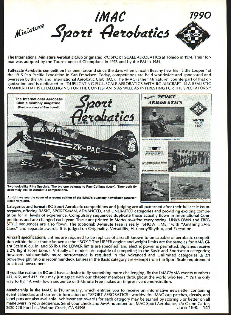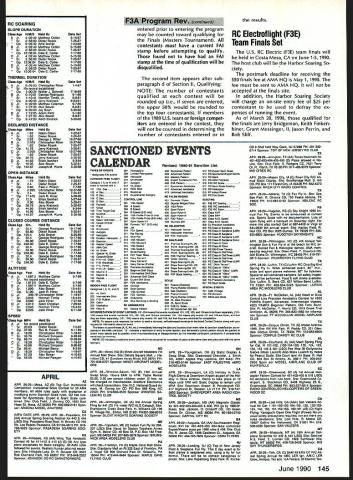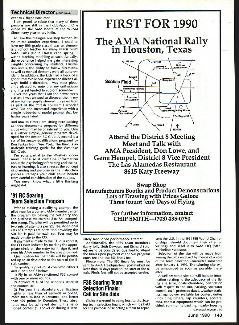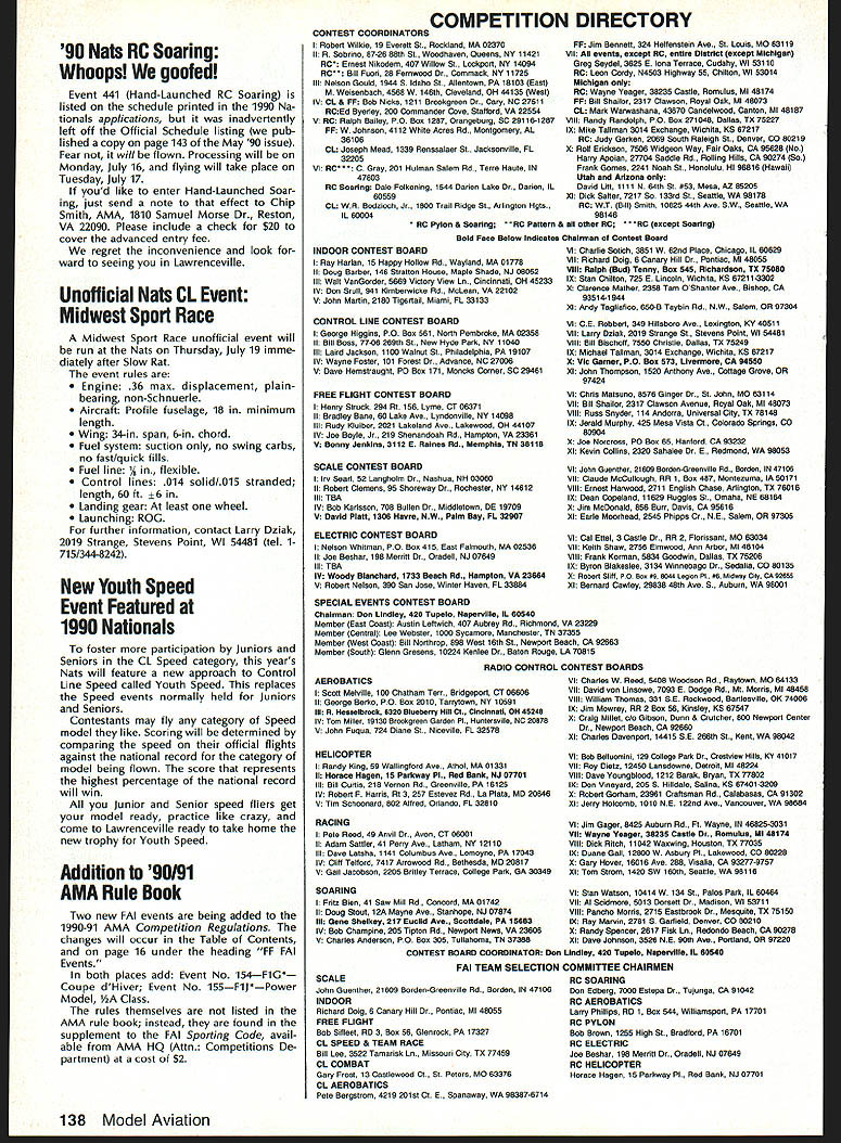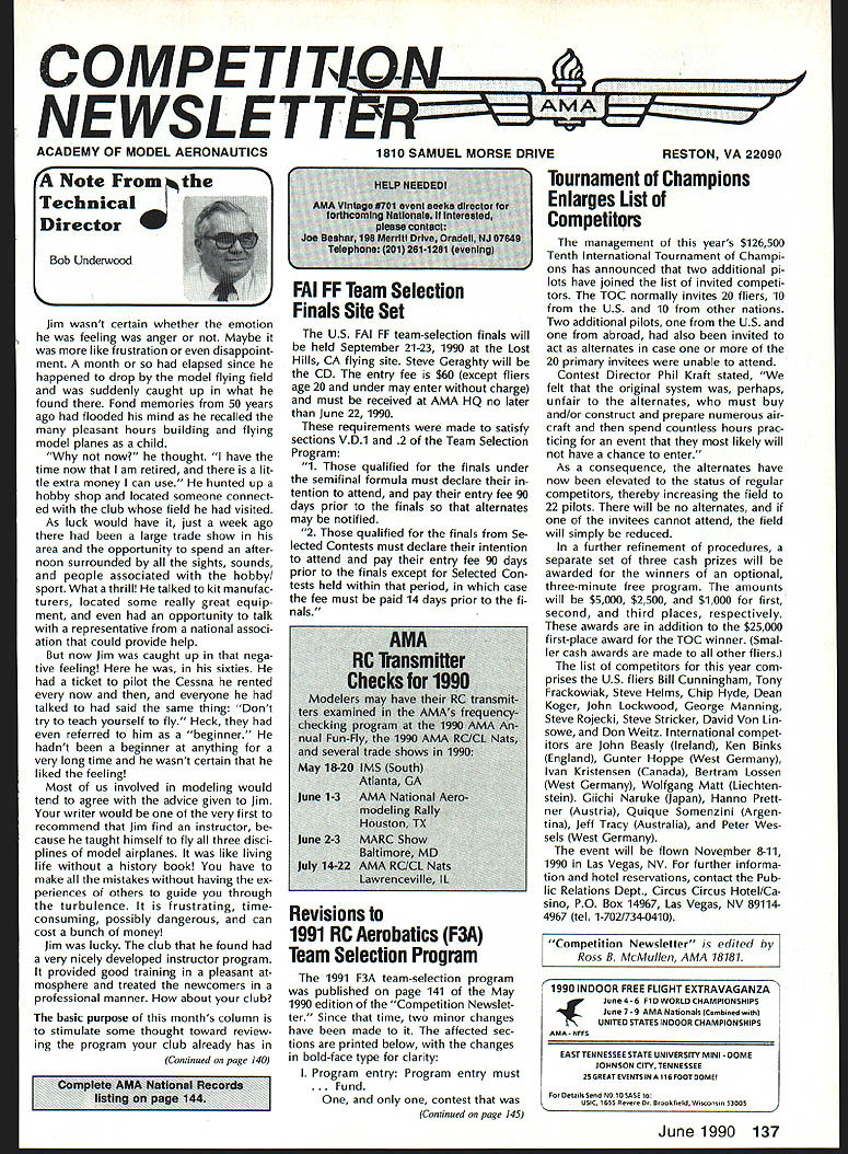 COMPETI TION NE WSLETTeRACADEMY OF MODEL AERONAUTICS 1810 SAMUEL MORSE DRIVE RESTON VA 22090 Note Technical Director Bob Underwood Jim wasnt certain whether emotion feeling anger Maybe like frustration disappoint ment month elapsed since happened drop model flying field suddenly caught up what found Fond memories 50 years ago flooded mind recalled pleasant hours building flying model planes child now thought have time now am retired lit tle extra money can use hunted up hobby shop located someone connect ed club field visited As luck would have just week ago large trade show area opportunity spend after noon surrounded sights sounds people associated hobby sport What thrill talked kit manufac turers located some really great equip ment opportunity talk representative national associ ation could provide help now Jim caught up nega tive feeling sixties ticket pilot Cessna rented now everyone talked said same thing Dont try teach yourself fly Heck referred him beginner hadnt beginner anything very long time wasnt certain liked feeling Most us involved modeling would tend agree advice given Jim writer would very first recommend Jim find instructor cause taught himself fly three disci plines model airplanes like living life history book have make mistakes having ex periences others guide through turbulence frustrating timeconsuming possibly dangerous can cost bunch money Jim lucky club found very nicely developed instructor program provided good training pleasant mosphere treated newcomers professional manner about club basic purpose months column stimulate some thought toward review ing program club already has Continued page 140 FAI FF Team Selection Finals Site Set US FAI FF team-selection finals will held September 21-23 1990 Lost Hills CA flying site Steve Geraghty will CD entry fee $60 except fliers age 20 under may enter charge must received AMA HQ no later June 22 1990 requirements made satisfy sections VD1 2 Team Selection Program 1 qualified finals under semifinal formula must declare tention attend pay entry fee 90 days prior finals alternates may notified 2 qualified finals Se lected Contests must declare intention attend pay entry fee 90 days prior finals except Selected Con tests held within period case fee must paid 14 days prior fi nals Revisions 1991 RC Aerobatics FM Team Selection Program 1991 F3A team-selection program published page 141 May 1990 edition Competition Newslet ter Since time two minor changes have made affected sec tions printed below changes bold-face type clarity I Program entry Program entry must . Fund contest Continued page 14S Tournament Champions Enlarges List Competitors management years $126500 Tenth International Tournament Champi ons has announced two additional pi lots have joined list invited competi tors TOC normally invites 20 fliers 10 US 10 other nations Two additional pilots US abroad also invited act alternates case 20 primary invitees unable attend Contest Director Phil Kraft stated felt original system perhaps unfair alternates must buy and/or construct prepare numerous air craft spend countless hours prac ticing event likely will have chance enter As consequence alternates have now elevated status regular competitors thereby increasing field 22 pilots will no alternates invitees cannot attend field will simply reduced further refinement procedures separate set three cash prizes will awarded winners optional three-minute free program amounts will $5000 $2500 $1000 first second third places respectively awards addition $25000 first-place award TOC winner Smal ler cash awards made other fliers list competitors year com prises US fliers Bill Cunningham Tony Frackowiak Steve Helms Chip Hyde Dean Koger John Lockwood George Manning Steve Rojecki Steve Stricker David Von Lin sowe Don Weitz International compet itors John Beasly Ireland Ken Binks England Gunter Hoppe West Germany Ivan Kristensen Canada Bertram Lossen West Germany Wolfgang Matt Liechten stein Giichi Naruke Japan Hanno Prett ner Austria Quique Somenzini Argen tina Jeff Tracy Australia Peter Wes sels West Germany event will flown November 8-11 1990 Las Vegas NV further informa tion hotel reservations contact Pub lic Relations Dept Circus Circus Hotel/Ca sino PO Box 14967 Las Vegas NV 891144967 tel 1-702/734-0410 Competition Newsletter edited Ross B McMulfen AMA 18181 i~o INDOOR FREE FLIGHT EXTRAVAGANZA iune4 -6 PlO WORLD cHAMPIONSHIPS June 7-9 AMA Nationals Conshined UNITED STATES INDOOR CHAMPIONSHIPS AMA NFFS EASTTINNESSEE STATE UNIvERSITY MINI DOME JOHNSON CITY TENNESSEE 25 GREAT EVENTS IN AIlS FOOT DOME FoOetadste,d NOISSASE USIC 1655 Revnrn 0 Bookfield Wtonsn 53005 June 1990 137 90 Nats RC Soaring Whoops goofed Event 441 Hand-Launched RC Soaring listed schedule printed 1990 Na tionals applications inadvertently left off Official Schedule listing pub lished copy page 143 May 90 issue Fear will flown Processing will Monday July 16 flying will take place Tuesday July 17 youd like enter Hand-Launched Soar ing just send note effect Chip Smith AMA 1810 Samuel Morse Dr Reston VA 22090 Please include check $20 cover advanced entry fee regret inconvenience look ward seeing Lawrenceville Unofficial Nats CL Event Midwest Sport Race Midwest Sport Race unofficial event will run Nats Thursday July 19 imme diately after Slow Rat event rules Engine 36 max displacement plain bearing non-Schnuerle Aircraft Profile fuselage 18 minimum length Wing 34-in span 6-in chord Fuel system suction no swing carbs no fast/quick fills Fuel line % flexible Control lines 014 solid/OlS stranded length 60 ft 6 Landing gear least wheel Launching ROG further information contact Larry Dziak 2019 Strange Stevens Point WI 54481 tel 1715/344-8242 New Youth Speed Event Featured 1990 Nationals foster participation Juniors Seniors CL Speed category years Nats will feature new approach Control Line Speed called Youth Speed replaces Speed events normally held Juniors Seniors Contestants may fly category Speed model like Scori
