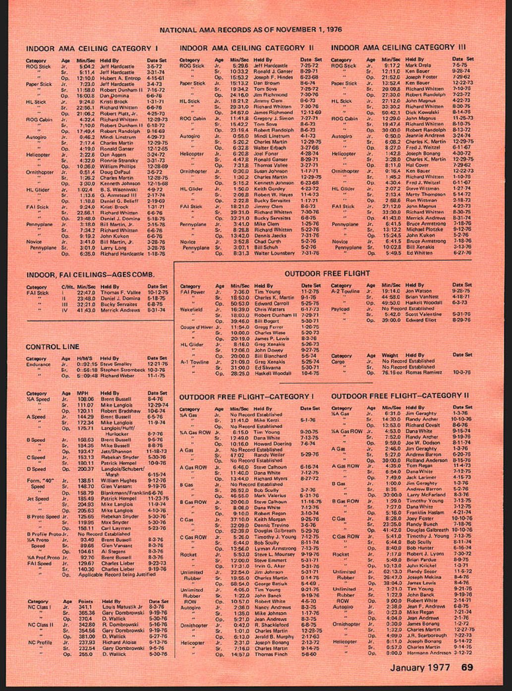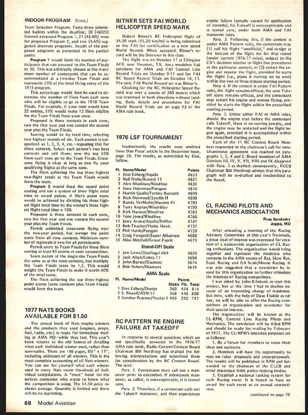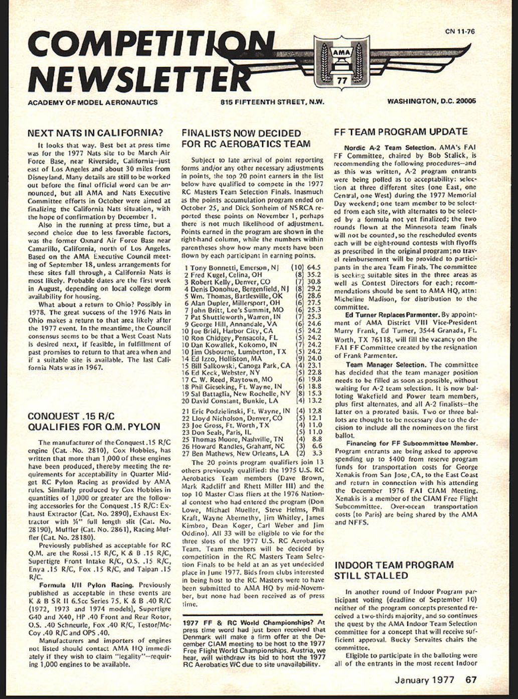 COM PET NE WSLETTE ACADEMY OF MODEL AERONAUTICS NEXT NATS IN CALIFORNIA FINALISTS NOW DECIDED FOR RC AEROBATICS TEAM looks way Best bet press time 1977 Nats site March Air Force Base near Riverside Californiajust east Los Angeles about 30 miles Disneyland details still worked Out before final official word can nounced AMA Nats Executive Committee efforts October aimed finalizing California Nats situation hope confirmation December 1 Also running press time second choice due less favorable factors former Oxnard Air Force Base near Camarillo California north Los Angeles Based AMA Executive Council meet ing September 18 unless arrangements sites fall through California Nats likely Probable dates first week August depending local college dorm availability housing What about return Ohio Possibly 1978 great success 1976 Nats Ohio makes return area likely after 1977 event meantime Council consensus seems West Coast Nats desired next feasible fulfillment past promises return area suitable site available last Cali fornia Natswasin 1967 CONQUEST 15 R/C QUALIFIES FOR QM PYLON manufacturer Conquest 15 R/C engine Cat No 2810 Cox Hobbies has written 1000 engines have produced thereby meeting re quirements acceptability Quarter Mid get RC Pylon Racing provided AMA rules Similarly produced Cox Hobbies quantities 1000 greater follow ing accessories Conquest 15 R/C Ex haust Extractor Cat No 2890 Exhaust Ex tractor length slit Cat No 28190 Muffler Cat No 2861 Racing Muf fler Cat No 28180 Previously published acceptable RC QM Rossi 15 R/C K & B 15 R/C Supertigre Front Intake R/C 05 15 R/C Enya 15 R/C Fox 15 R/C Taipan 15 R/C Formula I/Il Pylon Racing Previously published acceptable events K & B SR II 65cc Series 75 K & B 40 R/C 1972 1973 1974 models Supertigre G40 X40 HP 40 Front Rear Rotor OS 40 Schneurle Fox 40 R/C Testor/Mc Coy 40 R/C OPS 40 Manufacturers importers engines listed should contact AMA HQ immedi ately wish claim legalityrequir ing 1000 engines available Subject late arrival point reporting forms and/or other necessary adjustments points top 20 point earners list below have qualified compete 1977 RC Masters Team Selection Finals Inasmuch points accumulation program ended October 25 Dick Sonheim NSRCA re ported points November 1 perhaps much likelihood adjustment Points earned program shown right-hand column numbers within parentheses show meets have flown participant earning points 1 Tony Bonnetti Emerson NJ 2 Fred Kugel Celina OH 3 Robert Kelly Denver CO 4 Denis Donohue Bergenfield NJ 5 Win Thomas Bartlesville OK 6 Alan Dupler Millersport OH 7 John Britt Lees Summit MO 7 Pat Shuttleworth Warren IN 9 George Hill Annandale VA 10 Joe Bridi Harbor City CA 10 Ron Chidgey Pensacola FL 10 Dan Kowallek Kokomo IN 10 Jim Osbourne LumbertonTX 14 Ed Izzo Holliston MA 15 Bill Salkowski Canoga Park CA 16 Ed Keck Webster NY 17 C W Reed Raytown MO 18 Phil Gieseking Ft Wayne IN 19 Sal Battaglia New Rochelle NY 20 David Constant Bunkie LA 21 Eric Podzielinski Ft Wayne IN 22 Lloyd Nicholson Denver CO 23 Joe Gross Fr WorthTX 23 Don Seals Paris IL 25 Thomas Moore Nashville TN 26 Howard Rand les Grahanr NC 27 Ben Mathews New Orleans LA 10 645 8 352 7 308 8 292 6 286 6 275 6 253 7 253 6 246 5 242 5 242 7 242 5 242 9 240 4 231 5 228 6198 6188 8 153 4132 4128 5 110 4 88 20 points program qualifiers join 13 others previously qualified 1975 US RC Aerobatics Team members Dave Brown Mark Radcliff Rhett Miller Ill top 10 Master Class fliers 1976 Nation al contest entered program Don Lowe Michael Mueller Steve Helms Phil Kraft Wayne Abernethy Jim Whitley James Kimbro Dean Koger Carl Weber Jim Oddino 33 will eligible vie three slots 1977 US RC Aerobatics Team Team members will decided competition RC Masters Team Selec tion Finals held yet undecided place June 1977 Bids clubs interested being host RC Masters have submitted AMA HQ mid-Novem ber received press time 1977 FF & RC World Championships press time word just received Denmark will make firm offer De cember ClAM meeting host 1977 Free Flight World Championships Austria hear will withdraw its bid host 1977 RC Aerobatics WC due site unavailability FF TEAM PROGRAM UPDATE Nordic A-2 Team Selection AMAs FAI FF Committee chaired Bob Stalick recommending following proceduresand written A-2 program entrants being polled acceptability selec tion three different sites East Central West during 1977 Memorial Day weekend team member select ed site alternates select ed formula yet finalized two rounds flown Minnesota team finals will counted rescheduled events will eight-round contests flyoffs prescribed original program no trav el reimbursement will provided partici pants area Team Finals committee seekig suitable sites three areas well Contest Directors recom mendations should sent AMA HQ attn Micheline Madison distribution committee Ed Turner Replaces Parmenter appoint ment AMA District VIII Vice-President Murry Frank Ed Turner 3544 Granada Ft Worth TX 76118 will fill vacancy FAI FF Committee created resignation Frank Parmenter Team Manager Selection committee has decided team manager position needs filled soon possible waiting A-2 team selection now bal loting Wakefield Power team members plus first alternates A-2 finaliststhe latter prorated basis Two three bal lots thought necessary due de cision include nominees first ballot Financing FF Subcommittee Member Program entrants being asked approve spending up $400 reserve program funds transportation costs George Xenakis San Jose CA East Coast return connection attending December 1976 FAI ClAM Meeting Xenakis member ClAM Free Flight Subcommittee Over-ocean transportation costs Paris being shared AMA NFFS INDOOR TEAM PROGRAM STILL STALLED another round Indoor Program par ticipant voting deadline September 10 neither program concepts presented re ceived two-thirds majority continues quest AMA Indoor Team Selection committee concept will receive suf ficient approval Bucky Servaites chairs committee Eligible participate balloting en