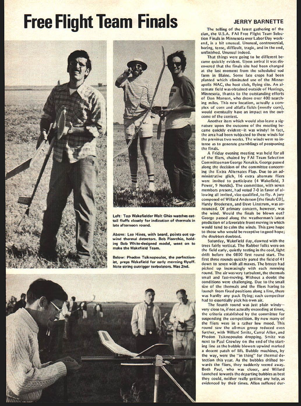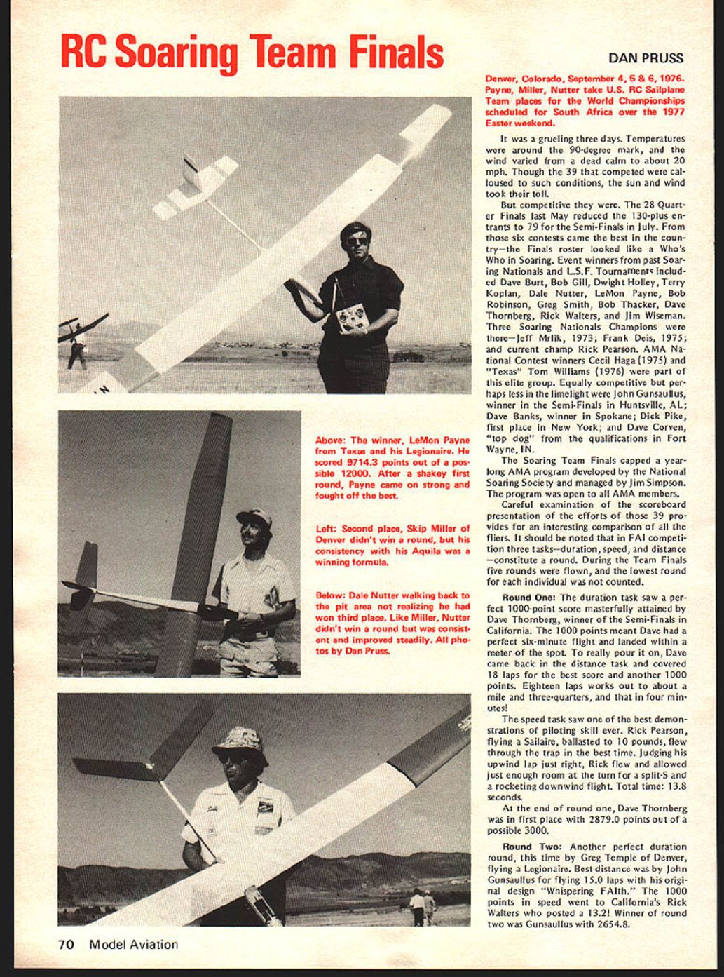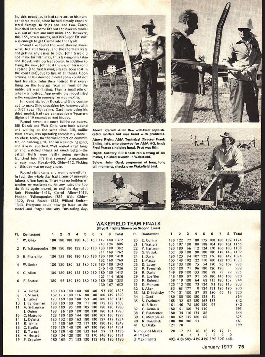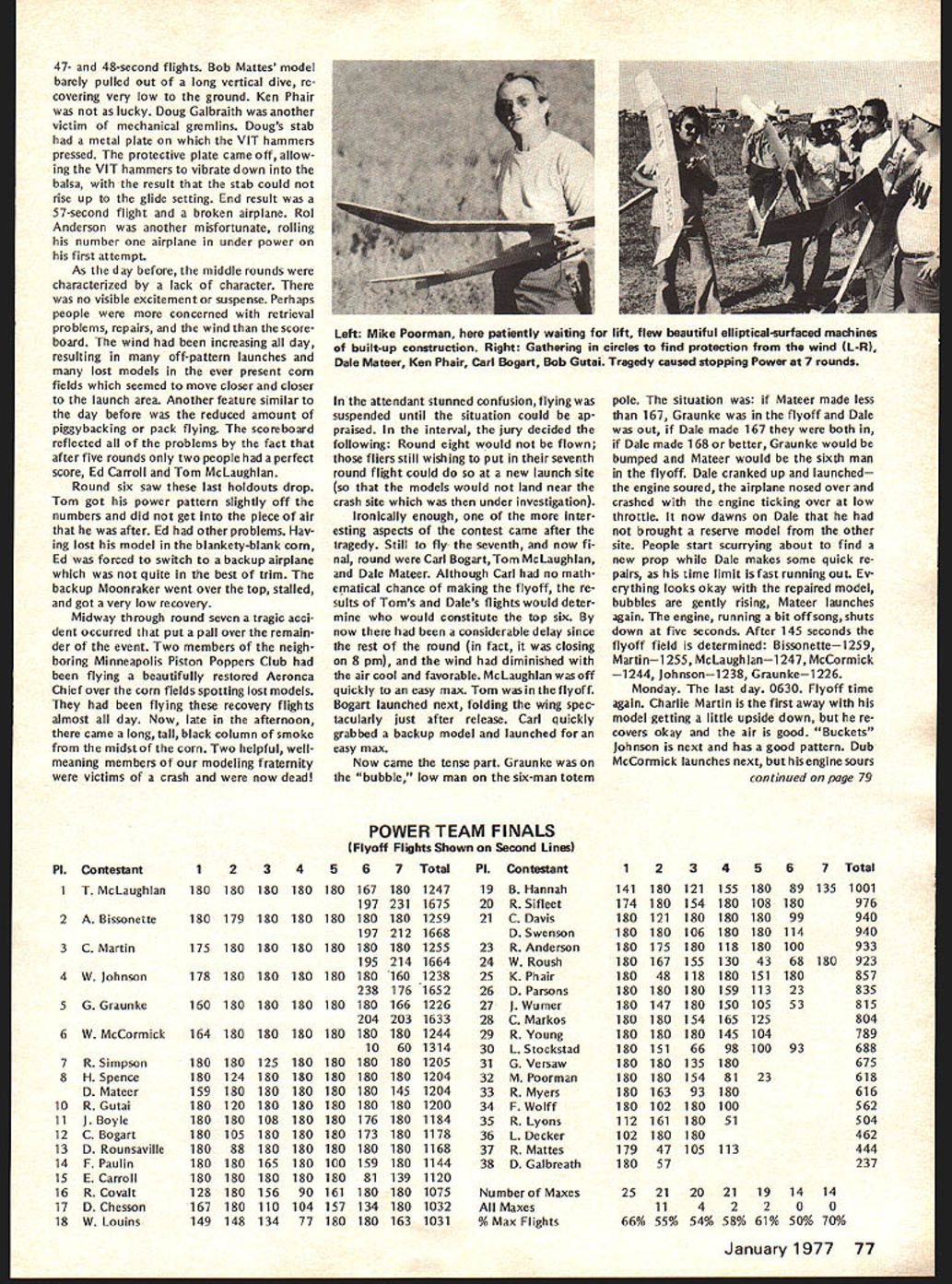 COM PET NE WSLETTE ACADEMY OF MODEL AERONAUTICS NEXT NATS IN CALIFORNIA FINALISTS NOW DECIDED FOR RC AEROBATICS TEAM looks way Best bet press time 1977 Nats site March Air Force Base near Riverside Californiajust east Los Angeles about 30 miles Disneyland details still worked Out before final official word can nounced AMA Nats Executive Committee efforts October aimed finalizing California Nats situation hope confirmation December 1 Also running press time second choice due less favorable factors former Oxnard Air Force Base near Camarillo California north Los Angeles Based AMA Executive Council meet ing September 18 unless arrangements sites fall through California Nats likely Probable dates first week August depending local college dorm availability housing What about return Ohio Possibly 1978 great success 1976 Nats Ohio makes return area likely after 1977 event meantime Council consensus seems West Coast Nats desired next feasible fulfillment past promises return area suitable site available last Cali fornia Natswasin 1967 CONQUEST 15 R/C QUALIFIES FOR QM PYLON manufacturer Conquest 15 R/C engine Cat No 2810 Cox Hobbies has written 1000 engines have produced thereby meeting re quirements acceptability Quarter Mid get RC Pylon Racing provided AMA rules Similarly produced Cox Hobbies quantities 1000 greater follow ing accessories Conquest 15 R/C Ex haust Extractor Cat No 2890 Exhaust Ex tractor length slit Cat No 28190 Muffler Cat No 2861 Racing Muf fler Cat No 28180 Previously published acceptable RC QM Rossi 15 R/C K & B 15 R/C Supertigre Front Intake R/C 05 15 R/C Enya 15 R/C Fox 15 R/C Taipan 15 R/C Formula I/Il Pylon Racing Previously published acceptable events K & B SR II 65cc Series 75 K & B 40 R/C 1972 1973 1974 models Supertigre G40 X40 HP 40 Front Rear Rotor OS 40 Schneurle Fox 40 R/C Testor/Mc Coy 40 R/C OPS 40 Manufacturers importers engines listed should contact AMA HQ immedi ately wish claim legalityrequir ing 1000 engines available Subject late arrival point reporting forms and/or other necessary adjustments points top 20 point earners list below have qualified compete 1977 RC Masters Team Selection Finals Inasmuch points accumulation program ended October 25 Dick Sonheim NSRCA re ported points November 1 perhaps much likelihood adjustment Points earned program shown right-hand column numbers within parentheses show meets have flown participant earning points 1 Tony Bonnetti Emerson NJ 2 Fred Kugel Celina OH 3 Robert Kelly Denver CO 4 Denis Donohue Bergenfield NJ 5 Win Thomas Bartlesville OK 6 Alan Dupler Millersport OH 7 John Britt Lees Summit MO 7 Pat Shuttleworth Warren IN 9 George Hill Annandale VA 10 Joe Bridi Harbor City CA 10 Ron Chidgey Pensacola FL 10 Dan Kowallek Kokomo IN 10 Jim Osbourne LumbertonTX 14 Ed Izzo Holliston MA 15 Bill Salkowski Canoga Park CA 16 Ed Keck Webster NY 17 C W Reed Raytown MO 18 Phil Gieseking Ft Wayne IN 19 Sal Battaglia New Rochelle NY 20 David Constant Bunkie LA 21 Eric Podzielinski Ft Wayne IN 22 Lloyd Nicholson Denver CO 23 Joe Gross Fr WorthTX 23 Don Seals Paris IL 25 Thomas Moore Nashville TN 26 Howard Rand les Grahanr NC 27 Ben Mathews New Orleans LA 10 645 8 352 7 308 8 292 6 286 6 275 6 253 7 253 6 246 5 242 5 242 7 242 5 242 9 240 4 231 5 228 6198 6188 8 153 4132 4128 5 110 4 88 20 points program qualifiers join 13 others previously qualified 1975 US RC Aerobatics Team members Dave Brown Mark Radcliff Rhett Miller Ill top 10 Master Class fliers 1976 Nation al contest entered program Don Lowe Michael Mueller Steve Helms Phil Kraft Wayne Abernethy Jim Whitley James Kimbro Dean Koger Carl Weber Jim Oddino 33 will eligible vie three slots 1977 US RC Aerobatics Team Team members will decided competition RC Masters Team Selec tion Finals held yet undecided place June 1977 Bids clubs interested being host RC Masters have submitted AMA HQ mid-Novem ber received press time 1977 FF & RC World Championships press time word just received Denmark will make firm offer De cember ClAM meeting host 1977 Free Flight World Championships Austria hear will withdraw its bid host 1977 RC Aerobatics WC due site unavailability FF TEAM PROGRAM UPDATE Nordic A-2 Team Selection AMAs FAI FF Committee chaired Bob Stalick recommending following proceduresand written A-2 program entrants being polled acceptability selec tion three different sites East Central West during 1977 Memorial Day weekend team member select ed site alternates select ed formula yet finalized two rounds flown Minnesota team finals will counted rescheduled events will eight-round contests flyoffs prescribed original program no trav el reimbursement will provided partici pants area Team Finals committee seekig suitable sites three areas well Contest Directors recom mendations should sent AMA HQ attn Micheline Madison distribution committee Ed Turner Replaces Parmenter appoint ment AMA District VIII Vice-President Murry Frank Ed Turner 3544 Granada Ft Worth TX 76118 will fill vacancy FAI FF Committee created resignation Frank Parmenter Team Manager Selection committee has decided team manager position needs filled soon possible waiting A-2 team selection now bal loting Wakefield Power team members plus first alternates A-2 finaliststhe latter prorated basis Two three bal lots thought necessary due de cision include nominees first ballot Financing FF Subcommittee Member Program entrants being asked approve spending up $400 reserve program funds transportation costs George Xenakis San Jose CA East Coast return connection attending December 1976 FAI ClAM Meeting Xenakis member ClAM Free Flight Subcommittee Over-ocean transportation costs Paris being shared AMA NFFS INDOOR TEAM PROGRAM STILL STALLED another round Indoor Program par ticipant voting deadline September 10 neither program concepts presented re ceived two-thirds majority continues quest AMA Indoor Team Selection committee concept will receive suf ficient approval Bucky Servaites chairs committee Eligible participate balloting en