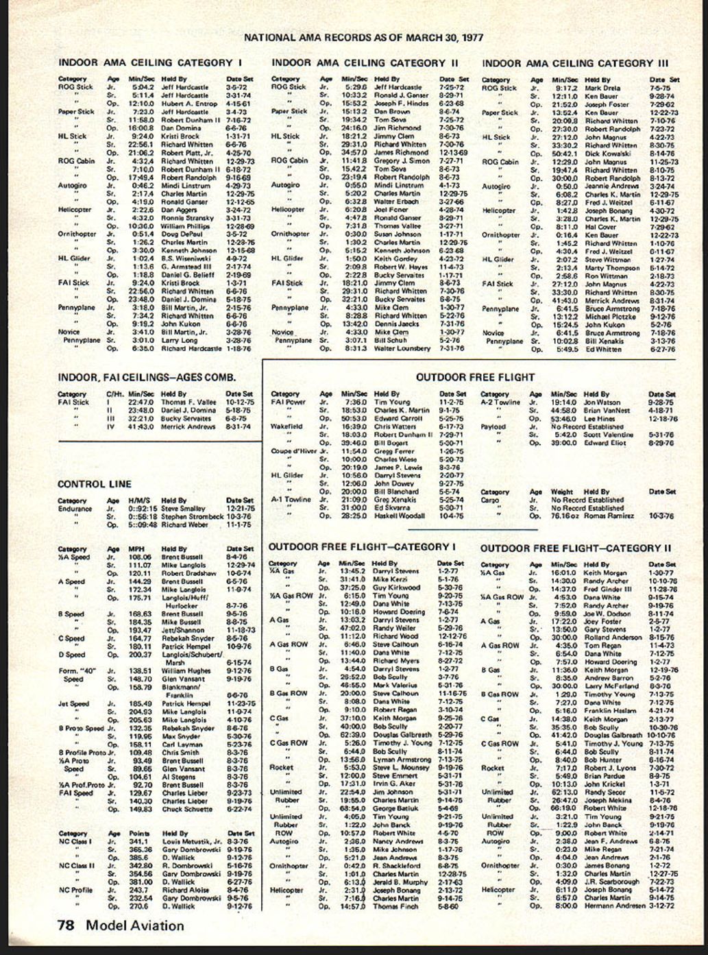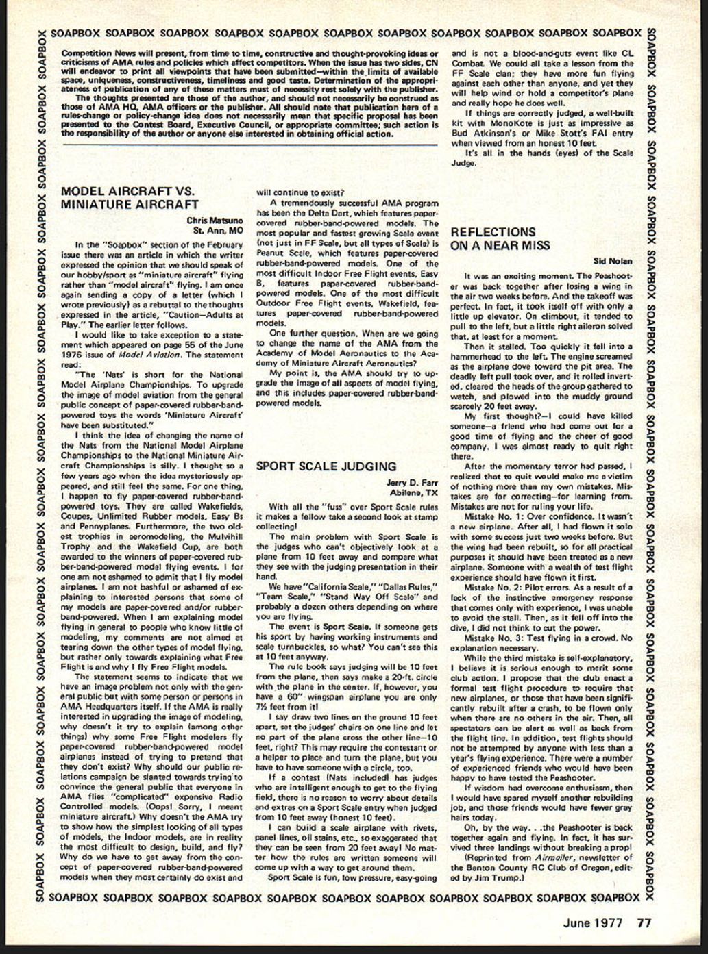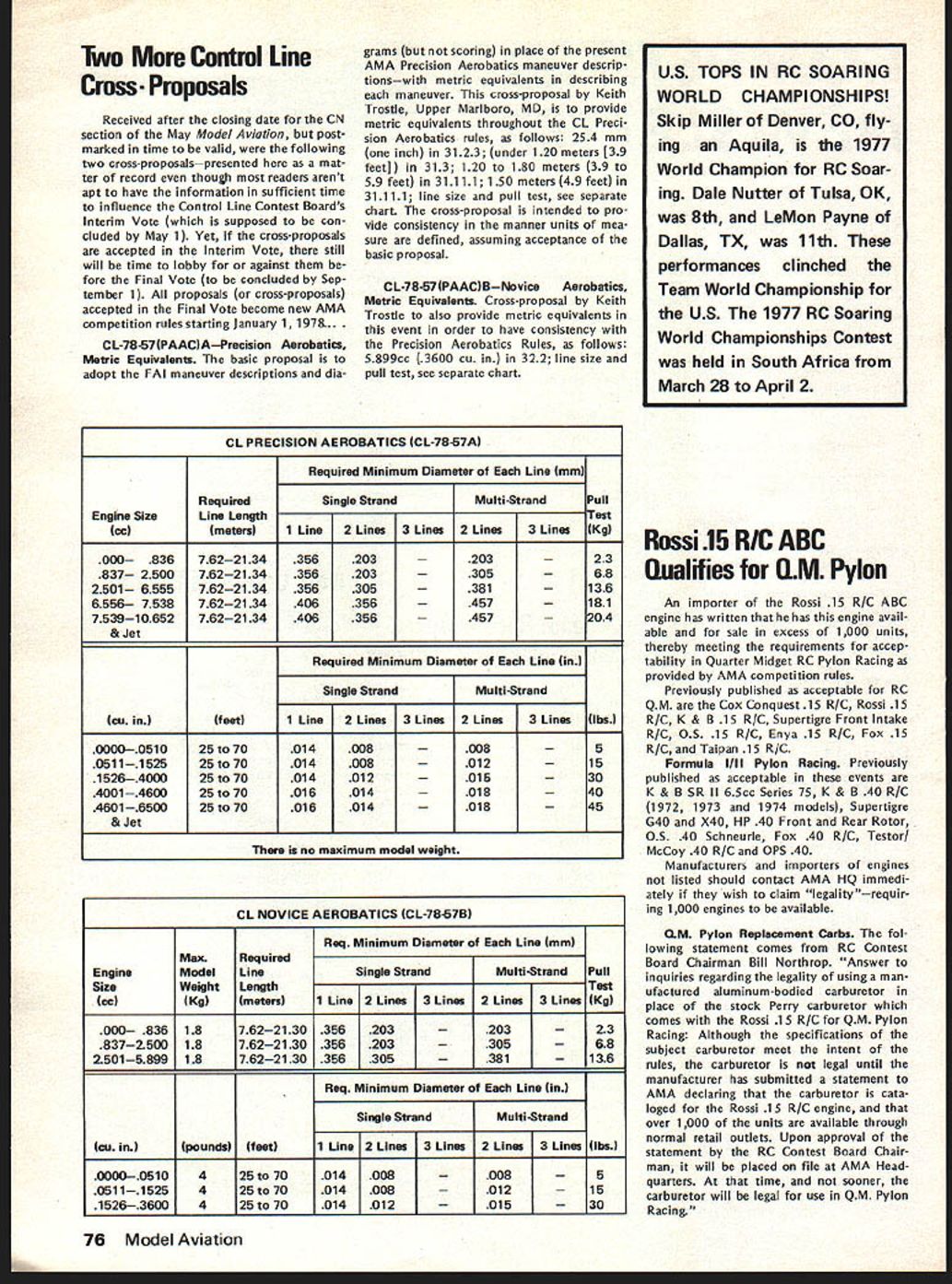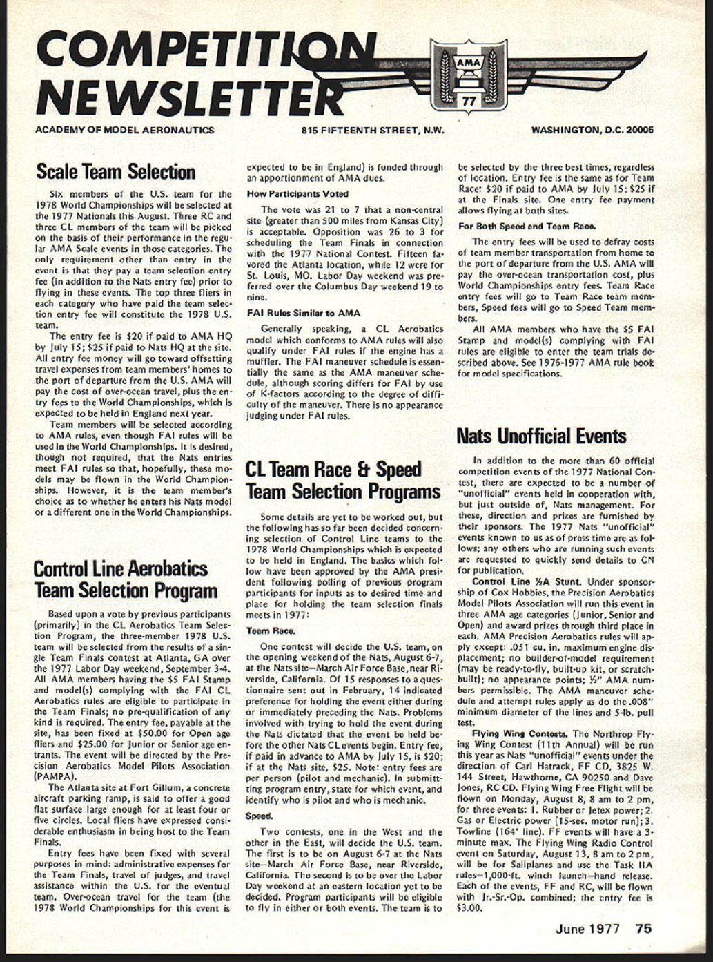 COM PETI TflM NE WSLETTEirnzW~ ACADEMY OF MODEL AERONAUTICS Scale Team Selection Six members US team 1978 World Championships will selected 1977 Nationals August Three RC three CL members team will picked basis performance regu lar AMA Scale events categories requirement other entry event pay team selection entry fee addition Nats entry fee prior flying events top three fliers category have paid team selec tion entry fee will constitute 1978 US team entry fee $20 paid AMA HQ July 15 $25 paid Nats HQ site entry fee money will go toward offsetting travel expenses team members homes port departure US AMA will pay cost over-ocean travel plus en try fees World Championships expected held England next year Team members will selected according AMA rules though FAI rules will used World Championships desired though required Nats entries meet FAI rules hopefully mo dels may flown World Champion ships However team members choice whether enters Nats model different World Championships Contml Line Aembatics Team Selection Pmgram Based upon vote previous participants primarily CL Aerobatics Team Selec tion Program three-member 1978 US team will selected results sin gle Team Finals contest Atlanta GA over 1977 Labor Day weekend September 3-4 AMA members having $5 FAI Stamp models complying FAI CL Aerobatics rules eligible participate Team Finals no pre-qualification kind required entry fee payable site has fixed $5000 Open age fliers $2500 Junior Senior age en trants event will directed Pre cision Aerobatics Model Pilots Association PAMPA Atlanta site Fort Gillum concrete aircraft parking ramp said offer good flat surface large enough least four five circles Local fliers have expressed consi derable enthusiasm being host Team Finals Entry fees have fixed several purposes mind administrative expenses Team Finals travel judges travel assistance within US eventual team Over-ocean travel team 1978 World Championships event 815 FIFTEENTH STREET NW expected England funded through apportionment AMA dues Participants Voted vote 21 7 non-central site greater 500 miles Kansas City acceptable Opposition 26 3 scheduling Team Finals connection 1977 National Contest Fifteen fa vored Atlanta location 12 St Louis MO Labor Day weekend pre ferred over Columbus Day weekend 19 nine FAI Rules Similar AMA Generally speaking CL Aerobatics model conforms AMA rules will also qualify under FAI rules engine has muffler FAI maneuver schedule essen tially same AMA maneuver sche dule although scoring differs FAI use K-factors according degree diffi culty maneuver no appearance judging under FAI rules CL Team Race & Speed Team Selection Programs Some details yet worked out following has far decided concern ing selection Control Line teams 1978 World Championships expected held England basics fol low have approved AMA presi dent following polling previous program participants inputs desired time place holding team selection finals meets 1977 Team Race contest will decide US team opening weekend Nats August 6-7 Nats siteMarch Air Force Base near Ri verside California 15 responses ques tionnaire sent out February 14 indicated preference holding event either during immediately preceding Nats Problems involved trying hold event during Nats dictated event held fore other NatsCLevents begin Entry fee paid advance AMA July 15 $20 Nats site $25 Note entry fees per person pilot mechanic submitt ting program entry state event identify pilot mechanic Speed Two contests West other East will decide US team first August 6-7 Nats siteMarch Air Force Base near Riverside California second over Labor Day weekend eastern location yet decided Program participants will eligible fly either both events team WASHINGTON DC 20005 selected three best times regardless location Entry fee same Team Race $20 paid AMA July 15 $25 Finals site entry fee payment allows flying both sites Both Speed Team Race entry fees will used defray costs team member transportation home port departure US AMA will pay over-ocean transportation cost plus World Championships entry fees Team Race entry fees will go Team Race team mem bers Speed fees will go Speed Team mem bers AMA members have $5 FAI Stamp models complying FAI rules eligible enter team trials de scribed above See 1976-1977 AMA rule book model specifications Nats Unofficial Events addition 60 official competition events 1977 National Con test expected number unofficial events held cooperation just outside Nats management direction prizes furnished sponsors 1977 Nats unofficial events known us press time fol lows others running such events requested quickly send details CN publication Control Line Y2A Stunt Under sponsor ship Cox Hobbies Precision Aerobatics Model Pilots Association will run event three AMA age categories Junior Senior Open award prizes through third place AMA Precision Aerobatics rules will ap ply except 051 cu maximum engine dis placement no builder-of-model requirement may ready-to-fly built-up kit scratchbuilt no appearance points num bers permissible AMA maneuver sche dule attempt rules apply 008 minimum diameter lines 5-lb pull test Flying Wing Contests Northrop Fly ing Wing Contest 11th Annual will run year Nats unofficial events under direction Carl Hatrack FF CD 3825 W 144 Street Hawthorne CA 90250 Dave Jones RC CD Flying Wing Free Flight will flown Monday August 8 8 am 2 pm three events 1 Rubber Jetex power 2 Gas Electric power 15-sec motor run 3 Towline 164 line FF events will have 3minute max Flying Wing Radio Control event Saturday August 13 8 am 2 pm will Sailpianes use Task IIA rulesi 000-ft winch launchhand release events FF RC will flown Jr-Sr-Op combined entry fee $300 June1977 75 Two Contml Line Cross Preposals Received after closing date CN section May Model Aviation post marked time valid following two cross-proposalspresented mat ter record though readers arent apt have information sufficient time influence Control Line Contest Boards Interim Vote supposed con cluded May 1 Yet cross