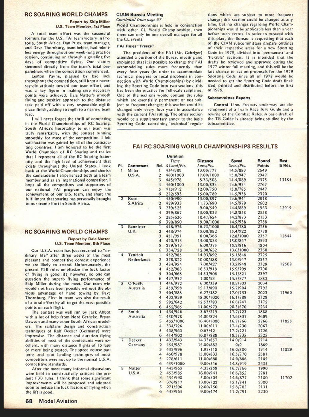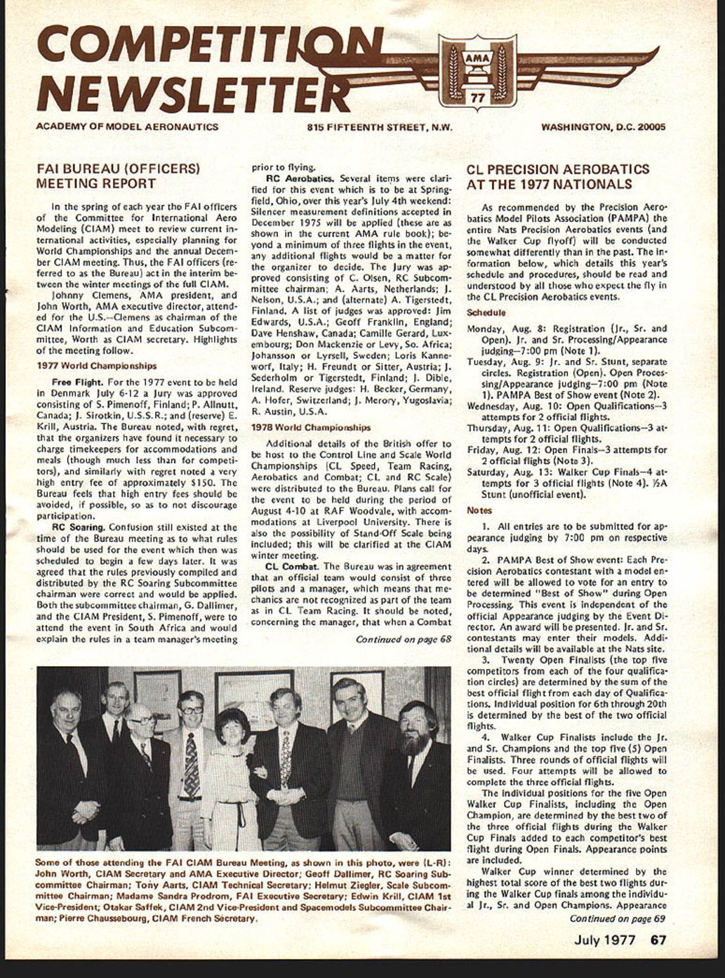 COM PETI TW~ NE WSLETTEK ACADEMY OF MODEL AERONAUTICS FAI BUREAU OFFICERS MEETING REPORT spring year FAI officers Committee International Aero Modeling ClAM meet review current ternational activities especially planning World Championships annual Decem ber ClAM meeting Thus FAI officers re ferred Bureau act interim tween winter meetings full ClAM Johnny Clemens AMA president John Worth AMA executive director attend ed USClemens chairman ClAM Information Education Subcom mittee Worth ClAM secretary Highlights meeting follow 1977 World Championships Free Flight 1977 event held Denmark July 6-12 Jury approved consisting S Pimenoff Finland P Allnutt Canada J Sirotkin USSR reserve E Krill Austria Bureau noted regret organizers have found necessary charge timekeepers accommodations meals though much less competi tors similarly regret noted very high entry fee approximately $150 Bureau feels high entry fees should avoided possible discourage participation RC Soaring Confusion still existed time Bureau meeting what rules should used event scheduled begin few days later agreed rules previously compiled distributed RC Soaring Subcommittee chairman correct would applied Both subcommittee chairman G Dallimer ClAM President S Pimenoff attend event South Africa would explain rules team managers meeting 815 FIFTEENTH STREET NW prior flying RC Aerobatics Several items clari fied event Spring field Ohio over years July 4th weekend Silencer measurement definitions accepted December 1975 will applied shown current AMA rule book yond minimum three flights event additional flights would matter organizer decide jury ap proved consisting C Olsen RC Subcom mittee chairman Aarts Netherlands J Nelson USA alternate Tigerstedt Finland list judges approved Jim Edwards USA Geoff Franklin England Dave Henshaw Canada Camille Gerard Lux embourg Don Mackenzie Levy So Africa Johansson Lyrsell Sweden Loris Kanne worf Italy H Freundt Sitter Austria J Sederholm Tigerstedt Finland J Dible Ireland Reserve judges H Becker Germany Hofer Switzerland J Merory Yugoslavia R Austin USA 1978 World Championships Additional details British offer host Control Line Scale World Championships CL Speed Team Racing Aerobatics Combat CL RC Scale distributed Bureau Plans call event held during period August 4-10 RAF Woodvale accom modations Liverpool University also possibility Stand-Off Scale being included will clarified ClAM winter meeting CL Combat Bureau agreement official team would consist three pilots manager means chanics recognized part team CL Team Racing should noted concerning manager Combat Continued page 68 WASHINGTON DC 20005 CL PRECISION AEROBATICS AT THE 1977 NATIONALS As recommended Precision Aero batics Model Pilots Association PAMPA entire Nats Precision Aerobatics events Walker Cup flyoff will conducted somewhat differently past formation below details years schedule procedures should read understood expect fly CL Precision Aerobatics events Schedule Monday Aug 8 Registration Jr Sr Open Jr Sr Processing/Appearance judging700 pm Note 1 Tuesday Aug 9 Jr Sr Stunt separate circles Registration Open Open Proces sing/Appearance judging700 pm Note 1 PAMPA Best Show event Note 2 Wednesday Aug 10 Open Qualifications3 attempts 2 official flights Thursday Aug 11 Open Qualifications3 tempts 2 official flights Friday Aug 12 Open Finals3 attempts 2 official flights Note 3 Saturday Aug 13 Walker Cup Finals4 tempts 3 official flights Note 4 Stunt unofficial event Notes 1 entries submitted ap pearance judging 700 pm respective days 2 PAMPA Best Show event Pre cision Aerobatics contestant model en tered will allowed vote entry determined Best Show during Open Processing event independent official Appearance judging Event Di rector An award will presented Jr Sr contestants may enter models Addi tional details will available Nats site 3 Twenty Open Finalists top five competitors four qualifica tion circles determined sum best official flight day Qualifica tions Individual position 6th through 20th determined best two official flights 4 Walker Cup Finalists include Jr Sr Champions top five 5 Open Finalists Three rounds official flights will used Four attempts will allowed complete three official flights individual positions five Open Walker Cup Finalists including Open Champion determined best two three official flights during Walker Cup Finals added competitors best flight during Open Finals Appearance points included Walker Cup winner determined highest total score best two flights dur ing Walker Cup finals among individu al Jr Sr Open Champions Appearance Continued page 69 July1977 67 Some attending FAI ClAM Bureau Meeting shown photo L-R John Worth ClAM Secretary AMA Executive Director Geoff Dallimer RC Soaring Sub committee Chairman Tony Aarts ClAM Technical Secretary Helmut Ziegler Scale Subcom mittee Chairman Madame Sandra Prodrom FAI Executive Secretary Edwin Krill ClAM 1st Vice-President Otakar Saffek ClAM 2nd Vice-President Spacemodels Subcommittee Chair man Pierre Chaussebourg ClAM French Secretary RC SOARING WORLD CHAMPS Report Skip Miller US Team Member 1st Place total team effort successful formula US FAI team victory Pre toria South Africa Dan Pruss team manager Dave Thornburg team helper relent less energy throughout week-long practice session continuing through grueling five days competitive flying victory stemmed directly teams total pre paredness competition commenced LeMon Payne plagued bad luck throughout competition still kept neversay-die attitude toward team effort key figure making sure necessary points achieved Dale Nutters smooth flying positive approach distance task paid off very respectable eighth place finish adding strength narrow team lead will never forget thrill competing World Championships RC Soaring South Africas hospitality team truly remarkable contest running smoothly competition felt satisfaction gained participa ting countries am honored first World Champion RC Soaring realize represent RC Soaring fra
