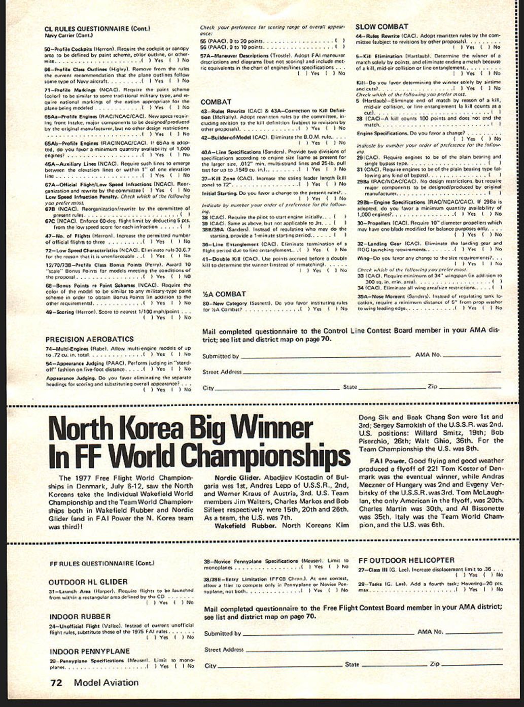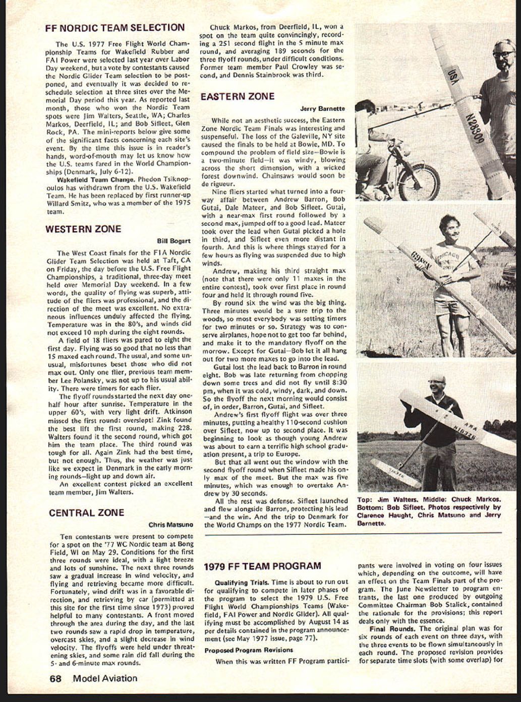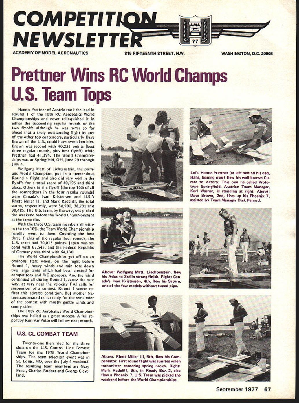 Prettner Wins RC World Champs US Team Tops Hanno Prettner Austria took lead Round 1 10th RC Aerobatics World Championships never relinquished either succeeding regular rounds two flyoffsaithough never far ahead truly outstanding flight other top contenders particularly Dave Brown US could have overtaken him Brown second 40255 points best three regular rounds plus best flyoff Prettner 41395 World Champion ships Springfield OH June 29 through July 4 Wolfgang Matt Lichtenstein previ ous World Champion put tremendous Round 4 flight also did very well flyoffs total score 40195 third place Others flyoff top 10% competitors four regular rounds Canadas Ivan Kristensen USs Rhett Miller Ill Mark Radcliff total scores respectively 38990 38735 38485 US team way picked weekend before World Championships same site three US team members top 10%theTeam World Championship handily went Counting best three flights regular four rounds US team 70015 points Japan se cond 67545 Federal Republic Germany third 641 30 World Championships got off ominous start night before Round 1 heavy winds rain tore down two large tents erected competitors WC sponsors wind continued during Round 1 across run way very near velocity FAI calls suspension contest Round 1 scores re flect adverse condition Mother Na ture cooperated remarkably remainder contest mostly gentle winds sunny skies 10th RC Aerobatics World Champion ships hailed great success full re port Ron VanPutte will follow next month September 1977 67 NE WSLET ACADEMY OF MODEL AERONAUTICS815 FIFTEENTH STREET NWWASHINGTON DC 20006 Left Hanno Prettner lat left behind dad Hans leaning over flew well-known Cu rare victory called Proto type Springfield Awtrian Team Manager Karl Wasner standing right Above Dave Brown 2nd fires up Phoenix 7 assisted Team Manager Dick Penrod Above Wolfgang Matt Liechtenstein flew Atlas 3rd strong finish Right Can adas Ivan Kristensen 4th flew Saturn few models tuned pipe US CL COMBAT TEAM Twenty-one fliers vied three slots US Control Line Combat Team 1978 World Champion ships team selection event St Louis MO over July 4 weekend resulting team members Gary Frost Charles Rudner George Cleve land Above Rhett Miller III 5th flew Coin pensator First round flight aborted transmitter centering spring broke Right Mark Radcliff 6th Ready Box 2 also flew Phoenix 7 US Team picked weekend before World Championships FF NORDIC TEAM SELECTION US 1977 Free Flight World Cham pionship Teams Wakefield Rubber FAI Power selected last year over Labor Day weekend vote contestants caused Nordic Glider Team selection post poned eventually decided re schedule selection three sites over morial Day period year As reported last month won Nordic Team spots Jim Walters Seattle WA Charles Markos Deerfield IL Bob Sifleet Glen Rock PA mini-reports below give some significant facts concerning sites event time issue readers hands word-of-mouth may let us know US teams fared World Champion ships Denmark July 6-1 2 Wakefield Team Change Phedon Tsiknop oulos has withdrawn US Wakefield Team has replaced first runner-up Willard Smitz member 1975 team WESTERN ZONE Chuck Markos Deerfield IL won spot team quite convincingly record ing 251 second flight 5 minute max round averaging 189 seconds three flyoff rounds under difficult conditions Iormer team member Paul Crowley se cond Dennis Stainbrook third EASTERN ZONE Jerry Barnatte aesthetic success Eastern Zone Nordic Team Finals interesting suspenseful loss Galeville NY site caused finals held Bowie MD compound problem field sizeBowie two-minute fieldit windy blowing across short dimension wicked forest downwind Chainsaws would soon de rigueur Nine fliers started what turned fourway affair between Andrew Barron Bob Gutai Dale Mateer Bob Sifleet Gutai near-max first round followed second max jumped off toagood lead Mateer took over lead Gutal picked hole third Sifleet distant fourth things stayed few hours flying suspended due high winds Andrew making third straight max note 11 maxes entire contest took over first place round four held through round five round six wind big thing Three minutes would sure trip woods everybody setting timers two minutes Strategy con serve airplanes hope get too far behind make mandatory flyoff morrow Except GutaiBob let hang out two maxes go lead Gutai lost lead back Barron round eight Bob late returning chopping down some trees did fly until 830 pm cold windy dark down So flyoff next morning would consist order Barron Gutai Sifleet Andrews first flyoff flight over three minutes putting healthy 110-second cushion over Sifleet now up second place beginning look though young Andrew about earn terrific high school gradu ation present trip Europe went out window second flyoff round Sifleet made ly max meet max five minutes enough overtake An drew 30 seconds rest defense Sifleet launched flew alongside Barron protecting lead win trip Denmark Chris Matsuno World Champs 1977 Nordic Team Bill Bogart West Coast finals Fl Nordic Glider Team Selection held Taft CA Friday day before US Free Flight Championships traditional three-day meet held over Memorial Day weekend few words quality flying superb atti tude fliers professional di rection meet excellent No extra neous influences unduly affected flying Temperature 80s winds did exceed 10 mph during eight rounds field 18 fliers pared eight tre first day Flying good no less 15 maxed roundThe usual some un usual misfortunes beset did max out Only flier previous team mem ber Lee Polansky up usual abil ity timers flier flyoff rounds started next day onehalf hour after sunrise Temperature upper 60s very light drift Atkinson missed first round overslept Zink found best lift first round making 228 Walters found second round got him team place third round tough Again Zink best time enough Thus weather just like expect Denmark early morn ing roundslight up down air An excellent contest picked excellent team member Jim Walters CENTRAL ZONE Ten contestants present compete spot 77 