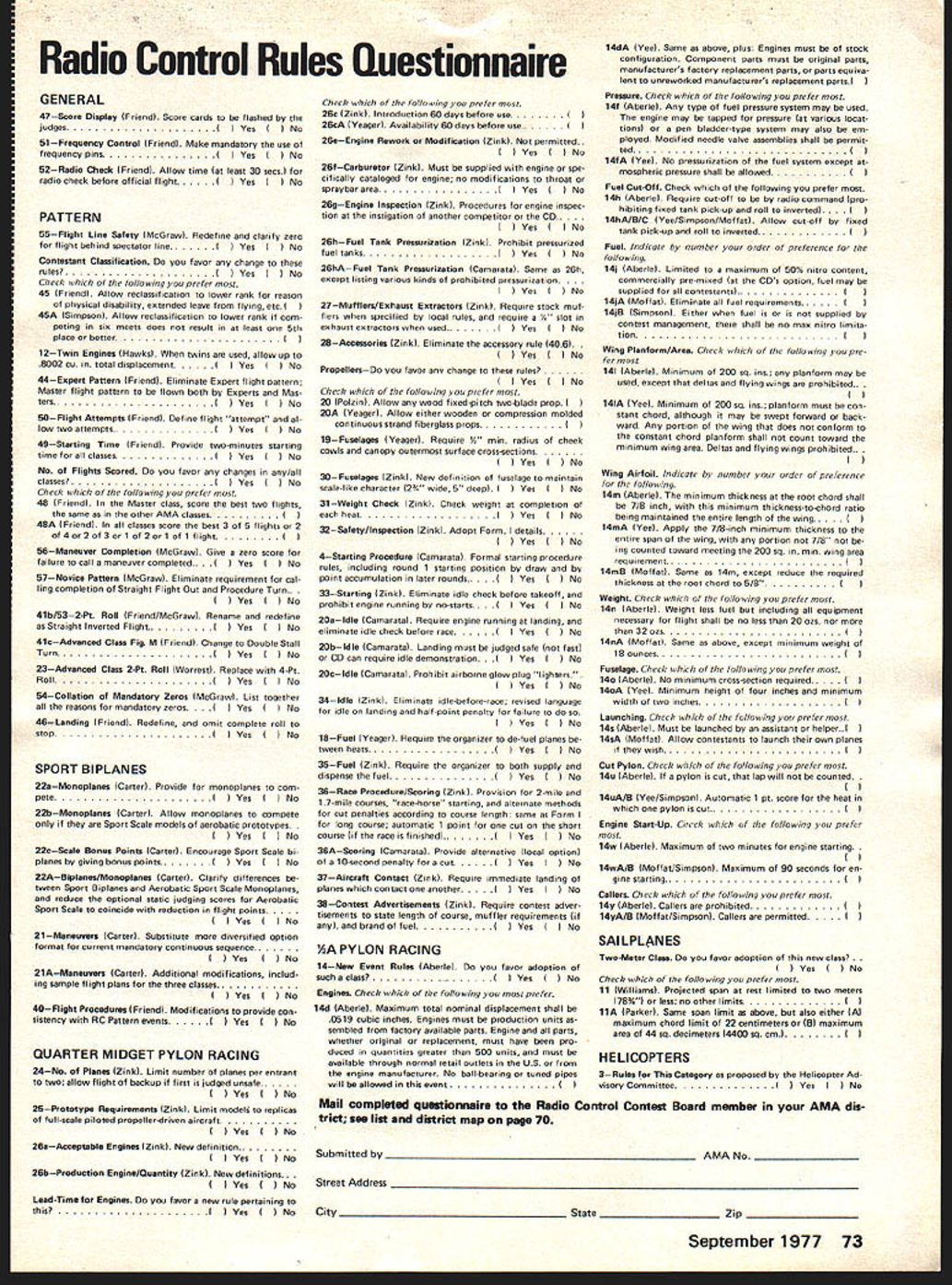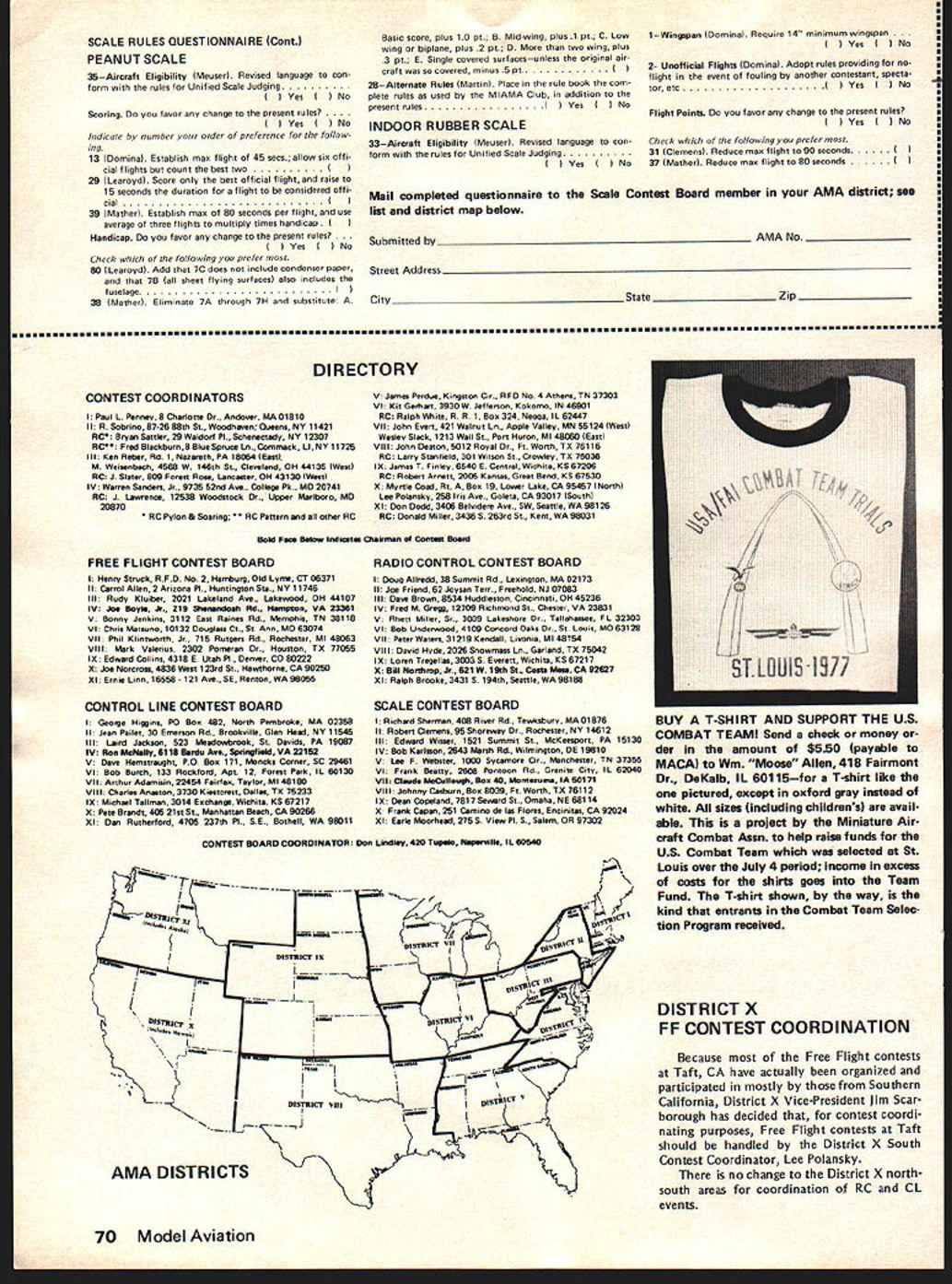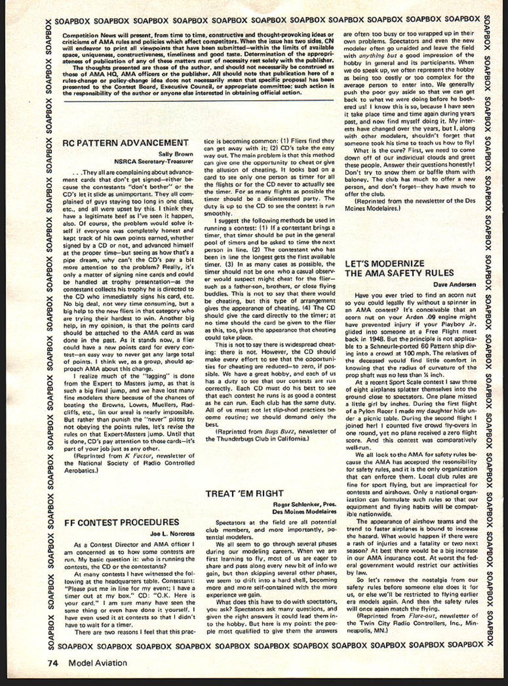 Prettner Wins RC World Champs US Team Tops Hanno Prettner Austria took lead Round 1 10th RC Aerobatics World Championships never relinquished either succeeding regular rounds two flyoffsaithough never far ahead truly outstanding flight other top contenders particularly Dave Brown US could have overtaken him Brown second 40255 points best three regular rounds plus best flyoff Prettner 41395 World Champion ships Springfield OH June 29 through July 4 Wolfgang Matt Lichtenstein previ ous World Champion put tremendous Round 4 flight also did very well flyoffs total score 40195 third place Others flyoff top 10% competitors four regular rounds Canadas Ivan Kristensen USs Rhett Miller Ill Mark Radcliff total scores respectively 38990 38735 38485 US team way picked weekend before World Championships same site three US team members top 10%theTeam World Championship handily went Counting best three flights regular four rounds US team 70015 points Japan se cond 67545 Federal Republic Germany third 641 30 World Championships got off ominous start night before Round 1 heavy winds rain tore down two large tents erected competitors WC sponsors wind continued during Round 1 across run way very near velocity FAI calls suspension contest Round 1 scores re flect adverse condition Mother Na ture cooperated remarkably remainder contest mostly gentle winds sunny skies 10th RC Aerobatics World Champion ships hailed great success full re port Ron VanPutte will follow next month September 1977 67 NE WSLET ACADEMY OF MODEL AERONAUTICS815 FIFTEENTH STREET NWWASHINGTON DC 20006 Left Hanno Prettner lat left behind dad Hans leaning over flew well-known Cu rare victory called Proto type Springfield Awtrian Team Manager Karl Wasner standing right Above Dave Brown 2nd fires up Phoenix 7 assisted Team Manager Dick Penrod Above Wolfgang Matt Liechtenstein flew Atlas 3rd strong finish Right Can adas Ivan Kristensen 4th flew Saturn few models tuned pipe US CL COMBAT TEAM Twenty-one fliers vied three slots US Control Line Combat Team 1978 World Champion ships team selection event St Louis MO over July 4 weekend resulting team members Gary Frost Charles Rudner George Cleve land Above Rhett Miller III 5th flew Coin pensator First round flight aborted transmitter centering spring broke Right Mark Radcliff 6th Ready Box 2 also flew Phoenix 7 US Team picked weekend before World Championships FF NORDIC TEAM SELECTION US 1977 Free Flight World Cham pionship Teams Wakefield Rubber FAI Power selected last year over Labor Day weekend vote contestants caused Nordic Glider Team selection post poned eventually decided re schedule selection three sites over morial Day period year As reported last month won Nordic Team spots Jim Walters Seattle WA Charles Markos Deerfield IL Bob Sifleet Glen Rock PA mini-reports below give some significant facts concerning sites event time issue readers hands word-of-mouth may let us know US teams fared World Champion ships Denmark July 6-1 2 Wakefield Team Change Phedon Tsiknop oulos has withdrawn US Wakefield Team has replaced first runner-up Willard Smitz member 1975 team WESTERN ZONE Chuck Markos Deerfield IL won spot team quite convincingly record ing 251 second flight 5 minute max round averaging 189 seconds three flyoff rounds under difficult conditions Iormer team member Paul Crowley se cond Dennis Stainbrook third EASTERN ZONE Jerry Barnatte aesthetic success Eastern Zone Nordic Team Finals interesting suspenseful loss Galeville NY site caused finals held Bowie MD compound problem field sizeBowie two-minute fieldit windy blowing across short dimension wicked forest downwind Chainsaws would soon de rigueur Nine fliers started what turned fourway affair between Andrew Barron Bob Gutai Dale Mateer Bob Sifleet Gutai near-max first round followed second max jumped off toagood lead Mateer took over lead Gutal picked hole third Sifleet distant fourth things stayed few hours flying suspended due high winds Andrew making third straight max note 11 maxes entire contest took over first place round four held through round five round six wind big thing Three minutes would sure trip woods everybody setting timers two minutes Strategy con serve airplanes hope get too far behind make mandatory flyoff morrow Except GutaiBob let hang out two maxes go lead Gutai lost lead back Barron round eight Bob late returning chopping down some trees did fly until 830 pm cold windy dark down So flyoff next morning would consist order Barron Gutai Sifleet Andrews first flyoff flight over three minutes putting healthy 110-second cushion over Sifleet now up second place beginning look though young Andrew about earn terrific high school gradu ation present trip Europe went out window second flyoff round Sifleet made ly max meet max five minutes enough overtake An drew 30 seconds rest defense Sifleet launched flew alongside Barron protecting lead win trip Denmark Chris Matsuno World Champs 1977 Nordic Team Bill Bogart West Coast finals Fl Nordic Glider Team Selection held Taft CA Friday day before US Free Flight Championships traditional three-day meet held over Memorial Day weekend few words quality flying superb atti tude fliers professional di rection meet excellent No extra neous influences unduly affected flying Temperature 80s winds did exceed 10 mph during eight rounds field 18 fliers pared eight tre first day Flying good no less 15 maxed roundThe usual some un usual misfortunes beset did max out Only flier previous team mem ber Lee Polansky up usual abil ity timers flier flyoff rounds started next day onehalf hour after sunrise Temperature upper 60s very light drift Atkinson missed first round overslept Zink found best lift first round making 228 Walters found second round got him team place third round tough Again Zink best time enough Thus weather just like expect Denmark early morn ing roundslight up down air An excellent contest picked excellent team member Jim Walters CENTRAL ZONE Ten contestants present compete spot 77 