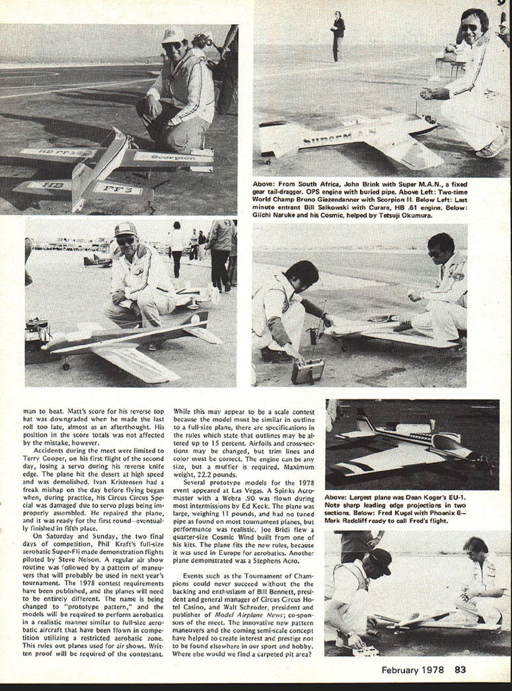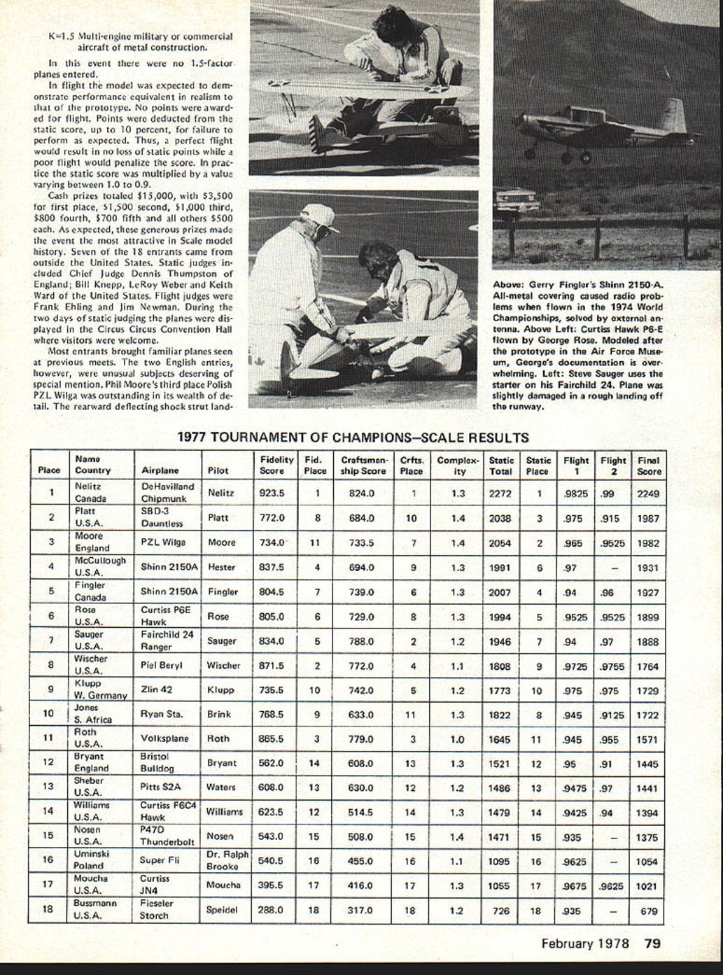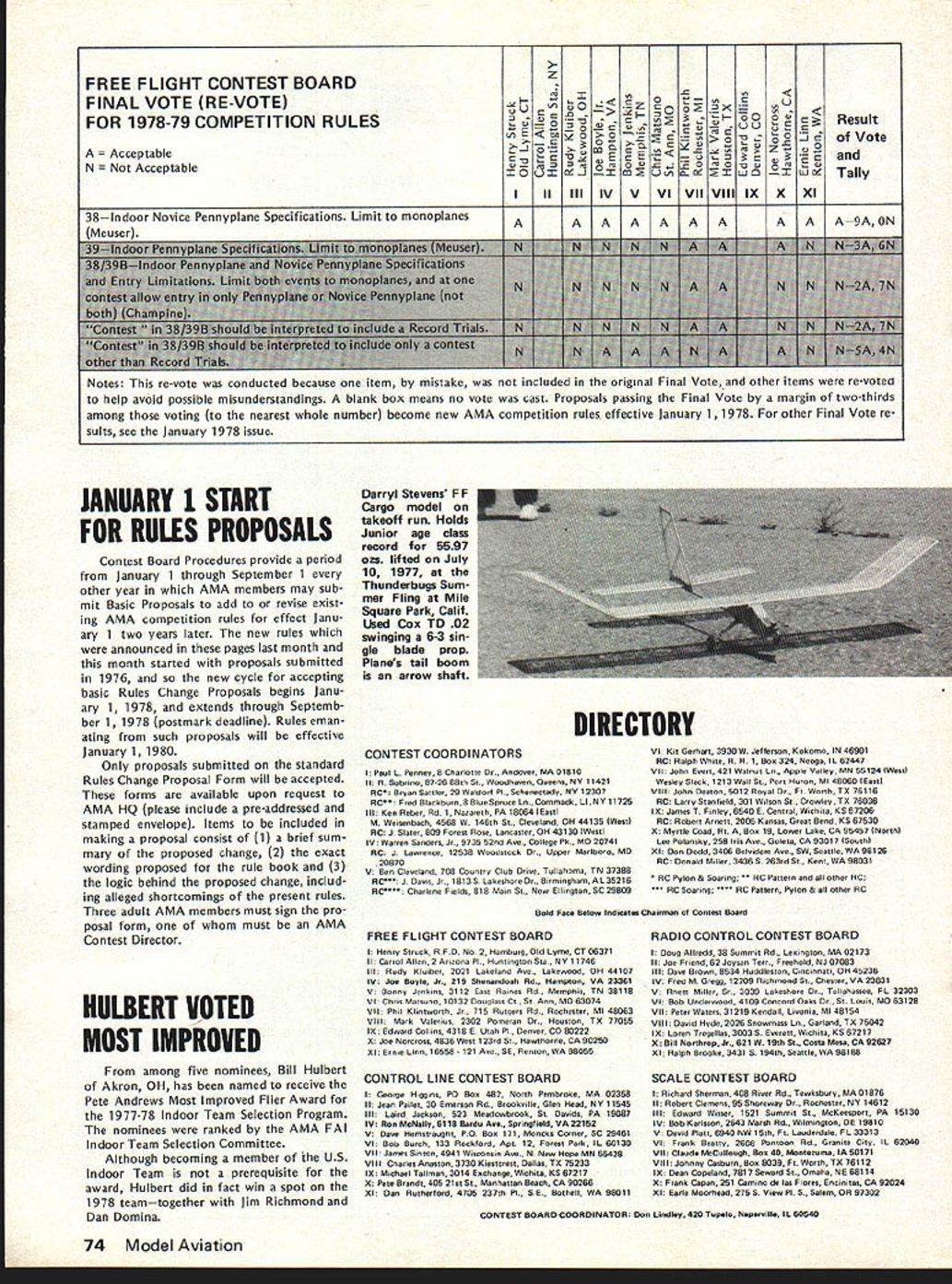 COM PETI TW NE WSLETTEREiUP ACADEMY OF MODEL AERONAUTICS 815 FIFTEENTH STREET NW WASHINGTON DC 20005 RC SOARING TEAM PROGRAM PLANNING 1978 program selecting 1979 US Soaring World Championships learn will quite similar previous 1976 program according results ballot previous program entrants Voting authorized Team Selection Program Committee modi fy 1976 program permitting quar ter-final contests flown during months April May June approved 74 5 B increasing number semi-final contests 10 demand warrants approved 75 4 C permitting semi-final contests flown first weekend July 1-3 second weekend July 8-9 approved 75 4 Participants also approved chairman AMA district members RC Soaring Team Selection Program Committee fol lows Ray Marvin chairman Dwight -lolley District Leon Pike II Dave Burt Ill Brian L Foster IV Jim W Lenoir V John Nielsen VI Warren Tiahrt VII Dale Nutter VIII Skip Miller IX Dave Thornburg X Don Burt XI vote 76 2 favor group Ray Marvin approved chair man committee CD 1976 RC Soaring Team Finals CD RC Soaring events 1977 AMA Nats California National Soaring So ciety FAI Coordinator STOY INDOOR KL GUDER RECORD written Free Flight Contest Board under chairmanship Joe Boyle Jr considering whether rescind Stan Stoys National AMA Record 1 088 seconds Indoor Hand-Launch Glider Cate gory issue whether building used its turbulent conditions acceptable record purposes Descriptions circum stances record Bob Meusers December Free Flight Duration column Bud Tennys January 1978 Indoor column board also considering whether need enact emergency interpre tation ruling concerning acceptable Indoor sites board members asked suggest language such emergency ruling event boards response course action RADIO CONTROL CONTEST BOARD FINALVOTERE-VOTE ~U0O FOR 1978-79 COMPETITION RULESo lt Vote AcceptableeCLL-0 C cceptable~- C -E- Tally IIIIIIIV V VIVII VIII IX X XI 45Contestant Classification Allow lower rank physical dis frometcFriendlAAAAAAAAAAAA11AON C 0 0 Q tia ci announced Quarter Midget Pylon Rules Status Upgrade provisional AIAA Notes This re-vote conducted because mostly due nature construction original Final Vote did produce conclusive results Proposals passing Final Vote margin two-thirds among voting nearest whole number become new AMA com petition rules effective January 1 1978 other Final Vote results see January 1978 issue February 1978 73 No pressurization fuel system except atmospheric pressure shall allowed Yee 14Fuel Limited max 50% nitro commercially pre-mixed w CD option fuel may suoolied contestan Ab C 0 00 NNNAlAANAA7A 4N N A A NIN N Lap cut called will ~nted lAl AlIIA8A3N FREE FLIGHT CONTEST BOARDZ -c C FINAL VOTE RE-VOTE ova c Res silt FOR 1978-79COMPETITION RULES 1Eb%OO0-0GJ ofVote eptableS 5 -5 - 4COmo-oct o Eva N ptable~ u o LU Tally III III IV V VI VII VIII IX X XI 38Indoor Novice Pennyplane Specifications Limit monoplanes A A A A A9A ON Notes This re-vote conducted because item mistake included original Final Vote other items re-voted help avoid possible misunderstandings blank box means no vote cast Proposals passing Final Vote margin two-thirds among voting nearest whole number become new AMA competition rules effective January 1 1978 other Final Vote re sults see January 1978 issue JAMUARY 1 START FOR RULES PROPOSALS Contest Board Procedures provide period January 1 through September 1 other year AMA members may sub mit Basic Proposals add revise exist ing AMA competition rules effect Janu ary 1 two years later new rules announced pages last month month started proposals submitted 1976 new cycle accepting basic Rules Change Proposals begins Janu ary 1 1978 extends through Septemb ber 11978 postmark deadline Rules eman ating such proposals will effective January 11980 Only proposals submitted standard Rules Change Proposal Form will accepted forms available upon request AMA HQ please include pre-addressed stamped envelope Items included making proposal consist 1 brief sum mary proposed change 2 exact wording proposed rule book 3 logic behind proposed change includ ing alleged shortcomings present rules Three adult AMA members must sign pro posal form must AMA Contest Director IIULBERT VOTED MOST IMPROVED among f ye nom nees Bill Hulbe Akron OH has named receive Pete Andrews Most Improved Flier Award 1977-78 Indoor Team Selection Program nominees ranked AMA FAI Indoor Team Selection Committee Although becoming member US Indoor Team prerequisite award Hulbert did fact win spot 1978 teamtogether Jim Richmond Dan Domina 74 Model Aviation Darryl Stevens FF Cargo model takeoff run Holds Junior age class record 5597 ozs lifted July 10 1977 Thu nderbugs Sum mer Fling Mile Square Park Calif Used Ccx TD 02 swinging 6-3 sin gle blade prop Planes tail boom arrow shaft CONTEST COORDINATORS I Peal L Penney 8 ChIottn Dr. Andover MA 01810 ii R Sobrivo 87-26 88th St Woodhaven Ooeens NY 11421 NC Bryan SatIer 29 WaldOrf Pt. Schenectady NY 12307 RC Fred Blaclrbarn8 BloeSproce In. Ccvnreack LI NY 11728 lIt Ken Reber Rd 1 Naeareth PA 18064 lEant M Weisenbach 4588 P0 1465 5, Cleveland OH 44135 West RC J Slate 809 Forest Rose Lancaster OH 43130 West IV Warren Sanders Jr. 9735 52nd Ave. College Pk. MO 20741 NC J Lawrence 12538 Woodtock Or. Upper Marlboro MO 20870 V Beo Cleveland 708 Coantry CbS Orive Tallahorna TN 37388 RC J Oant Jr. 18t3S LakeshorvOr. BrrnivghavrAL35216 RC Charlene Folds 818 Main St. Naw EIIvqton SC 29809 FREE FLIGHT CONTEST BOARD I Henry Strock PP0 No2 Harybart Old Lytne CT 06371 II Carrol AlIve 2 Armanva Fl. Hontinatne Sty NY 11746 Ill Rady Klviber 2021 Lakeland Avv. Lakewood OH 44107 IV Jo Boyle Jr. 219 Shenandoah Rd Hatepton VA 23381 V Bonny Jvvhes 3112 East Raines Rd. Memphis TN 38118 VI COrn Matsueo 10132 Dooqlass C. St Avv MO 63074 VIt Phil Klintrsorth Jr. 715 Rargers Rd Rochester MI 48063 VIII Marh Valetios 2302 Pomnaran Dr. Hoonton TX 77055 IX Edward Collins 43185 utah P1. Devver CO 80222 X Jve Norcross 4826 West 123rd Sr. Hawthorne CA 90280 Xl Ernie Line 16558-121 Avv. 