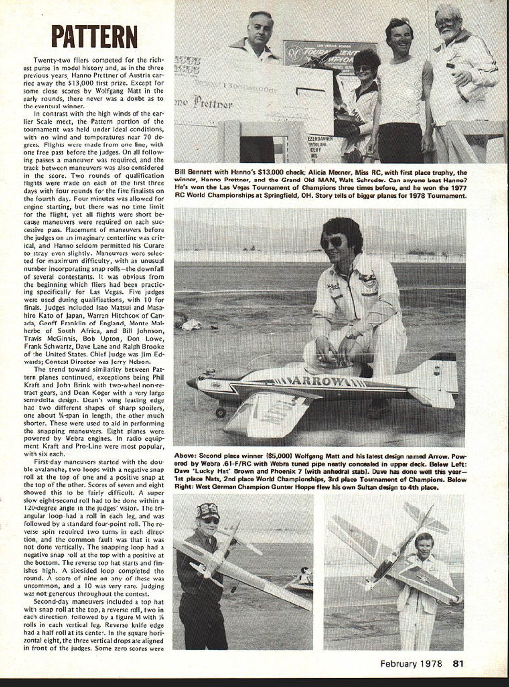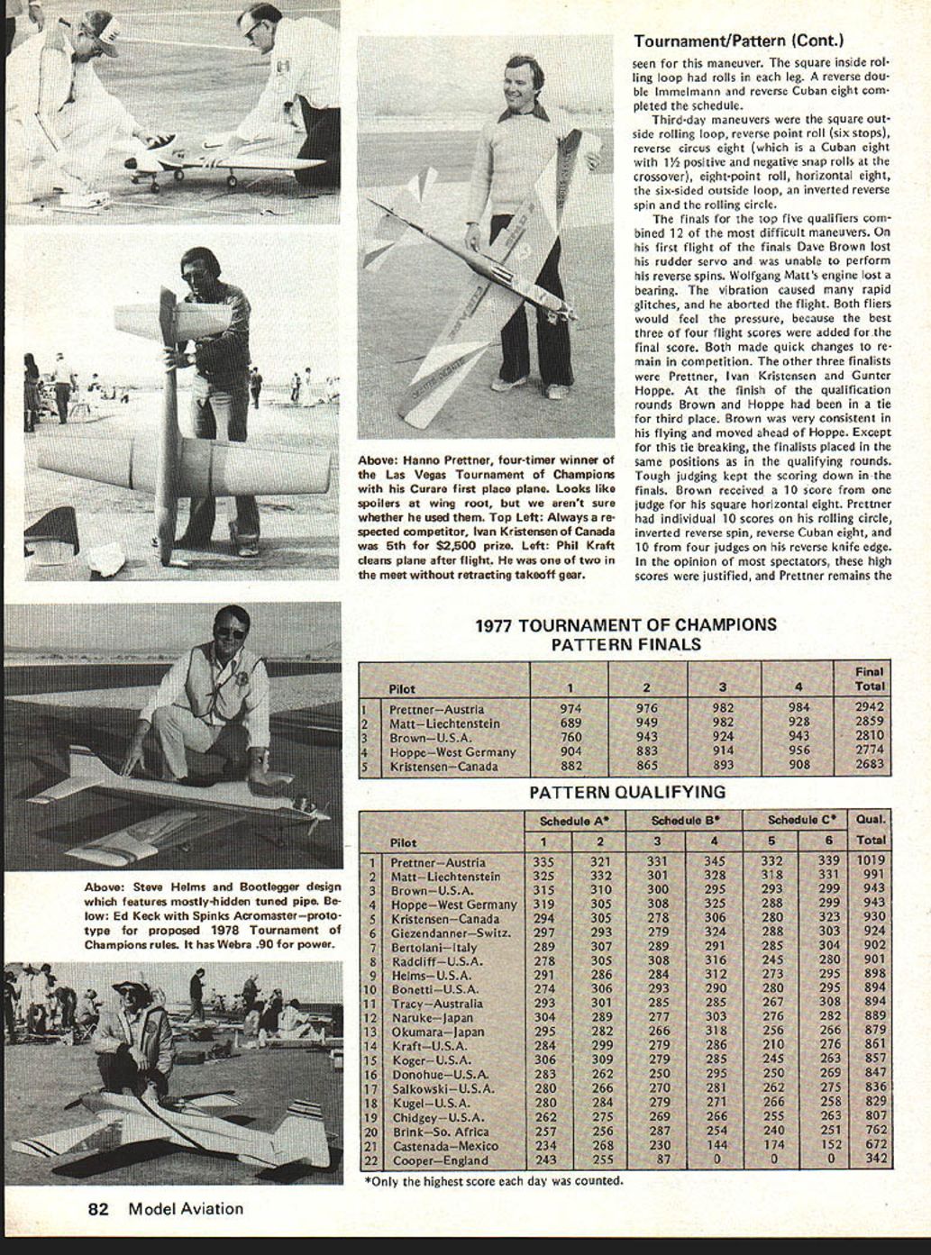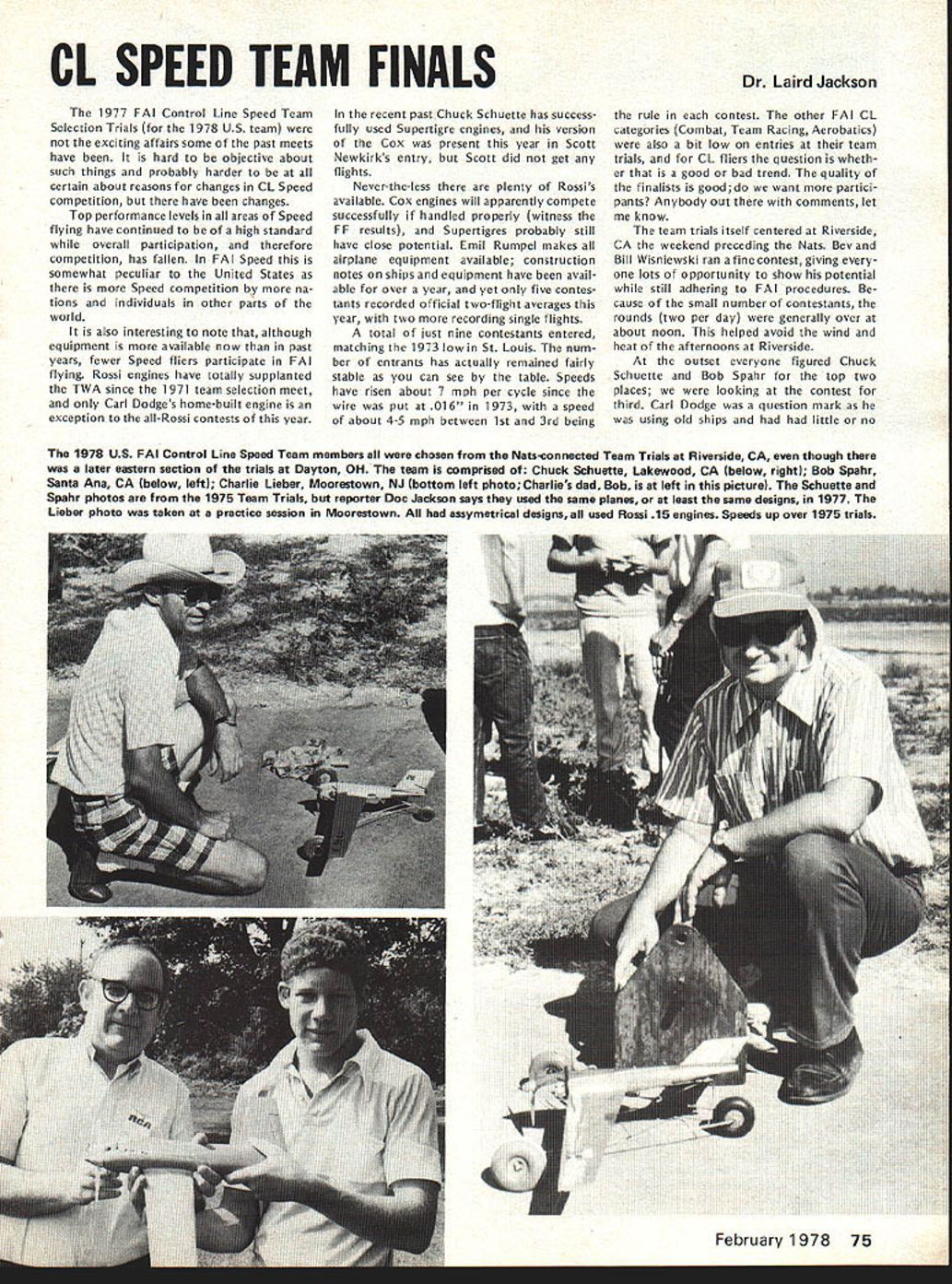 COM PETI TW NE WSLETTEREiUP ACADEMY OF MODEL AERONAUTICS 815 FIFTEENTH STREET NW WASHINGTON DC 20005 RC SOARING TEAM PROGRAM PLANNING 1978 program selecting 1979 US Soaring World Championships learn will quite similar previous 1976 program according results ballot previous program entrants Voting authorized Team Selection Program Committee modi fy 1976 program permitting quar ter-final contests flown during months April May June approved 74 5 B increasing number semi-final contests 10 demand warrants approved 75 4 C permitting semi-final contests flown first weekend July 1-3 second weekend July 8-9 approved 75 4 Participants also approved chairman AMA district members RC Soaring Team Selection Program Committee fol lows Ray Marvin chairman Dwight -lolley District Leon Pike II Dave Burt Ill Brian L Foster IV Jim W Lenoir V John Nielsen VI Warren Tiahrt VII Dale Nutter VIII Skip Miller IX Dave Thornburg X Don Burt XI vote 76 2 favor group Ray Marvin approved chair man committee CD 1976 RC Soaring Team Finals CD RC Soaring events 1977 AMA Nats California National Soaring So ciety FAI Coordinator STOY INDOOR KL GUDER RECORD written Free Flight Contest Board under chairmanship Joe Boyle Jr considering whether rescind Stan Stoys National AMA Record 1 088 seconds Indoor Hand-Launch Glider Cate gory issue whether building used its turbulent conditions acceptable record purposes Descriptions circum stances record Bob Meusers December Free Flight Duration column Bud Tennys January 1978 Indoor column board also considering whether need enact emergency interpre tation ruling concerning acceptable Indoor sites board members asked suggest language such emergency ruling event boards response course action RADIO CONTROL CONTEST BOARD FINALVOTERE-VOTE ~U0O FOR 1978-79 COMPETITION RULESo lt Vote AcceptableeCLL-0 C cceptable~- C -E- Tally IIIIIIIV V VIVII VIII IX X XI 45Contestant Classification Allow lower rank physical dis frometcFriendlAAAAAAAAAAAA11AON C 0 0 Q tia ci announced Quarter Midget Pylon Rules Status Upgrade provisional AIAA Notes This re-vote conducted because mostly due nature construction original Final Vote did produce conclusive results Proposals passing Final Vote margin two-thirds among voting nearest whole number become new AMA com petition rules effective January 1 1978 other Final Vote results see January 1978 issue February 1978 73 No pressurization fuel system except atmospheric pressure shall allowed Yee 14Fuel Limited max 50% nitro commercially pre-mixed w CD option fuel may suoolied contestan Ab C 0 00 NNNAlAANAA7A 4N N A A NIN N Lap cut called will ~nted lAl AlIIA8A3N FREE FLIGHT CONTEST BOARDZ -c C FINAL VOTE RE-VOTE ova c Res silt FOR 1978-79COMPETITION RULES 1Eb%OO0-0GJ ofVote eptableS 5 -5 - 4COmo-oct o Eva N ptable~ u o LU Tally III III IV V VI VII VIII IX X XI 38Indoor Novice Pennyplane Specifications Limit monoplanes A A A A A9A ON Notes This re-vote conducted because item mistake included original Final Vote other items re-voted help avoid possible misunderstandings blank box means no vote cast Proposals passing Final Vote margin two-thirds among voting nearest whole number become new AMA competition rules effective January 1 1978 other Final Vote re sults see January 1978 issue JAMUARY 1 START FOR RULES PROPOSALS Contest Board Procedures provide period January 1 through September 1 other year AMA members may sub mit Basic Proposals add revise exist ing AMA competition rules effect Janu ary 1 two years later new rules announced pages last month month started proposals submitted 1976 new cycle accepting basic Rules Change Proposals begins Janu ary 1 1978 extends through Septemb ber 11978 postmark deadline Rules eman ating such proposals will effective January 11980 Only proposals submitted standard Rules Change Proposal Form will accepted forms available upon request AMA HQ please include pre-addressed stamped envelope Items included making proposal consist 1 brief sum mary proposed change 2 exact wording proposed rule book 3 logic behind proposed change includ ing alleged shortcomings present rules Three adult AMA members must sign pro posal form must AMA Contest Director IIULBERT VOTED MOST IMPROVED among f ye nom nees Bill Hulbe Akron OH has named receive Pete Andrews Most Improved Flier Award 1977-78 Indoor Team Selection Program nominees ranked AMA FAI Indoor Team Selection Committee Although becoming member US Indoor Team prerequisite award Hulbert did fact win spot 1978 teamtogether Jim Richmond Dan Domina 74 Model Aviation Darryl Stevens FF Cargo model takeoff run Holds Junior age class record 5597 ozs lifted July 10 1977 Thu nderbugs Sum mer Fling Mile Square Park Calif Used Ccx TD 02 swinging 6-3 sin gle blade prop Planes tail boom arrow shaft CONTEST COORDINATORS I Peal L Penney 8 ChIottn Dr. Andover MA 01810 ii R Sobrivo 87-26 88th St Woodhaven Ooeens NY 11421 NC Bryan SatIer 29 WaldOrf Pt. Schenectady NY 12307 RC Fred Blaclrbarn8 BloeSproce In. Ccvnreack LI NY 11728 lIt Ken Reber Rd 1 Naeareth PA 18064 lEant M Weisenbach 4588 P0 1465 5, Cleveland OH 44135 West RC J Slate 809 Forest Rose Lancaster OH 43130 West IV Warren Sanders Jr. 9735 52nd Ave. College Pk. MO 20741 NC J Lawrence 12538 Woodtock Or. Upper Marlboro MO 20870 V Beo Cleveland 708 Coantry CbS Orive Tallahorna TN 37388 RC J Oant Jr. 18t3S LakeshorvOr. BrrnivghavrAL35216 RC Charlene Folds 818 Main St. Naw EIIvqton SC 29809 FREE FLIGHT CONTEST BOARD I Henry Strock PP0 No2 Harybart Old Lytne CT 06371 II Carrol AlIve 2 Armanva Fl. Hontinatne Sty NY 11746 Ill Rady Klviber 2021 Lakeland Avv. Lakewood OH 44107 IV Jo Boyle Jr. 219 Shenandoah Rd Hatepton VA 23381 V Bonny Jvvhes 3112 East Raines Rd. Memphis TN 38118 VI COrn Matsueo 10132 Dooqlass C. St Avv MO 63074 VIt Phil Klintrsorth Jr. 715 Rargers Rd Rochester MI 48063 VIII Marh Valetios 2302 Pomnaran Dr. Hoonton TX 77055 IX Edward Collins 43185 utah P1. Devver CO 80222 X Jve Norcross 4826 West 123rd Sr. Hawthorne CA 90280 Xl Ernie Line 16558-121 Avv. 
