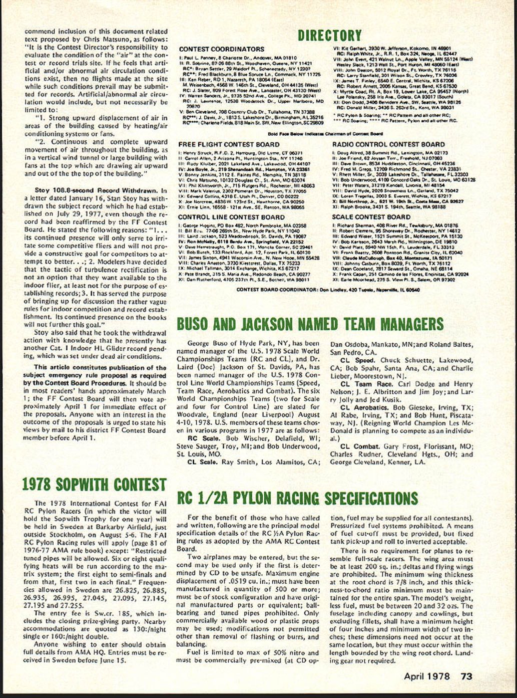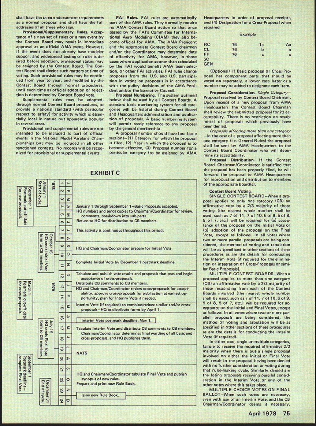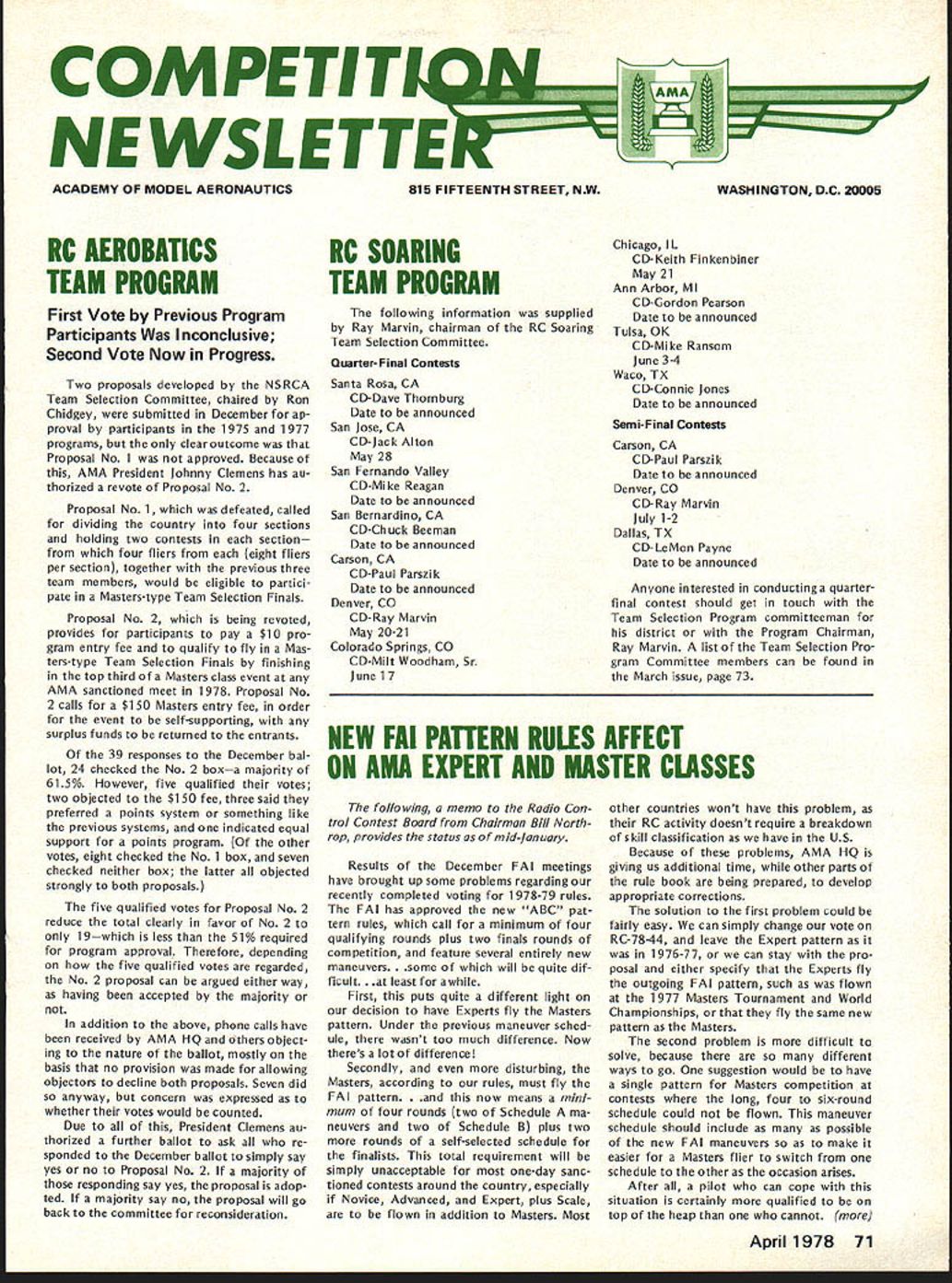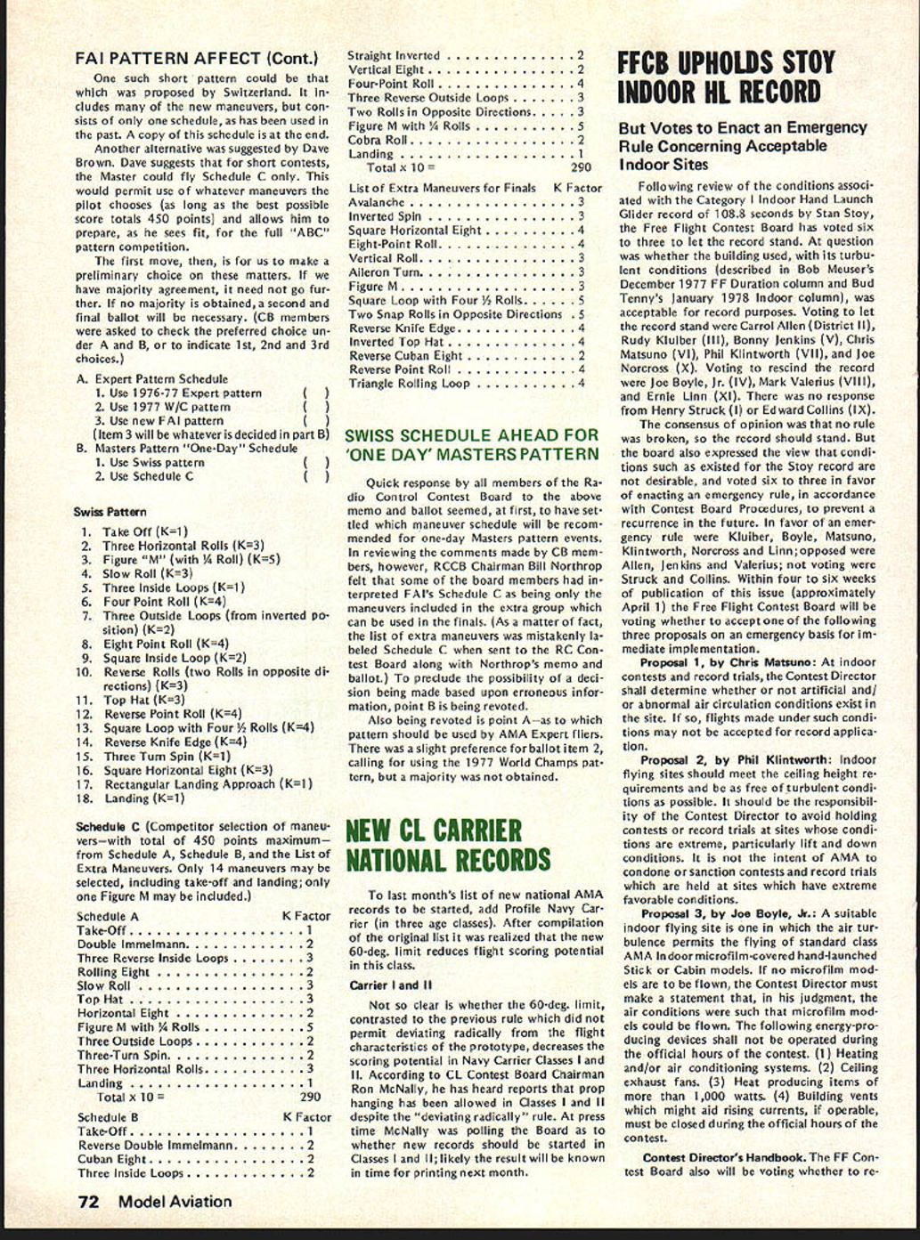 WASHINGTON DC 20005 RC AEROBATICS TEAM PROGRAM First Vote Previous Program Participants Inconclusive Second Vote Now Progress Two proposals developed NSRCA Team Selection Committee chaired Ron Chidgey submitted December ap proval participants 1975 1977 programs clear outcome Proposal No 1 approved Because AMA President Johnny Clemens has au thorized revote Proposal No 2 Proposal No 1 defeated called dividing country four sections holding two contests section four fliers eight fliers per section together previous three team members would eligible partici pate Masters-type Team Selection Finals Proposal No 2 being revoted provides participants pay $10 pro gram entry fee qualify fly Mas ters-type Team Selection Finals finishing top third Masters class event AMA sanctioned meet 1978 Proposal No 2 calls $150 Masters entry fee order event self-supporting surplus funds returned entrants 39 responses December bal lot 24 checked No 2 boxa majority 615% However five qualified votes two objected $150 fee three said preferred points system something like previous systems indicated equal support points program other votes eight checked No 1 box seven checked neither box latter objected strongly both proposals five qualified votes Proposal No 2 reduce total clearly favor No 2 19which less 51% required program approval Therefore depending five qualified votes regarded No 2 proposal can argued either way having accepted majority addition above phone calls have received AMA HQ others object ing nature ballot mostly basis no provision made allowing objectors decline both proposals Seven did anyway concern expressed whether votes would counted Due President Clemens au thorized further ballot ask re sponded December ballot simply say yes no Proposal No 2 majority responding say yes proposal adop ted majority say no proposal will go back committee reconsideration RC SOARING TEAM PROGRAM following information supplied Ray Marvin chairman RC Soaring Team Selection Committee Quarter-Final Contests Santa Rosa CA CD-Dave Thornburg Date announced San Jose CA CD-Jack Alton May 28 San Fernando Valley CD-Mike Reagan Date announced San Bernardino CA CD-Chuck Beeman Date announced Carson CA CD-Paul Parszik Date announced Denver CO CD-Ray Marvin May 20-2 1 Colorado Springs CO CD-Milt Woodham Sr June17 Chicago IL CD-Keith Fin kenbiner May 21 Ann Arbor MI CD-Gordon Pearson Date announced Tulsa OK CD-Mike Ransom June 3-4 Waco TX CD-Connie Jones Date announced Semi-Final Contests Carson CA CD-Paul Parszik Date announced Denver CO CD-Ray Marvin July 1-2 Dallas TX CD-LeMon Payne Date announced Anyone interested conducting quarterfinal contest should get touch Team Selection Program committeeman district Program Chairman Ray Marvin list Team Selection Pro gram Committee members can found March issue page 73 NEW FM PATTERN RULES AFFECT ON AMA EXPERT AND MASTER CLASSES following memo Radio Con trol Contest Board Chairman Bill North rop provides status mid-I uary Results December FAI meetings have brought up some problems regarding recently completed voting 1978-79 rules FAI has approved new ABC pat tern rules call minimum four qualifying rounds plus two finals rounds competition feature several entirely new maneuvers will quite dif ficult least awhile First puts quite different light decision have Experts fly Masters pattern Under previous maneuver sched ule wasnt too much difference Now theres lot difference Secondly disturbing Masters according rules must fly FAI pattern means mini mum four rounds two Schedule ma neuvers two Schedule B plus two rounds self-selected schedule finalists total requirement will simply unacceptable one-day sanc tioned contests around country especially Novice Advanced Expert plus Scale flown addition Masters Most other countries wont have problem RC activity doesnt require breakdown skill classification have US Because problems AMA HQ giving us additional time other parts rule book being prepared develop appropriate corrections solution first problem could fairly easy can simply change vote RC-78-44 leave Expert pattern 1976-77 can stay pro posal either specify Experts fly outgoing FAI pattern such flown 1977 Masters Tournament World Championships fly same new pattern Masters second problem difficult solve because different ways go suggestion would have single pattern Masters competition contests long four six-round schedule could flown maneuver schedule should include possible new FAI maneuvers make easier Masters flier switch schedule other occasion arises After pilot can cope situation certainly qualified top heap cannot April 1978 71 NEWSL ACADEMY OF MODEL AERONAUTICS815 FIFTEENTH STREET NW FAI PATTERN AFFECT Cont such short pattern could proposed Switzerland cludes new maneuvers con sists schedule has used past copy schedule end Another alternative suggested Dave Brown Dave suggests short contests Master could fly Schedule C would permit use whatever maneuvers pilot chooses long best possible score totals 450 points allows him prepare sees fit full ABC pattern competition first move us make preliminary choice matters have majority agreement need go fur ther no majority obtained second final ballot will necessary CB members asked check preferred choice un der B indicate 1st 2nd 3rd choices A Expert Pattern Schedule 1 Use 1976-77 Expert pattern 2 Use 1977 W/C pattern 3 Use new FAI pattern Item 3 will whatever decided part B B Masters Pattern One-Day Schedule 1 Use Swiss pattern 2 Use Schedule C Swiss Pattern 1 TakeOff K1 2 Three Horizontal Rolls K3 3 Figure M K5 4 Slow Roll K3 5 Three Inside Loops K1 6 Four Point Roll K4 7 Three Outside Loops inverted po sition K2 8 Eight Point Roll K4 9 Square Inside Loop K2 10 Reverse Rolls two Rolls opposite di rections K3 11 TopHatK3 12 Reverse Point Roll K4 13 Square Loop Four Rolls K4 14 Reverse Knife Edge K4 15 Three Tum Spin K1 16 Square Horizontal Eight K3 17 Rectangular Landing Approach K1 18 Landing K1 Schedule C Competitor selection maneu verswith tot