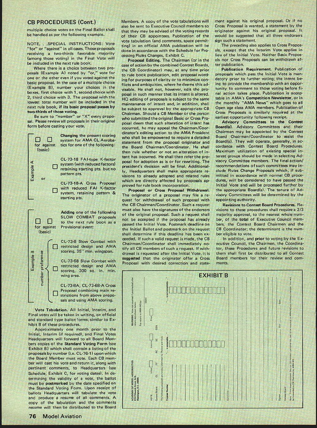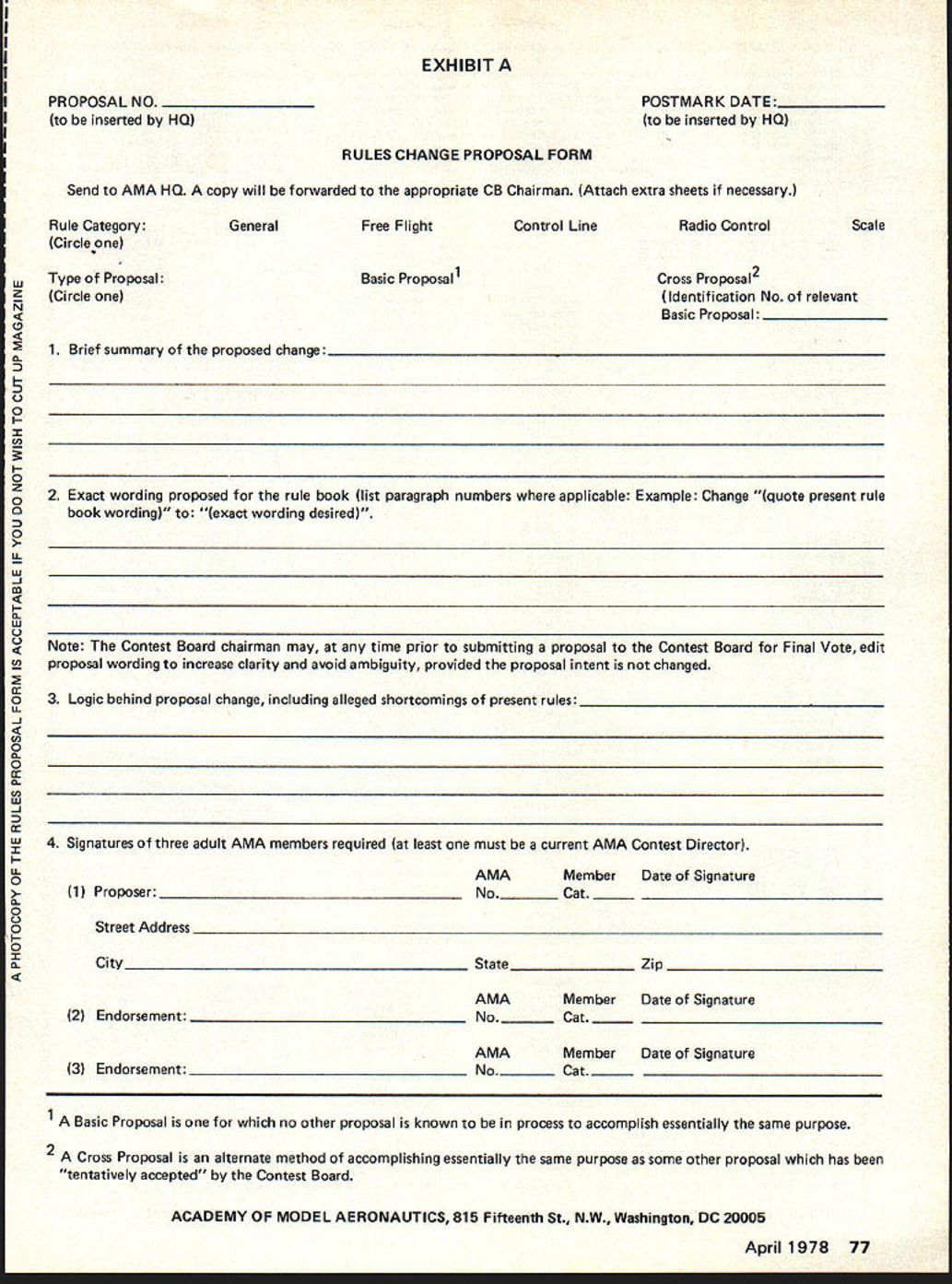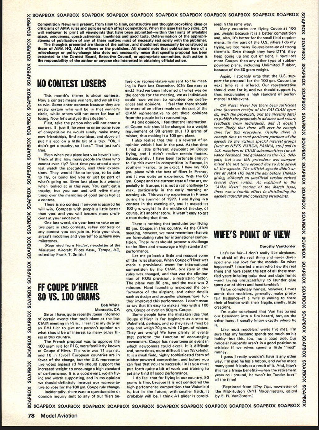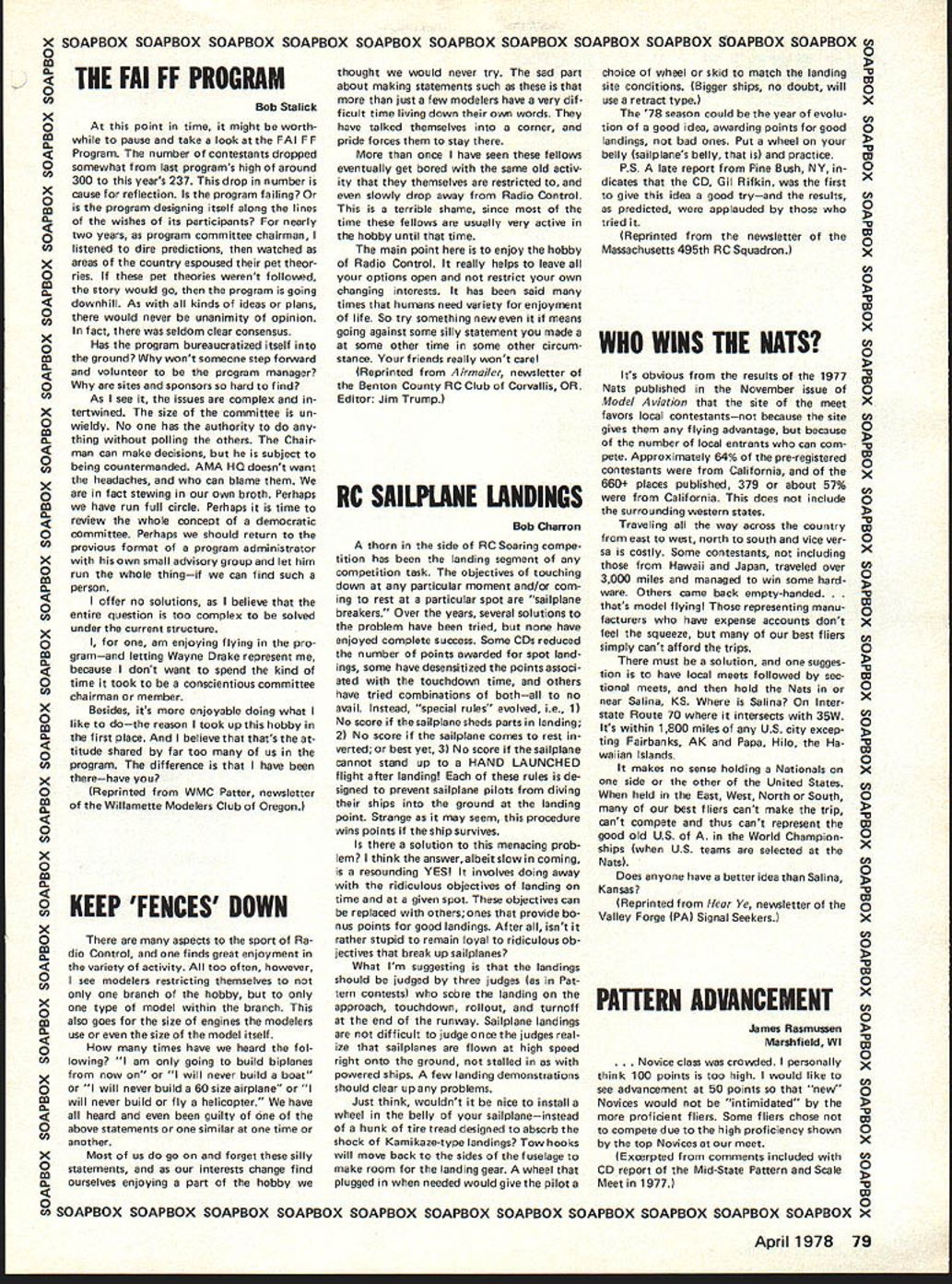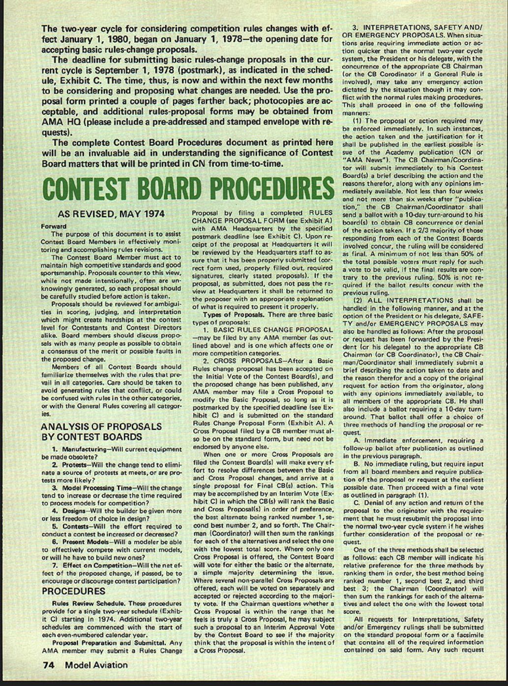WASHINGTON DC 20005 RC AEROBATICS TEAM PROGRAM First Vote Previous Program Participants Inconclusive Second Vote Now Progress Two proposals developed NSRCA Team Selection Committee chaired Ron Chidgey submitted December ap proval participants 1975 1977 programs clear outcome Proposal No 1 approved Because AMA President Johnny Clemens has au thorized revote Proposal No 2 Proposal No 1 defeated called dividing country four sections holding two contests section four fliers eight fliers per section together previous three team members would eligible partici pate Masters-type Team Selection Finals Proposal No 2 being revoted provides participants pay $10 pro gram entry fee qualify fly Mas ters-type Team Selection Finals finishing top third Masters class event AMA sanctioned meet 1978 Proposal No 2 calls $150 Masters entry fee order event self-supporting surplus funds returned entrants 39 responses December bal lot 24 checked No 2 boxa majority 615% However five qualified votes two objected $150 fee three said preferred points system something like previous systems indicated equal support points program other votes eight checked No 1 box seven checked neither box latter objected strongly both proposals five qualified votes Proposal No 2 reduce total clearly favor No 2 19which less 51% required program approval Therefore depending five qualified votes regarded No 2 proposal can argued either way having accepted majority addition above phone calls have received AMA HQ others object ing nature ballot mostly basis no provision made allowing objectors decline both proposals Seven did anyway concern expressed whether votes would counted Due President Clemens au thorized further ballot ask re sponded December ballot simply say yes no Proposal No 2 majority responding say yes proposal adop ted majority say no proposal will go back committee reconsideration RC SOARING TEAM PROGRAM following information supplied Ray Marvin chairman RC Soaring Team Selection Committee Quarter-Final Contests Santa Rosa CA CD-Dave Thornburg Date announced San Jose CA CD-Jack Alton May 28 San Fernando Valley CD-Mike Reagan Date announced San Bernardino CA CD-Chuck Beeman Date announced Carson CA CD-Paul Parszik Date announced Denver CO CD-Ray Marvin May 20-2 1 Colorado Springs CO CD-Milt Woodham Sr June17 Chicago IL CD-Keith Fin kenbiner May 21 Ann Arbor MI CD-Gordon Pearson Date announced Tulsa OK CD-Mike Ransom June 3-4 Waco TX CD-Connie Jones Date announced Semi-Final Contests Carson CA CD-Paul Parszik Date announced Denver CO CD-Ray Marvin July 1-2 Dallas TX CD-LeMon Payne Date announced Anyone interested conducting quarterfinal contest should get touch Team Selection Program committeeman district Program Chairman Ray Marvin list Team Selection Pro gram Committee members can found March issue page 73 NEW FM PATTERN RULES AFFECT ON AMA EXPERT AND MASTER CLASSES following memo Radio Con trol Contest Board Chairman Bill North rop provides status mid-I uary Results December FAI meetings have brought up some problems regarding recently completed voting 1978-79 rules FAI has approved new ABC pat tern rules call minimum four qualifying rounds plus two finals rounds competition feature several entirely new maneuvers will quite dif ficult least awhile First puts quite different light decision have Experts fly Masters pattern Under previous maneuver sched ule wasnt too much difference Now theres lot difference Secondly disturbing Masters according rules must fly FAI pattern means mini mum four rounds two Schedule ma neuvers two Schedule B plus two rounds self-selected schedule finalists total requirement will simply unacceptable one-day sanc tioned contests around country especially Novice Advanced Expert plus Scale flown addition Masters Most other countries wont have problem RC activity doesnt require breakdown skill classification have US Because problems AMA HQ giving us additional time other parts rule book being prepared develop appropriate corrections solution first problem could fairly easy can simply change vote RC-78-44 leave Expert pattern 1976-77 can stay pro posal either specify Experts fly outgoing FAI pattern such flown 1977 Masters Tournament World Championships fly same new pattern Masters second problem difficult solve because different ways go suggestion would have single pattern Masters competition contests long four six-round schedule could flown maneuver schedule should include possible new FAI maneuvers make easier Masters flier switch schedule other occasion arises After pilot can cope situation certainly qualified top heap cannot April 1978 71 NEWSL ACADEMY OF MODEL AERONAUTICS815 FIFTEENTH STREET NW FAI PATTERN AFFECT Cont such short pattern could proposed Switzerland cludes new maneuvers con sists schedule has used past copy schedule end Another alternative suggested Dave Brown Dave suggests short contests Master could fly Schedule C would permit use whatever maneuvers pilot chooses long best possible score totals 450 points allows him prepare sees fit full ABC pattern competition first move us make preliminary choice matters have majority agreement need go fur ther no majority obtained second final ballot will necessary CB members asked check preferred choice un der B indicate 1st 2nd 3rd choices A Expert Pattern Schedule 1 Use 1976-77 Expert pattern 2 Use 1977 W/C pattern 3 Use new FAI pattern Item 3 will whatever decided part B B Masters Pattern One-Day Schedule 1 Use Swiss pattern 2 Use Schedule C Swiss Pattern 1 TakeOff K1 2 Three Horizontal Rolls K3 3 Figure M K5 4 Slow Roll K3 5 Three Inside Loops K1 6 Four Point Roll K4 7 Three Outside Loops inverted po sition K2 8 Eight Point Roll K4 9 Square Inside Loop K2 10 Reverse Rolls two Rolls opposite di rections K3 11 TopHatK3 12 Reverse Point Roll K4 13 Square Loop Four Rolls K4 14 Reverse Knife Edge K4 15 Three Tum Spin K1 16 Square Horizontal Eight K3 17 Rectangular Landing Approach K1 18 Landing K1 Schedule C Competitor selection maneu verswith tot