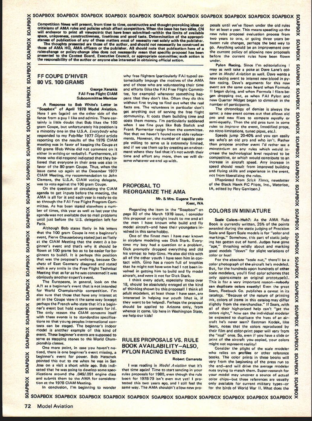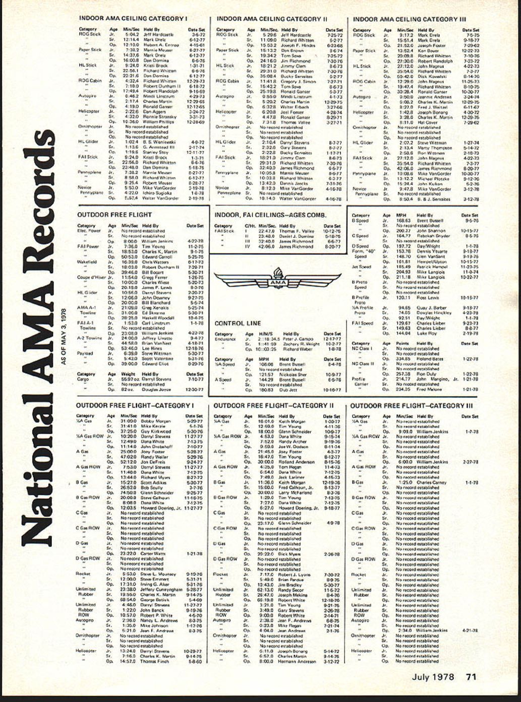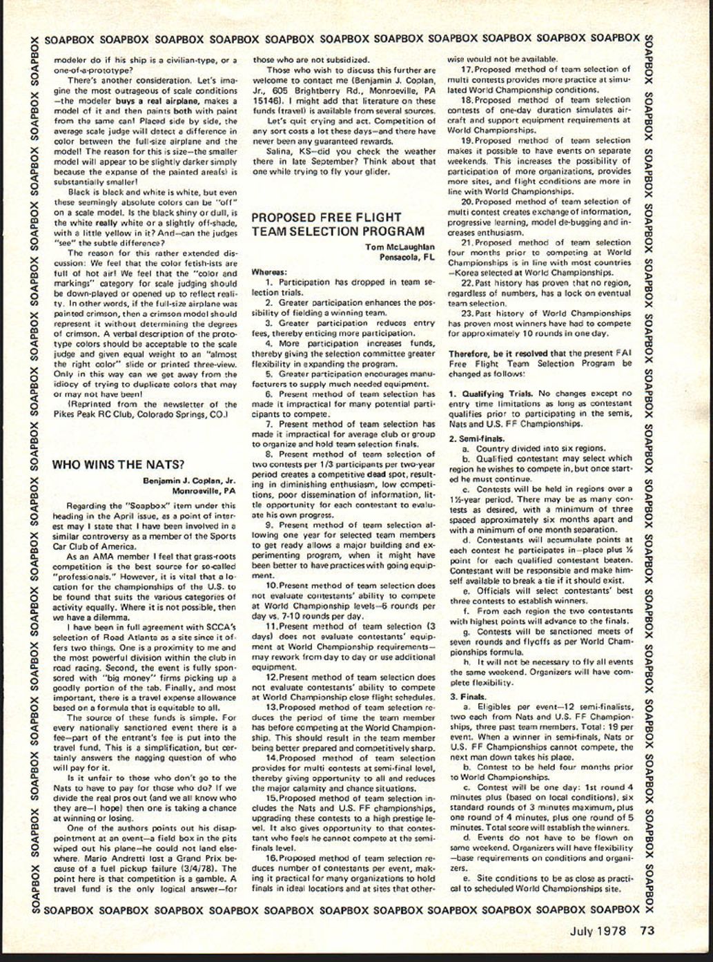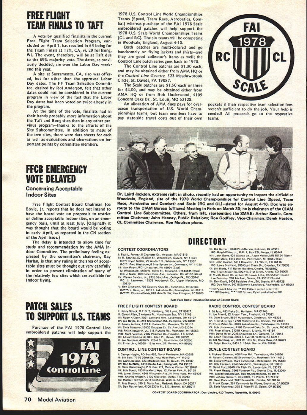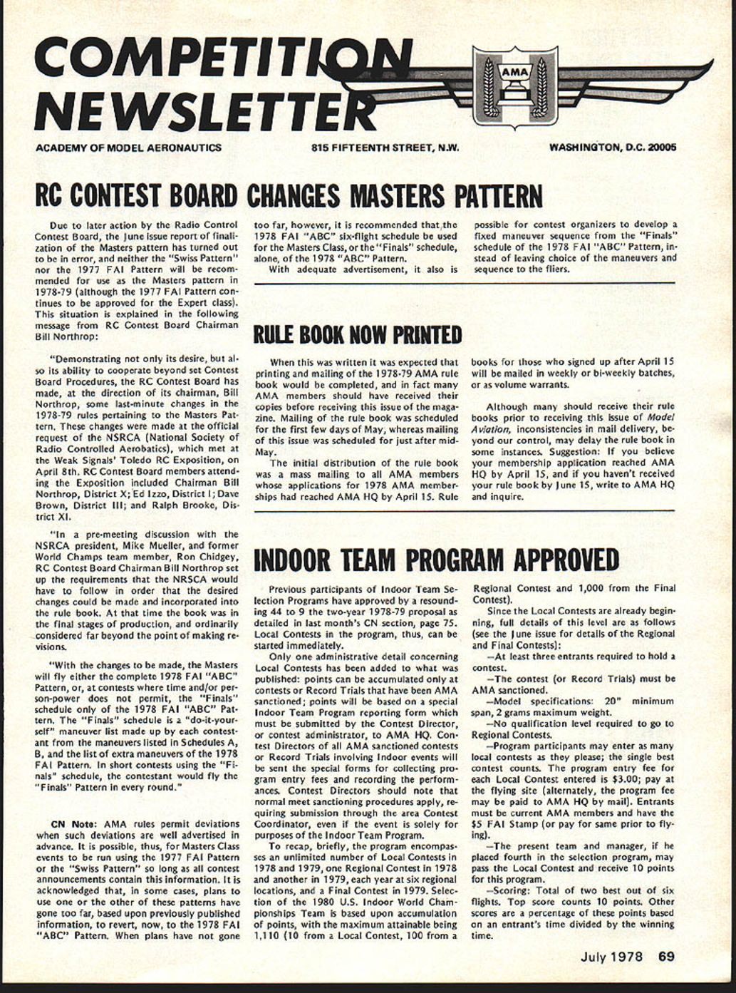 COM PETI TWIN NE WSLETTEKI ACADEMY OF MODEL AERONAUTICS 815 FIFTEENTH STREET NW WASHINGTON DC 20005 RC CONTEST BOARD CHANGES MASTERS PATTERN Due later action Radio Control Contest Board June issue report finali zation Masters pattern has turned out error neither Swiss Pattern nor 1977 FAI Pattern will recom mended use Masters pattern 1978-79 although 1977 FAI Pattern con tinues approved Expert class situation explained following message RC Contest Board Chairman Bill Northrop too far however recommended thatthe 1978 FAI ABC six-flight schedule used Masters Class Finals schedule alone 1978 ABC Pattern adequate advertisement also possible contest organizers develop fixed maneuver sequence Finals schedule 1978 FAI ABC Pattern stead leaving choice maneuvers sequence fliers RULE BOOK NOW PRINTED Demonstrating its desire al its ability cooperate beyond set Contest Board Procedures RC Contest Board has made direction its chairman Bill Northrop some last-minute changes 1978-79 rules pertaining Masters Pat tern changes made official request NSRCA National Society Radio Controlled Aerobatics met Weak Signals Toledo RC Exposition April 8th RC Contest Board members attend ing Exposition included Chairman Bill Northrop District XEd Izzo District Dave Brown District III Ralph Brooke Dis trict XI written expected printing mailing 1978-79 AMA rule book would completed fact AMA members should have received copies before receiving issue maga zine Mailing rule book scheduled first few days May whereas mailing issue scheduled just after midMay initial distribution rule book mass mailing AMA members applications 1978 AMA member ships reached AMA HQ April 15 Rule books signed up after April 15 will mailed weekly bi-weekly batches volume warrants Although should receive rule books prior receiving issue Model Aviation inconsistencies mail delivery yond control may delay rule book some instances Suggestion believe membership application reached AMA HQ April 15 havent received rule book June 15 write AMA HQ inquire pre-meeting discussion NSRCA president Mike Mueller former World Champs team member Ron Chidgey RC Contest Board Chairman Bill Northrop set up requirements NRSCA would have follow order desired changes could made incorporated rule book time book final stages production ordinarily considered far beyond point making re visions changes made Masters will fly either complete 1978 FAI ABC Pattern contests time and/or per son-power does permit Finals schedule 1978 FAI ABC Pat tern Finals schedule doit-your self maneuver list made up contest ant maneuvers listed Schedules B list extra maneuvers 1978 FAI Pattern short contests using Fi nals schedule contestant would fly Finals Pattern round CN Note AMA rules permit deviations such deviations well advertised advance possible thus Masters Class events run using 1977 FAI Pattern Swiss Pattern long contest announcements contain information acknowledged some cases plans use other patterns have gone too far based upon previously published information revert now 1978 FAI ABC Pattern plans have gone INDOOR TEAM PROGRAM APPROVED Previous participants Indoor Team Se lection Programs have approved resound ing 44 9 two-year 1978-79 proposal detailed last months CN section page 75 Local Contests program thus can started immediately Only administrative detail concerning Local Contests has added what published points can accumulated contests Record Trials have AMA sanctioned points will based special Indoor Team Program reporting form must submitted Contest Director contest administrator AMA HQ Con test Directors AMA sanctioned contests Record Trials involving Indoor events will sent special forms collecting pro gram entry fees recording perform ances Contest Directors should note normal meet sanctioning procedures apply re quiring submission through area Contest Coordinator event solely purposes Indoor Team Program recap briefly program encompas ses unlimited number Local Contests 1978 1979 Regional Contest 1978 another 1979 year six regional locations Final Contest 1979 Selec tion 1980 US Indoor World Cham pionships Team based upon accumulation points maximum attainable being 1110 10 Local Contest 100 Regional Contest 1000 Final Contest Since Local Contests already begin ning full details level follows see June issue details Regional Final Contests least three entrants required hold contest contest Record Trials must AMA sanctioned Model specifications 20 minimum span 2 grams maximum weight No qualification level required go Regional Contests Program participants may enter local contests please single best contest counts program entry fee Local Contest entered $300 pay flying site alternately program fee may paid AMA HQ mail Entrants must current AMA members have $5 FAI Stamp pay same prior fly ing present team manager placed fourth selection program may pass Local Contest receive 10 points program Scoring Total two best out six flights Top score counts 10 points Other scores percentage points based entrants time divided winning time July1978 69 II fl FREE FLIGHT TEAM FULALS TO TAFT vote qualified finalists current Free Flight Team Selection Program con cluded April 1 has resulted 65 being Team Finals Taft CA vs 29 Bong WI event therefore will Taft due 69% majority vote dates previ ously decided over Labor Day week end year site Sacramento CA also offer ed other approved Labor Day dates FF Team Selection Commit tee chaired Rol Anderson felt other dates could considered current program view fact Labor Day dates voted twice already program time vote finalists hands probably information about Taft Bong sites other pre vious programthanks efforts Site Subcommittee addition maps two sites data sheets well evaluations obervations im portant points committee members FFCB EMERGENCY VOTE DELAYED Concerning Acceptable Indoor Sites Free Flight Contest Board Chairman Joe Boyle Jr reports does intend have board vote proposals restrict define acceptable Indoor sites emer gency basis unti