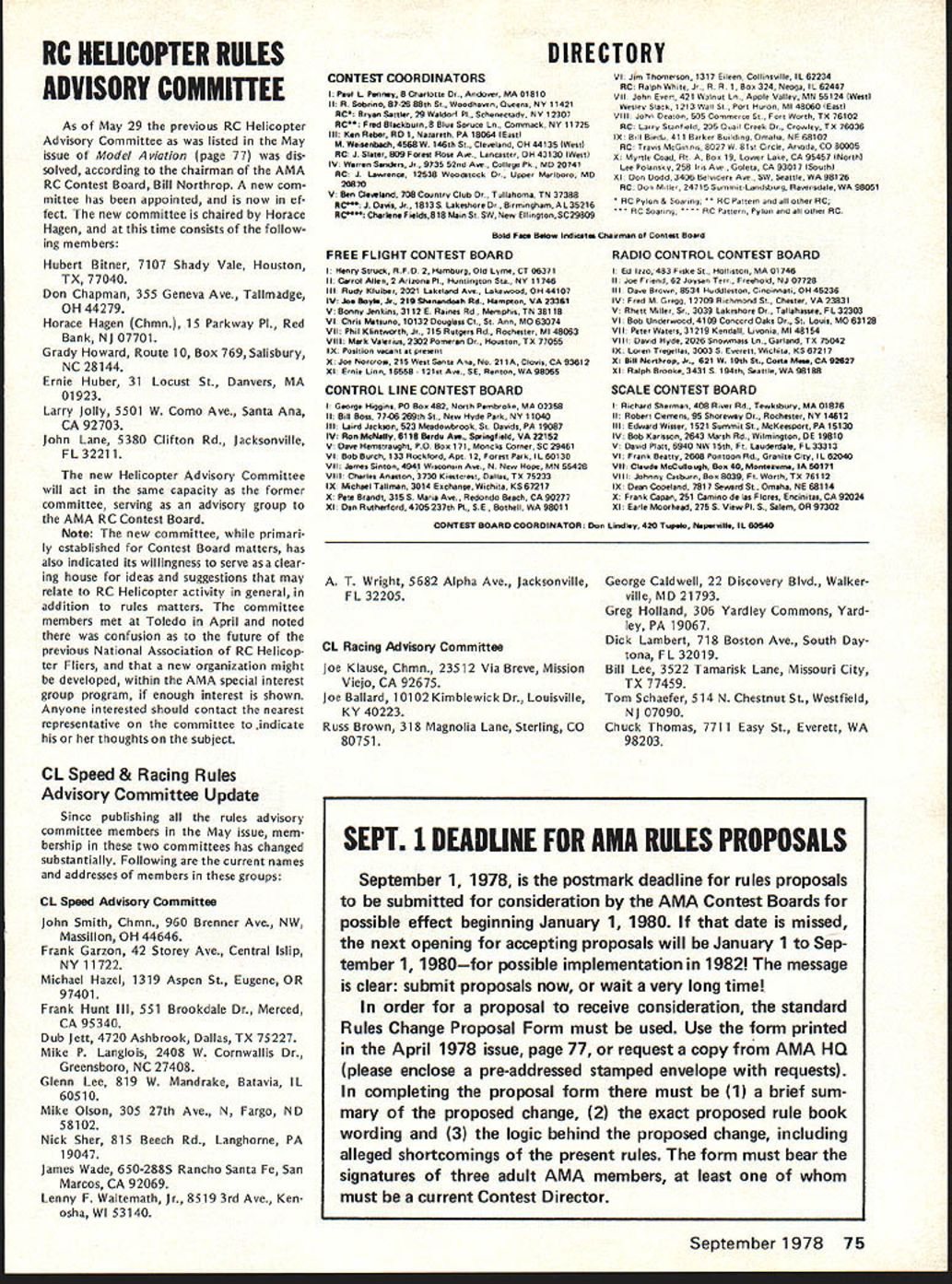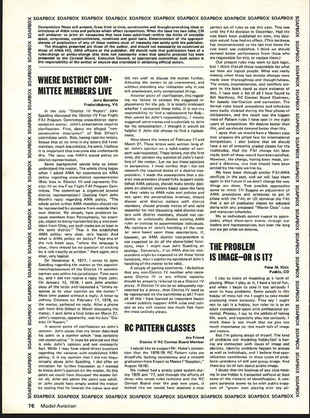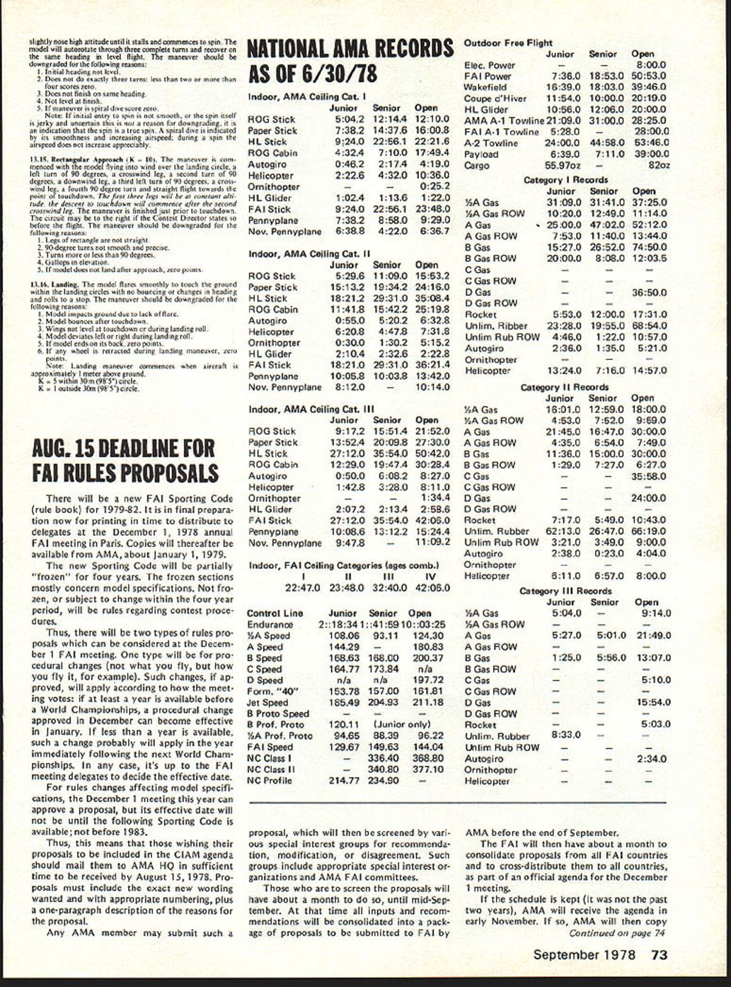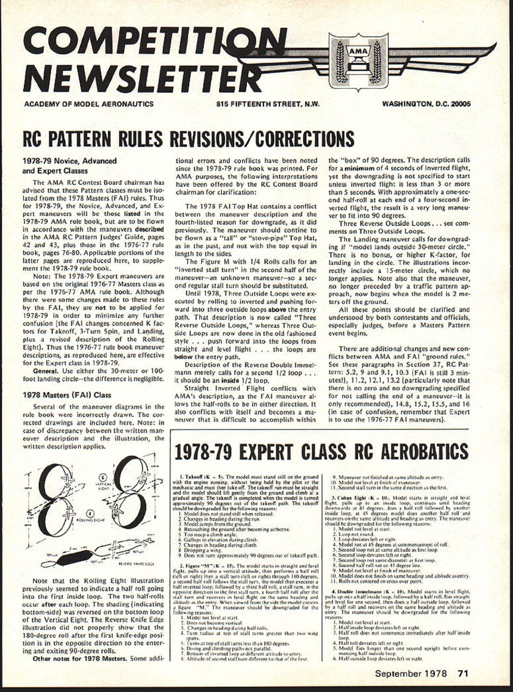 COMPE NE WSLETTER ACADEMY OF MODEL AERONAUTICS RC PATTERN RULES REVISIONS/CORRECTIONS 1978-79 Novice Advanced Expert Classes AMA RC Contest Board chairman has advised Pattern classes must iso lated 1978 Masters FAI rules Thus 1978-79 Novice Advanced Ex pert maneuvers will listed 1978-79 AMA rule book flown accordance maneuvers described AMA RC Pattern judges Guide pages 42 43 plus 1976-77 rule book pages 76-80 Applicable portions latter pages reproduced supple ment 1978-79 rule book Note 1978-79 Expert maneuvers based original 1976-77 Masters class per 1976-77 AMA rule book Although some changes made rules FAI applied 1978-79 order minimize further confusion FAI changes concerned K fac tors Takeoff 3-Turn Spin Landing plus revised description Rolling Eight Thus 1976-77 rule book maneuver descriptions reproduced effective Expert class 1978-79 General Use either 30-meter 100foot landing circlethe difference negligible 1978 Masters FAI Class Several maneuver diagrams rule book incorrectly drawn cor rected drawings included Note case discrepancy between written man euver description illustration written description applies 0 -EIGHT p Z4 4O ROLLING EIGHT Note Rolling Eight illustration previously seemed indicate half roll going first inside loop two half-rolls occur after loop shading indicating bottom-side reversed bottom loop Vertical Eight Reverse Knife Edge illustration did properly show 180-degree roll after first knife-edge posi tion opposite direction enter ing exiting 90-degree rolls Other notes 1978 Masters Some addi tional errors conflicts have noted since 1978-79 rule book printed AMA purposes following interpretations have offered RC Contest Board chairman clarification 1978 FAI Top Hat contains conflict between maneuver description fourth-listed reason downgrade did previously maneuver should confine flown tall stove-pipe Top Hat past top equal length sides Figure M 1/4 Rolls calls inverted stall turn second half maneuveran unknown maneuverso sec ond regular stall turn should substituted Until 1978 Three Outside Loops ex ecuted rolling inverted pushing ward three outside loops above entry path description now called Three Reverse Outside Loops whereas Three Out side Loops now done old fashioned style h forward ioops straight level flight ops below entry path Description Reverse Double Immel mann merely calls second 1/2 loop should inside 1/2 loop Straight Inverted Flight conflicts AMAs description FAI maneuver al lows half-rolls either direction also conflicts itself becomes ma neuver difficult accomplish within box 90 degrees description calls minimum 4 seconds inverted flight yet downgrading specified start unless inverted flight less 3 5 seconds approximately one-sec ond half-roll end four-second verted flight result very long maneu ver fit 90 degrees Three Reverse Outside Loops e com ments Three Outside Loops Landing maneuver calls downgrad ing model lands outside 30-meter circle no bonus higher K-factor landing circle illustrations incor rectly include 15-meter circle no longer applies Note also maneuver no longer preceded traffic pattern ap proach now begins model 2 ters off ground points should clarified understood both contestants officials especially judges before Masters Pattern event begins additional changes new con flicts between AMA FAI ground rules See paragraphs Section 37 RC Pat tern 52 9 91 103 FAI still 3 min utes 112 121 132 particularly note no zero no downgrading specified calling end maneuverit recommended 148 152 155 16 case confusion remember Expert use 1976-77 FAI maneuvers 1918-79 EXPERT CLASS RC AEROBATICS I Takeoff K del must stand still ground engine running being held pilot mechunic und must thee take off takeoff run mutt struight nodet should lift gently ground cliush ut grudual angle tukeoff completed model turned upproximately 90 degrees out takeoff path takeoff should downgraded following reasons I Model does stund still released 2 Changes heading during run 3 Model jumps ground 4 Retouching ground after becoming airborne 5 Too steep climb angle 6 Gallops elevation during climb 7 Changes heading during climb 8 Dropping wing 9 Docs turn approsimately 90 degrees out takeoff path 2 Figure M K 15p model starts straight level flight pulls up vertical attitude performs half roll left right stall tarn left right through 180 degrees second half roll follows stall turn model evecutes half inverted loop followed third half roll stall turn opposite direction first stall turn fourth half roll after stall tarn recovers level flight same heading altitude entry viewed side model creates figure M maneuver should downgraded following reasons Model level start 2 Does become vertical 3 Changes heading daring half rolls 4 Turn radios top stall turns greater two wing spans 5 Turns top stall turns less 180 degrees 6 Diving climbing paths parallel 7 Bottom inverted loop different altitude entry 8 Altitude second stall turn dtlferent lirst 9 Maneuver finished same altitude entry 10 Model level finish maneuver II Second stall torn same direction first 3 Cuban Eight pK Model starts straight level flight pulls up inside loop continues until heading downuards 45 degrees does half roll followed another inside loop 45 degrees model does another half roll recovers same altitude heading entry maceuLer should downgraded fise following reasons I Model level start 2 Loop round 3 Loop deviates left right 4 Model 45 degrees commencement roll 5 Second loop same altitude first loop 6 Second loop deviates left right 7 Second loop same diameter first loop 8 Second half roll 45 degree line 9 Model level finish maneuver tO Model does finish same beading altitude entry II Rolls centered cross over point 4 Double Immelnann t K Model starts level flight pulls up half inside loop followed half roll flies straight level second does half outside loop folloaed half roll recovers same heading altitude entry maneuver should downgraded following reasons I Model level start 2 Half inside ioop devia