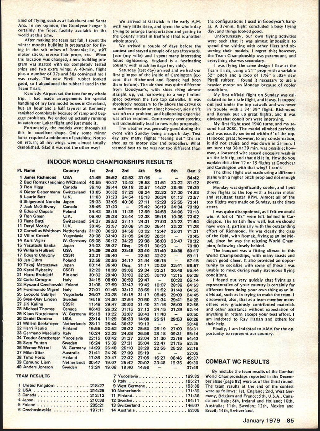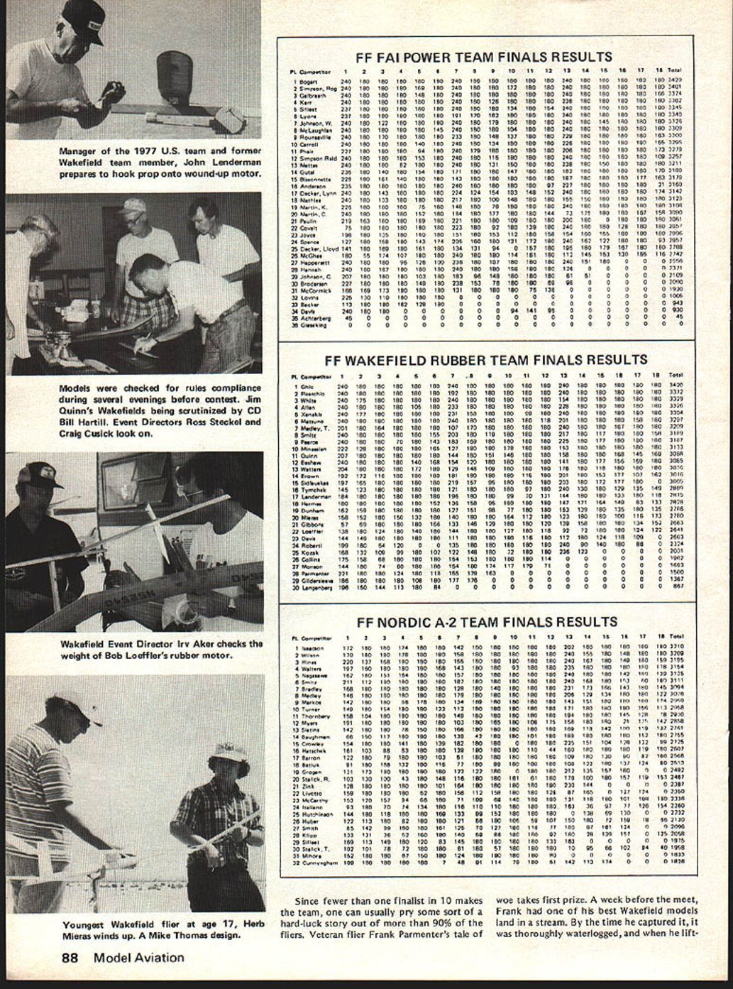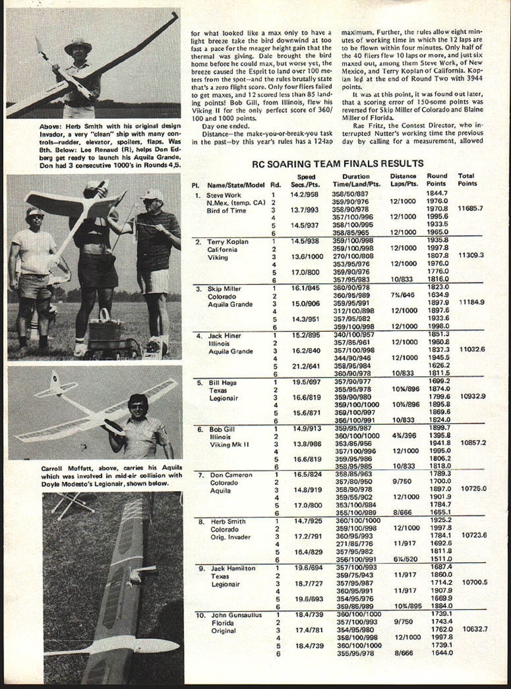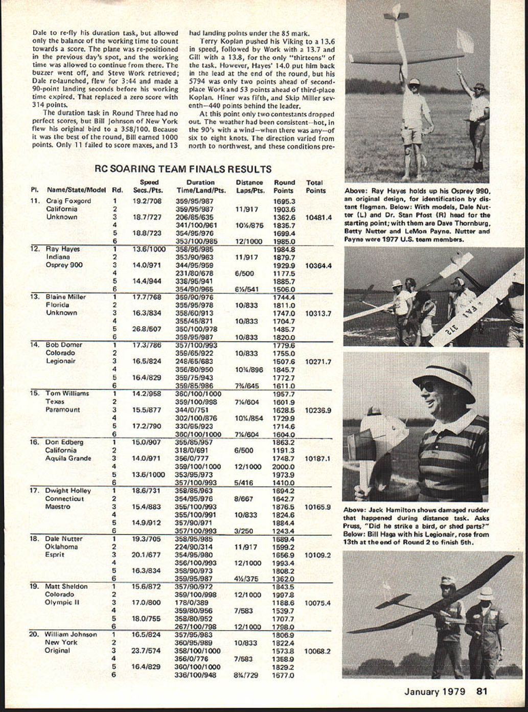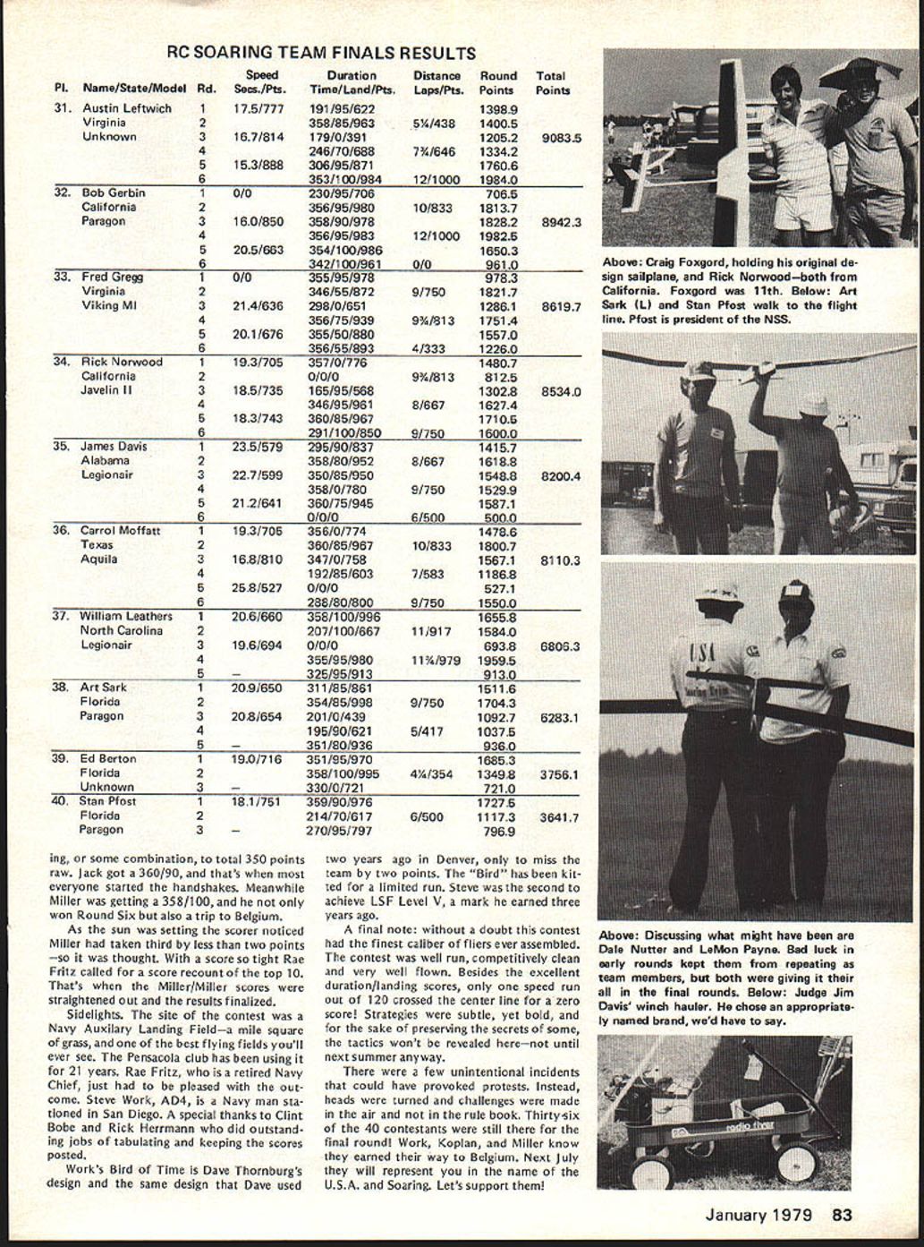 USA J AEROIdA Miller flu summer First air must cleared what some thought happened Work Koplan busy sewing up respective spots jack Hiner busier trying hold dpwn number three spota position held fourth round As last round ending Jackflew lOof 12 laps dis tance tasks perfect si-minute dur ation task coupled 90-point landing Most scoreboard watchers thought two flights enough nail down wnui IFTEENT NA offered ck ibt passed wo iple flights too nf best fowl nessed started off enis championshii *ying gra durationsaw o fliersn five-minute flights seven score less 85 landing poin perfect 360/100 secondsflandin 1000-point scores LeMon Payne f attempt maintain pace ha lished South Africa Payne pushe culmination program select three-I 1979 World Championships Pensacola Report Photos Dan Steve Work left Terry Skip Miller below reigning W Time sailplane designed Dave vator plane Team Finals Ke ter abor new fa won ing WA e Above Herb Smith original design Invador very clean ship con trolsrudder elevator spoilers flaps 8th Below Lee Renaud R helps Don Edberg get ready launch Aquila Grande Don 3 comuecutive 1000s Rounds 45 Carroll Moffatt above carries Aquila involved mideir collision Doyle Modestos Legionair shown below what looked like max have light breeze take bird downwind too fast pace meager height gain thermal giving Dale brought bird home before could max worse yet breeze caused Esprit land over 100 ters spotand rules brutally state thats zero flight score Only four fliers failed get maxes 12 scored less 85 land ing points Bob Gill Illinois flew Viking II perfect score 360/ 100 1000 points Day ended Distancethe make-you-or-break-you task pastby years rules has 12-lap maximum Further rules allow eight min utes working time 12 laps flown within four minutes Only half 40 fliers flew 10 laps just six maxed out among Steve Work New Mexico Terry Koplan California Kop Ian led end Round Two 3944 points point found out later scoring error 150-some points reversed Skip Miller Colorado Blame Miller Florida Rae Fritz Contest Director terrupted Nutters working time previous day calling measurement allowed RC SOARING TEAM FINALS RESULTS Speed tionDistanceRoundTotal P1Name/State/ModelRdSecs/PtsTime/Land/PtsLaps/PtsPointsPoints 1SteveWork1142/958358/50/88718447 NMex temp CA2359/90/97612/100019760 Bird Time3137/993358/90/97819708116857 4357/100/99612/100019956 5145/937358/100/99519335 6358/85/96512/100019650 2Terry Koplan1145/938359/100/99819358 California2359/100/99812/100019978 Viking3136/1000270/100/80818078113093 4353/95/97612/100019760 5170/800359/90/97617760 6357/95/98310/83318160 3Skip Miller1161 /845360/90/97818230 Colorado2360/95/9897%/64616349 Aquila Grande3150/906359/95/99118979111849 4312/100/89812/100018976 5143/951357/95/98219336 6359/100/99812/100019980 4Jack Hiner1152/895340/100/95718513 Illinois2357/85/96112/100019608 Aquila Grande3162/840357/100/99818373110326 4344/90/94612/100019455 5212/641358/95/98416262 6360/90/97810/83318115 5Bill Haga1195/697357/90/97716992 Texas2355/95/9781 0%/89618740 Legionair3166/819359/90/98017996109329 4359/100/100010%/89618958 5156/871359/100/99718696 6356/100/99110/83318240 6Bob Gill1149/913359/95/98718997 Illinois2360/100/10004%/39613958 Viking Mk II3138/986353/85/95619418108572 4357/100/99612/100019950 5166/819359/95/98618062 6358/95/98510/83318180 7Don Cameron1165/824358/85/96317893 Colorado23 57/80/9509/75017000 Aquila3148/919358/90/97818970107250 4359/55/90212/100019019 5170/800353/100/98417847 6355/100/9898/66616551 8Herb Smith1147/925360/100/1 00019252 Colorado2359/100/99812/100019978 Orig Invader3172/791360/95/99317841107236 4271/85/77611/91716926 5164/829357/95/98218118 6356/100/9916h/52015110 9Jack Hamilton1196/694357/100/9931687A Texas2359/75/94311/91718600 Legionair3187/727357/95/98717142107005 4360/95/99111/91719079 5196/693354/95/97616699 6359 /85/9891 0%/89518840 10John Gunsaullus1184/739360/100/1 00017391 Florida2357/100/9939/75017434 Original3174/781354/95/98017620106327 4358/100/99812/100019978 5184/739360/1 00/1 00017391 6355/95/9788/66616440 Dale re-fly duration task allowed balance working time count towards score plane re-positioned previous days spot working time allowed continue buzzer went off Steve Work retrieved Dale re-launched flew 344 made 90-point landing seconds before working time expired replaced zero score 314 points duration task Round Three no perfect scores Bill Johnson New York flew original bird 3581100 Because best round Bill earned 1000 points Only 11 failed score maxes 1 3 landing points under 85 mark Terry Koplan pushed Viking 136 speed followed Work 137 Gill 1 38 thirteens task However Hayes 140 put him back lead end round 5794 two points ahead secondplace Work 53 points ahead third-place Koplan Hiner fifth Skip Miller sev enth440 points behind leader point two contestants dropped out weather consistenthot 90s windwhen anyof six eight knots direction varied north northwest conditions pre RC SOARING TEAM FINALS RESULTS SpeedDurationDistance Round Total P1 Name/State/Model Rd Secs/Pts Time/Land/Pts Laps/Pts Points Points 11Craig Foxgord1192/708369/95/98716953 California2359/95/98711/91719036 Unknown3187/727206/85/63513626104814 4341/100/96110/2/87518357 5188/723354/95/97616994 6353/100/98512/100019850 12Ray Hayes1136/1000358/95/98519848 Indiana2353/90/96311/91718797 Osprey 9003140/971344/95/95919299103644 4231/80/6786/50011775 5144/944338/95/94118857 6354/90/9656A/54115060 13Blame Miller1177/768359/90/97617444 Florida2355/95/97810/83318110 Unknown3163/834358/60/91317470103137 4355/45/87110/83317047 5268/507350/100/97814857 6359/95/98710/83318200 14Bob Domer1173/786357/100/99317796 Colorado2359/65/92210/83317550 Legionair3165/824248/65/68315076102717 4356/80/95010%/89618457 5164/829359/75/94317727 6359/85/9867%/64516110 15Tom Williams1142/958360/1 00/1 00019577 Texas2359/100/9987h/60416019 Paramount3155/877344/0/75116285102369 4302/100/8761 0h/85417299 5172/790330/95/92317146 6360/100/100074/60416040 16Don Edberg1150/9073