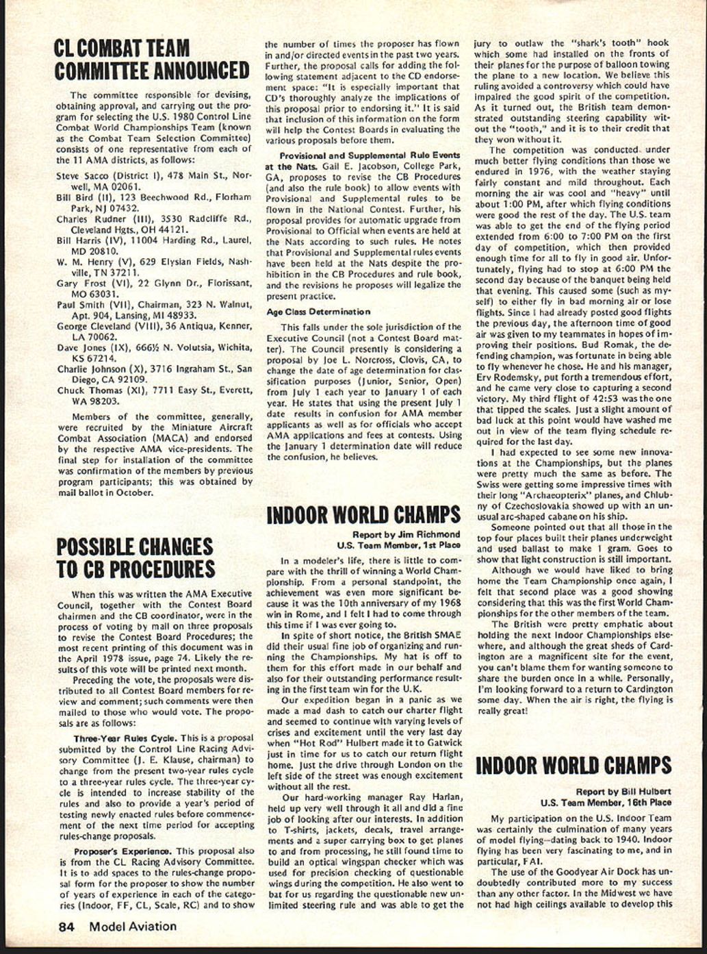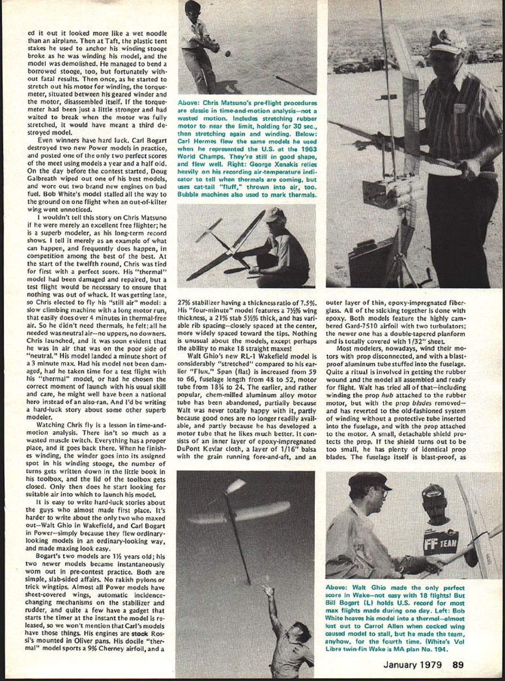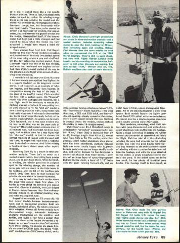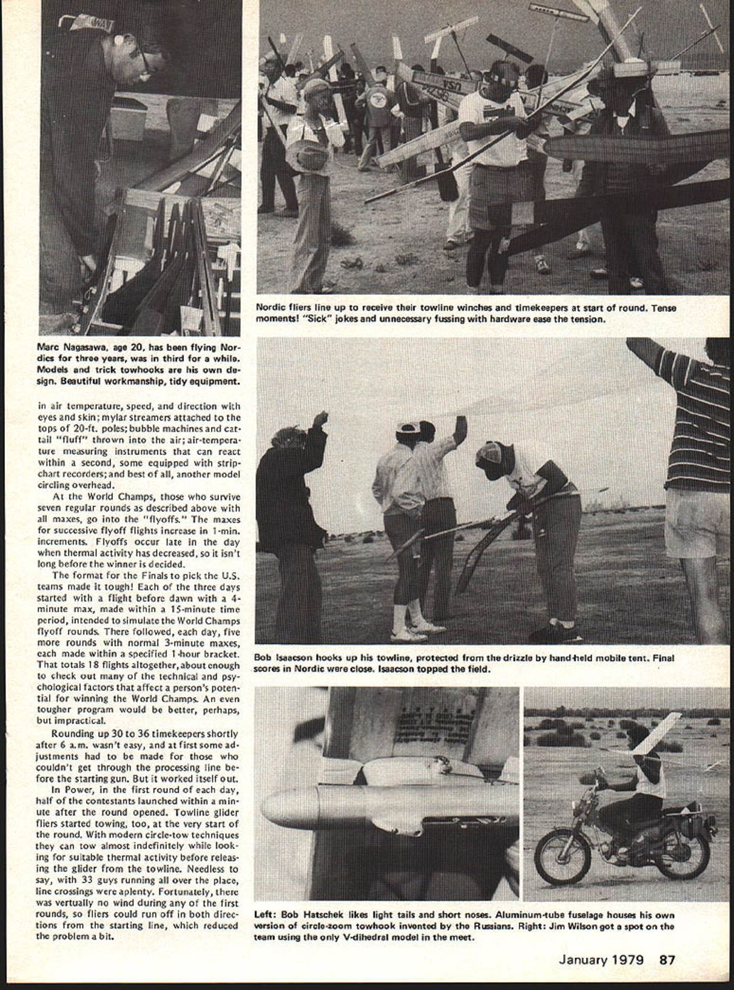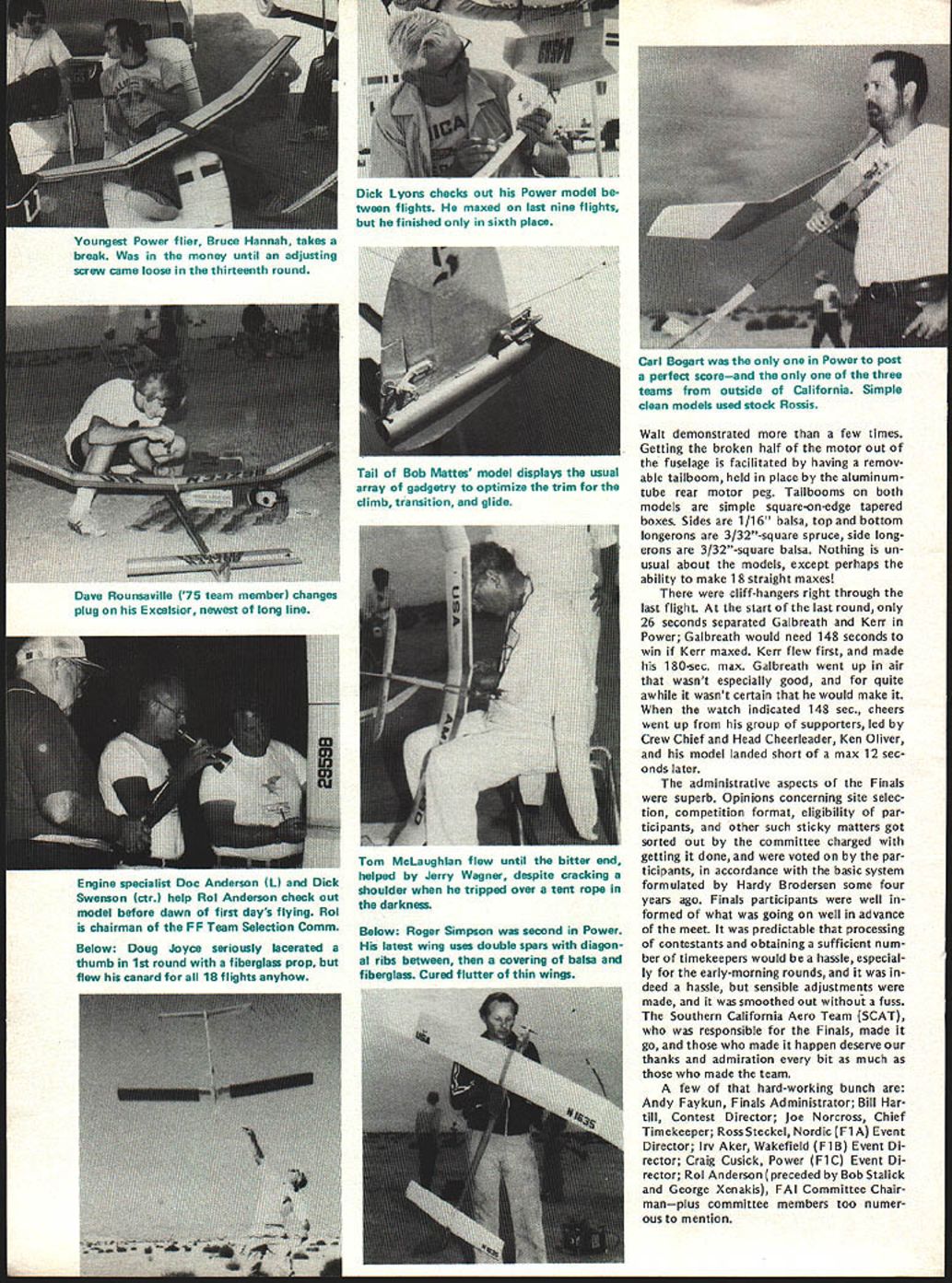 USA J AEROIdA Miller flu summer First air must cleared what some thought happened Work Koplan busy sewing up respective spots jack Hiner busier trying hold dpwn number three spota position held fourth round As last round ending Jackflew lOof 12 laps dis tance tasks perfect si-minute dur ation task coupled 90-point landing Most scoreboard watchers thought two flights enough nail down wnui IFTEENT NA offered ck ibt passed wo iple flights too nf best fowl nessed started off enis championshii *ying gra durationsaw o fliersn five-minute flights seven score less 85 landing poin perfect 360/100 secondsflandin 1000-point scores LeMon Payne f attempt maintain pace ha lished South Africa Payne pushe culmination program select three-I 1979 World Championships Pensacola Report Photos Dan Steve Work left Terry Skip Miller below reigning W Time sailplane designed Dave vator plane Team Finals Ke ter abor new fa won ing WA e Above Herb Smith original design Invador very clean ship con trolsrudder elevator spoilers flaps 8th Below Lee Renaud R helps Don Edberg get ready launch Aquila Grande Don 3 comuecutive 1000s Rounds 45 Carroll Moffatt above carries Aquila involved mideir collision Doyle Modestos Legionair shown below what looked like max have light breeze take bird downwind too fast pace meager height gain thermal giving Dale brought bird home before could max worse yet breeze caused Esprit land over 100 ters spotand rules brutally state thats zero flight score Only four fliers failed get maxes 12 scored less 85 land ing points Bob Gill Illinois flew Viking II perfect score 360/ 100 1000 points Day ended Distancethe make-you-or-break-you task pastby years rules has 12-lap maximum Further rules allow eight min utes working time 12 laps flown within four minutes Only half 40 fliers flew 10 laps just six maxed out among Steve Work New Mexico Terry Koplan California Kop Ian led end Round Two 3944 points point found out later scoring error 150-some points reversed Skip Miller Colorado Blame Miller Florida Rae Fritz Contest Director terrupted Nutters working time previous day calling measurement allowed RC SOARING TEAM FINALS RESULTS Speed tionDistanceRoundTotal P1Name/State/ModelRdSecs/PtsTime/Land/PtsLaps/PtsPointsPoints 1SteveWork1142/958358/50/88718447 NMex temp CA2359/90/97612/100019760 Bird Time3137/993358/90/97819708116857 4357/100/99612/100019956 5145/937358/100/99519335 6358/85/96512/100019650 2Terry Koplan1145/938359/100/99819358 California2359/100/99812/100019978 Viking3136/1000270/100/80818078113093 4353/95/97612/100019760 5170/800359/90/97617760 6357/95/98310/83318160 3Skip Miller1161 /845360/90/97818230 Colorado2360/95/9897%/64616349 Aquila Grande3150/906359/95/99118979111849 4312/100/89812/100018976 5143/951357/95/98219336 6359/100/99812/100019980 4Jack Hiner1152/895340/100/95718513 Illinois2357/85/96112/100019608 Aquila Grande3162/840357/100/99818373110326 4344/90/94612/100019455 5212/641358/95/98416262 6360/90/97810/83318115 5Bill Haga1195/697357/90/97716992 Texas2355/95/9781 0%/89618740 Legionair3166/819359/90/98017996109329 4359/100/100010%/89618958 5156/871359/100/99718696 6356/100/99110/83318240 6Bob Gill1149/913359/95/98718997 Illinois2360/100/10004%/39613958 Viking Mk II3138/986353/85/95619418108572 4357/100/99612/100019950 5166/819359/95/98618062 6358/95/98510/83318180 7Don Cameron1165/824358/85/96317893 Colorado23 57/80/9509/75017000 Aquila3148/919358/90/97818970107250 4359/55/90212/100019019 5170/800353/100/98417847 6355/100/9898/66616551 8Herb Smith1147/925360/100/1 00019252 Colorado2359/100/99812/100019978 Orig Invader3172/791360/95/99317841107236 4271/85/77611/91716926 5164/829357/95/98218118 6356/100/9916h/52015110 9Jack Hamilton1196/694357/100/9931687A Texas2359/75/94311/91718600 Legionair3187/727357/95/98717142107005 4360/95/99111/91719079 5196/693354/95/97616699 6359 /85/9891 0%/89518840 10John Gunsaullus1184/739360/100/1 00017391 Florida2357/100/9939/75017434 Original3174/781354/95/98017620106327 4358/100/99812/100019978 5184/739360/1 00/1 00017391 6355/95/9788/66616440 Dale re-fly duration task allowed balance working time count towards score plane re-positioned previous days spot working time allowed continue buzzer went off Steve Work retrieved Dale re-launched flew 344 made 90-point landing seconds before working time expired replaced zero score 314 points duration task Round Three no perfect scores Bill Johnson New York flew original bird 3581100 Because best round Bill earned 1000 points Only 11 failed score maxes 1 3 landing points under 85 mark Terry Koplan pushed Viking 136 speed followed Work 137 Gill 1 38 thirteens task However Hayes 140 put him back lead end round 5794 two points ahead secondplace Work 53 points ahead third-place Koplan Hiner fifth Skip Miller sev enth440 points behind leader point two contestants dropped out weather consistenthot 90s windwhen anyof six eight knots direction varied north northwest conditions pre RC SOARING TEAM FINALS RESULTS SpeedDurationDistance Round Total P1 Name/State/Model Rd Secs/Pts Time/Land/Pts Laps/Pts Points Points 11Craig Foxgord1192/708369/95/98716953 California2359/95/98711/91719036 Unknown3187/727206/85/63513626104814 4341/100/96110/2/87518357 5188/723354/95/97616994 6353/100/98512/100019850 12Ray Hayes1136/1000358/95/98519848 Indiana2353/90/96311/91718797 Osprey 9003140/971344/95/95919299103644 4231/80/6786/50011775 5144/944338/95/94118857 6354/90/9656A/54115060 13Blame Miller1177/768359/90/97617444 Florida2355/95/97810/83318110 Unknown3163/834358/60/91317470103137 4355/45/87110/83317047 5268/507350/100/97814857 6359/95/98710/83318200 14Bob Domer1173/786357/100/99317796 Colorado2359/65/92210/83317550 Legionair3165/824248/65/68315076102717 4356/80/95010%/89618457 5164/829359/75/94317727 6359/85/9867%/64516110 15Tom Williams1142/958360/1 00/1 00019577 Texas2359/100/9987h/60416019 Paramount3155/877344/0/75116285102369 4302/100/8761 0h/85417299 5172/790330/95/92317146 6360/100/100074/60416040 16Don Edberg1150/9073