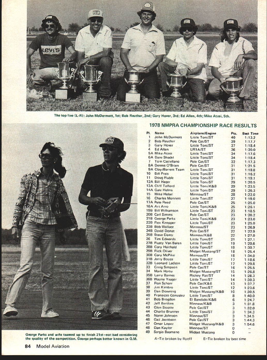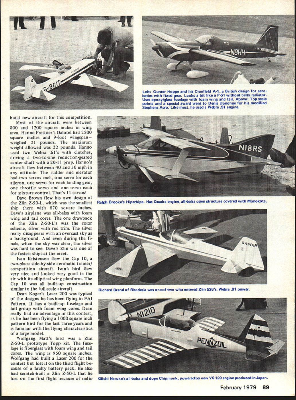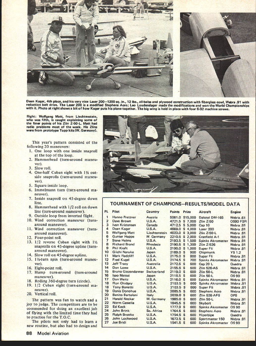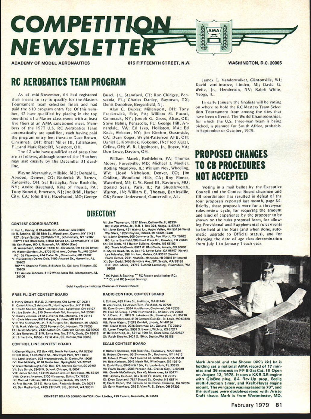 COM PETITIffiiMAa.. NE WSLETTE ACADEMY OF MODEL AERONAUTICS 815 FlFTEENTH STREET NW WASHINGTON DC 20005 RC AEROBATICS TEAM PROGRAM As mid-November 64 registered intent try qualify Masters Tournament team selection finals paid $10 program entry fee num ber 42 have qualified placing top one-third Master class event least five fliers AMA sanctioned meet Mem bers 1977 US RC Aerobatics Team automatically qualified having paid program entry fee Dave Brown Cincinnati OH Rhett Miller Ill Tallahassee FL Mark Radcliff Newport OH 42 have qualified press time follows although some thc 19 others may also qualify December 31 dead line Wayne Abernathy Hillside MD Donald L Atwood Denvez CO Roderick W Barnes Zanesville OH Sal Battaglia New Rochelle NY Andre Bauchard King Prussia PA Tony Bonetti Emerson NJ Joe Bridi Harbor City CA John Britt Hazelwood MOGeorge Buzel Jr Stamford CT Ron Chidgey Pen sacola FL Charles Danley Baytown TX Denis Donohue Bergenfield NJ Alan C Dupler Millersport OH Tony rackowiak Erie PA William M Furori Commack NY joseph G Gross Altus OK Steve Helms Pensacola FL George Hill An nandale VA Ed Izzo Holliston MA Fd Keck Webster NY Jim Kimbro Oceanside CA Dean Koger Wright-Patterson AFB OH Daniel E Kowallek Kokomo IN Fred Kugel Celina OH W R Lippincott Jr Boyce VA Don Lowe Dayton OH William Macek Bethlehem PA Thomas Moore Forestville MD Michael Mueller Rolling Meadows IL William Ney Wheeling WV Lloyd Nicholson Denver CO Jim Oddino Woodland Hills CA Roy Pinner Waterford Ml C W Reed III Raytown MO Donald Seals Paris IL Pat Shuttleworth Warren IN William E Thomas Bartlesville OK Biuce Underwood Guntersville AL DIRECTORY CONTEST COORDINATORS I Paul L Penney B Oarlotte Dr Andoser MA OlBtO II R Sobrino 87-26 88th St. Woodhanen Queens NY 11421 RC Bryan Sattler 29 Waldorf P1. Schenectady NY 12307 RC Fred Blackburn B Blue Spruce Ln. Commack NY 11725 Ill Ken Reber RD 1 Nazareth PA 18064 lEastI M Weisenbach 4568W 146th St. Cleseland OH 44135 IWessi IV Warren Sanders Jr. 9735 52nd Ane College Pk MD 20741 RC Ed Fitzwater 474 Tudor Or. Crownusille MD 21032 V NC Soaring Donna Dde 7409 Atwood Dr Huntsnille AL 35802 RC Charlene Fields 818 Main St. SW New Ellington SC 29809 FF Wallace Johnson 4112 White Acres Rd Montgomery AL 36106 VI Jim Thomerson 1317 EilewCollinssille IL 62234 RC Ralph White Jr RR 1 Son 324 Neoga IL 62447 VII John Enern 421 Walnut Las Apple Valley MN 55124 IWesti Wes Slack 12851 Payton Detroit MI 48224 lEasti VIII John Deaton 505 Connerce St. Port Worth TX 76102 RC Larry Snanfield 205 Quail Creek Dr Crowley TX 76036 IX Bill Bieda 411 Barker Building Osnelsa NE 68102 RC Tranis McGinnis 8027 W 81st Circle Arnada CO 80005 X Myrtle Coed Rn Boa 19 miner Lake CA 95457 INorthl Lee Polaneky 258 Iris Ate. Goleta CA 93017 ISouthi Prank Games 2241 Noah St Honolulu HI 96816 IHI meensi XI Don Dodd 3406 Bnltidere Ate. SW Seattle WA 98126 RC Don Miller 24715 Sa55mit-Landsburg Ranensdale WA 98051 RC Pylon & Souring RC Pattern other RC CL RC leocept Soaringi Bold Pace Below Indica-les Chairman Contest Board FREE FLIGHT CONTEST BOARD I Henry Struck RFO 2 Hamburg Old Lynre CT 06371 II Carrol Allen2 Arizona R Huntington Sta NY 11746 III Rudy Kluiber 2021 Lakeland Ate. Lakessood OH 44107 IV Joe Boyle Jr 219 Shenandoah Rd. Hampton VA 23361 V Bonny Jenkins 3112 E Raires Rd. Memphis TN 38115 VI Chris Mansuno 8S76 Ginger St John MO 83114 VII Phil Klintworth Jr. 715 Rutgers Rd. Rocinester Ml 48063 VIII Mark Valerius 2302 Pomeran Or. Houston TX 77055 IX Jerald Murphy 2432 Astron Dr Colorado Springs CO 80906 X Joe Norcross215 WSanta Ana No 211A Clonis CA 93612 XI Ernie Lint 16558- 121st Ace. SE RennonWA 98055 CONTROL LINE CONTEST BOARD I George Higgins P0 Ban 482 North Pembroke MA 02358 II Bill Boss 7706 269th St New Hyde Park NY 11040 III Laird Jackson 523 Meadombrook St Danids PA 19087 IV Ron McNally 6118 Bardo Ate Springfield VA 22152 V Dane Hemstruught PO Bon 171 Moecks Corner SC 29461 VI Bob Bsrch 5248W Scool Chicago IL 60641 VII James Snnon 4941 Wisconsin Ate. N New Hope MN 55428 VIII Charles Anasnon 3730 Kiestcnest Dallas TX 75233 IX Mictruel Tallman 3014 Eaclarge Wichita KS 67217 X Pete Brandn 315 S Maria Ace. Redondo Beach CA 90277 XI Dan Rutherford 4705 237th R SE Boshell WA 98011 RADIO CONTROL CONTEST BOARD I Ed Izzo 483 Fiske St Holliston MA 01746 II Joe Friend 62 Joysan Terr. Freehold NJ 07728 Ill Date Brown 8534 Huddleston Cincinnati OH 45236 IV Fred M Gregg 12709 Rcfrwood St. Chester VA 23831 V J Oasis Jr 1813S Lakesnore Dr. Birmingham AL 35216 VI Bob Onderwond 4109 Concord Oaks Dr. SI Louis MO 63128 VII Peter Waters 31219 Kendall Linonia MI 48154 VIII Danid Hyde 2026 Scommass Ln Garland TX 75042 IX Loren Tregellas 3003S Eterett Wichita KS 87217 X Bill Northrop Jr. 621 W 19th St Costa Mesa CA 92627 XI Ralph Brooke 3431 5 194th Seattle WA 98188 SCALE CONTEST BOARD I Richard Sherman 408 Rite Rd Tewksbury MA 01876 II Robert Clemens 95 Shoretray Dr Rochester NY 14612 Ill Edward Wisser 1521 Suwmn St McKeesport PA 15130 IV Bob Karlsuon 2643 Marsh Rd Wilmington DE 19810 V Danid Platt 6540 NW 15th Ft Lauderdale FL 33313 VI Frank Bearty 2608 Pontoon Rd. Granite City IL 62040 VII Claude McCullough Boa 40 Montezuma IA 50171 VIII Johnny Casburn Son 8029 Ft Worth TX 76112 IX Dean Copeland 7817 Sewed St. Omaha NE 68114 X Frank Capat 251 Camino de las P10mw Encininas CA 92024 Xl Earle Moorhead 275S View P1 5 Salem OR 97302 CONTEST BOARD COORDINATOR Don Lindley 420 Tupelo Napertille IL 60540 James E Vanderwalker Clintonville WI David vonLinsowe Linden Ml David G Weitz Jr Henderson NV Ralph White Neoga IL early January finalists will voting hold RC Masters Team Selec tion Tournament among sites have offered World Championships US three-man team being picked planned South Africa probably September October 1979 PROPOSED CHANGES TO CB PROCEDURES NOT ACCEPTED Vot ng n ma ballot Execut ye Council Contest Board chairmen CB coordinator has resulted defeat four proposals reported last month page 84 Briefly proposals thre