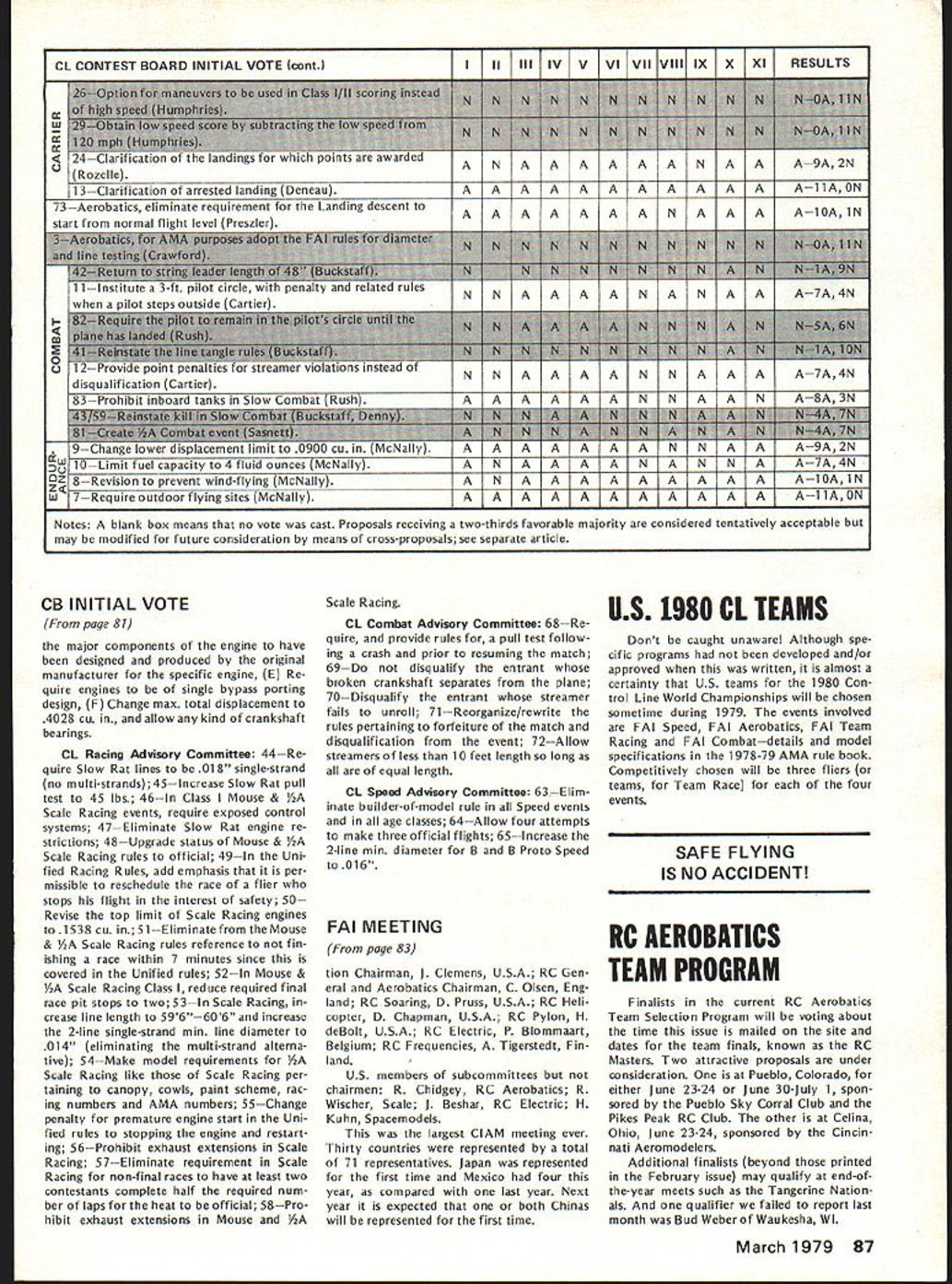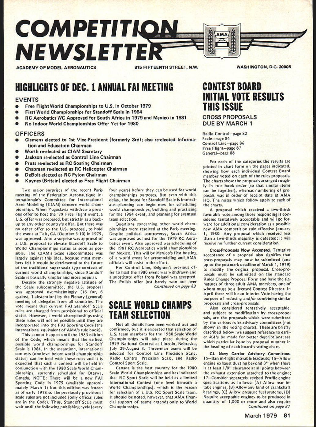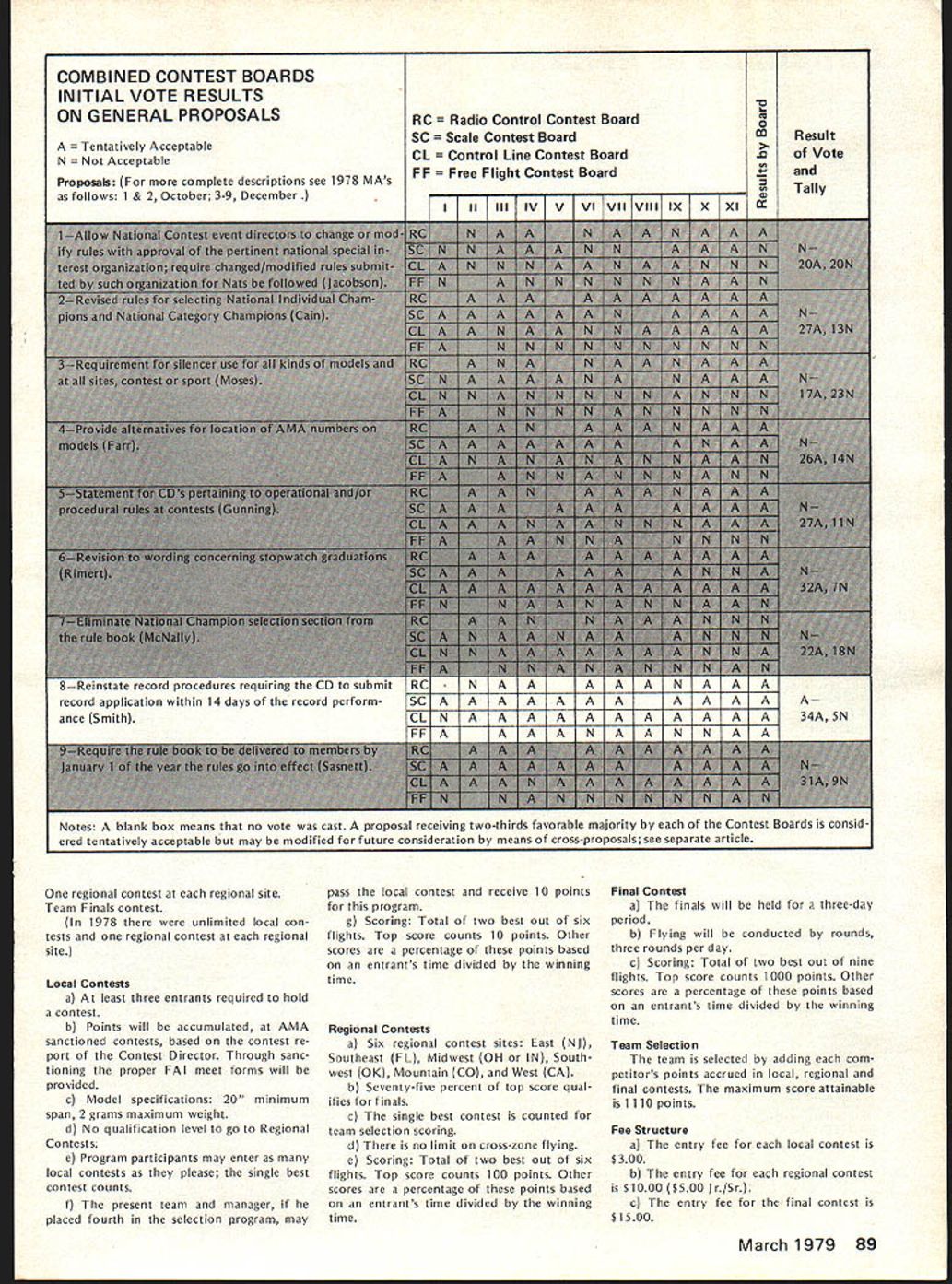 HIGHUGHTS OF DEC 1 ANNUAL FAI MEETING EVENTS Free Flight World Championships US October 1979 First World Championships Standoff Scale 1984 RC Aerobatics WC Approved South Africa 1979 Mexico 1981 No Indoor World Championships Offer Yet 1980 OFFICERS Clemens elected 1st Vice-President formerly 3rd also re-elected Informa tion Education Chairman Worth re-elected ClAM Secretary Jackson re-elected Control Line Chairman Pruss re-elected RC Soaring Chairman Chapman re-elected RC Helicopter Chairman DeBolt elected RC Pylon Chairman Kaynes Britain elected Free Flight Chairman Two major surprises recent Paris meeting Federation Aeronautique ternationales Committee International Aero Modeling ClAM concern world cham pionships Yugoslavia withdrew previ ous offer host 79 Free Flight event US offer prepared strictly back up other countrys offer no other offer US proposal hold event Taft CA October 3-10 1979 approved Also surprise approval US proposal elevate Standoff Scale World Championships status soon pos sible ClAMs Scale subcommittee largely against idea because mem bers felt would detrimental future traditional super-scale type contests current world championships since Standoff Scale basically simpler popular Despite strongly negative attitude Scale subcommittee US proposal approved overwhelmingly 16 6 against 1 abstention Plenary general meeting delegates countries vote means current FAI Standoff Scale rules changed provisional official status However world championships using rules will possible until incorporated FAI Sporting Code international equivalent AMAs rule book cannot happen until 1983 edition Code means earliest possible world championships Standoff Scale 1984 meantime international contests level below world championship status can held rules expected such contest will held conjunction 1980 Scale World Cham pionships currently scheduled Ottawa Canada NOTE will new FAI Sporting Code 1979 available approxi mately March 1 edition frozen early 1978 previously provisional scale rules included jonly official rules Code Thus Standoff Scale must wait until following publishing cycle four years before can used world championships purposes delay boost Standoff Scale immedi ateplanning can begin now scheduling world championships building practicing 1984 event planning eventual team selection Questions concerning other world cham pionships resolved Paris meeting Despite political controversy South Africa approved host 1979 RC Aero batics event Also approved scheduling 1981 RC Aerobatics world championships Mexico will Mexicos first hosting world event aeromodeling AMA officials will assist effort Control Line Belgiums previous fer host 1980 event withdrawn substitute offer Poland accepted Polish offer just barely won out over Continued page 83 SCALE WORLD CHAMPS TEAM SELECTION details have worked out confirmed expected selection US team members 1980 Scale World Championships will take place during 1979 National Contest Lincoln Nebraska July 29-August 5 Three-man teams will selected Control Line Precision Scale Radio Control Precision Scale Radio Control Sport Scale Canada host country 1980 Scale World Championships has indicated RC Sport Scale will held limited International Contest level beneath World Championships reason selection US RC Sport Scale team should noted however AMA finan cial support teams extends World Championships CONTEST BOARD INITIAL VOTE RESULTS THIS ISSUE CROSS PROPOSALS DUE BY MARCH 1 Radio Controlpage 82 Scalepage 84 Control Linepage 86 Free Flightpage 87 Generalpage 88 categories results printed chart form pages indicated showing individual Contest Board member voted rules proposals charts show proposals arranged rough ly rule book order similar items can together whereas numbering pro posals order receipt date AMA HQ notes follow apply charts proposal received two-thirds favorable vote among responding con sidered tentatively acceptable will go ward additional consideration possible new AMA competition rule effective January 1 1980 Any proposal received less two-thirds majority defeated will receive no further current consideration Cross-Proposals Now Accepted Tentative acceptance proposal also signifies cross-proposals may now submitted up postmark deadline March 1 1979 modify original proposal Cross-pro posals must submitted standard Rules Change Proposal Form have sig natures three adult AMA members must licensed Contest Director April will Interim Vote having purpose reducing and/or combining similar proposals cross-proposals Also considered tentatively acceptable subject modification cross-propo sals proposals submitted various rules advisory committees shown voting charts briefly described below suggest reference earli er MAs made better descriptions see particular issue proposal number heading boards voting chart CL Navy Carrier Advisory Committee 15Ban in-flight movable leadouts 16Allow engine exhaust ducting beyond 3 least 1/8 clearance points between exhaust extension attached engine 17--Consider separately revised Profile engine specifications follows Allow rear take engines B Allow kind crankshaft bearings C Allow pressure fuel systems jD Require acceptable engines produced quantity 1000 also require Continued page 87 March 1979 81 NEWSLET ACADEMY OF MODEL AERONAUTICS815 FIFTEENTH STREET NW WASHINGTON DC 20005 RADIO CONTROL CONTEST BOARD INITIAL VOTE RESULTS 0QoU Tentatively Acceptablec0Result -- cceptable ~ ofVote N U-0C Q~0 ~and Proposals complete descriptions see 1978 MAs follows i .-u 0 J o y 1-6 October 7-84 December 63Establish RC General section rule book first such ruleNAAAAAAANAAA9A 2N requiring declaration successful flight completion Northrop 65Consolidate AMA & FAI ground rules NorthropAAAAAAAAAAAAhA ON 51Eliminate reference full-scale aircraft maneuvers fromAAAAAAAAAAAAil ON event objective Friend 4aAward classification advancement points based number fliers lower place revise totals advancing CainNAAAAAAANNAA8A 3N 4bAMA HQ maintain records 