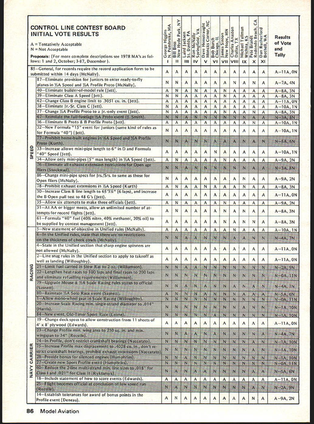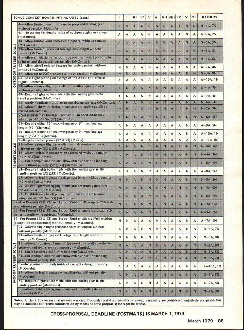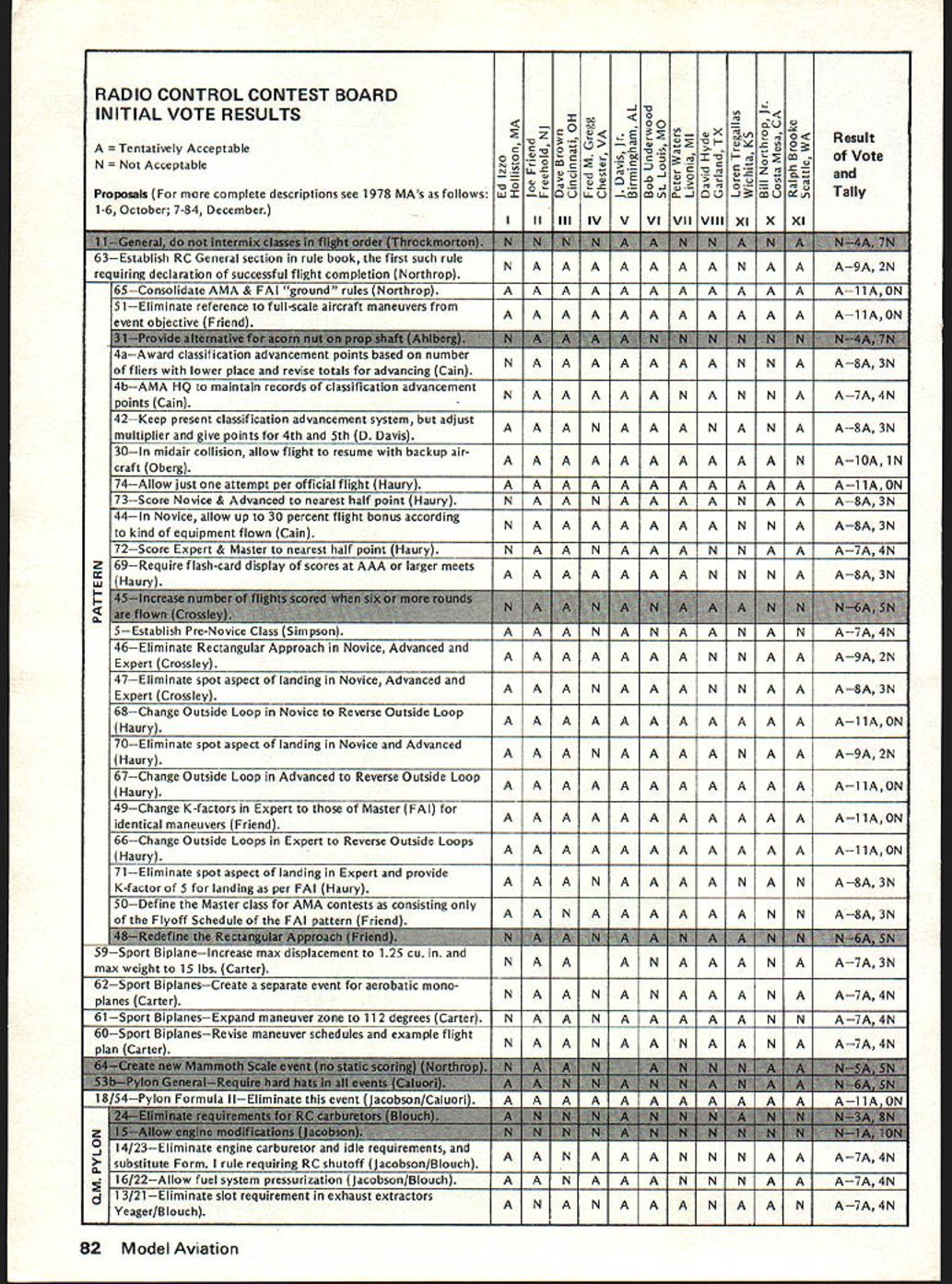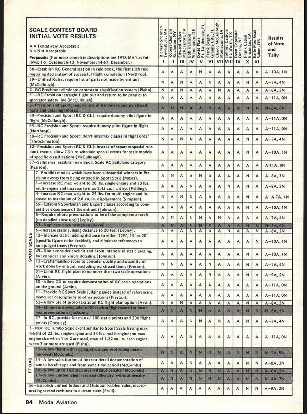 HIGHUGHTS OF DEC 1 ANNUAL FAI MEETING EVENTS Free Flight World Championships US October 1979 First World Championships Standoff Scale 1984 RC Aerobatics WC Approved South Africa 1979 Mexico 1981 No Indoor World Championships Offer Yet 1980 OFFICERS Clemens elected 1st Vice-President formerly 3rd also re-elected Informa tion Education Chairman Worth re-elected ClAM Secretary Jackson re-elected Control Line Chairman Pruss re-elected RC Soaring Chairman Chapman re-elected RC Helicopter Chairman DeBolt elected RC Pylon Chairman Kaynes Britain elected Free Flight Chairman Two major surprises recent Paris meeting Federation Aeronautique ternationales Committee International Aero Modeling ClAM concern world cham pionships Yugoslavia withdrew previ ous offer host 79 Free Flight event US offer prepared strictly back up other countrys offer no other offer US proposal hold event Taft CA October 3-10 1979 approved Also surprise approval US proposal elevate Standoff Scale World Championships status soon pos sible ClAMs Scale subcommittee largely against idea because mem bers felt would detrimental future traditional super-scale type contests current world championships since Standoff Scale basically simpler popular Despite strongly negative attitude Scale subcommittee US proposal approved overwhelmingly 16 6 against 1 abstention Plenary general meeting delegates countries vote means current FAI Standoff Scale rules changed provisional official status However world championships using rules will possible until incorporated FAI Sporting Code international equivalent AMAs rule book cannot happen until 1983 edition Code means earliest possible world championships Standoff Scale 1984 meantime international contests level below world championship status can held rules expected such contest will held conjunction 1980 Scale World Cham pionships currently scheduled Ottawa Canada NOTE will new FAI Sporting Code 1979 available approxi mately March 1 edition frozen early 1978 previously provisional scale rules included jonly official rules Code Thus Standoff Scale must wait until following publishing cycle four years before can used world championships purposes delay boost Standoff Scale immedi ateplanning can begin now scheduling world championships building practicing 1984 event planning eventual team selection Questions concerning other world cham pionships resolved Paris meeting Despite political controversy South Africa approved host 1979 RC Aero batics event Also approved scheduling 1981 RC Aerobatics world championships Mexico will Mexicos first hosting world event aeromodeling AMA officials will assist effort Control Line Belgiums previous fer host 1980 event withdrawn substitute offer Poland accepted Polish offer just barely won out over Continued page 83 SCALE WORLD CHAMPS TEAM SELECTION details have worked out confirmed expected selection US team members 1980 Scale World Championships will take place during 1979 National Contest Lincoln Nebraska July 29-August 5 Three-man teams will selected Control Line Precision Scale Radio Control Precision Scale Radio Control Sport Scale Canada host country 1980 Scale World Championships has indicated RC Sport Scale will held limited International Contest level beneath World Championships reason selection US RC Sport Scale team should noted however AMA finan cial support teams extends World Championships CONTEST BOARD INITIAL VOTE RESULTS THIS ISSUE CROSS PROPOSALS DUE BY MARCH 1 Radio Controlpage 82 Scalepage 84 Control Linepage 86 Free Flightpage 87 Generalpage 88 categories results printed chart form pages indicated showing individual Contest Board member voted rules proposals charts show proposals arranged rough ly rule book order similar items can together whereas numbering pro posals order receipt date AMA HQ notes follow apply charts proposal received two-thirds favorable vote among responding con sidered tentatively acceptable will go ward additional consideration possible new AMA competition rule effective January 1 1980 Any proposal received less two-thirds majority defeated will receive no further current consideration Cross-Proposals Now Accepted Tentative acceptance proposal also signifies cross-proposals may now submitted up postmark deadline March 1 1979 modify original proposal Cross-pro posals must submitted standard Rules Change Proposal Form have sig natures three adult AMA members must licensed Contest Director April will Interim Vote having purpose reducing and/or combining similar proposals cross-proposals Also considered tentatively acceptable subject modification cross-propo sals proposals submitted various rules advisory committees shown voting charts briefly described below suggest reference earli er MAs made better descriptions see particular issue proposal number heading boards voting chart CL Navy Carrier Advisory Committee 15Ban in-flight movable leadouts 16Allow engine exhaust ducting beyond 3 least 1/8 clearance points between exhaust extension attached engine 17--Consider separately revised Profile engine specifications follows Allow rear take engines B Allow kind crankshaft bearings C Allow pressure fuel systems jD Require acceptable engines produced quantity 1000 also require Continued page 87 March 1979 81 NEWSLET ACADEMY OF MODEL AERONAUTICS815 FIFTEENTH STREET NW WASHINGTON DC 20005 RADIO CONTROL CONTEST BOARD INITIAL VOTE RESULTS 0QoU Tentatively Acceptablec0Result -- cceptable ~ ofVote N U-0C Q~0 ~and Proposals complete descriptions see 1978 MAs follows i .-u 0 J o y 1-6 October 7-84 December 63Establish RC General section rule book first such ruleNAAAAAAANAAA9A 2N requiring declaration successful flight completion Northrop 65Consolidate AMA & FAI ground rules NorthropAAAAAAAAAAAAhA ON 51Eliminate reference full-scale aircraft maneuvers fromAAAAAAAAAAAAil ON event objective Friend 4aAward classification advancement points based number fliers lower place revise totals advancing CainNAAAAAAANNAA8A 3N 4bAMA HQ maintain records 