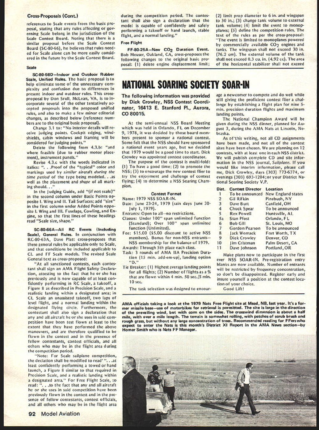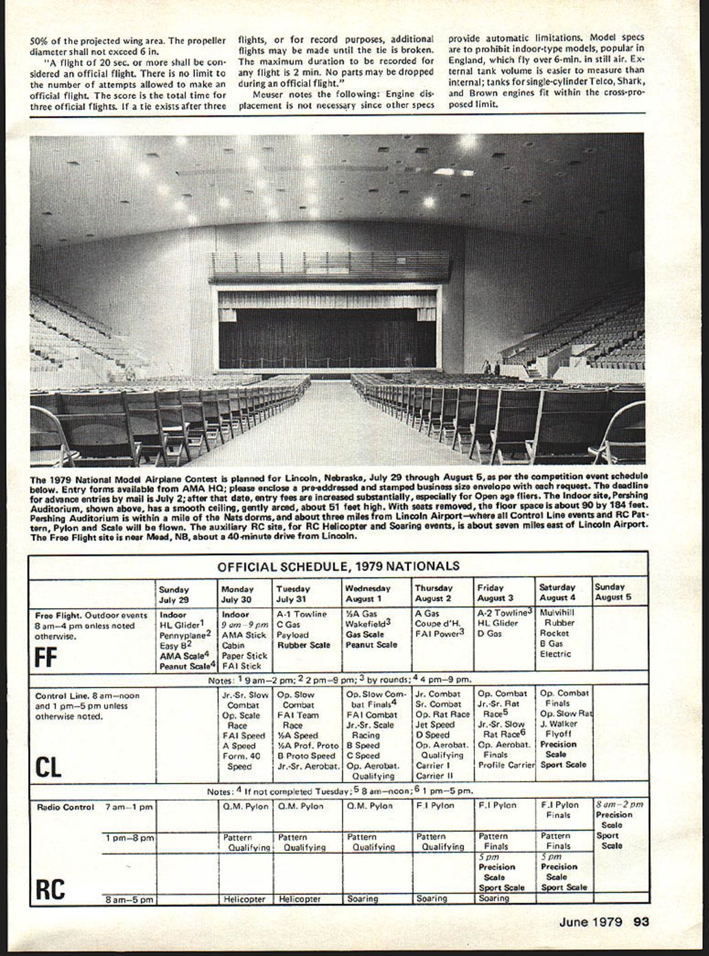 NEWSL ACADEMY OF MODEL AERONAUTICS 815 FIFTEENTH STREET NW WASHINGTON DC 20005 CL COMBAT TEAM SELECTION PROGRAM RUBBER FOR PEANUTS program select US team 1980 Control Line Combat World Cham pionships per details below has ap proved AMA Combat Team Selection Committee voting 9 1 previous program participants voting 13 1 pro gram has submitted approval AMA President Earl Witt Members Combat Team Selection Committee generally recruited Miniature Aircraft Combat Assn MACA en dorsed respective AMA vice-presidents confirmed previous program partici pants Current committee members Steve Sacco Norwell MA Bill Bird Florham Park NJ Charles Rudner Cleveland Heights OH Bill Harris Laurel MD W M Mack Henry Nashville TN Gary Frost Florissant MO Paul Smith chairman Sterling Heights Ml George Cleveland Kenner LA Dave Jones Wichita KS Charlie Johnson San Diego CA Howard Rush Kirkland WA program developed over span virtually full year during time number alterna tives considered PROGRAM DETAILS 1 Entries must US citizens according FAI guidelines possess current AMA license $5 FAI stamp Advance en tries should sent AMA Headquarters postmarked before June 30 1979 accompanied entry fee $5000 entries after date will considered late will paid on-site Contest Di rector no later 700 pm Friday Sep tember 14 1979 CD will remit entry fees paid on-site AMA HQ Total fee late entries including both basic charge penalty $7500 2 Time Pilots officials meeting600 pm Friday September 14 Flying1000 am 600 pm Saturday September 15 Sunday September 161979 3 Place Buder Park St Louis MO 4 Purpose select three primary seven alternate FAI Combat pilots US team 1980 World Championships Team placings determined solely number matches won during con test 5 Mechanics will selected pi lot Mechanics involved pro gram except pilots may share por tion travel fund para 103 mechanics actually pit World Championships 6 Pilots may enter team trials teams two three purposes separation own teammates teams will have same status nations FAI rule book US team may composed members same team different teams Anyone may act mechanic pilot during team trials 7 FAI Jury protests will decided three-man FAI Jury Jury will include timers circle marshall However Jury may other duties such pull-test record-keeping etc Jury may vote either contestant rematch FAI Jury final authority field ever protest unresolvable between pro tester Jury must arbitrated AMA President has final authority FAI matters per AMA By-Laws FAI Jury may over-rule decisions Contest Director other officials including whether suspend flying weather darkness 8 Competition Rules match will run according 1980 FAI rules same 1979 rules FAI Jury will make necessary clarifications terpretations rules However no case will FAI rules changed eliminated except contained Program exception FAI rules will pyramid elimination system will used Instead Triple Elim Ladder Sys tem will used a Pilots will advance round per match won b Pilots will continue compete until have lost total three matches c If beginning round total number fliers odd someone will get bye Pilots will advance abyethey will stay until win match advance d If number pilots two rounds odd pilots different rounds may fly other e The first three rounds will flown Saturday remainder Sunday round defined matches required fliers either win once accumulate third loss f Matching 1 The same two pilots will fly other twice until have flown re maining pilots once 2 Team members will matched gether after have flown other remain ing contestants 3 will no consideration number losses matching Contestants either similar dissimilar numbers losses may matched together g In event contestant forfeits disqualified before signal com mence combat will charged loss opponent will receive rematch credited neither win nor loss disqualification does result third loss same two pilots will fly re AMA Scale Contest Board Claude McCullough chairman has voted unanimous ly issue following clarification intent Scale Contest Board specifies during development consideration passage rules Peanut Scale Events 52 53 understood concerned rules intended rubber-pow ered models though through over sight stated rule book Therefore declared intent Peanut Scale rules rubber-powered models used no other type power will permitted effective immediate ly clarification sought District II Scale CB member Robert L Clemens noted gas-engine-powered model won outdoor Peanut event 1978 Nats rules proposal SC-80-9 presently un der consideration require rubber power effective 1980 Contest Board Procedures require ratifi cation vote such immediately effective terpretations four six weeks after publica tion action Anyone wishing affect outcome ratification vote should state views district Scale Contest Board member June 11979 match disqualification occurs after signal commence combat non-disqual ified contestant will credited win h accordance FAI Rules Gen eral page 70 AMA Rule Book com petitor named entry form must builder models entered Also models must display AMA license numerals numerals should permanently affixed preceded N 9 Scoring end match judges will present both pilots itemized scores including cuts air time reason amount penalties total score 1OBudget Income will supplied pilots entry fees additional contribu tions Combat Program three separate funds Pro gram 1 Team Trials Expenses 2 Pilots Ve hicle Rental team members 3 Inboard Travel Note An apportionment AMA dues covers over-ocean transportation en try fees US team members World Championships 1980 CL World Cham pionships planned Poland 101 Team Trials Expenses will paid first $1 000 pilots entry fee Any excess money after team trials will put Item No 3 102 Pilots Vehicle Rentals team members will paid out second $10 pilots entry fee event pi lots vouchers exceed money item June1979 89 Combat Team Selection Cont will equally share money available Any excess money will go Item No 3 Vehicle rentals will reimbursed fund location living