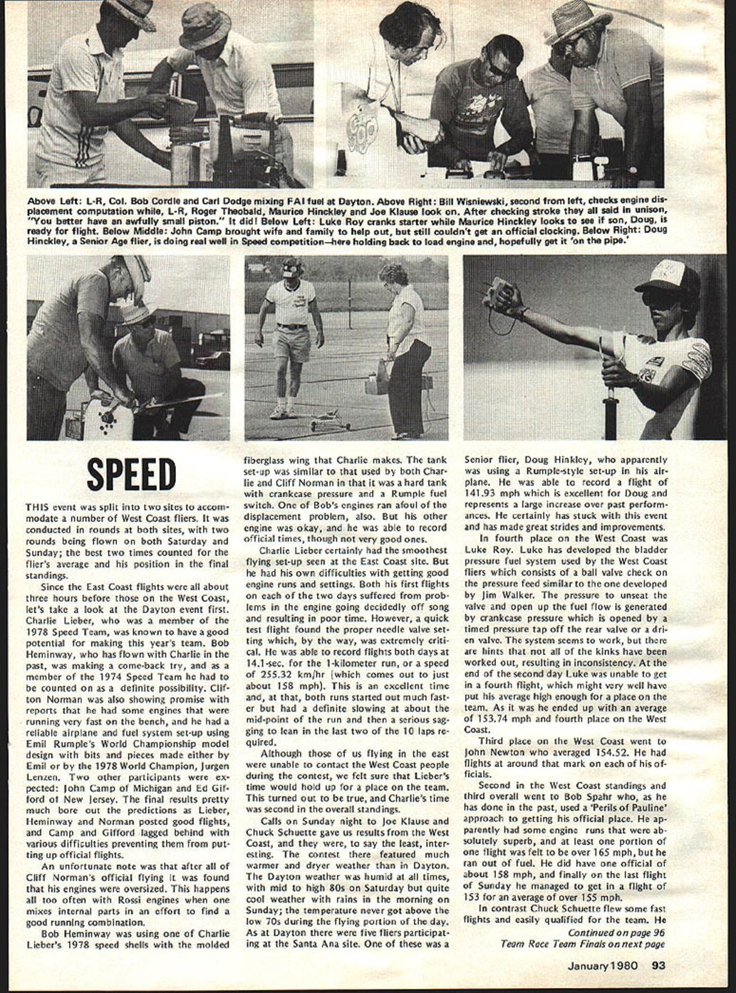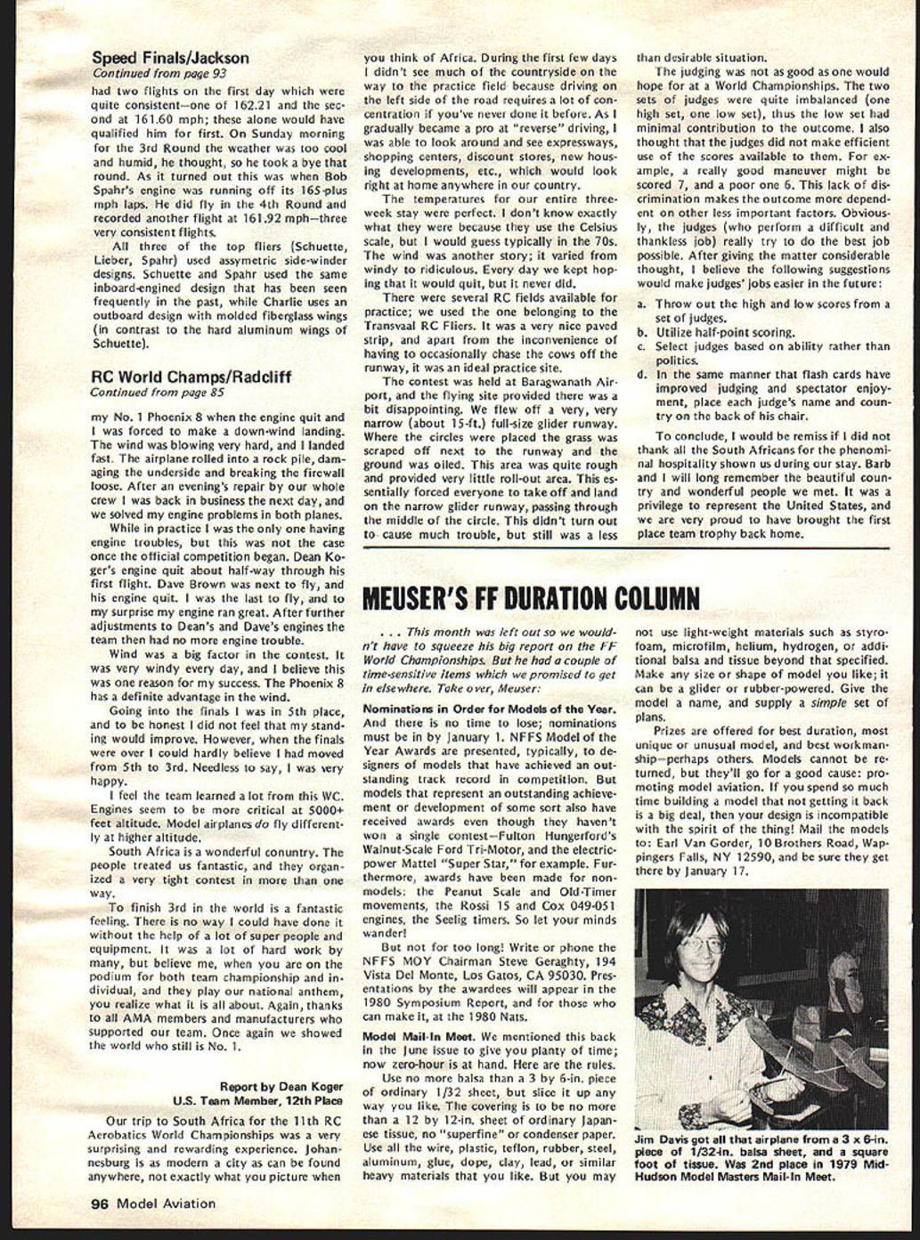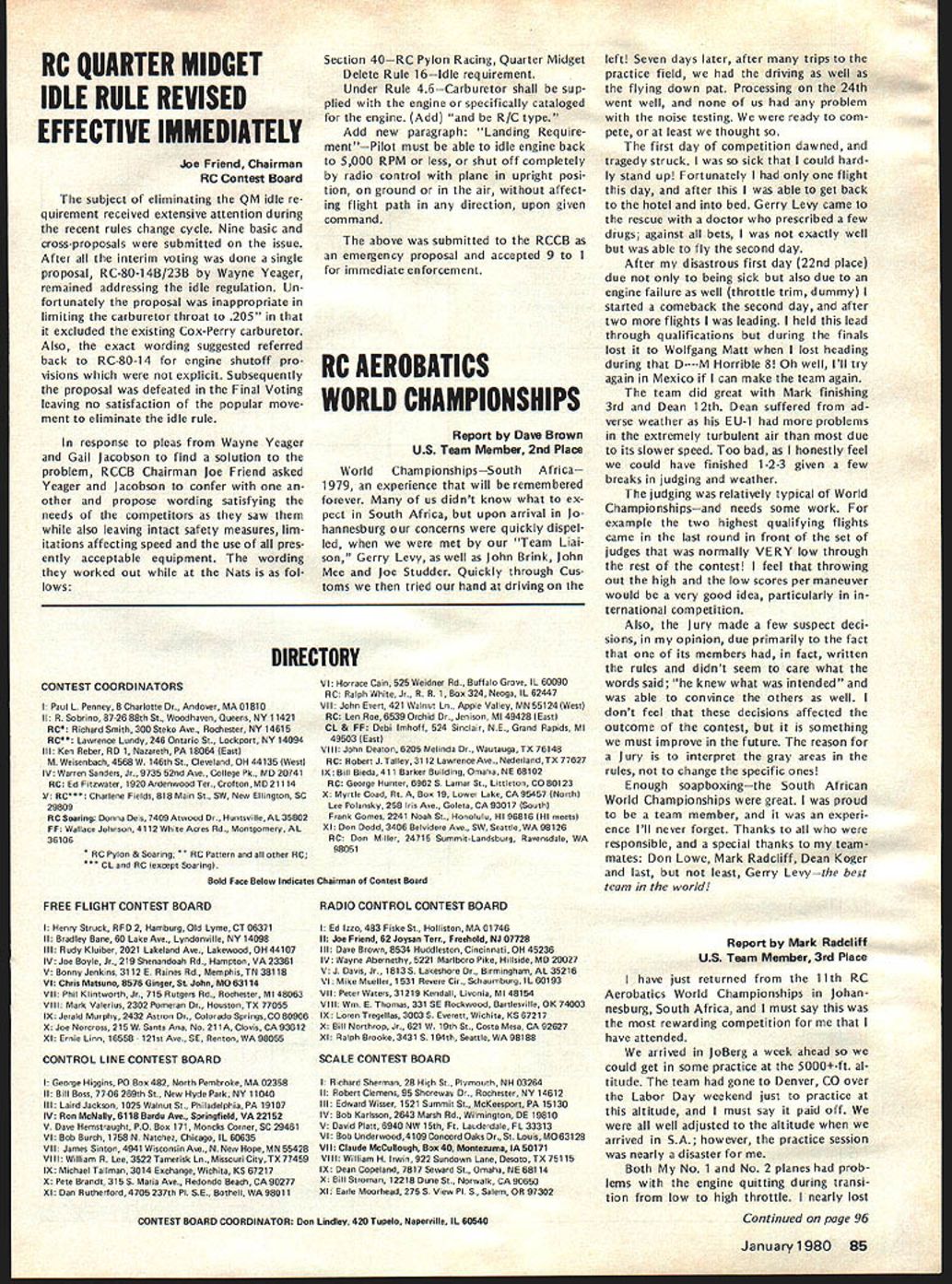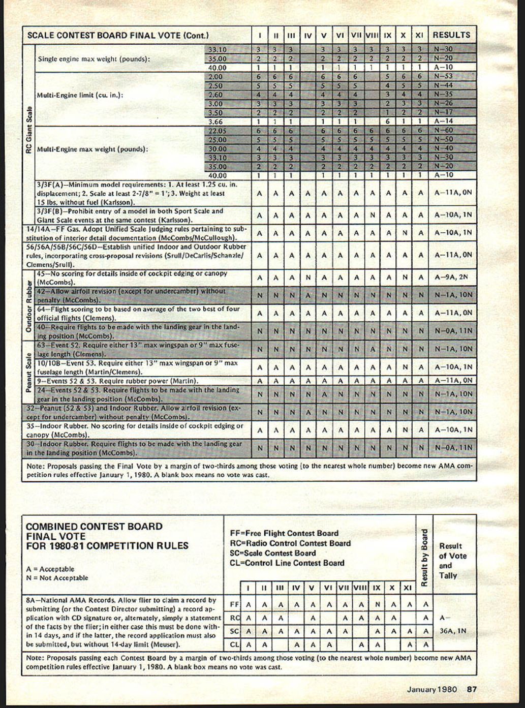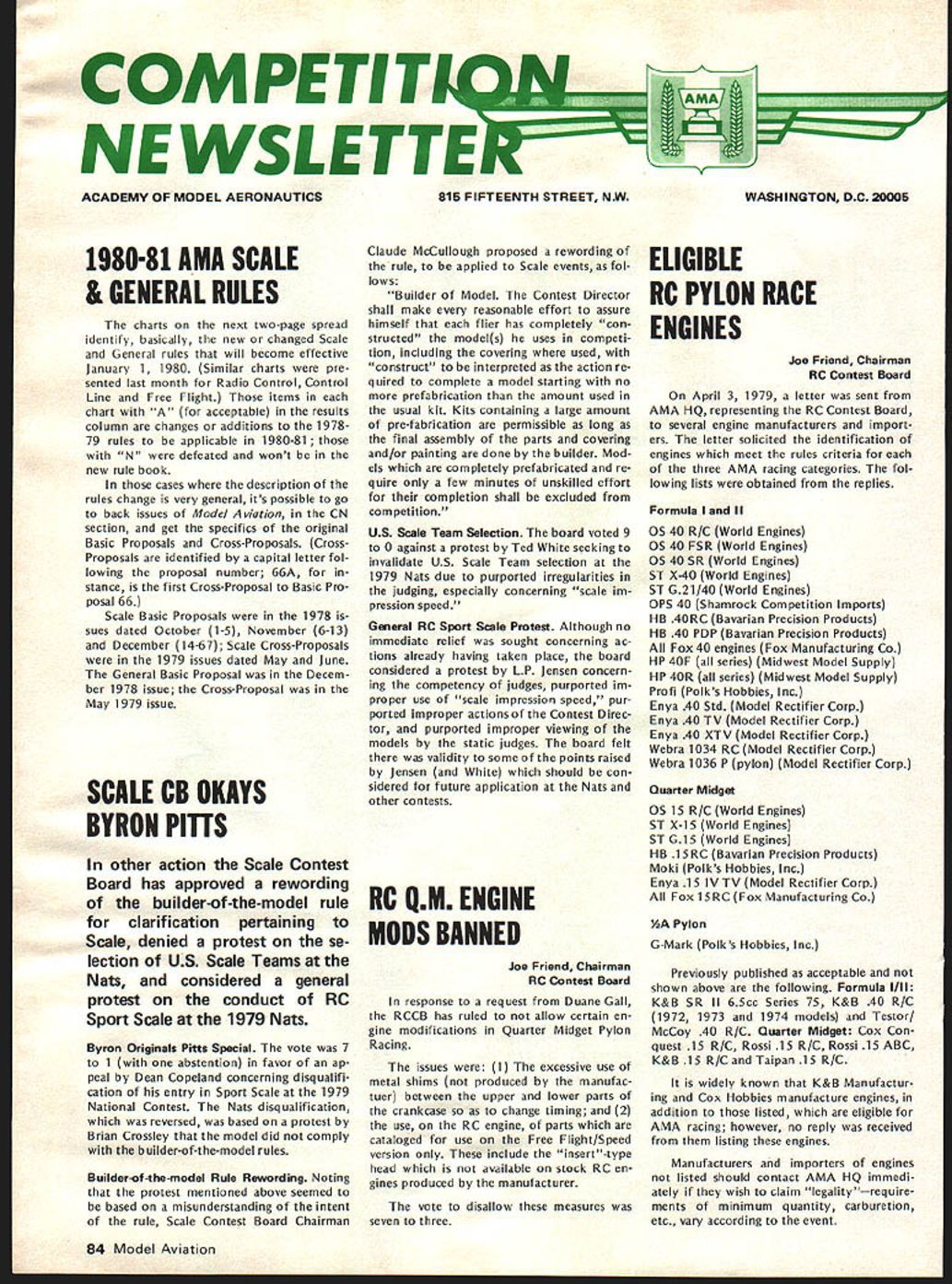 I NE WSLETTEIU ACADEMY OF MODEL AERONAUTICS 1980-81 AMA SCALE & GENERAL RULES charts next two page spread identify basically new changed Scale General rules will become effective January 1 1980 Similar charts pre sented last month Radio Control Control Line Free Flight items chart acceptable results column changes additions 197879 rules applicable 1980-81 feated wont new rule book cases description rules change very general its possible go back issues Model v/at ion CN section get specifics original Basic Pro posals Cross-Pro posals Cross Proposals identified capital letter fol lowing proposal number 66A stance first Cross-Proposal Basic Pro posal 66 Scale Basic Proposals 1978 sues dated October 1-5 November 6-13 December 14-67 Scale Cross-Proposals 1979 issues dated May June General Basic Proposal Decem ber 1978 issue Cross-Proposal May 1979 issue SCALE CB OKAYS BYRON PIUS other action Scale Contest Board has approved rewording builder-of-the-model rule clarification pertaining Scale denied protest se lection US Scale Teams Nats considered general protest conduct RC Sport Scale 1979 Nats Byron Originals Pitts Special vote 7 1 abstention favor ap peal Dean Copeland concerning disqualifi cation entry Sport Scale 1979 National Contest Nats disqualification reversed based protest Brian Crossley model did comply builder-of-the-model rules Builder-of-the-model Rule Rewording Noting protest mentioned above seemed based misunderstanding intent rule Scale Contest Board Chairman 815 FIFTEENTH STREET NW Claude McCullough proposed rewording rule applied Scale events fol lows Builder Model Contest Director shall make reasonable effort assure himself flier has completely con structed models uses competi tion including covering used construct interpreted action re quired complete model starting no prefabrication amount used usual kit Kits containing large amount pre-fabrication permissible long final assembly parts covering and/or painting done builder Mod els completely prefabricated re quire few minutes unskilled effort completion shall excluded competition US Scale Team Selection board voted 9 0 against protest Ted White seeking invalidate US Scale Team selection 1979 Nats due purported irregularities judging especially concerning scale im pression speed General RC Sport Scale Protest Although no immediate relief sought concerning ac tions already having taken place board considered protest LP Jensen concern ing competency judges purported im proper use scale impression speed pur ported improper actions Contest Direc tor purported improper viewing models static judges board felt validity some points raised Jensen White should con sidered future application Nats other contests RC IIM ENGINE MOOS BANNED Joe Friend Chairman RC Contest Board response request Duane Gall RCCB has ruled allow certain en gine modifications Quarter Midget Pylon Racing issues 1 excessive use metal shims produced manufac tuer between upper lower parts crankcase change timing 2 use RC engine parts cataloged use Free Flight/Speed version include insert-type head available stock RC en gines produced manufacturer vote disallow measures seven three WASHINGTON DC 20005 ELIGIBLE RC PYLON RACE ENGINES Joe Friend Chairman RC Contest Board April 3 1979 letter sent AMA HQ representing RC Contest Board several engine manufacturers import ers letter solicited identification engines meet rules criteria three AMA racing categories fol lowing lists obtained replies Formula II 05 40 R/C World Engines 05 40 FSR World Engines 05 40 SR World Engines ST X-40 World Engines ST G21/40 World Engines OPS 40 Shamrock Competition Imports HB 4ORC Bavarian Precision Products HB 40 PDP Bavarian Precision Products Fox 40 engines Fox Manufacturing Co HP 40F series Midwest Model Supply HP 40R series Midwest Model Supply Profi Polks Hobbies Inc Enya 40 Std Model Rectifier Corp Enya 40 TV Model Rectifier Corp Enya 40 XTV Model Rectifier Corp Webra 1034 RC Model Rectifier Corp Webra 1036 P pylon Model Rectifier Corp Quarter Midget 05 15 R/C World Engines ST X-15 World Engines ST G15 World Engines HB 15RC Bavarian Precision Products Moki Polks Hobbies Inc Enya 15 IV TV Model Rectifier Corp Fox 15RC Fox Manufacturing Co AA Pylon G-Mark Polks Hobbies Inc Previously published acceptable shown above following Formula I/Il K&B SR II 65cc Series 75 K&B 40 R/C 1972 1973 1974 models Testor/ McCoy 40 R/C Quarter Midget Cox Con quest 15 R/C Rossi 15 R/C Rossi 15 ABC K&B 15 R/C Taipan 15 R/C widely known K&B Manufactur ing Cox Hobbies manufacture engines addition listed eligible AMA racing however no reply received listing engines Manufacturers importers engines listed should contact AMA HQ immedi ately wish claim legalityrequire ments minimum quantity carburetion etc vary according event 84 Model Aviation -V RC QUARTER MIDGET IDLE RULE REVISED EFFECTIVE IMMEDIATELY Joe Friend Chairman RC Contest Board subject eliminating QM idle re quirement received extensive attention during recent rules change cycle Nine basic cross-proposals submitted issue After interim voting done single proposal RC-80-14B/23B Wayne Yeager remained addressing idle regulation Un fortunately proposal inappropriate limiting carburetor throat 205 excluded existing Cox-Perry carburetor Also exact wording suggested referred back RC-80-14 engine shutoff pro visions explicit Subsequently proposal defeated Final Voting leaving no satisfaction popular move ment eliminate idle rule response pleas Wayne Yeager Gail Jacobson find solution problem RCCB Chairman Joe Friend asked Yeager Jacobson confer other propose wording satisfying needs competitors saw also leaving intact safety measures lim itations affecting speed use pres ently acceptable equipment wording worked out Nats fol lows FREE FLIGHT CONTEST BOARD Section 40RC Pylon Racing Quarter Midget Delete Rule 16Idle requirement Under Rule 46Carburetor shall sup plied engine specifically cataloged engine Add R/C type Add new paragraph Landing Require mentPilot 