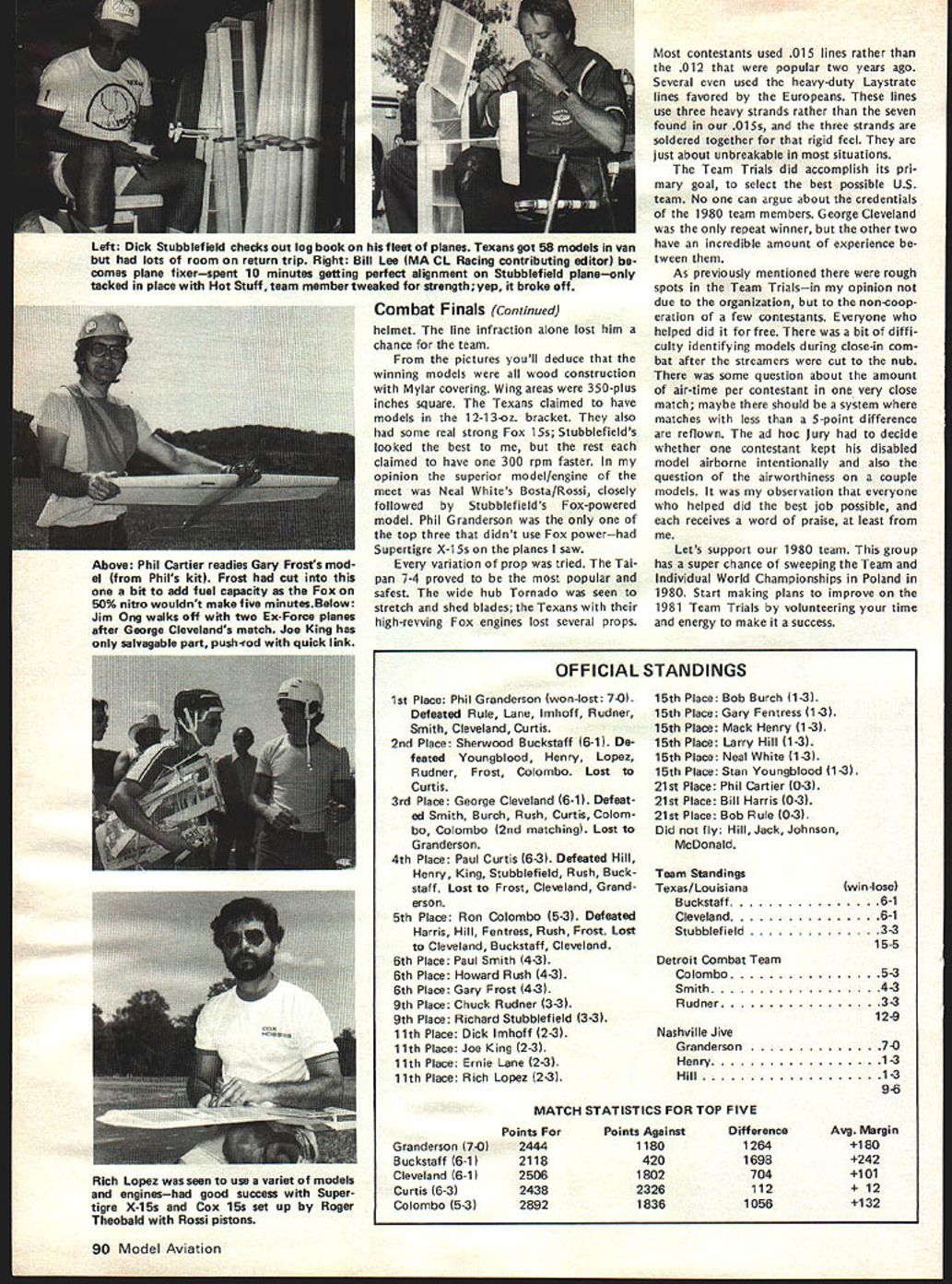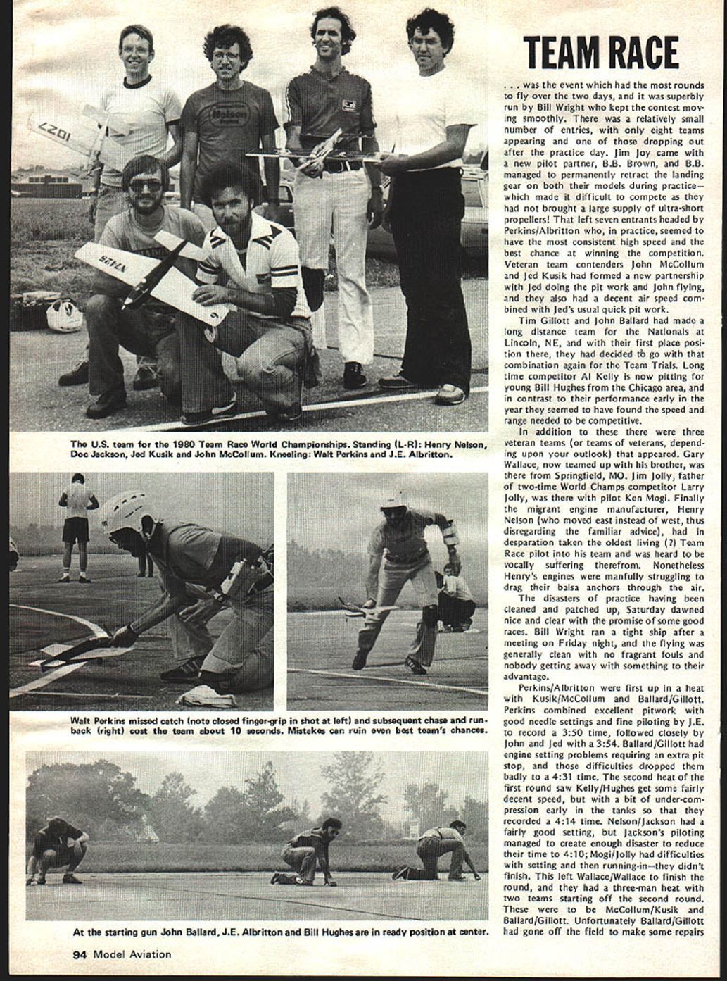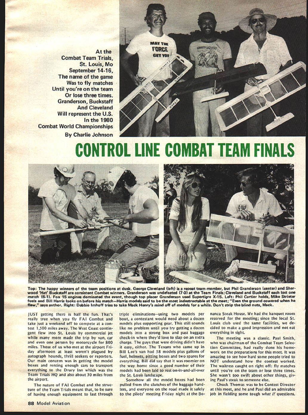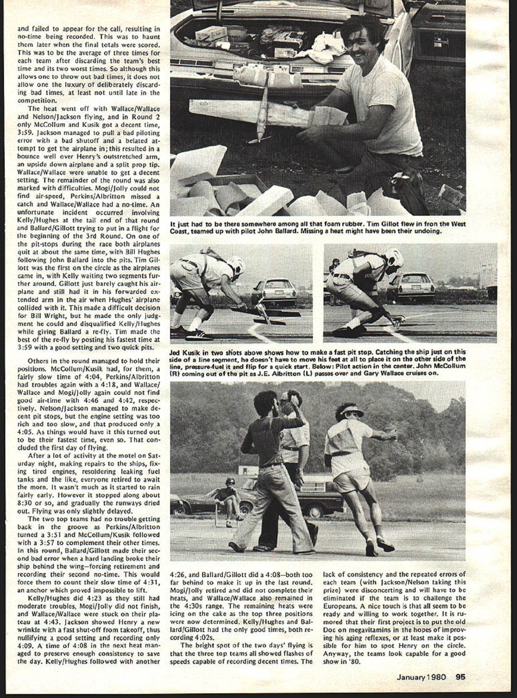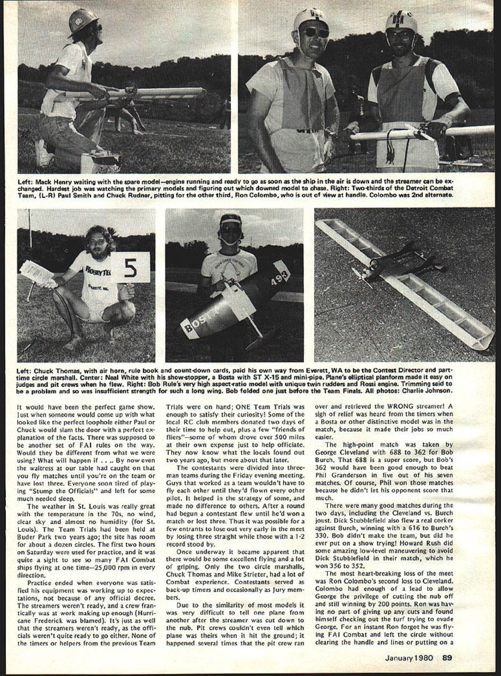 I NE WSLETTEIU ACADEMY OF MODEL AERONAUTICS 1980-81 AMA SCALE & GENERAL RULES charts next two page spread identify basically new changed Scale General rules will become effective January 1 1980 Similar charts pre sented last month Radio Control Control Line Free Flight items chart acceptable results column changes additions 197879 rules applicable 1980-81 feated wont new rule book cases description rules change very general its possible go back issues Model v/at ion CN section get specifics original Basic Pro posals Cross-Pro posals Cross Proposals identified capital letter fol lowing proposal number 66A stance first Cross-Proposal Basic Pro posal 66 Scale Basic Proposals 1978 sues dated October 1-5 November 6-13 December 14-67 Scale Cross-Proposals 1979 issues dated May June General Basic Proposal Decem ber 1978 issue Cross-Proposal May 1979 issue SCALE CB OKAYS BYRON PIUS other action Scale Contest Board has approved rewording builder-of-the-model rule clarification pertaining Scale denied protest se lection US Scale Teams Nats considered general protest conduct RC Sport Scale 1979 Nats Byron Originals Pitts Special vote 7 1 abstention favor ap peal Dean Copeland concerning disqualifi cation entry Sport Scale 1979 National Contest Nats disqualification reversed based protest Brian Crossley model did comply builder-of-the-model rules Builder-of-the-model Rule Rewording Noting protest mentioned above seemed based misunderstanding intent rule Scale Contest Board Chairman 815 FIFTEENTH STREET NW Claude McCullough proposed rewording rule applied Scale events fol lows Builder Model Contest Director shall make reasonable effort assure himself flier has completely con structed models uses competi tion including covering used construct interpreted action re quired complete model starting no prefabrication amount used usual kit Kits containing large amount pre-fabrication permissible long final assembly parts covering and/or painting done builder Mod els completely prefabricated re quire few minutes unskilled effort completion shall excluded competition US Scale Team Selection board voted 9 0 against protest Ted White seeking invalidate US Scale Team selection 1979 Nats due purported irregularities judging especially concerning scale im pression speed General RC Sport Scale Protest Although no immediate relief sought concerning ac tions already having taken place board considered protest LP Jensen concern ing competency judges purported im proper use scale impression speed pur ported improper actions Contest Direc tor purported improper viewing models static judges board felt validity some points raised Jensen White should con sidered future application Nats other contests RC IIM ENGINE MOOS BANNED Joe Friend Chairman RC Contest Board response request Duane Gall RCCB has ruled allow certain en gine modifications Quarter Midget Pylon Racing issues 1 excessive use metal shims produced manufac tuer between upper lower parts crankcase change timing 2 use RC engine parts cataloged use Free Flight/Speed version include insert-type head available stock RC en gines produced manufacturer vote disallow measures seven three WASHINGTON DC 20005 ELIGIBLE RC PYLON RACE ENGINES Joe Friend Chairman RC Contest Board April 3 1979 letter sent AMA HQ representing RC Contest Board several engine manufacturers import ers letter solicited identification engines meet rules criteria three AMA racing categories fol lowing lists obtained replies Formula II 05 40 R/C World Engines 05 40 FSR World Engines 05 40 SR World Engines ST X-40 World Engines ST G21/40 World Engines OPS 40 Shamrock Competition Imports HB 4ORC Bavarian Precision Products HB 40 PDP Bavarian Precision Products Fox 40 engines Fox Manufacturing Co HP 40F series Midwest Model Supply HP 40R series Midwest Model Supply Profi Polks Hobbies Inc Enya 40 Std Model Rectifier Corp Enya 40 TV Model Rectifier Corp Enya 40 XTV Model Rectifier Corp Webra 1034 RC Model Rectifier Corp Webra 1036 P pylon Model Rectifier Corp Quarter Midget 05 15 R/C World Engines ST X-15 World Engines ST G15 World Engines HB 15RC Bavarian Precision Products Moki Polks Hobbies Inc Enya 15 IV TV Model Rectifier Corp Fox 15RC Fox Manufacturing Co AA Pylon G-Mark Polks Hobbies Inc Previously published acceptable shown above following Formula I/Il K&B SR II 65cc Series 75 K&B 40 R/C 1972 1973 1974 models Testor/ McCoy 40 R/C Quarter Midget Cox Con quest 15 R/C Rossi 15 R/C Rossi 15 ABC K&B 15 R/C Taipan 15 R/C widely known K&B Manufactur ing Cox Hobbies manufacture engines addition listed eligible AMA racing however no reply received listing engines Manufacturers importers engines listed should contact AMA HQ immedi ately wish claim legalityrequire ments minimum quantity carburetion etc vary according event 84 Model Aviation -V RC QUARTER MIDGET IDLE RULE REVISED EFFECTIVE IMMEDIATELY Joe Friend Chairman RC Contest Board subject eliminating QM idle re quirement received extensive attention during recent rules change cycle Nine basic cross-proposals submitted issue After interim voting done single proposal RC-80-14B/23B Wayne Yeager remained addressing idle regulation Un fortunately proposal inappropriate limiting carburetor throat 205 excluded existing Cox-Perry carburetor Also exact wording suggested referred back RC-80-14 engine shutoff pro visions explicit Subsequently proposal defeated Final Voting leaving no satisfaction popular move ment eliminate idle rule response pleas Wayne Yeager Gail Jacobson find solution problem RCCB Chairman Joe Friend asked Yeager Jacobson confer other propose wording satisfying needs competitors saw also leaving intact safety measures lim itations affecting speed use pres ently acceptable equipment wording worked out Nats fol lows FREE FLIGHT CONTEST BOARD Section 40RC Pylon Racing Quarter Midget Delete Rule 16Idle requirement Under Rule 46Carburetor shall sup plied engine specifically cataloged engine Add R/C type Add new paragraph Landing Require mentPilot 