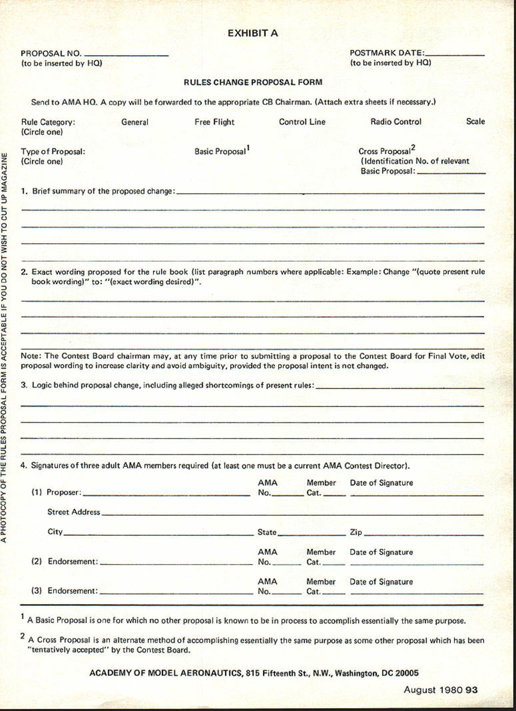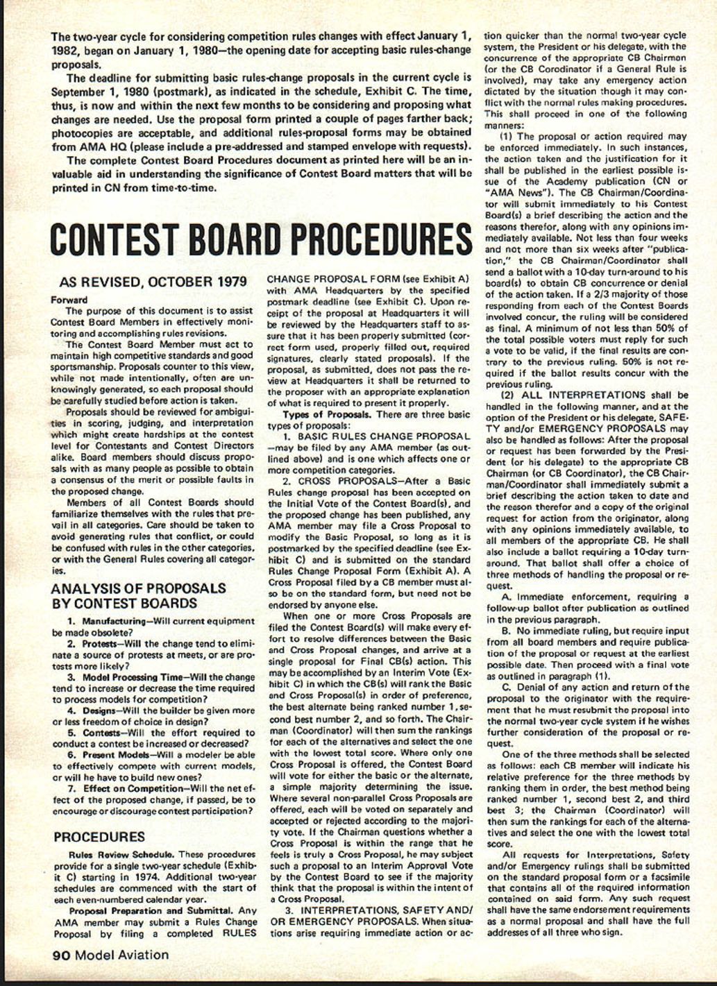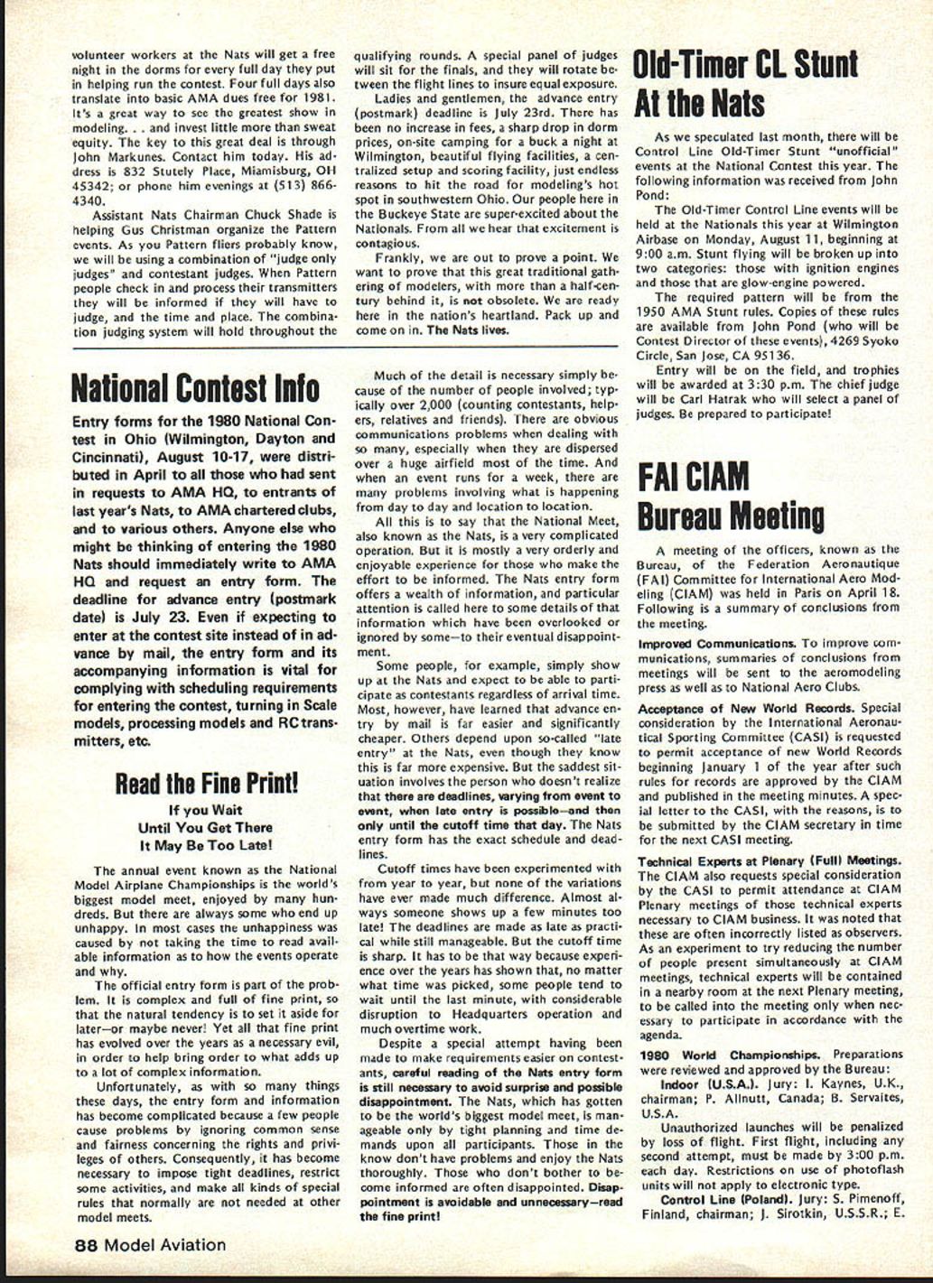 NC Aerobatics Team Selection Program Basic program selecting US Team 1981 World Champion ship overwhelmingly approvedfeatures three methods qualifying Team Finals time enter pro gram now vote 55 2 participants previous team selection program have ap proved new concept qualifying fliers RC Masters Team Selection Tournament US 1981 RC Aerobatics Team three fliers will chosen competitively Program Details qualify Team Selection Finals Masters Tournament competitor must accomplish following within qualification season March 1 through Octo ber31 1980 1 Finish upper one-third competi tors AMA sanctioned Masters class Pattern competition five competitors making official flights one-third o rounded next highest number Expert/Masters combined meets can use Masters competi tors determining number competitors placement qualification purposes 2 Participate minimum five contests Masters class competitor during qual ification season 3 Finish top one-half National Championships three previous team members Brown Radcl iff Koger automatically qualified next Team Finals must pay Qualifying Team Finals entry fees used determining num bers competitors placings sections 1 3 above unless inclusion benefitsthe competitors trying qualify Example Five competitors contest including above individuals above individual wins Counting above individual would allow second place man qualify second out five discounting entry would prevent second place man qualifying under section 1 first out four six competitors above individual won counted headcount plac ing above individual finished say third large meet may counted ahead him behind him Qualifying $1000 payable AMA HQ Attn Micheline Madison Upon payment entry fee proper qualifying affidavit will forwarded An individual may allowed count contest performance prior entering program provided entry fee accompanies decla ration Only AMA members have $5 FAI stamp may enter program Team Finals Fee Site Location will determined near future Program parti cipants will vote both issues subject variations depending manner location Team Finals oper ation Team Finals run past USPIA judges being paid expenses cost high will require substantial fee such last program Team Finals run great amount emphasis local judges judges available minimum no expense well mini mum administrative expenses Team Fi nals entry fee can reduced Program Background program developed proposed AMA RC Aerobatics Team Selection Committee chaired Dave Brown Other committee members Walter Damuck John Byrne Dave Burton Ron Chidgey Ralph White Jr Continued page 89 NMPRA Recom mendations Adopted Guidlines Radio Control Contest Board has vot ed adopt official AMA rules NMPRA Safety Recommendations RC Py Ion Racing Formula Quarter Midget required racing courses Sport Pylon Instead board has voted accept proposals recommendations rules applicable AMA Safety Code effect action NMPRA Safety Recommendations Sport Py Ion racing course requirements applic able AMA Safety Code commencing January 1 1980 emergency action AMA president RC Contest Board chair man cease applicable AMA Safety Code effective publication notice essentially July 1 1980 because ratified RC Contest Board except recommendations applicable Safety Code further background see February 1980 issue page 86 RC Contest Board has voted also modify NMPRA recommendations three instances 1 change wording 81 read pieces fuel-proof tubing 0-rings instead short pieces rubber tubing 2 remove 84 words accordance radio manufacturers recommenda tions 3 86 change Push-rods end s-bends need have keepers instead s-bends acceptable Nats Notes Dick Nutting Nats Publicity Promotion Nats lives As read entry deadline entry lowest cost will rapidly approaching As write mid-May organizational effort already paying off Lets get some hard information line about will running things modelings biggest show Radio Control arena under able leadership Dick Sonheim Betty Stream shapes up like As mentioned last month Pattern will run Gus Christman Rick Gerling will operating Racing events Gordon Pearson will up Wright-Patterson running RC Soaring Control Line category Bryant Thompson spent day site recently lay ing out circles Bev Wisniewski will helping him oversee events Speed will handled John Smith Lanny Shorts takes mamouth job running Stunt Paul Cur tis will keep Combat moving able Homer Smith said has Free Flight under control John Preston overall Scale honchowith Dale Arvin Mike Gretz Chuck Dial run ning RC Control Line Free Flight re spectively Thats team far just few slots firmed up discussion Headquarters few days ago produced information advance en tries big show running ahead normal firmly believe augurs well biggest Nats ever Thats what want gest exciting fun Frankly idea record num ber contestants great planes dozens events endless model talk er exciting have few changes arrange ments need clarified area on-site camping Laurel Oaks Vocational School putting special dump station accommodate self-contained units will providing marked reserved hardsurface parking spots return efforts asking dollar per unit per night Its free its close cant complain way Ohio group Nats Executive Committee have shared experiences dealing fine people Laurel Oaks Midwest Air Charter experiences have univer sally enjoyable Both organizations have gone out way cooperate us way Manpower Chairman John Markunes says AMA trailers Nats equipment being shipped Wilmington early Laurel Oaks Vocational School West ern Ohio Radio Kontrol Society will reno vating updating much operational equipment John also wants emphasize August 1980 87 ACADEMY OF MODEL AERONAUTICS815 FIFTEENTH STREET NW WASHINGTON DC 20005 volunteer workers Nats will get free night dorms full day put helping run contest Four full days also translate basic AMA dues free 1981 Its great way see greatest show modeling est little sweat equity key great deal through John Markunes Contact him today ad dress 832 Stutely Place Miamisburg OH 45342 phone him 