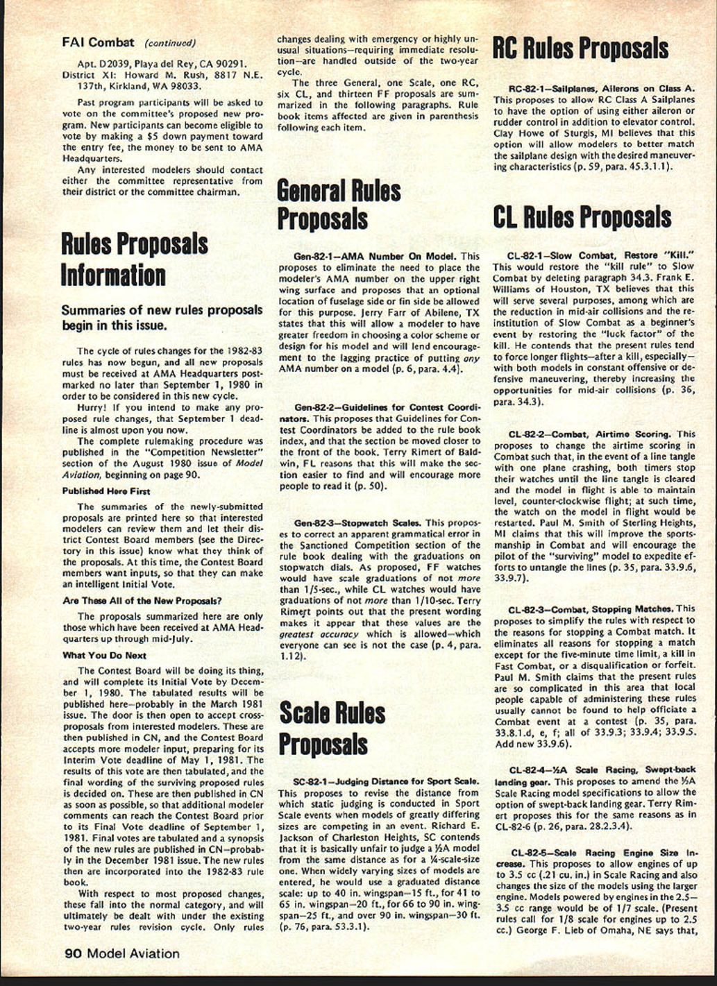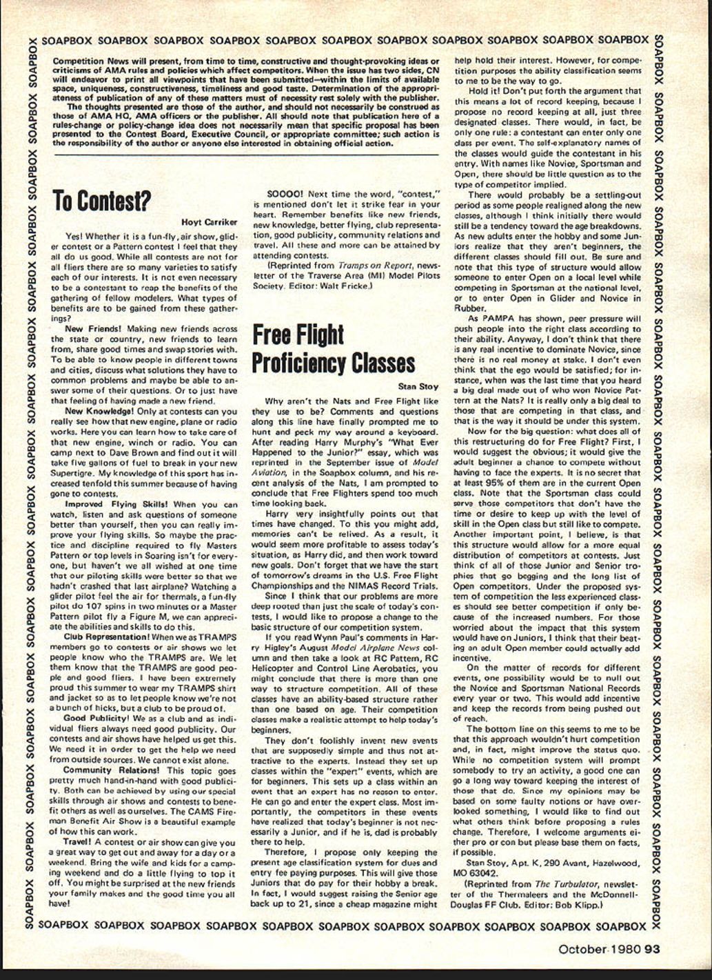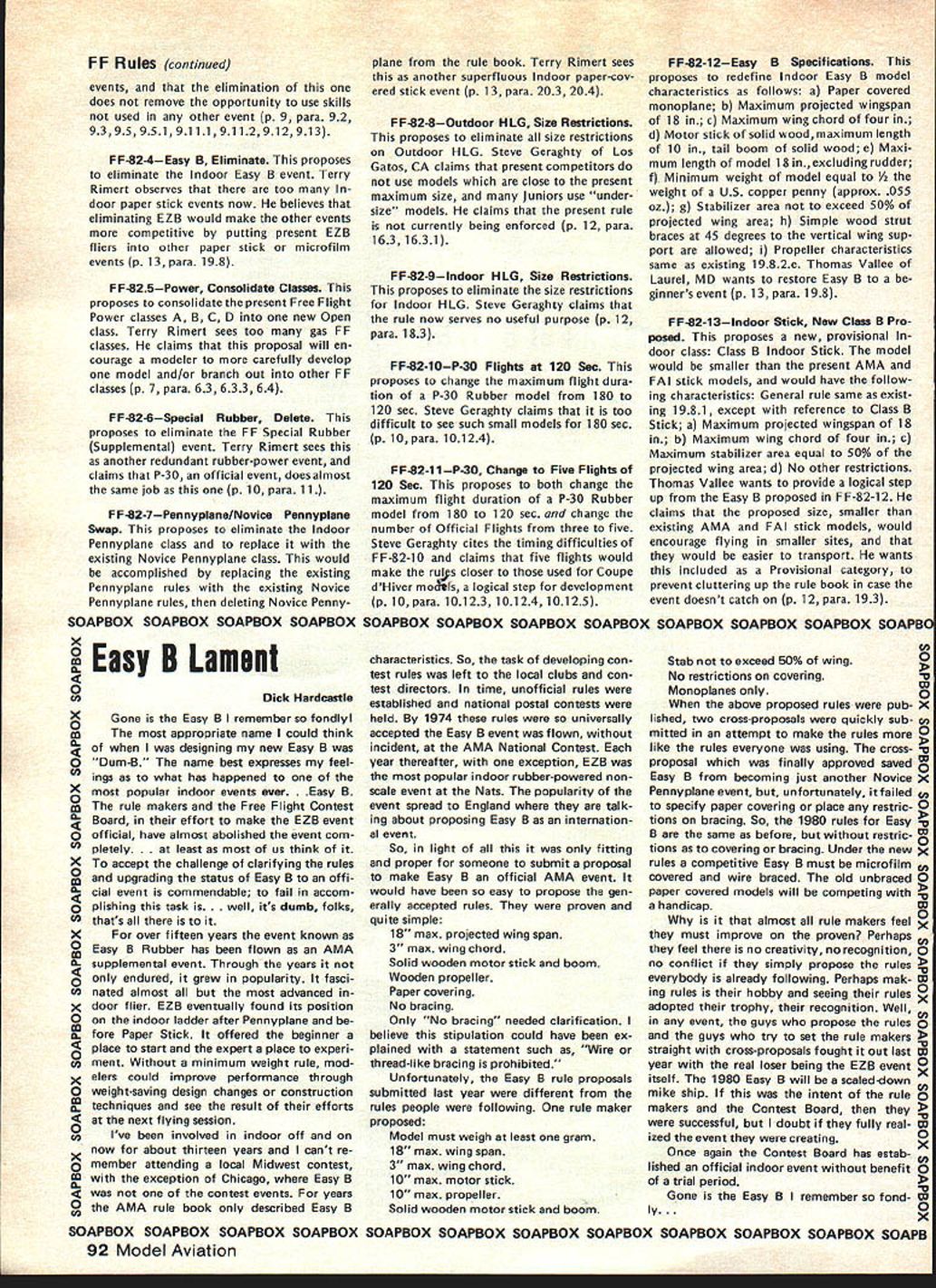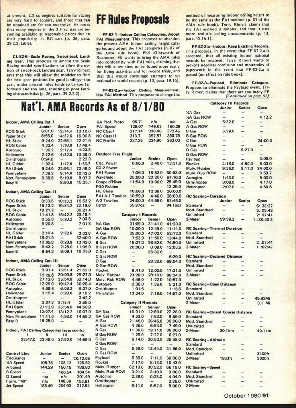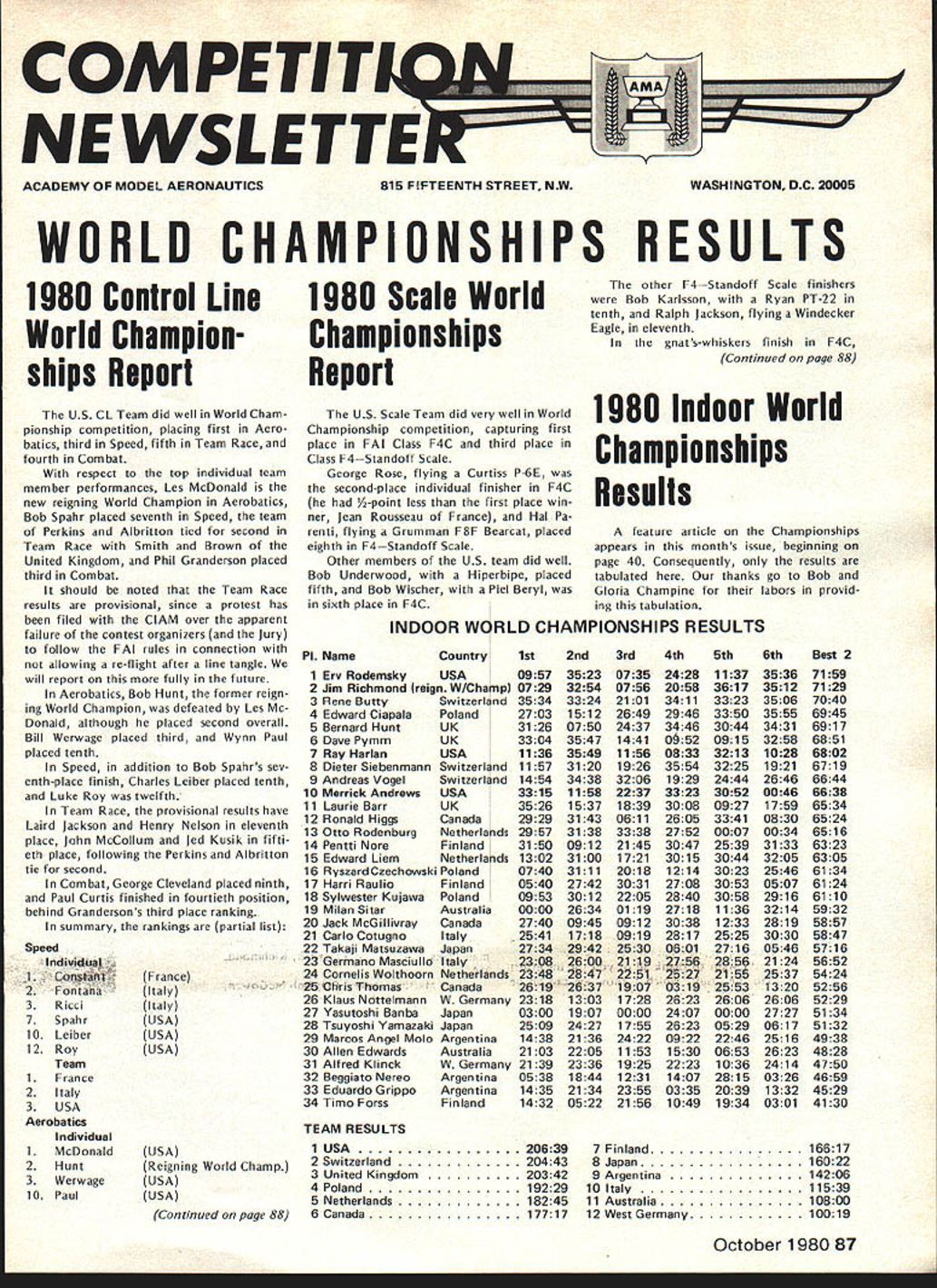 NEWSLET ACADEMY OF MODEL AERONAUTICS 815 FIFTEENTH STREET NW WASHINGTON DC 20005 WORLD CHAMPIONSHIPS RESULTS 1980 Control Line World Champion ships Report US CL Team did well World Cham pionship competition placing first Aero batics third Speed fifth Team Race fourth Combat respect top individual team member performances Les McDonald new reigning World Champion Aerobatics Bob Spahr placed seventh Speed team Perkins Aibritton tied second Team Race Smith Brown United Kingdom Phil Granderson placed third Combat should noted Team Race results provisional since protest has filed ClAM over apparent failure contest organizers Jury follow FAI rules connection allowing re-flight after line tangle will report fully future Aerobatics Bob Hunt former reign ing World Champion defeated Les Mc Donald although placed second overall Bill Werwage placed third Wynn Paul placed tenth Speed addition Bob Spahrs sev enth-place finish Charles Leiber placed tenth Luke Roy twelfths Team Race provisional results have Laird Jackson Henry Nelson eleventh place John MeCollum led Kusik fifti eth place following Perkins Aibritton tie second Combat George Cleveland placed ninth Paul Curtis finished fourtieth position behind Grandersons third place ranking summary rankings partial list Speed ndivi*J#J4~ 2 Fontana 3 Ricci 7 Spahr 10 Leiber 12 Roy Team 1 France 2 Italy 3 USA Aerobatics Individual 1 McDonald 2 Hunt 3 Werwage 10 Paul France Italy Italy USA USA USA 1980 Scale World Championships Report US Scale Team did very well World Championship competition capturing first place FAI Class F4C third place Class F4Standoff Scale George Rose flying Curtiss P-6E secondplace individual finisher F4C A-point less first place win ner Jean Rousseau France Hal Pa renti flying Grumman F8F Bearcat placed eighth F4Standoff Scale Other members US team did well Bob Underwood Hiperbipe placed fifth Bob Wischer Piel Beryl sixth place F4C other F4Standoff Scale finishers Bob Karlsson Ryan PT-22 tenth Ralph Jackson flying Windecker Eagle eleventh gnats-whiskers finish F4C Continued page 88 1980 Indoor World Championships Results teature t cle Championships appears months issue beginning page 40 Consequently results tabulated thanks go Bob Gloria Champine labors provid ing tabulation INDOOR WORLD CHAMPIONSHIPS RESULTS P1 NameCountry1st 1 Erv RodemskyUSA0957 2 Jim Richmond reign W/Champ 0729 3 Rene ButtySwitzerland 3534 2703 3126 3304 1136 1157 1454 3315 3526 2929 2957 3150 1302 0740 0540 0953 0000 2740 2541 4Edward CiapalaPoland SBernard HuntUK 6Dave PymmUK 7Ray HarlanUSA 8Dieter SiebenmannSwitzerland 9Andreas VogelSwitzerland 10Merrick AndrewsUSA 11Laurie BarrUK 12Ronald l-IiggsCanada 13Otto RodenburgNetherlands 14Pentti NoreFinland 15Edward LiemNetherlands 16 RyszardCzechowski Poland 17Harri RauliaFinland 18Sylwester KujawaPoland 19Milan SitarAustralia 20Jack McGillivrayCanada 21Carlo CotugnoItaly 22Takaji MatsuzawaJapan 23Germano MasciulloItaly 24 Cornelis Wolthoorn Netherlands 25Vris 1haniaCanada 26Klaus NottelmannIN Germany 27Yasutoshi BanbaJapan 28Tsuyoshi YamazakiJapan 29Marcos Angel MobArgentina 30Allen EdwardsAustralia 31Alfred KlinckW Germany 32Beggiato NereoArgentina 33Eduardo GrippoArgentina 34Timo ForssFinland 2nd 3rd 4th 5th 6th 352307352428 325407562058 332421013411 151226492946 075024373446 354714410952 354911560833 312019263554 343832061929 115822373323 153718393008 314306112605 313833382752 091221453047 310017213015 311120181214 274230312708 301222052840 263401192718 094509123038 171809192817 2734 294225300601 308 260021192756 2348 28472251 -2527 2619263719040319 2318130317282623 0300190700002407 2509242717552623 1438213624220922 2103220511531530 2139233619252223 0538184412311407 1435213423550335 1432052221561049 11373536 36173512 33233506 33503555 30443431 09153258 32131028 32251921 24442646 30520046 09271759 33410830 00070034 25393133 30443205 30232546 30530507 30582916 11363214 12332819 25253030 27160546 28SQ2124 21552537 1320 26062606 00002727 05290617 22462516 06532623 10362414 28150326 20391332 19340301 TEAM RESULTS USA Reigning World Champ USA USA Continued page 88 1 USA20639 2 Switzerland20443 3 United Kingdom20342 4 Poland19229 5 Netherlands18245 6Canada17717 7 Finland 8 Japan 9 Argentina 10 Italy 11 Australia 12 West Germany October 1980 87 Best 2 7159 7129 7040 6945 6917 6851 6802 6719 6644 6638 6534 6524 6516 6323 6305 6134 6124 6110 5932 5857 5847 5716 5652 5424 5256 5229 5134 5132 4938 4828 4750 4659 4529 4130 16617 16022 142 06 11539 10800 10019 CL Championships continued Team 1USA 2Japan 3Italy 5China Team Race Provisional Teams 1Geschwendtner Mau 2Perkins Aibritton Smith Brown 11Jackson Nelson 50MeCollum Kusik Team 1England UK 2Denmark 3Hungary 4USA Combat Individual 1Doroszienko 2Gysbertsen 3Granderson 9Cleveland 40Curtis Team 1USSR 2Holland 3Italy 4USA Denmark USA UK USA USA USSR Holland USA USA USA Scale Championships continued George Rose flew early final day appeared Certain champion ever late day Jean Rousseau put up superlative flight surpassing George total -point out total 50824 points become new World Champion partial summary results follows Class F4C Individual 1J Rousseau CAP 20 2 G Rose P-6E 3 M Reeves Spitfire 5 R Underwood Hiperbipe 6 R Wischer Piel Beryl Team 1 USA 2 UK 3 Canada Class F4Standoff Scale Individual 1 L Heimbro AT-6 Harvard 2 M Carison Pfalz D-1 2 3 G Smith Pomillio PE 8 H Parenti F8F 10 R Karisson PT22 11 R Jackson Windecker Eagle Team 1 Sweden 2 UK 3 USA France USA UK USA USA Sweden Sweden UK USA USA USA NC Sport Scale Scor lAg Interpretation question has arisen concerning exact meaning words two flights flown Section 5313 p 78 1980-81 AMA rule book Some modelers have interpreted refer contestant has made two flights contest having two rounds flying responding question Claude McCullough Scale Contest Board Chairman states intent rule refer number rounds completed con test will recommend change section next rules revision cycle wording will two rounds flown. Correction 1980-81 R