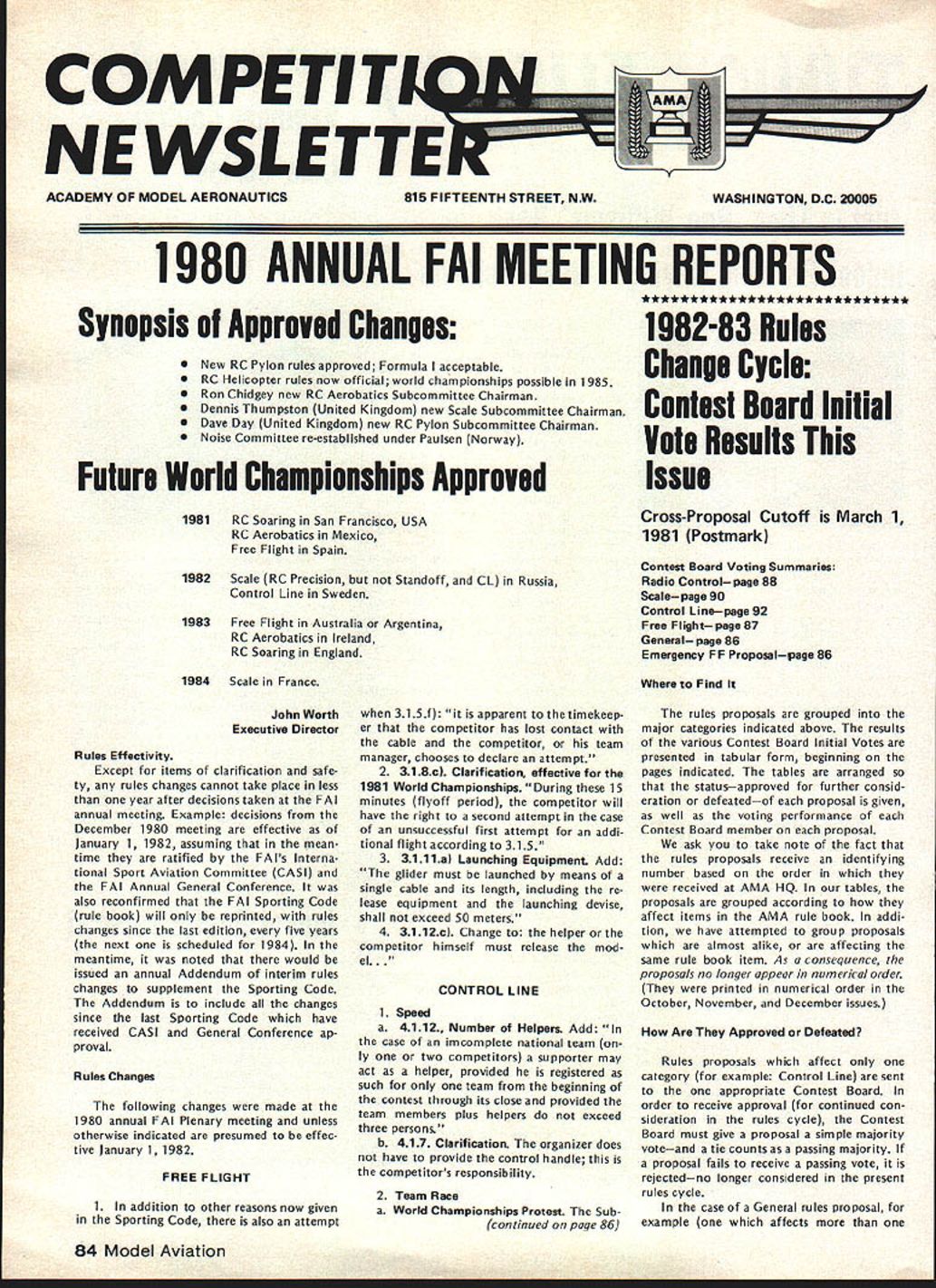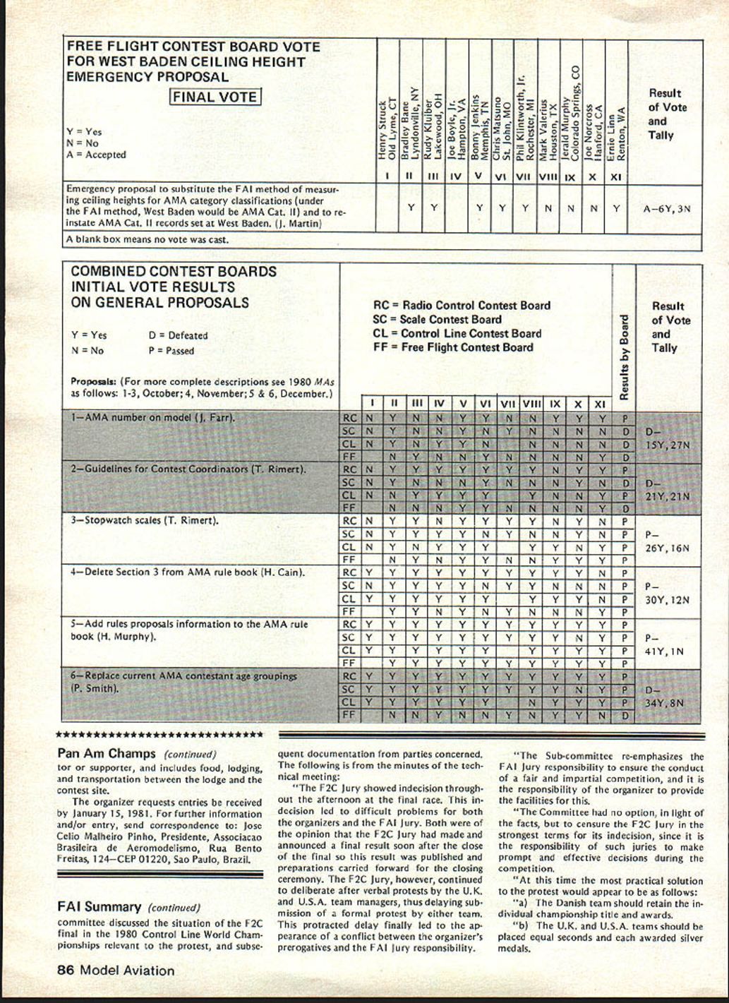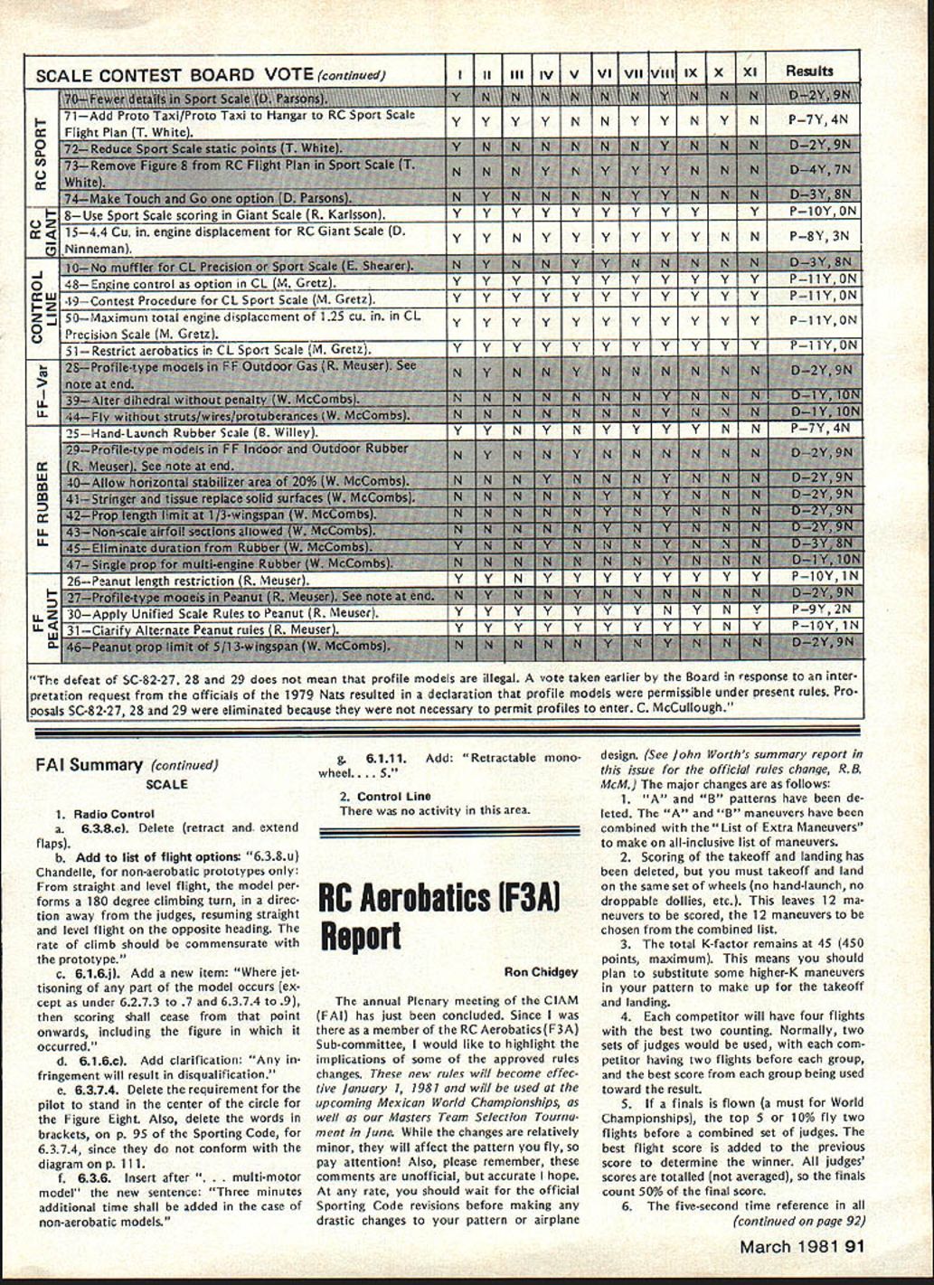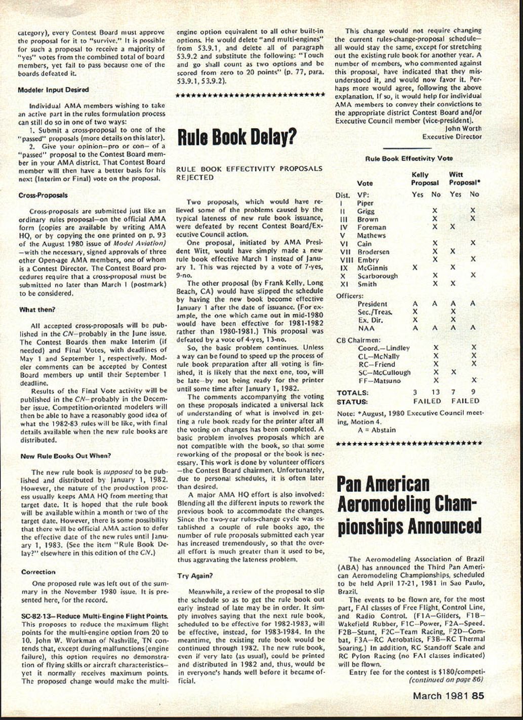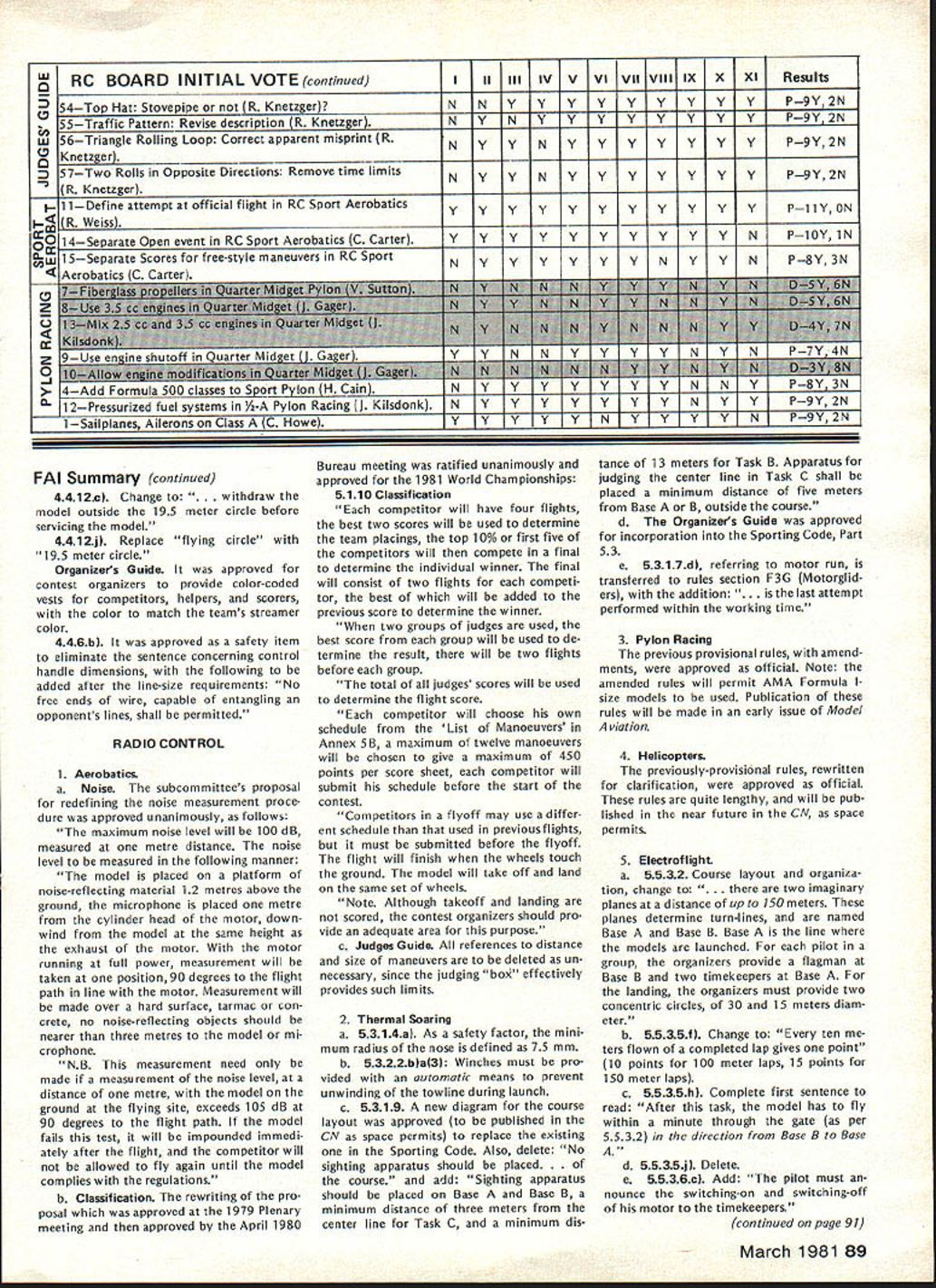 A WASHINGTON DC 20005 1980 ANNUAL FAI MEETING REPORTS Synopsis Approved Changes New RC Pylon rules approved Formula acceptable RC Helicopter rules now official world championships possible 1985 Ron Chidgey new RC Aerobatics Subcommittee Chairman Dennis Thumpston United Kingdom new Scale Subcommittee Chairman Dave Day United Kingdom new RC Pylon Subcommittee Chairman Noise Committee re-established under Paulsen Norway Future World Championships Approved 1981 RC Soaring San Francisco USA RC Aerobatics Mexico Free Flight Spain 1982 Scale RC Precision Standoff CL Russia Control Line Sweden 1983 Free Flight Australia Argentina RC Aerobatics Ireland RC Soaring England 1984 Scale France ** * * ** * * * * ** ** **** *** * 1982-83 Rules Change Cycle Contest Board Initial Vote Results Issue Cross-Proposal Cutoff March 1 1981 Postmark Contest Board Voting Summaries Radio Controlpage 88 Scalepage 90 Control Linepage 92 Free Flight page 87 General page 86 Emergency FF Proposalpage 86 Find John Worth Executive Director Rules Effectivity Except items clarification safe ty rules changes cannot take place less year after decisions taken FAI annual meeting Example decisions December 1980 meeting effective January 1 1982 assuming mean time ratified FAIs Interna tional Sport Aviation Committee CASI FAI Annual General Conference also reconfirmed FAI Sporting Code rule book will reprinted rules changes since last edition five years next scheduled 1984 meantime noted would issued annual Addendum interim rules changes supplement Sporting Code Addendum include changes since last Sporting Code have received CASI General Conference ap proval Rules Changes following changes made 1980 annual FAI Plenary meeting unless otherwise indicated presumed effec tive January 1 1982 FREE FLIGHT 1 addition other reasons now given Sporting Code also attempt 315f apparent timekeep er competitor has lost contact cable competitor team manager chooses declare attempt 2 318c Clarification effective 1981 World Championships During 15 minutes flyoff period competitor will have right second attempt case unsuccessful first attempt addi tional flight according 315 3 3111a Launching Equipment Add glider must launched means single cable its length including re lease equipment launching devise shall exceed 50 meters 4 3112c Change helper competitor himself must release mod CONTROL LINE 1 Speed a 4112 Number Helpers Add case imcomplete national team ly two competitors supporter may act helper provided registered such team beginning contest through its close provided team members plus helpers exceed three persons b 417 Clarification organizer does have provide control handle competitors responsibility 2 Team Race a World Championships Protest Subcontinued page 86 rules proposals grouped major categories indicated above results various Contest Board Initial Votes presented tabular form beginning pages indicated tables arranged statusapproved further consid eration defeatedof proposal given well voting performance Contest Board member proposal ask take note fact rules proposals receive identifying number based order received AMA HQ tables proposals grouped according affect items AMA rule book addi tion have attempted group proposals almost alike affecting same rule book item As consequence proposals no longer appear numerical order printed numerical order October November December issues Are Approved Defeated Rules proposals affect category example Control Line sent appropriate Contest Board order receive approval continued con sideration rules cycle Contest Board must give proposal simple majority voteand tie counts passing majority proposal fails receive passing vote rejectedno longer considered present rules cycle case General rules proposal example affects 84 Model Aviation ACADEMY OF MODEL AERONAUTICS815 FIFTEENTH STREET NW category Contest Board must approve proposal survive possible such proposal receive majority yes votes combined total board members yet fail pass because boards defeated Modeler Input Desired Individual AMA members wishing take active part rules formulation process can still two ways 1 Submit cross-proposal passed proposals details later 2 Give opinionpro con passed proposal Contest Board mem ber AMA district Contest Board member will have better basis next Interim Final vote proposal Cross-Proposals Cross-proposals submitted just like ordinary rules proposalon official AMA form copies available writing AMA HQ copying printed p 93 August 1980 issue Model Aviation necessary signed approvals three other Open-age AMA members Contest Director Contest Board pro cedures require cross-proposal must submitted no later March 1 postmark considered What accepted cross-proposals will pub lished CNprobably June issue Contest Boards make Interim needed Final Votes deadlines May 1 September 1 respectively Mod eler comments can accepted Contest Board members up until September 1 deadline Results Final Vote activity will published CN probably Decem ber issue Competition-oriented modelers will able have reasonably good idea what 1982-83 rules will like final details available new rule books distributed New Rule Books Out new rule book supposed pub lished distributed January 1 1982 However nature production proc ess usually keeps AMA HQ meeting target date hoped rule book will available within month two target date However some possibility will official AMA action defer effective date new rules until Janu ary 1 1983 See item Rule Book De lay elsewhere edition CN Correction proposed rule left out sum mary November 1980 issue pre sented record SC-82-13 Reduce Multi-Engine Flight Points proposes reduce maximum flight points multi-engine option 20 10 John W Workman Nashville TN con tends except during malfunctions engine failure option requires no demonstra tion flying skills aircraft characteristics yet normally receives maximum points proposed change would make multiengine option equivalent other built-in options would delete multi-engines 5