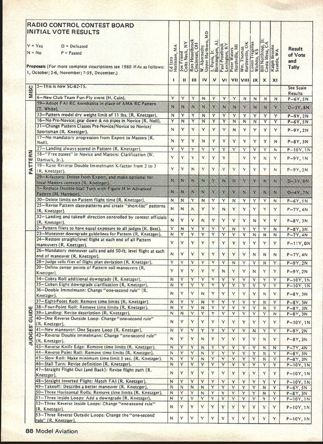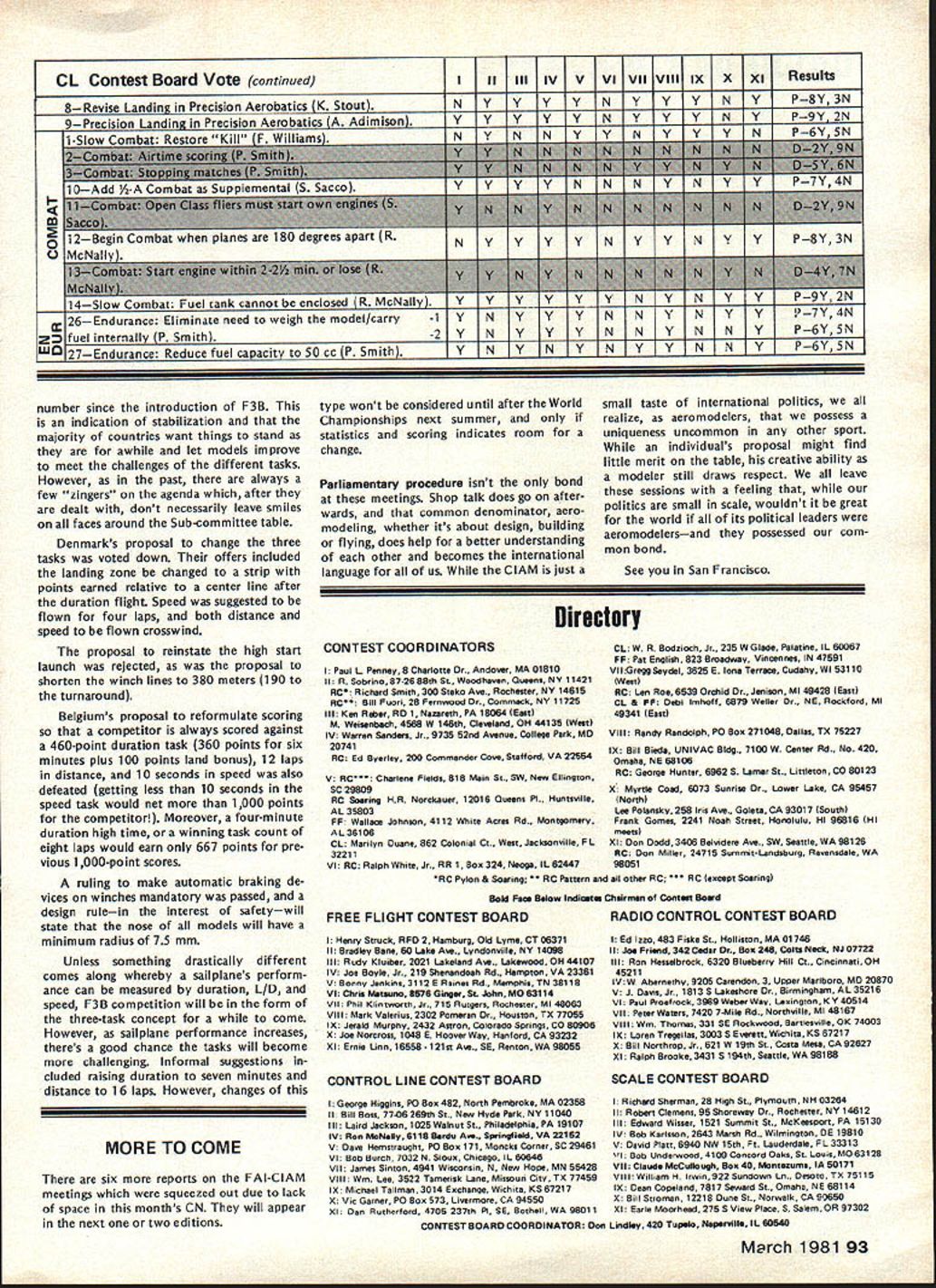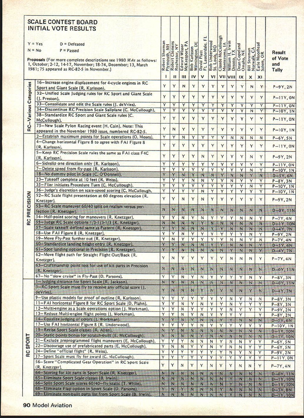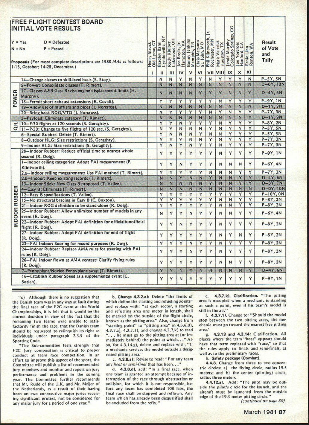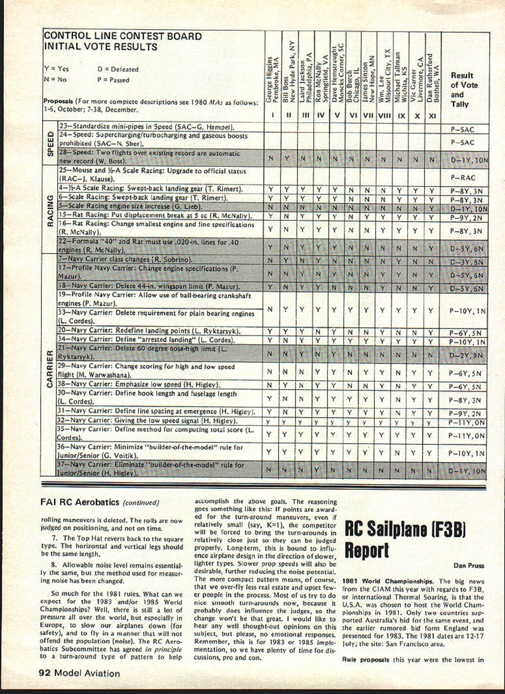 A WASHINGTON DC 20005 1980 ANNUAL FAI MEETING REPORTS Synopsis Approved Changes New RC Pylon rules approved Formula acceptable RC Helicopter rules now official world championships possible 1985 Ron Chidgey new RC Aerobatics Subcommittee Chairman Dennis Thumpston United Kingdom new Scale Subcommittee Chairman Dave Day United Kingdom new RC Pylon Subcommittee Chairman Noise Committee re-established under Paulsen Norway Future World Championships Approved 1981 RC Soaring San Francisco USA RC Aerobatics Mexico Free Flight Spain 1982 Scale RC Precision Standoff CL Russia Control Line Sweden 1983 Free Flight Australia Argentina RC Aerobatics Ireland RC Soaring England 1984 Scale France ** * * ** * * * * ** ** **** *** * 1982-83 Rules Change Cycle Contest Board Initial Vote Results Issue Cross-Proposal Cutoff March 1 1981 Postmark Contest Board Voting Summaries Radio Controlpage 88 Scalepage 90 Control Linepage 92 Free Flight page 87 General page 86 Emergency FF Proposalpage 86 Find John Worth Executive Director Rules Effectivity Except items clarification safe ty rules changes cannot take place less year after decisions taken FAI annual meeting Example decisions December 1980 meeting effective January 1 1982 assuming mean time ratified FAIs Interna tional Sport Aviation Committee CASI FAI Annual General Conference also reconfirmed FAI Sporting Code rule book will reprinted rules changes since last edition five years next scheduled 1984 meantime noted would issued annual Addendum interim rules changes supplement Sporting Code Addendum include changes since last Sporting Code have received CASI General Conference ap proval Rules Changes following changes made 1980 annual FAI Plenary meeting unless otherwise indicated presumed effec tive January 1 1982 FREE FLIGHT 1 addition other reasons now given Sporting Code also attempt 315f apparent timekeep er competitor has lost contact cable competitor team manager chooses declare attempt 2 318c Clarification effective 1981 World Championships During 15 minutes flyoff period competitor will have right second attempt case unsuccessful first attempt addi tional flight according 315 3 3111a Launching Equipment Add glider must launched means single cable its length including re lease equipment launching devise shall exceed 50 meters 4 3112c Change helper competitor himself must release mod CONTROL LINE 1 Speed a 4112 Number Helpers Add case imcomplete national team ly two competitors supporter may act helper provided registered such team beginning contest through its close provided team members plus helpers exceed three persons b 417 Clarification organizer does have provide control handle competitors responsibility 2 Team Race a World Championships Protest Subcontinued page 86 rules proposals grouped major categories indicated above results various Contest Board Initial Votes presented tabular form beginning pages indicated tables arranged statusapproved further consid eration defeatedof proposal given well voting performance Contest Board member proposal ask take note fact rules proposals receive identifying number based order received AMA HQ tables proposals grouped according affect items AMA rule book addi tion have attempted group proposals almost alike affecting same rule book item As consequence proposals no longer appear numerical order printed numerical order October November December issues Are Approved Defeated Rules proposals affect category example Control Line sent appropriate Contest Board order receive approval continued con sideration rules cycle Contest Board must give proposal simple majority voteand tie counts passing majority proposal fails receive passing vote rejectedno longer considered present rules cycle case General rules proposal example affects 84 Model Aviation ACADEMY OF MODEL AERONAUTICS815 FIFTEENTH STREET NW category Contest Board must approve proposal survive possible such proposal receive majority yes votes combined total board members yet fail pass because boards defeated Modeler Input Desired Individual AMA members wishing take active part rules formulation process can still two ways 1 Submit cross-proposal passed proposals details later 2 Give opinionpro con passed proposal Contest Board mem ber AMA district Contest Board member will have better basis next Interim Final vote proposal Cross-Proposals Cross-proposals submitted just like ordinary rules proposalon official AMA form copies available writing AMA HQ copying printed p 93 August 1980 issue Model Aviation necessary signed approvals three other Open-age AMA members Contest Director Contest Board pro cedures require cross-proposal must submitted no later March 1 postmark considered What accepted cross-proposals will pub lished CNprobably June issue Contest Boards make Interim needed Final Votes deadlines May 1 September 1 respectively Mod eler comments can accepted Contest Board members up until September 1 deadline Results Final Vote activity will published CN probably Decem ber issue Competition-oriented modelers will able have reasonably good idea what 1982-83 rules will like final details available new rule books distributed New Rule Books Out new rule book supposed pub lished distributed January 1 1982 However nature production proc ess usually keeps AMA HQ meeting target date hoped rule book will available within month two target date However some possibility will official AMA action defer effective date new rules until Janu ary 1 1983 See item Rule Book De lay elsewhere edition CN Correction proposed rule left out sum mary November 1980 issue pre sented record SC-82-13 Reduce Multi-Engine Flight Points proposes reduce maximum flight points multi-engine option 20 10 John W Workman Nashville TN con tends except during malfunctions engine failure option requires no demonstra tion flying skills aircraft characteristics yet normally receives maximum points proposed change would make multiengine option equivalent other built-in options would delete multi-engines 5