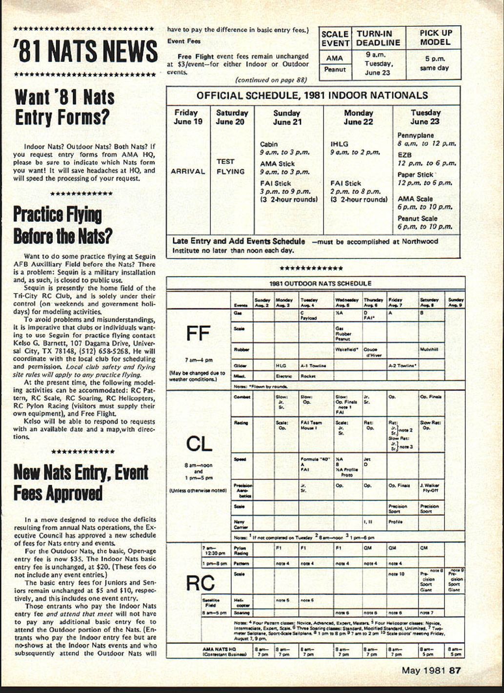 COM PETI TW NE WSLETTENX ACADEMY OF MODEL AERONAUTICS 815 FIFTEENTH STREET NW WASHINGTON DC 20005 World Champs Turn Selection 1981 NC Aerobatics Team Finals Sfte Selected overwhelming margin 1981 RC Aerobatics team Finals-qualifiers have voted hold Masters Tournament team selection Finals Huntsville AL weekend June 27-28 1981 Rocket City Radio Controllers Inc RCRC will hosts Tournament finalists also voted three operational planseach different entry feethey would accept Once again over whelming majority favored plan whereby RCRC would supply meet person nel including contest director judges entry fee will $50 1981 NC Aerobatics World Champs Date Sfte Changedi unprecedented move organizers 1981 RC Aerobatics World Champion ships have changed date site entry fee prestigious contest site now set Acapulco Mexico altitude 30 ft above sea level city lo cated Pacific west coast Mexico approximately 200 miles south Mexico City date Champs has now moved September 22-2 7 Tuesday through Saturday Entry fee previously proposed $350/contestant has increased $375 Since arrangements completely different ones approved FAIs ClAM last Decembers plenary meet ing will certainly source dis cussion next FAI meeting April Paris However such late date FAI will probably let changes stand could course disapprove possibly leading cancellation Champion shipsan unlikely event Actual site World Championships proposed Pie de Ia Cuesta Military Air Base located approximately 16 Km 10 miles north city Acapulco General News AMA Numbers New Era Coming growth AMA membership has en gendered new problem Running out AMA numbers present AMA numbers limited five digits means highest number can used 99999 theory should present problems until membership reaches fig ure practice trouble has arisen because numbers reserved current holder year after membership has expired usually occurs member does renew membership promptly year easy see membership now approaching 80000 mark doesnt take too late-renewers completely exhaust supply numbers available 1981 NC Soaring World Champ Housing Package Recent Executive Council action see AMA News section approved minutes January 31 1981 Council meeting published sometime future has resulted rescinding reserva tion policy AMA numbers effective March 31 1981 long-term solution problem may adoption alpha-numeric AMA numbers possibly going six-digit number Present direction Executive Council plans alpha-numeric sys tem developed immediately will publicity given development both AMA News Alaskan Mini-Nats AMA Exeuctive Council has approved three-day Mini-Nats Alaska 1981 meet will held Anchorage will first its kind actual dates events schedule have yet finalized lodging/meals package offered anyone interestedyou dont have World Champs competitor take advan tage Price Change Meals 1982 FAI CL Team Selection Hold 1981 Nats article 1981 RC World Cham pionships printed last months CN contained two errors concerning lodging/meals pack age being offered through AMA HQ First package includes six nights lodging five four days meals Second price package $275 $250 However price includes World Champs entry fee official ID/souvenir packet described below plus awards ban quet competitors dont want need total lodging/meals package basic entry fee $65 includes lunches flying site awards banquet plus ID required admission flying site official World Championships souvenir packet includes program book pin patch decal etc lodging/meals package includes ac commodations Sacramentos Red Lion Inn based double occupancy/two beds Other accommodation arrangements room three four room bed stead two will also offered vaying prices Speed Team Race Precision Aero batic teams 1982 World Championships will selected 1981 AMA Nationals Seguin TX decision made AMA President John Grigg order get key facts out potential contestants soon possibleso interested can make immediate plans attend 1981 Nats Team Race Speed will use special FAI team-selection events will held addition regular Nats events Two days flying event currently planned Monday Tuesday August 3-4 Precision Aerobatic team selection will use separate event will part regular AMA Nats event However flying points will countappearance points used FAI event other words AMA rules will used score flights appearance points will de ducted scores team continued page 88 86 Model Aviation -w *************************** have pay difference basic entry fees 81 NATS NEWS Event Fees Want 81 Nats Entry Forms Indoor Nats Outdoor Nats Both Nats request entry forms AMA HQ please sure indicate Nats form want will save headaches HQ will speed processing request Practice Flying Before Nats Want some practice flying Seguin AFB Auxilliary Field before Nats problem Sequin military installation such closed public use Sequin presently home field Tn-City RC Club solely under control weekends government holi days modeling activities avoid problems misunderstandings imperative clubs individuals want ing use Seguin practice flying contact Kelso G Barnett 107 Dagama Drive Univer sal City TX 78148 512 658-5268 will coordinate local club scheduling permission Local club safety flying site rules will apply practice flying present time following model ing activities can accommodated RC Pat tern RC Scale RC Soaring RC Helicopters RC Pylon Racing visitors must supply own equipment Free Flight Kelso will able respond requests available date mapwith direc tions * ** * * * ** * * * * New Mats Entry Event Fees Approved move designed reduce deficits resulting annual Nats operations Ex ecutive Council has approved new schedule fees Nats entry events Outdoor Nats basic Open-age entry fee now $35 Indoor Nats basic entry fee unchanged $20 fees include event entries basic entry fees Juniors Sen iors remain unchanged $5 $10 respec tively includes event entry entrants pay Indoor Nats entry fee attend meet will have pay additional basic entry fee attend Outdoor portion Nats En trants pay Indoor entry fee noshows Indoor Nats 