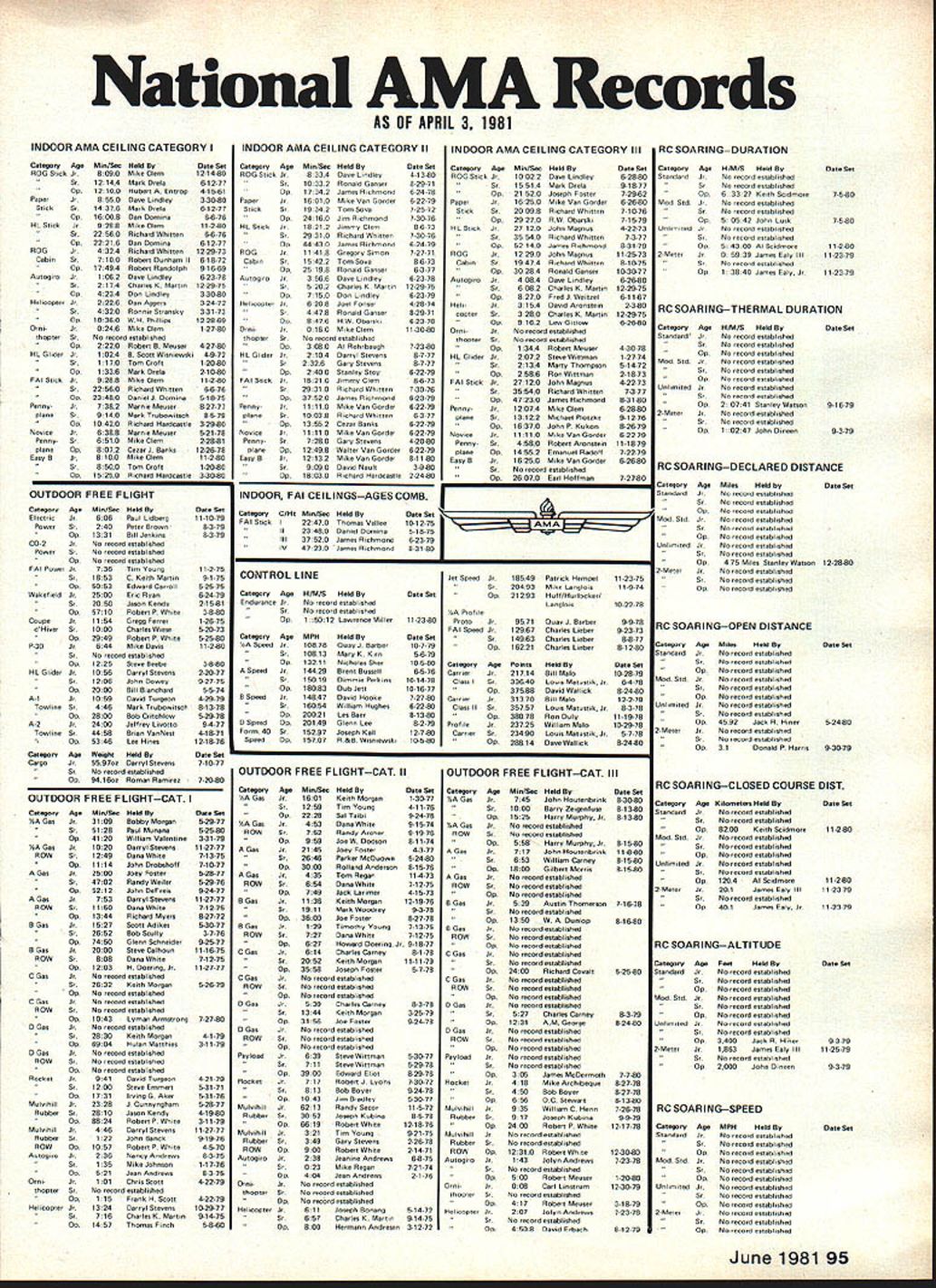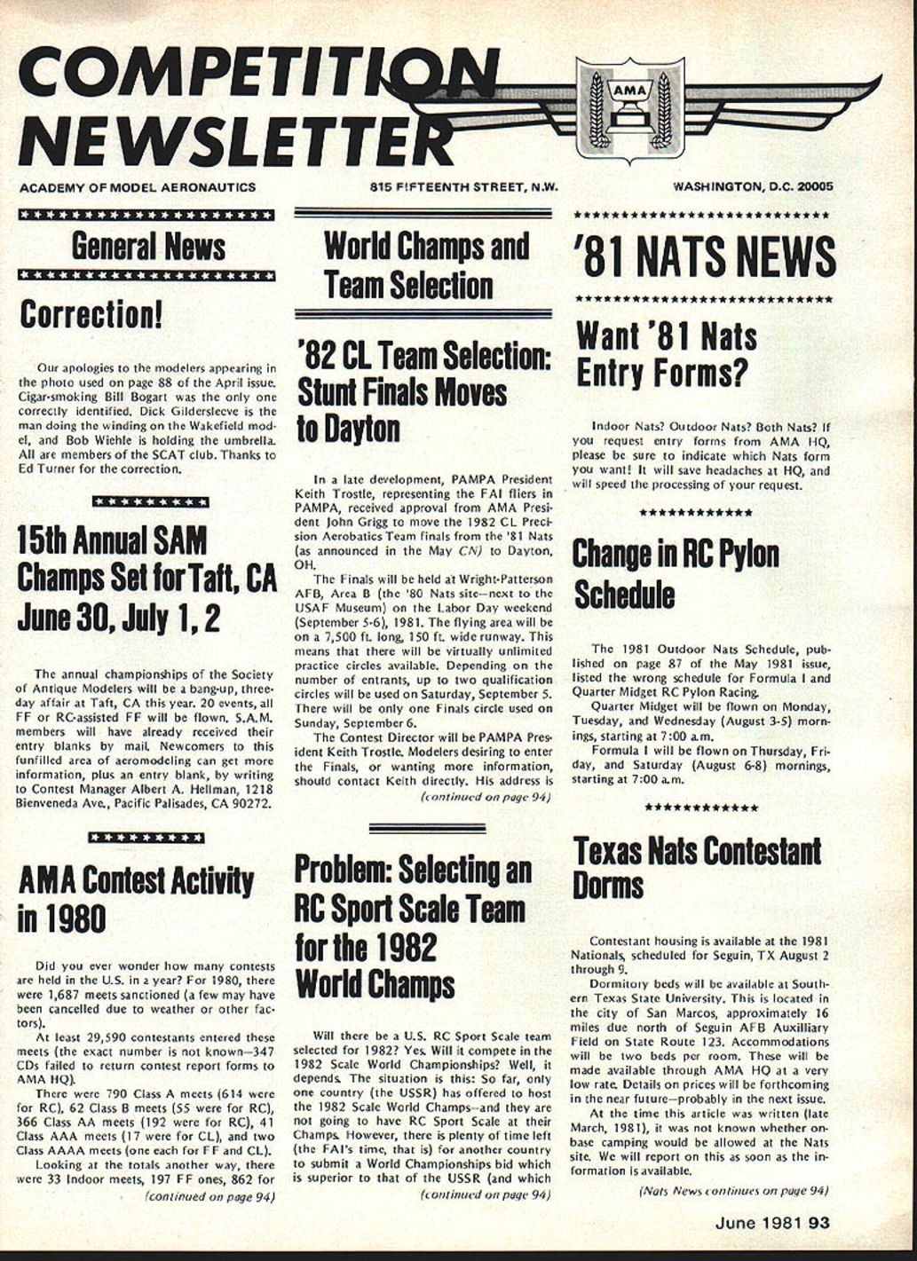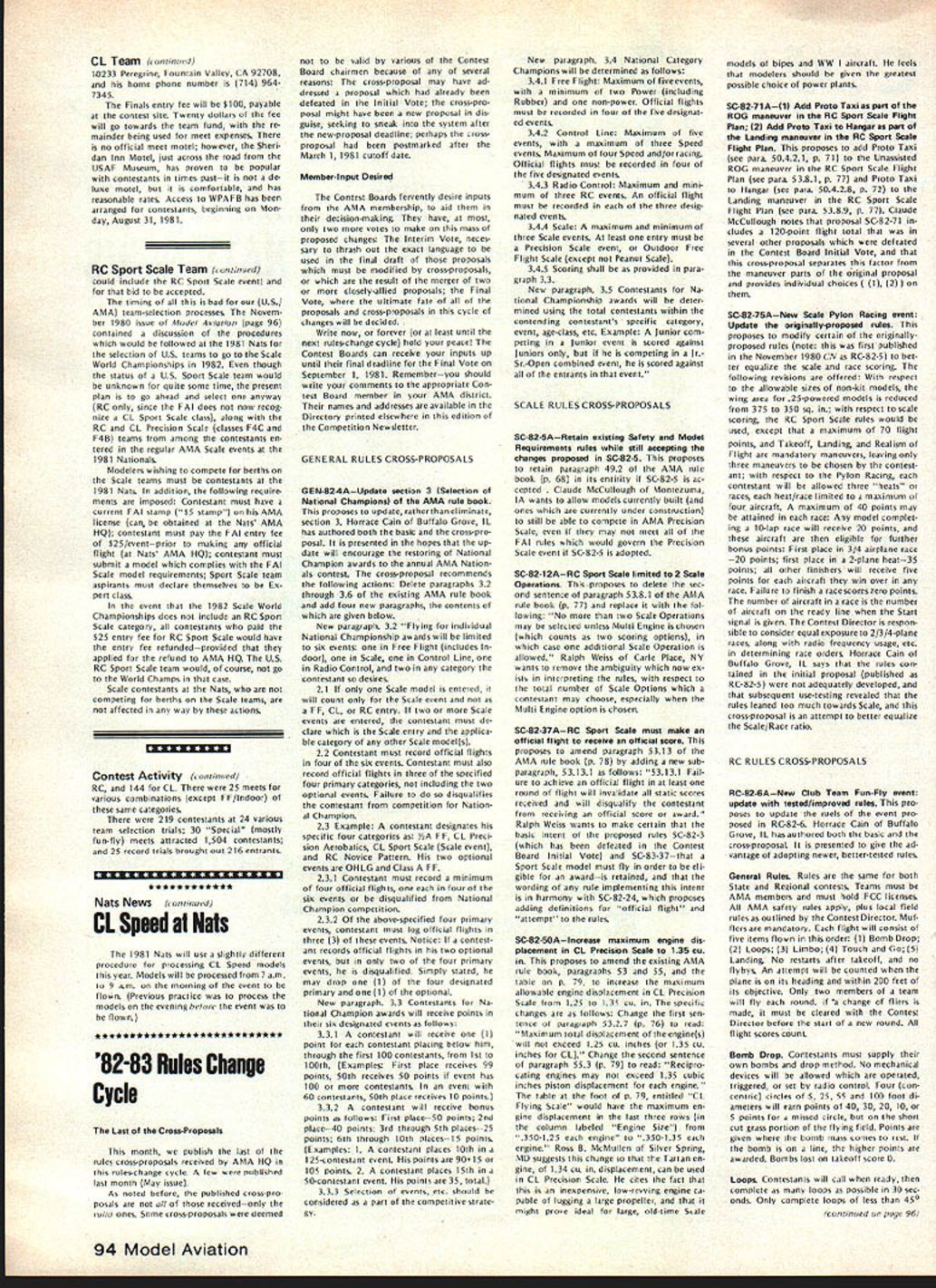 NE WSLE ACADEMY OF MODEL AERONAUTICS815 FIFTEENTH STREET NW * ***** * ** ** ** * **** ** *** General News Correction Ou apolog es modelers appearing photo used page 88 April issue Cigar-smoking Bill Bogart correctly identified Dick Gildersleeve man doing winding Wakefield mod el Bob Wiehie holding umbrella members SCAT club Thanks Ed Turner correction 15th Annual SAM Champs Set Taft CA June 30 July 12 annual championships Society Antique Modelers will bang-up threeday affair Taft CA year 20 events FF RC-assisted FF will flown SAM members will have already received entry blanks mail Newcomers funfilled area aeromodeling can get information plus entry blank writing Contest Manager Albert Hellman 1218 Bienveneda Ave Pacific Palisades CA 90272 World Champs Team Selection 81 NATS NEWS Want81 Nats 82 CL Team Selection Entry Forms Stunt Finals Moves Dayton late development PAMPA President Keith Trostle representing FAI fliers PAMPA received approval AMA Presi dent John Grigg move 1982 CL Preci sion Aerobatics Team finals 81 Nats announced May CN Dayton OH Finals will held Wright-Patterson AFB Area B 80 Nats sitenext USAF Museum Labor Day weekend September 5-6 1981 flying area will 7500 ft long 150 ft wide runway means will virtually unlimited practice circles available Depending number entrants up two qualification circles will used Saturday September 5 will Finals circle used Sunday September 6 Contest Director will PAMPA Pres ident Keith Trostle Modelers desiring enter Finals wanting information should contact Keith directly address continued page 94 Indoor Nats Outdoor Nats Both Nats request entry forms AMA l-IQ please sure indicate Nats form want will save headaches HQ will speed processing request Change NC Pylon Schedule 1981 Outdoor Nats Schedule pub lished page 87 May 1981 issue listed wrong schedule Formula Quarter Midget RC Pylon Racing Quarter Midget will flown Monday Tuesday Wednesday August 3-5 morn ings starting 700 am Formula will flown Thursday Fri day Saturday August 6-8 mornings starting 700 am 1980 Texas Nats Contestant AMA Contest Activity ProbIm Selecting Dorms NC Sport Scale Team 1982 World Champs Did ever wonder contests held US year 1980 1687 meets sanctioned few may have cancelled due weather other fac tors least 29590 contestants entered meets exact number known347 CDs failed return contest report forms AMA HQ 790 Class meets 614 RC 62 Class B meets 55 RC 366 Class AA meets 192 RC 41 Class AAA meets 17 CL two Class AAAA meets FF CL Looking totals another way 33 Indoor meets 197 FF ones 862 continued page 94 Will US RC Sport Scale team selected 1982 Yes Will compete 1982 Scale World Championships Well depends situation So far country USSR has offered host 1982 Scale World Champsand going have RC Sport Scale Champs However plenty time left FAIs time another country submit World Championships bid superior USSR continued page 94 Contestant housing available 1981 Nationals scheduled Segu TX August 2 through 9 Dormitory beds will available South ern Texas State University located city San Marcos approximately 16 miles due north Seguin AFB Auxilliary Field State Route 123 Accommodations will two beds per room will made available through AMA HQ very low rate Details prices will forthcoming near futureprobably next issue time article written late March 1981 known whether onbase camping would allowed Nats site will report soon formation available Nuts News ontinues page 94 June 1981 93 MA WASHINGTON DC 20005 CL Team ccsstin:rd 10233 Peregrine fountain Valley tA 92708 home phone number 714 9647345 Finals entry fee will 5100 payable contest site Twenty dollars fee will go towards team fued re mainder being used meet expenses oo official meet motel however Sheri dan Inn Motel just across road USAF Museam has proven no popular contestants times pastit de lone motel hut comfortable has reasonable rates Access WPAFB has arranged contestants beginning Mon day August 31 1981 RC Sport Scale Team fvrrlinved could include RC Sport Scale event hid hr accepted timing bad US AMA tram-selection processes Novem ber 1900 issue Mndel Aviutiver page 90 contained discussion procedures would followed 1981 Nuts selection US teams go Scale World Championships 1982 though status US Sport Scale team would unknown quite some time present plan go ahead aed select anyway RC since PAl does now recog nize CL Sport Scale class along BC aed CL Precision Scale classes F4C F4B teams among contestants en tered regular AMA Scale events 1981 Nationals Modelers wishing compete berths Scale teams must contestants rho 1981 Nuts addition following require ments imposed Contestant must have current FAI stamp OS stump AMA license can no obtained Nans AMA HQ cootostant must pay FAI entry fee $25eveneprior making official flight Nats AMA HQ contestant must submit model complies FAI Scale model requirements Sport Scale team aspirants must declare themselves Eupen class event 1982 Scale World Championships does include RC Sport Scale category contestants paid $25 entry fee RC Sport Scale would have entry fee refundndpeovided applied refund no AMA HQ US RC Sport Scale team would course go World Champs case Scale contestants Nuts competing Por berths Scale teams affected way actions Contest Activity urrrirrued} RC 144 CL 25 meets foe various combinations eucept FF/lodoor same categories 219 contestants 24 various team selection trials 38 Special mostly fun-fly meets attracted 1504 contestants 25 record trials brought out 216 entrants Nats News CL Speed Hats 1981 Nuts will use slightly different procedure processing CL Speed models year Models will processed 7am 9 am morning event flown Previous practice process models evening hsrsrr rho event waste flown * ** * * *** ** **** *** *** *** *** * 82-83 Rules Change Cycle Lust Croso-Proposals month publish last rules cross-proposals received AMA HO rules-change cyclo low published last motto May issue As noted before published cross-pro posals vii received--only s-lid ones Some cro