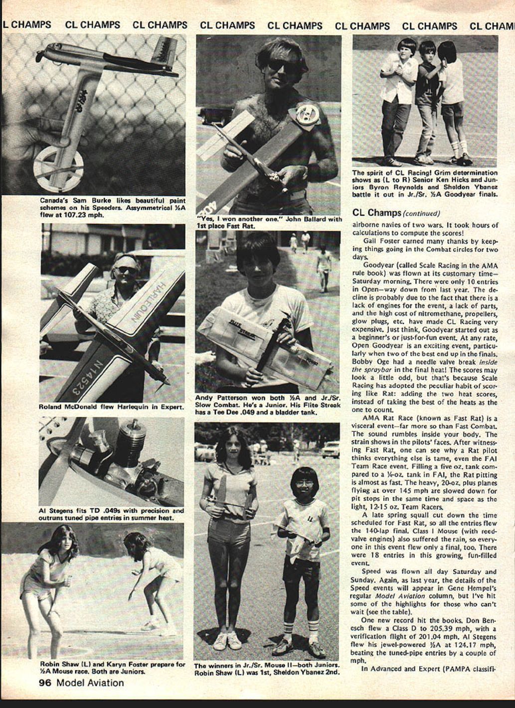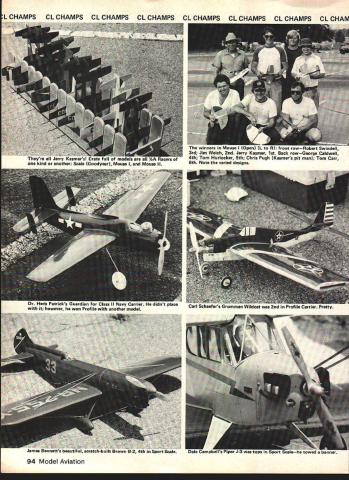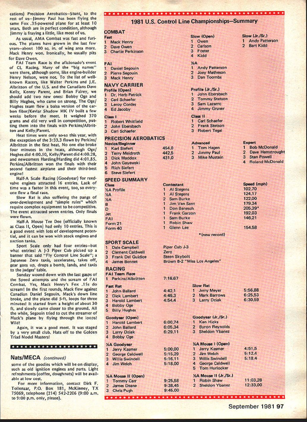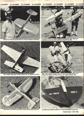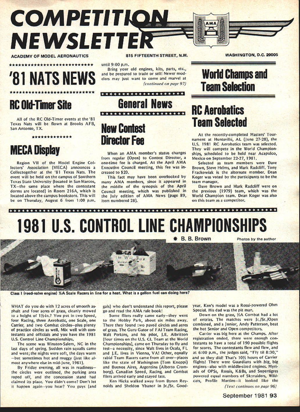 COM PETI TW" 8 NE WSLETTEREJff ACADEMY OF MODEL AERONAUTICS ** * ** * ** *** *** * 81 NATS NEWS NC OId{imer Sb RC Old-Timer events 81 Texas Nats will flown Brooks AFB San Antonio TX ** * * ** * * * MECA Display Region VII Model Engine Col lectors Association MECA announces Collectogether 81 Texas Nats event will held campus Southern Texas State University located San Marcos TXthe same place contestant dorms located Room 216A located above campus bookstore will Thursday August 6 100 pm 815 FIFTEENTH STREET NW until 900 pm Bring old engines kits parts etc prepared trade sell Newer mod elers may just want come marvel continued page 97 General News New Contest Director Fm AMA members status changes regular Open Contest Director one-time fee charged April AMA Executive Council meeting fee creased $20 fact may have overlooked AMA members since appeared middle synopsis April Council meeting published July edition AMA News page 89 item numbered 28 WASHINGTON DC 20005 World Champs Team Selection NC Aerobatics Team Selected recently completed Masters Tour nament Huntsville AL June 27-28 US 1981 RC Aerobatics team selected will compete World Champion ships scheduled held near Acapulco Mexico September 22-27 1981 Selected team members Dave Brown Steve Helms Mark Radcliff Tony Frackowiak alternate member Dean Koger voted participants team manager Dave Brown Mark Radeliff previous 1979 team World Champion team Dean Koger also team competitor 1981 US CONTROL LINE CHAMPIONSHIPS WHAT 12 acres smooth phalt four acres grass cleanly mowed height PA-in put two Speed four Racing three Aerobatic Scale Carrier two Combat circlesplus plenty practice circles well Mix well con testants officials have 1981 US Control Line Championships scene Winston-Salem NC last days spring Sudden rain squalls came went nights soft days warm sometimes hot muggy just like al anywhere else mid-June 1981 Friday evening readiness circles outlined parking area roped off concession stand claimed its place didnt come Dont let happen againyou hear guys gals dont understand report please go read AMA rule book Some fliers really came earlythey went Hobby Park about six miles away found two paved circles acres grass Guru Gator FAI Team Racing Walt Perkins pilot IE Aibritton four times US CL Team World Championships came Thursday fly testa necessity since Walt lives Ocala FL JE lives Vienna VA Other equally rabid Team Racers came overplaces like state Washington Tom Knoppi Buenos Aires Argentina Alberto Crom borg Canadian Speed Racing Combat fliers arrived early stayed late Ken Hicks walked away Byron Rey nolds Sheldon Ybanez Jr/Sr Goodyear Kens model Rossi-powered Ohm Special dad pit man Down grass 1AA Combat lot entries matches Jr/Sr/Open combined Junior Andy Patterson beat hot Senior Open competitors Carrier big Champs After registration ended enough con testants have total 190 possible flights scores contestants flew flew 600 pm judges said Fly til 830 did Thats 10 hours Carrier flights Guardians big big engines--also middle-sized engines Myri ads OPSs Rossis K&Bs Supertigres powered equal numbers Skyraiders Wild cats Profile Martinsit looked like Text continues page 96 September 1981 93 L L CHAMPSCL CHAMPS n TarCarrier however no won Irofile another model apt a,.ac ..iiipb CLCHAM CL CHAMPS CL CHAMPS 94 Model Aviation ne winners inTrons row- ber1II 3rd Jim Welch ena Jerry Kasmer 1st Back rowUeorge Caidwell 4th Tom 1-lurlocker 5th Chris Pugh Kasmers pit man Tom Carr 6th Note varied designs LCHAMPS CL CHAMPS CL CHAMPS CL CHAMPS CL CHAMPS CL CHAMPS CL CHAMPS CL CHAMJ flu 05ht iari.y JtIIOtJ 1J kneeling 1st sons Rich Steve placed 5th 6th Open Slow Combat winners LtofrontOwen 1st Carlson 2nd Back rowWayne Foster 3rd Billy Kidd/ 4th hO Jim Welch has different idea Formula 40 Speeder should look September 1981 95 LCHAMPS CL CHAMPS CL CHAMPS CL CHAMPS CL CHAMPS CL CHAMPS CL CHAMPS CICHAMI 4* CL Champs continued airborne navies two wars took hours calculations compute scores Gail Foster earned thanks keep ing things going Combat circles two days Goodyear called Scale Racing AMA rule book flown its customary time Saturday morning 10 entries Openway down last year de cline probably due fact lack engines event lack parts high cost nitromethane propellers glow plugs etc have made CL Racing very expensive just think Goodyear started out beginners just-for-fun event rate Open Goodyear exciting event particu larly two best end up finals Bobby Oge needle valve break inside spraybar final heat scores may look little odd thats because Scale Racing has adopted peculiar habit scor ing like Rat adding two heat scores instead taking best heats count AMA Rat Race known Fast Rat visceral eventfar Fast Combat sound rumbles inside body strain shows pilots faces After witness ing Fast Rat can see Rat pilot thinks everything else tame FAI Team Race event Filling five oz tank com pared /4-oz tank FAI Rat pitting almost fast heavy 20-oz plus planes flying over 145 mph slowed down pit stops same time space light 12-15 oz Team Racers late spring squall cut down time scheduled Fast Rat entries flew 140-lap final Class Mouse reedvalve engines also suffered rain event flew final too 18 entries growing fun-filled event Speed flown day Saturday Sunday Again last year details Speed events will appear Gene Hem pels regular Model Aviation column Ive hit some highlights cant wait see table new record hit books Don Ben esch flew Class D 20539 mph verification flight 20104 mph Al Stegens flew jewel-powered /2A 12417 mph beating tuned-pipe entries couple mph Advanced Expert PAMPA classifi 96 Model Aviation Lanaaas am beautitul schemes SpeederL Assynimetricat flew 10723 mph ne spirIt 0 LL Hacingl Grim aetermination shows L RI Senior Ken Hicks Jun iors Byron Reynolds Sheldon Ybanez battle out Jr/Sr Y2A Goodyear finals I Robin Shaw LI Karyn Foster prepare AA Mouse race Both Juniors cations Precision AerobaticsStunt rest usJimmy Paul has flying same Fox 35-powered plane least 10 years B