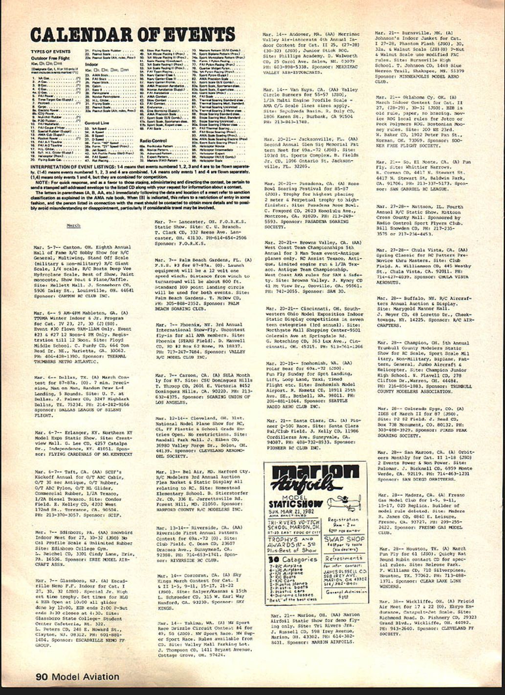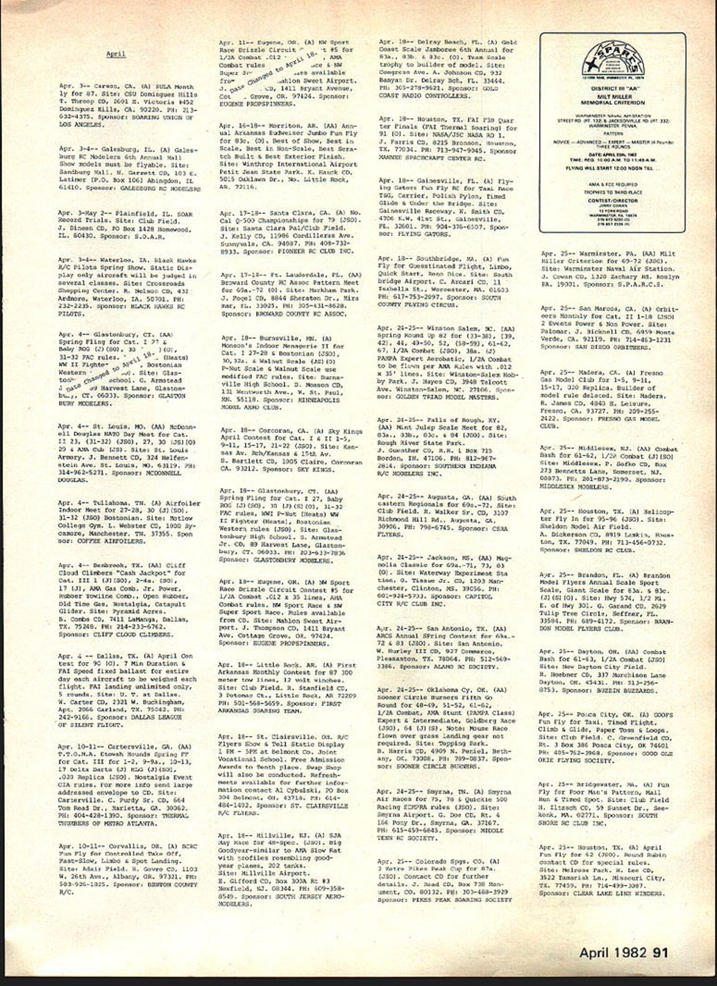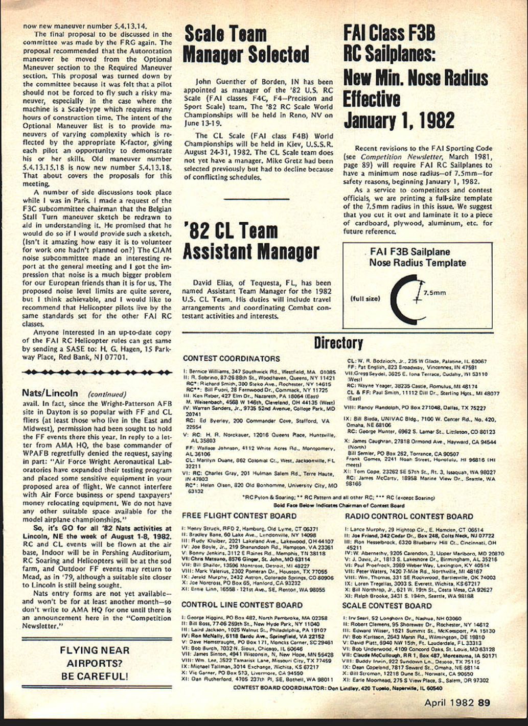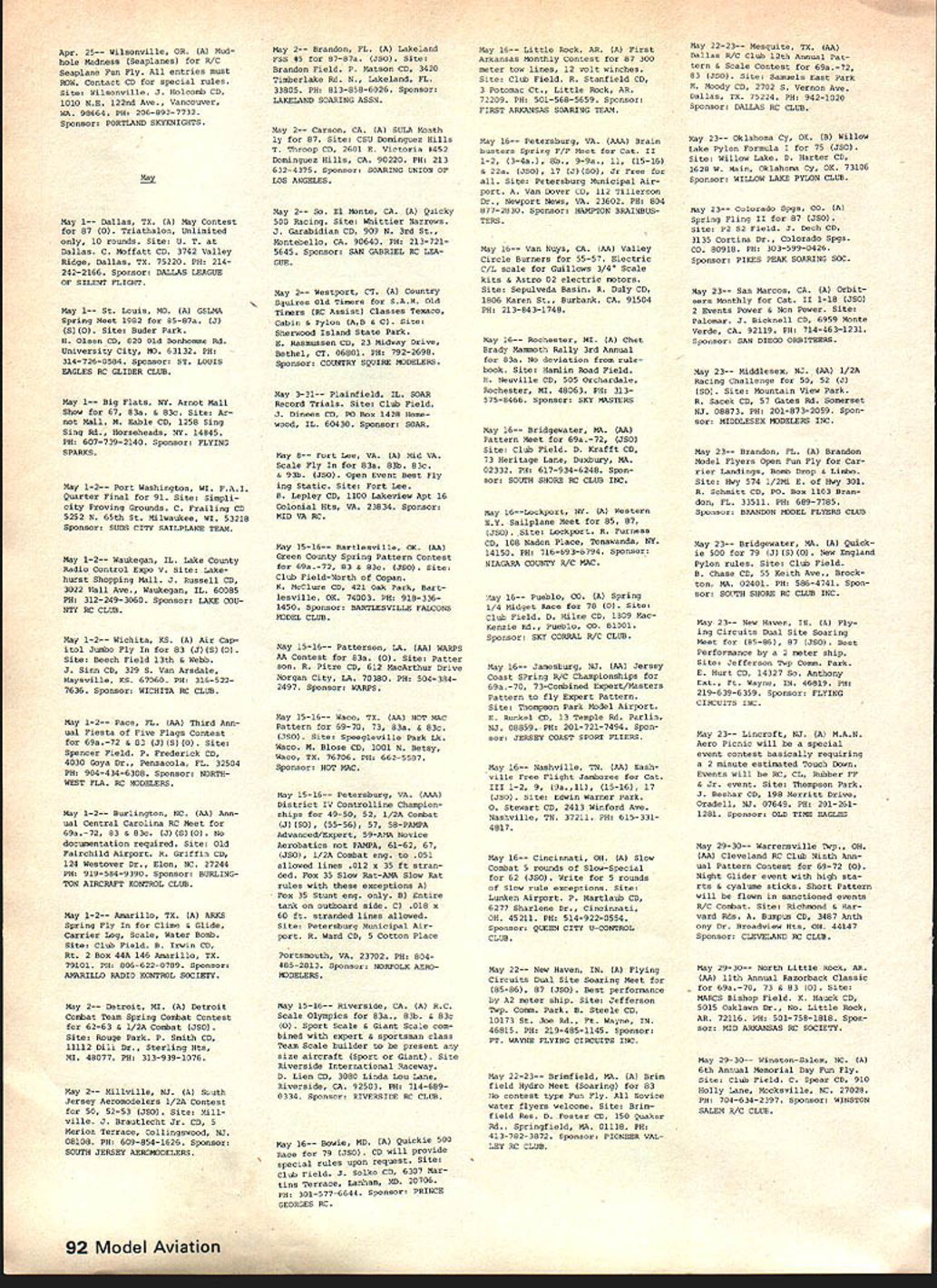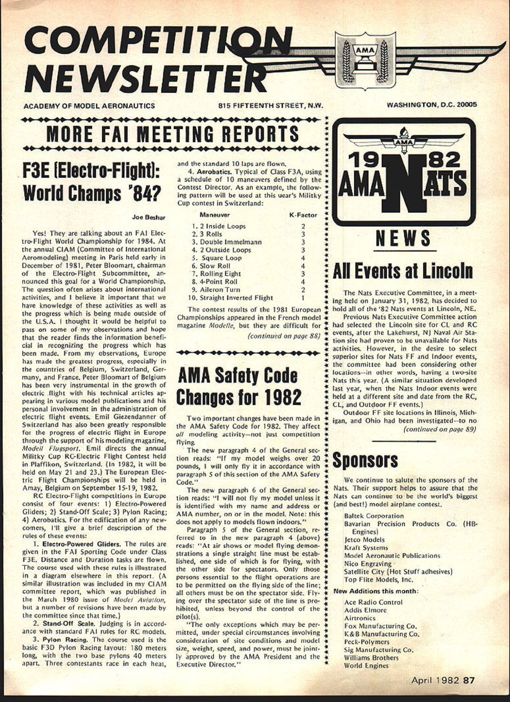 NE WSLETTE ACADEMY OF MODEL AERONAUTICS 815 FIFTEENTH STREET NW WASHINGTON DC 20005 MORE FAI MEETING REPORTS F3E lElectro-Flighti World Champs 84 Joe Beshar Yes talking about FAI Elec tro-Flight World Championship 1 984 annual ClAM Committee International Aeromodeling meeting Paris held early December 1981 Peter Bloomart chairman Electro-Flight Subcommittee nounced goal World Championship question often arises about international activities believe important have knowledge activities well progress being made outside USA thought would helpful pass some observations hope reader finds information benefi cial recognizing progress has made observations Europe has made greatest progress especially countries Belgium Switzerland Ger France Peter Bloomart Belgium has very instrumental growth electric flight technical articles ap pearing various model publications personal involvement administration electric flight events Emil Giezendanner Switzerland has also greatly responsible progress electric flight Europe through support modeling magazine Mode/I Flugsport Emil directs annual Militky Cup RC-Electric Flight Contest held Plaffikon Switzerland 1982 will held May 21 23 European Elec tric Flight Championships will held Amay Belgium September 15-19 1982 RC Electro-Flight competitions Europe consist four events 1 Electro-Powered Gliders 2 Stand-Off Scale 3 Pylon Racing 4 Aerobatics edification new comers Ill give brief description rules events 1 Electro-Powered Gliders rules given FAI Sporting Code under Class F3E Distance Duration tasks flown course used rules illustrated diagram elsewhere report similar illustration included ClAM committee report published March 1980 issue Model v/at/on number revisions have made committee since time 2 Stand-Off Scale Judging accord ance standard FAI rules RC models 3 Pylon Racing course used basic F3D Pylon Racing layout 180 meters long two base pylons 40 meters apart Three contestants race heat 12 Inside Loops 2 3 Rolls 3 Double lmmelmann 4 2 Outside Loops S Square Loop 6 Slow Roll 7 Rolling Eight 8 4-Point Roll 9 Aileron Turn 10 Straight Inverted Flight AMA Safety Code Changes 1982 Events Lincoln L KE U U U standard 10 laps flown 4 Aerobatics Typical Class F3A using dule 10 maneuvers defined K Contest Director As example follow- K ing pattern will used uears Militky contest Switzerland 4 4 ManeuverK-Factor 3 3_____ 3 4 4 K 4 2KThe Nats Executive Committee meet K 1-K ing held January 31 1982 has decided fhe contest results 1981 European 82 Nats events Lincoln NE Championships appeared French model K Previous Nats Executive Committee action magazine Mode//c difficult selected Lincoln site CL RC continued page 88 events after Lakehurst NJ Naval Air Sta K tion site proven unavailable Nats •• K activities However desire select superior sites Nats FF Indoor events committee considering other K locationsin other words having two-site -K -K Nats year similar situation developed K last year Nats Indoor events K K held different site date RC CL Outdoor FF events -K Outdoor FF site locations Illinois Mich Two important changes have made Ohio investigatedto no AMA Safety Code 1982 affect modeling activitynot just competition K continued page 89 -K flying new paragraph 4 General sec- K tion reads model weighs over 20 5 ponso rs pounds will fly accordance K paragraph 5 section AMA Safety -K continue salute sponsors new paragraph 6 General see- support helps assure tion reads will fly model unless -K Nats can continue worlds biggest identified name address best model airplane contest AMA number model Note K does apply models flown indoorsKH B-K Paragraph 5 General section re- K ferred new paragraph 4 above reads air shows model flying demon- K -K strations single straight line must estab- K lished side flying -K other side spectators Only persons essential flight operations -K -K permitted flying side line rs must spectator side Fly- -K -K ing overthe spectator side line pro--K hibitedunless beyond control the- -K p1 lots-K exceptions may per- -K mitted under special circumstances involving ideration site conditions model - size weight speed power must joint- K -K ly approved AMA President the -K Executive Director K Baltek Corporation Bavarian Precision Products Co Engines Jetco Models Kraft Systems Model Aeronautic Publications Nico Engraving Satellite City Hot Stuff adhesives Top Flite Models Inc New Additions month Ace Radio Control Addis Elmore Al rtron ics Fox Manufacturing Co K&B Manufacturing Co Peck-Polymers Sig Manufacturing Co Williams Brothers World Engines April 1982 87 -I NEWS Electro-Flight Report continued us understand because much equipment motors batteries motor switches propsand models totally un familiar us However Ive extracted some data given hopes some idea what European contestants using will helpful us Electro-Powered Gliders ranged size 1850mm 3100mm wingspan 728 122 weights 1200gm 2750gm 263 822 lb winner used 27-meter craft weighed 375 kg recognizable power system Ma buchi 550 motor 12 GE 550 mAh cells swinging modified Graupner prop probably originally 12-6 127 model7th placewas 19 meter span 12 kg Pylon Racers ranged size 1020mm wingspan 1280mm 4016 5039 in weight 1200 2300gm 263 504 lb Taipan 8-6 props very popular winners model span 128 meters weighed 225kg lowplacing model used Mabuchi 550 motor spanned 12 meters weighed 12kg used Top Flite 7-6 prop battery pack info couldnt deciphered Aerobatic models ranged between 1600 1850mm wingspan 2800 3300gm weight 63 728 614 724 lb winner used 16-meter 28kg model Props used 1 0-6 1 0-7 con testant using 98-in prop variable pitch Conversion factors remember 456 grams 1 lb 254mm 1 inch d / A SPREAD BETWEEN 2 POLES SIGHTING DEVICE FOR LAP JUDGING contest Electro-Powered Gliders con sists two tasksDistance Duration start Distance task undertaken 200-second duration time launch pilot launches model motor run discretion After stopping motor must glide model restart motor between imaginary planes above 