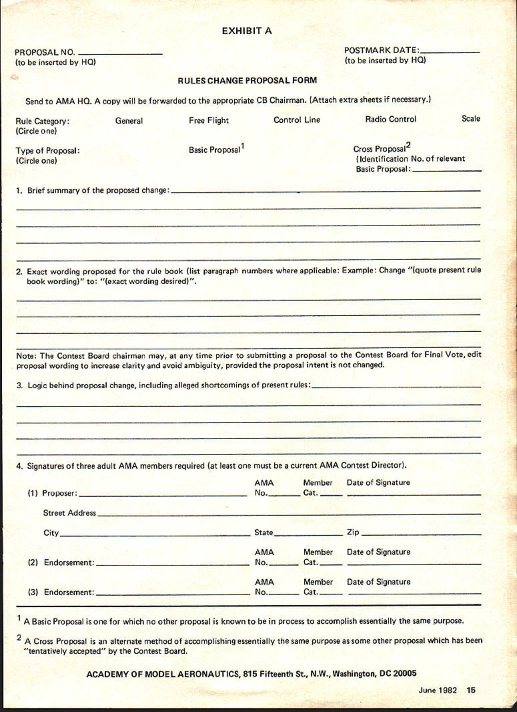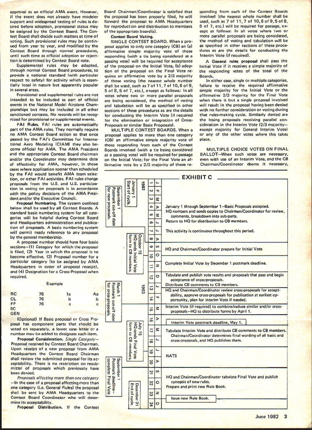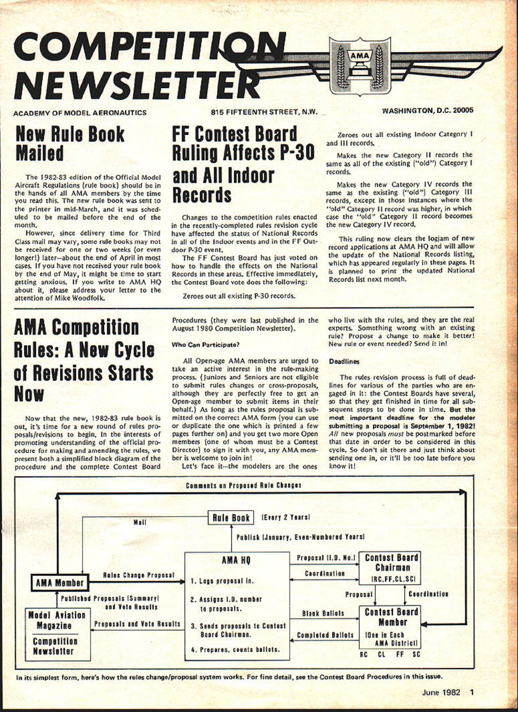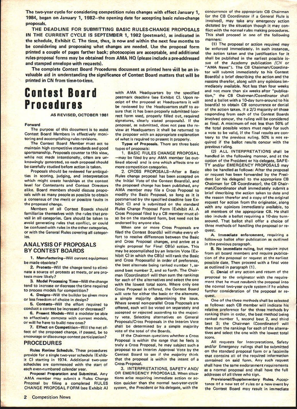 New Rule Book Mailed 1982-83 edition Official Model Aircraft Regulations rule book should hands AMA members time read new rule book sent printer mid-March sched uled mailed before end month However since delivery time Third Class mail may vary some rule books may received two weeks longer laterabout end April cases have received rule book end May might time start getting anxious write AMA HQ about please address letter attention Mike Woodfolk FF Contest Board Ruling Attects P-SO Indoor Records Changes competition rules enacted recently-completed rules revision cycle have affected status National Records Indoor events FF Out door P-30 event FF Contest Board has just voted handle effects National Records areas Effective immediately Contest Board vote does following Zeroes out existing Indoor Category Ill records Makes new Category II records same existing old Category records Makes new Category IV records same existing old Category III records except instances old Category II record higher case old Category II record becomes new Category IV record ruling now clears logjam new record applications AMA HQ will allow update National Records listing has appeared regularly pages planned print updated National Records list next month Zeroes out existing P-30 records AMA Competition Rules A New Cycle ot Revisions Starts Now Now new 1982-83 rule book out its time new round rules pro posalsjrevisions begin interests promoting understanding official pro cedure making amending rules present both simplified block diagram procedure complete Contest Board Procedures last published August 1 980 Competition Newsletter Can Participate Open-age AMA members urged take active interest rule-making process Juniors Seniors eligible submit rules changes cross-proposals although perfectly free get Open-age member submit items behalf As long rules proposal sub mitted correct AMA form can use duplicate printed few pages further get two Open members must Contest Director sign AMA mem ber welcome join Lets face itthe modelers ones live rules real experts Something wrong existing rule Propose change make better New rule event needed Send Deadlines rules revision process full dead lines various parties en gaged Contest Boards have several get finished time sub sequent steps done time important deadline modeler submitting proposal September 1 1982l new proposals must postmarked before date order considered cycle So dont sit just think about sending itll too late before know Conimeels Proposed Rule Changes AMA Member Published Model Avietion Muguzine Competition [ettezJ Mail Rules Change Proposal Proposals ISammaryl Vote Resells Proposals Vole Resells Book lEvory 2 Years Publish Ijanuary Even-Numbered Toarsi ProposalCoordinallue Completed Ballots lOne AMA District BC CL FF SC June 19821 NE WSLE ACADEMY OF MODEL AERONAUTICS815 FIFTEENTH STREET NW WASHINGTON DC 20005 AMA HO 1 Logs proposal 2 Assigns 10 comber proposals 3 Sends proposals Contest Board Chairman 4Prepares counts bellots its simplest form heres rules change/proposal system works fine detail see Contest Board Procedures issue two-year cycle considering competition rules changes effect January 1 1984 began January 1 1982the opening date accepting basic rules-change proposals THE DEADLINE FOR SUBMITTING BASIC RULES-CHANGE PROPOSALS IN THE CURRENT CYCLE IS SEPTEMBER 1 1982 postmark indicated schedule Exhibit C time thus now within next few months considering proposaing what changes needed Use proposal form printed couple pages farther back photocopies acceptable additional rules-proposal forms may obtained AMA HO please include pre-addressed stamped envelope requests complete Contest Board Procedures document printed iilI valuable aid understanding significance Contest Board matters will printed CN time-to-time Contest Board Procedures AS REVISED OCTOBER 1981 Forward purpose document assist Contest Board Members effectively moni toring accomplishing rules revisions Contest Board Member must act maintain high competitive standards good sportsmanship Proposals counter view made intentionally often un knowingly generated proposal should carefully studied before action taken Proposals should reviewed ambigui ties scoring judging interpretation might create hardships contest level Contestants Contest Directors alike Board members should discuss propo sals people possible obtain consensus merit possible faults proposed change Members Contest Boards should familiarize themselves rules pre vail categories Care should taken avoid generating rules conflict could confused rules other categories General Rules covering categor ies ANALYSIS OF PROPOSALS BY CONTEST BOARDS 1 ManufacturingWill current equipment made obsolete 2 ProtestsWill change tend elimi nate source protests meets pro tests likely 3 Model Processing TimeWill change tend increase decrease time required process models competition 4 DesignsWill builder given less freedom choice design 5 ContestsWill effort required conduct contest increased decreased 6 Present ModelsWill modeler able effectively compete current models will have build new ones 7 Effect CompetitionWill net ef fect proposed change passed encourage discourage contest participation PROCEDURES Rules Review Schedule procedures provide single two-year schedule Exhib C starting 1974 Additional two-year schedules commenced start even-numbered calendar year Proposal Preparation Submittal Any AMA member may submit Rules Change Proposal filing completed RULES CHANGE PROPOSAL FORM see Exhibit AMA Headquarters specified postmark deadline see Exhibit C Upon re ceipt proposal Headquarters will reviewed Headquarters staff sure has properly submitted cor rect form used properly filled out required signatures clearly stated proposals proposal submitted does pass re view Headquarters shall returned proposer appropriate explanation what required present properly Types Proposals three basic types proposals 1 BASIC RULES CHANGE PROPOSAL may filed AMA member out lined above