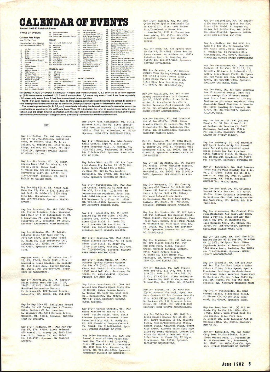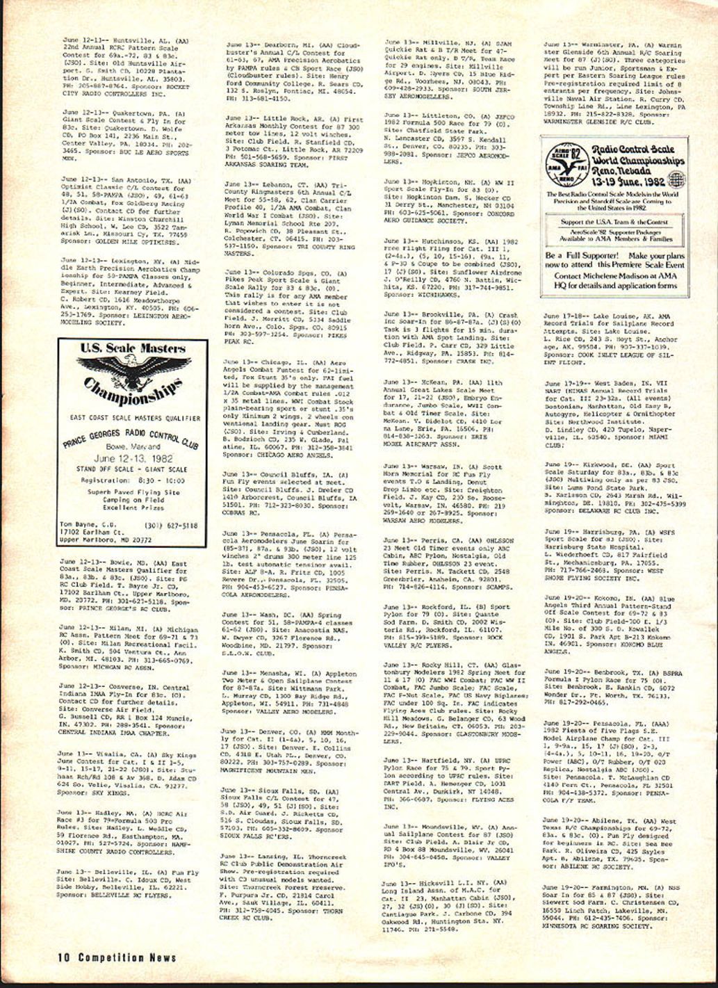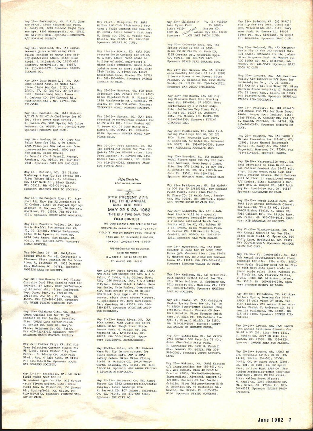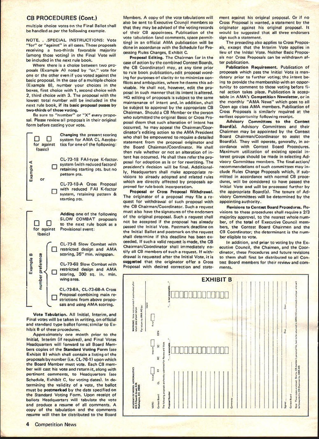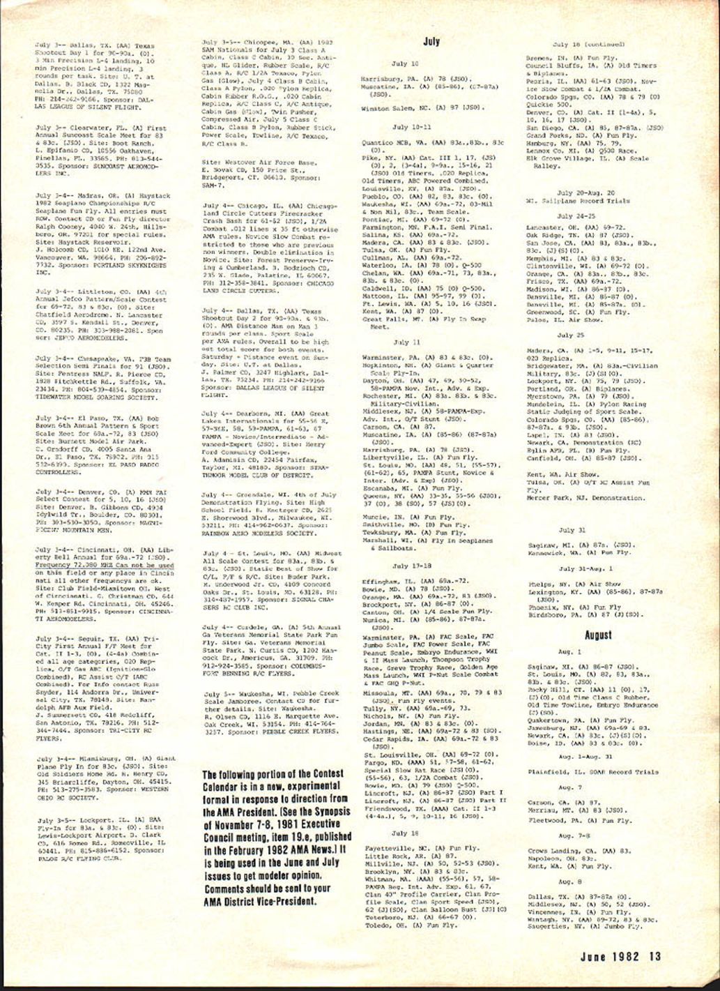 New Rule Book Mailed 1982-83 edition Official Model Aircraft Regulations rule book should hands AMA members time read new rule book sent printer mid-March sched uled mailed before end month However since delivery time Third Class mail may vary some rule books may received two weeks longer laterabout end April cases have received rule book end May might time start getting anxious write AMA HQ about please address letter attention Mike Woodfolk FF Contest Board Ruling Attects P-SO Indoor Records Changes competition rules enacted recently-completed rules revision cycle have affected status National Records Indoor events FF Out door P-30 event FF Contest Board has just voted handle effects National Records areas Effective immediately Contest Board vote does following Zeroes out existing Indoor Category Ill records Makes new Category II records same existing old Category records Makes new Category IV records same existing old Category III records except instances old Category II record higher case old Category II record becomes new Category IV record ruling now clears logjam new record applications AMA HQ will allow update National Records listing has appeared regularly pages planned print updated National Records list next month Zeroes out existing P-30 records AMA Competition Rules A New Cycle ot Revisions Starts Now Now new 1982-83 rule book out its time new round rules pro posalsjrevisions begin interests promoting understanding official pro cedure making amending rules present both simplified block diagram procedure complete Contest Board Procedures last published August 1 980 Competition Newsletter Can Participate Open-age AMA members urged take active interest rule-making process Juniors Seniors eligible submit rules changes cross-proposals although perfectly free get Open-age member submit items behalf As long rules proposal sub mitted correct AMA form can use duplicate printed few pages further get two Open members must Contest Director sign AMA mem ber welcome join Lets face itthe modelers ones live rules real experts Something wrong existing rule Propose change make better New rule event needed Send Deadlines rules revision process full dead lines various parties en gaged Contest Boards have several get finished time sub sequent steps done time important deadline modeler submitting proposal September 1 1982l new proposals must postmarked before date order considered cycle So dont sit just think about sending itll too late before know Conimeels Proposed Rule Changes AMA Member Published Model Avietion Muguzine Competition [ettezJ Mail Rules Change Proposal Proposals ISammaryl Vote Resells Proposals Vole Resells Book lEvory 2 Years Publish Ijanuary Even-Numbered Toarsi ProposalCoordinallue Completed Ballots lOne AMA District BC CL FF SC June 19821 NE WSLE ACADEMY OF MODEL AERONAUTICS815 FIFTEENTH STREET NW WASHINGTON DC 20005 AMA HO 1 Logs proposal 2 Assigns 10 comber proposals 3 Sends proposals Contest Board Chairman 4Prepares counts bellots its simplest form heres rules change/proposal system works fine detail see Contest Board Procedures issue two-year cycle considering competition rules changes effect January 1 1984 began January 1 1982the opening date accepting basic rules-change proposals THE DEADLINE FOR SUBMITTING BASIC RULES-CHANGE PROPOSALS IN THE CURRENT CYCLE IS SEPTEMBER 1 1982 postmark indicated schedule Exhibit C time thus now within next few months considering proposaing what changes needed Use proposal form printed couple pages farther back photocopies acceptable additional rules-proposal forms may obtained AMA HO please include pre-addressed stamped envelope requests complete Contest Board Procedures document printed iilI valuable aid understanding significance Contest Board matters will printed CN time-to-time Contest Board Procedures AS REVISED OCTOBER 1981 Forward purpose document assist Contest Board Members effectively moni toring accomplishing rules revisions Contest Board Member must act maintain high competitive standards good sportsmanship Proposals counter view made intentionally often un knowingly generated proposal should carefully studied before action taken Proposals should reviewed ambigui ties scoring judging interpretation might create hardships contest level Contestants Contest Directors alike Board members should discuss propo sals people possible obtain consensus merit possible faults proposed change Members Contest Boards should familiarize themselves rules pre vail categories Care should taken avoid generating rules conflict could confused rules other categories General Rules covering categor ies ANALYSIS OF PROPOSALS BY CONTEST BOARDS 1 ManufacturingWill current equipment made obsolete 2 ProtestsWill change tend elimi nate source protests meets pro tests likely 3 Model Processing TimeWill change tend increase decrease time required process models competition 4 DesignsWill builder given less freedom choice design 5 ContestsWill effort required conduct contest increased decreased 6 Present ModelsWill modeler able effectively compete current models will have build new ones 7 Effect CompetitionWill net ef fect proposed change passed encourage discourage contest participation PROCEDURES Rules Review Schedule procedures provide single two-year schedule Exhib C starting 1974 Additional two-year schedules commenced start even-numbered calendar year Proposal Preparation Submittal Any AMA member may submit Rules Change Proposal filing completed RULES CHANGE PROPOSAL FORM see Exhibit AMA Headquarters specified postmark deadline see Exhibit C Upon re ceipt proposal Headquarters will reviewed Headquarters staff sure has properly submitted cor rect form used properly filled out required signatures clearly stated proposals proposal submitted does pass re view Headquarters shall returned proposer appropriate explanation what required present properly Types Proposals three basic types proposals 1 BASIC RULES CHANGE PROPOSAL may filed AMA member out lined above