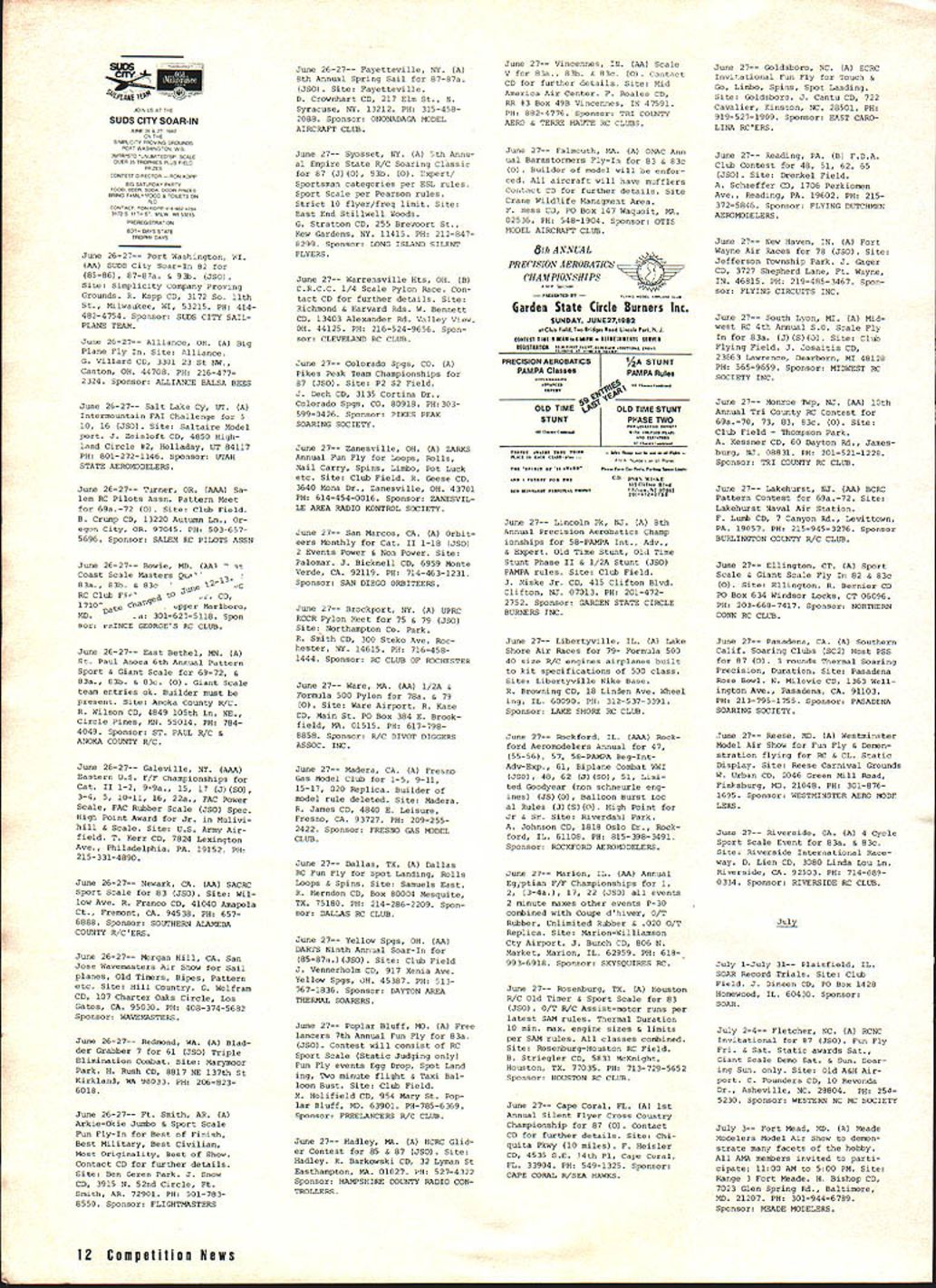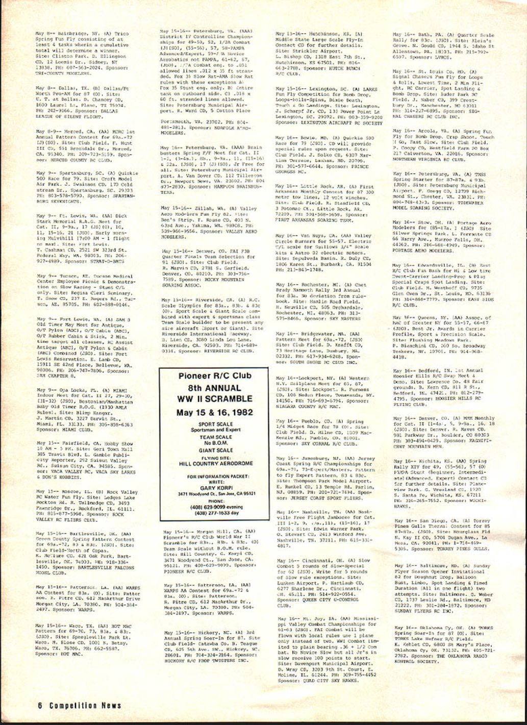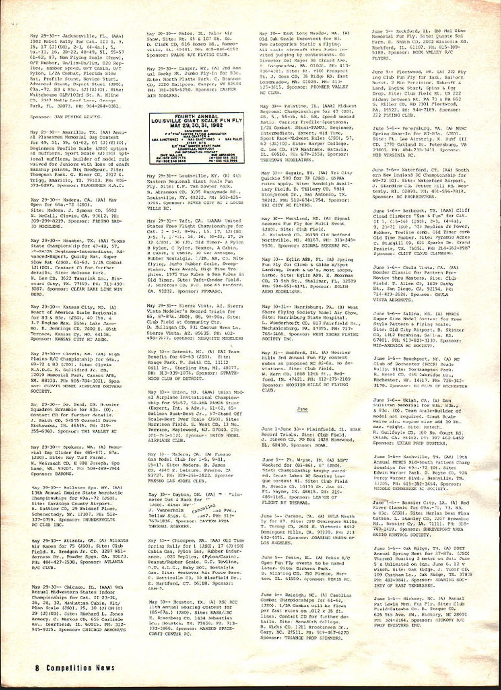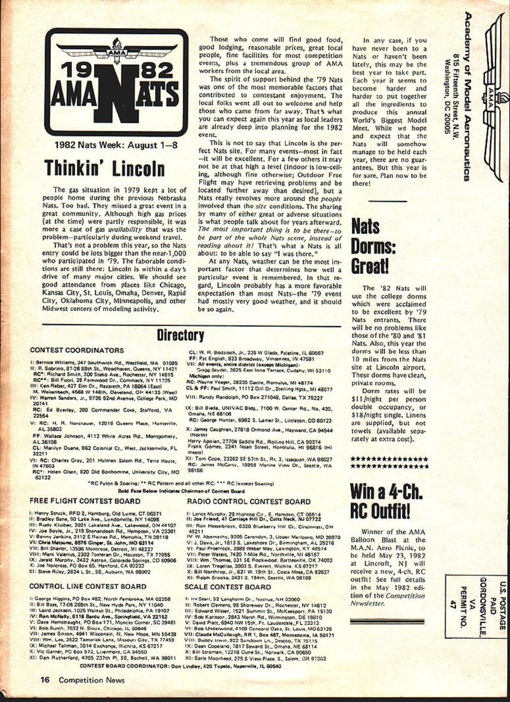 New Rule Book Mailed 1982-83 edition Official Model Aircraft Regulations rule book should hands AMA members time read new rule book sent printer mid-March sched uled mailed before end month However since delivery time Third Class mail may vary some rule books may received two weeks longer laterabout end April cases have received rule book end May might time start getting anxious write AMA HQ about please address letter attention Mike Woodfolk FF Contest Board Ruling Attects P-SO Indoor Records Changes competition rules enacted recently-completed rules revision cycle have affected status National Records Indoor events FF Out door P-30 event FF Contest Board has just voted handle effects National Records areas Effective immediately Contest Board vote does following Zeroes out existing Indoor Category Ill records Makes new Category II records same existing old Category records Makes new Category IV records same existing old Category III records except instances old Category II record higher case old Category II record becomes new Category IV record ruling now clears logjam new record applications AMA HQ will allow update National Records listing has appeared regularly pages planned print updated National Records list next month Zeroes out existing P-30 records AMA Competition Rules A New Cycle ot Revisions Starts Now Now new 1982-83 rule book out its time new round rules pro posalsjrevisions begin interests promoting understanding official pro cedure making amending rules present both simplified block diagram procedure complete Contest Board Procedures last published August 1 980 Competition Newsletter Can Participate Open-age AMA members urged take active interest rule-making process Juniors Seniors eligible submit rules changes cross-proposals although perfectly free get Open-age member submit items behalf As long rules proposal sub mitted correct AMA form can use duplicate printed few pages further get two Open members must Contest Director sign AMA mem ber welcome join Lets face itthe modelers ones live rules real experts Something wrong existing rule Propose change make better New rule event needed Send Deadlines rules revision process full dead lines various parties en gaged Contest Boards have several get finished time sub sequent steps done time important deadline modeler submitting proposal September 1 1982l new proposals must postmarked before date order considered cycle So dont sit just think about sending itll too late before know Conimeels Proposed Rule Changes AMA Member Published Model Avietion Muguzine Competition [ettezJ Mail Rules Change Proposal Proposals ISammaryl Vote Resells Proposals Vole Resells Book lEvory 2 Years Publish Ijanuary Even-Numbered Toarsi ProposalCoordinallue Completed Ballots lOne AMA District BC CL FF SC June 19821 NE WSLE ACADEMY OF MODEL AERONAUTICS815 FIFTEENTH STREET NW WASHINGTON DC 20005 AMA HO 1 Logs proposal 2 Assigns 10 comber proposals 3 Sends proposals Contest Board Chairman 4Prepares counts bellots its simplest form heres rules change/proposal system works fine detail see Contest Board Procedures issue two-year cycle considering competition rules changes effect January 1 1984 began January 1 1982the opening date accepting basic rules-change proposals THE DEADLINE FOR SUBMITTING BASIC RULES-CHANGE PROPOSALS IN THE CURRENT CYCLE IS SEPTEMBER 1 1982 postmark indicated schedule Exhibit C time thus now within next few months considering proposaing what changes needed Use proposal form printed couple pages farther back photocopies acceptable additional rules-proposal forms may obtained AMA HO please include pre-addressed stamped envelope requests complete Contest Board Procedures document printed iilI valuable aid understanding significance Contest Board matters will printed CN time-to-time Contest Board Procedures AS REVISED OCTOBER 1981 Forward purpose document assist Contest Board Members effectively moni toring accomplishing rules revisions Contest Board Member must act maintain high competitive standards good sportsmanship Proposals counter view made intentionally often un knowingly generated proposal should carefully studied before action taken Proposals should reviewed ambigui ties scoring judging interpretation might create hardships contest level Contestants Contest Directors alike Board members should discuss propo sals people possible obtain consensus merit possible faults proposed change Members Contest Boards should familiarize themselves rules pre vail categories Care should taken avoid generating rules conflict could confused rules other categories General Rules covering categor ies ANALYSIS OF PROPOSALS BY CONTEST BOARDS 1 ManufacturingWill current equipment made obsolete 2 ProtestsWill change tend elimi nate source protests meets pro tests likely 3 Model Processing TimeWill change tend increase decrease time required process models competition 4 DesignsWill builder given less freedom choice design 5 ContestsWill effort required conduct contest increased decreased 6 Present ModelsWill modeler able effectively compete current models will have build new ones 7 Effect CompetitionWill net ef fect proposed change passed encourage discourage contest participation PROCEDURES Rules Review Schedule procedures provide single two-year schedule Exhib C starting 1974 Additional two-year schedules commenced start even-numbered calendar year Proposal Preparation Submittal Any AMA member may submit Rules Change Proposal filing completed RULES CHANGE PROPOSAL FORM see Exhibit AMA Headquarters specified postmark deadline see Exhibit C Upon re ceipt proposal Headquarters will reviewed Headquarters staff sure has properly submitted cor rect form used properly filled out required signatures clearly stated proposals proposal submitted does pass re view Headquarters shall returned proposer appropriate explanation what required present properly Types Proposals three basic types proposals 1 BASIC RULES CHANGE PROPOSAL may filed AMA member out lined above