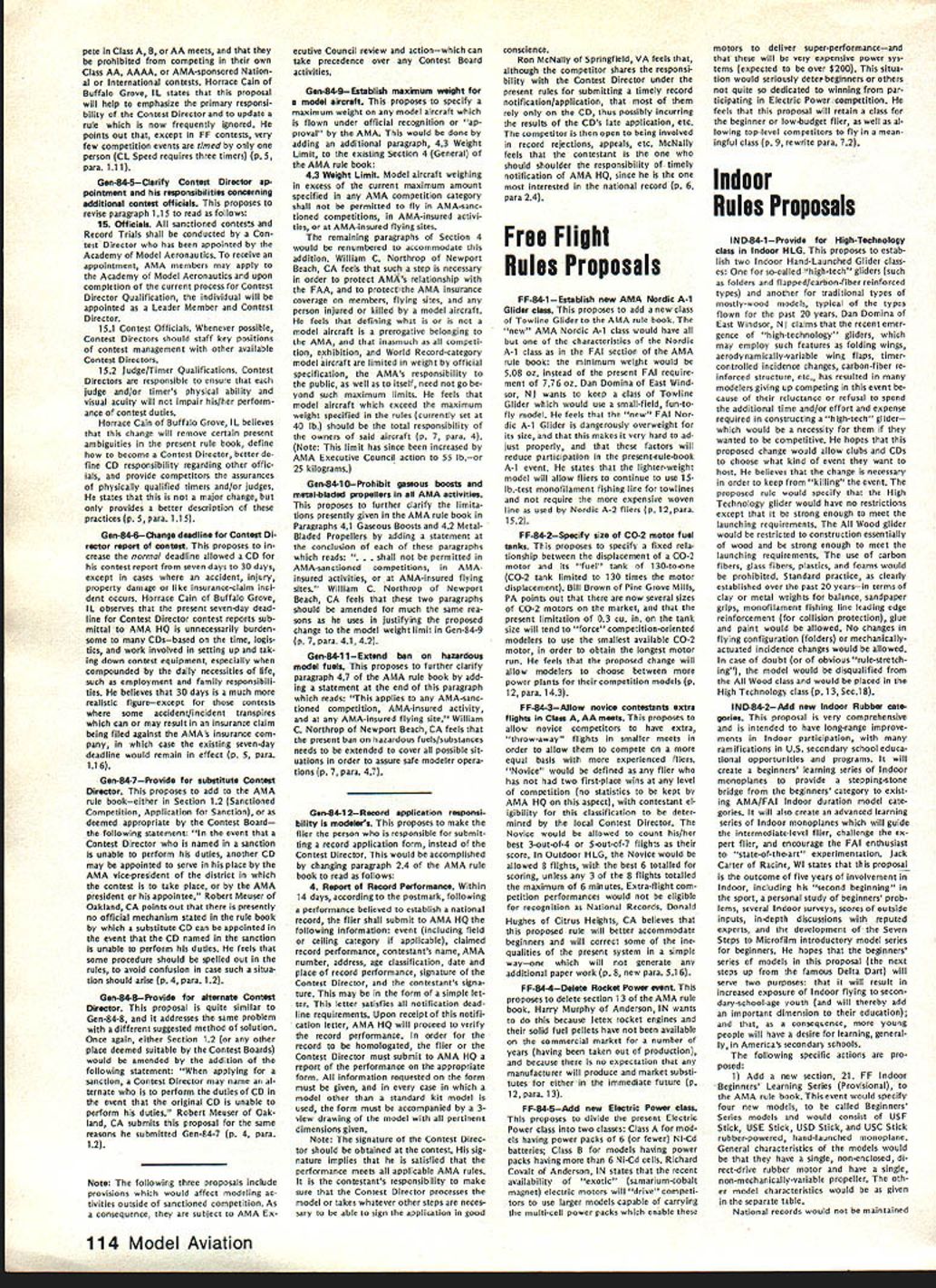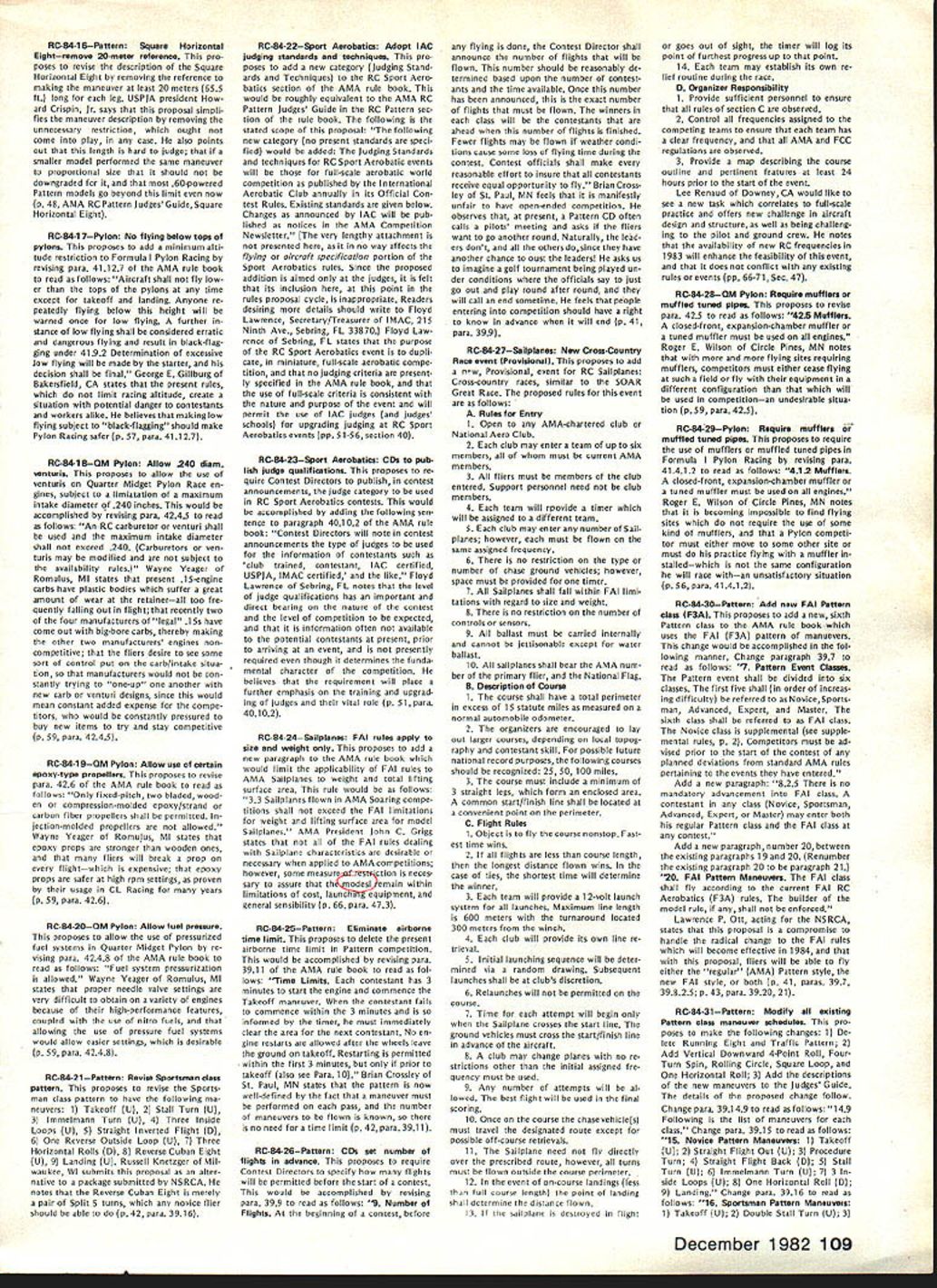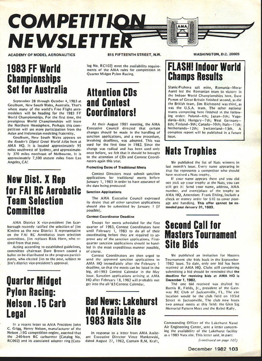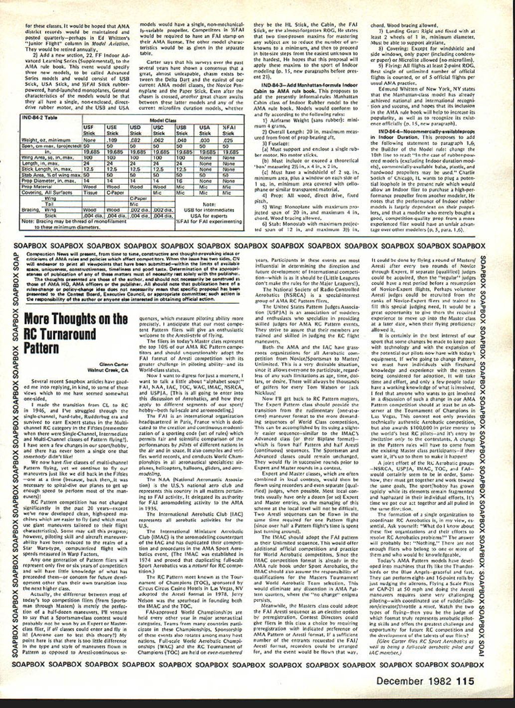 COM PETI TW~ NE WSLETTERW ACADEMY OF MODEL AERONAUTICS 1983FF World Championships Set Australia September 28 through October 4 1983 Goulburn New South Wales Australia Thats worlds Free Flight aero modelers will heading 1983 FF World Championships first time prestigious World Championships will leave Northern Hemisphere Perhaps com petition will see participation Asian Indonesian modeling fraternity Goulburn New South Wales appears Readers Digest Great World At/as AMA HQ located approximately 95 miles southwest Sydney approximate ly 370 miles northeast Melbourne approximately 7500 statute miles Los Angeles CA New Dist X Rep FAI NC Aerobatic Team Selection Committee 815 FIFTEENTH STREET NW log No RCi 02 meet availability require ments AMA rules competition Quarter Midget Pylon Racing Attention CDs Contest Coordinators August 1981 meeting AMA Executive Council directed certain changes should made handling sanction applications new procedure involving deadlines adopted used first time 1982 Since change radical has used once before felt should brought attention CDs Contest Coordi nators again year Protecting Dates Traditional Meets Contest Directors must submit sanction applications traditional meets before January 1 1983 order have assurance date being protected Sanction Applications AMA Executive Council expressed its desire other sanction applications should also submitted January 1 possible WASHINGTON DC 20005 Nats Trophies pubi shed st Nats w nne s n last months issue name appearing list represents competitor should have received Nats trophy name appears did pick up trophy Nats can still get Send name address AMA number event/place trophy AMA HQ Attention Frank Ehling Include check money order $10 cover post age handling offer cannot ex tended past January 31 1983 Contest Coordinator Deadline AMA District X vice-president Jim Scar borough recently ratified selection Jim Kimbro new District X representative FAI RC Aerobatics team selection committee Jim replaces Rick Horn re tired post Acting according established guidelines committee chairman Dave Brown caused ballot distributed program partici pants elected Jim post subject Jims district vice-presidents approval Quarter Midget Pylon Racing Nelson 15 Carb Legal recent letter AMA President John C Grigg Henry Nelson manufacturer Nelson 1 5G competition engine asserted 240-bore RC carburetor Catalog No RCGO2 its associated adapter ring Cata Except meets scheduled first quarter 1983 Contest Coordinators have until February 1 1983 coordinating before required ap prove sanction applications Firstquarter sanction applications should hand led expeditious manner possible course Contest Coordinators urged send approved sanction applications AMA HQ immediately after February 1 deadline meets can listed big all-i 983 Contest Calendar May issue Sanction applications arriving AMA HQ after February 181982 will probably get 83 Contest Calendar Bad News Lakehurst Available 1983 Nats Site esponse lette f om AMA Ass st ant Executive Director Vince Mankowski dated August 27 1982 Captain RM Kraft Second Call Masters Tournament Site Bids published invitation Masters Tournament site bids back September 1982 issue date bid has received AMA HQ Clubs still considering submitting bid should reminded deadline receiving bids AMA HO December 1 1982 Th bid received drafted Burnis R Fields Jr president Gate way RC Club Jacksonville FL site location would club field 103rd Street Jacksonville club now hosts two annual meets field Glen Sig Memorial Pattern Meet Rebel Rally Commanding Officer Lakehurst Naval Air Engineering Center sent letter concern ing availability Lakehurst facility 1983 Nats site letter said part continued page 107 December 1982 103 FLASH Indoor World Champs Results Slanic-Prahova salt RomaniaMorar Aurel led Romanian team victory Indoor World Championships Dave Pymm Great Britain finished second did British team Jim Richmond third USA team other national teams competing finished follow ing order Poland4th JapanSth Yugo slavia6th Hungary7th West Germany 8th Finland9th CanadalOth Italyi ith Netherlandsi 2th Switzerlandi 3th complete report will published future issue 1983 team L R Don Edberg Alex Bower Mark Smith look wet worn weary made through sun wind rain excellent performances Now its off World Championships York England next July Soaring Team Finals Dan Pruss Photographs Jim Siater After summer Quarter-Finals Semifinals program saw larg est number participants date vie slots 1983 USA F3B Team Finals held over past Labor Day weekend vital statistics Site Joliet Park Board Airport located about 50 miles southwest Chicago Roster Thirty-six finalists 14 states plus two members 1981 USA Team Schedule Four rounds 12 tasks durIng first two days third day top 15 would have flyoff competing through three rounds nine tasks Organizers About 30 members SOAR plus support members Michi gan Ohio St Louis Denver Chicago modeling clubs Included competition roster four former USA Team members two won World Championships also two Soaring Nationals winners Get Reedy Get Set. also contest would bring together two schools design San Fernando Valley Silent Flyers would come better half Ken Helen Olsen scoring team hard work re suIts posted within minutes after comple tion task round thick wing15% thick airfoils sections wings could built strong table tops could carry full 11-lb limit need wings would also strong enough take highly-accelerated launch pop off tow transfer developed energy climb terminate launch altitude higher ever before seen Sailplane meet other school design also mas tered zoom launches came called models using well-known thinner Eppler airfoils Eui-opean-influ enced designs Summuy Entranu home state AL CA CO CT FL IL Wi Wi OIC PA Tx VA WA WI 1152 I21 211I2212 factors considered makings finest F3B contest ever held went Gol Dey Round Mark Smith age 20 first showed up Soaring scene 12 years ago proceeded stomp com ers continued left off Pt. NAME ETC SmIt
