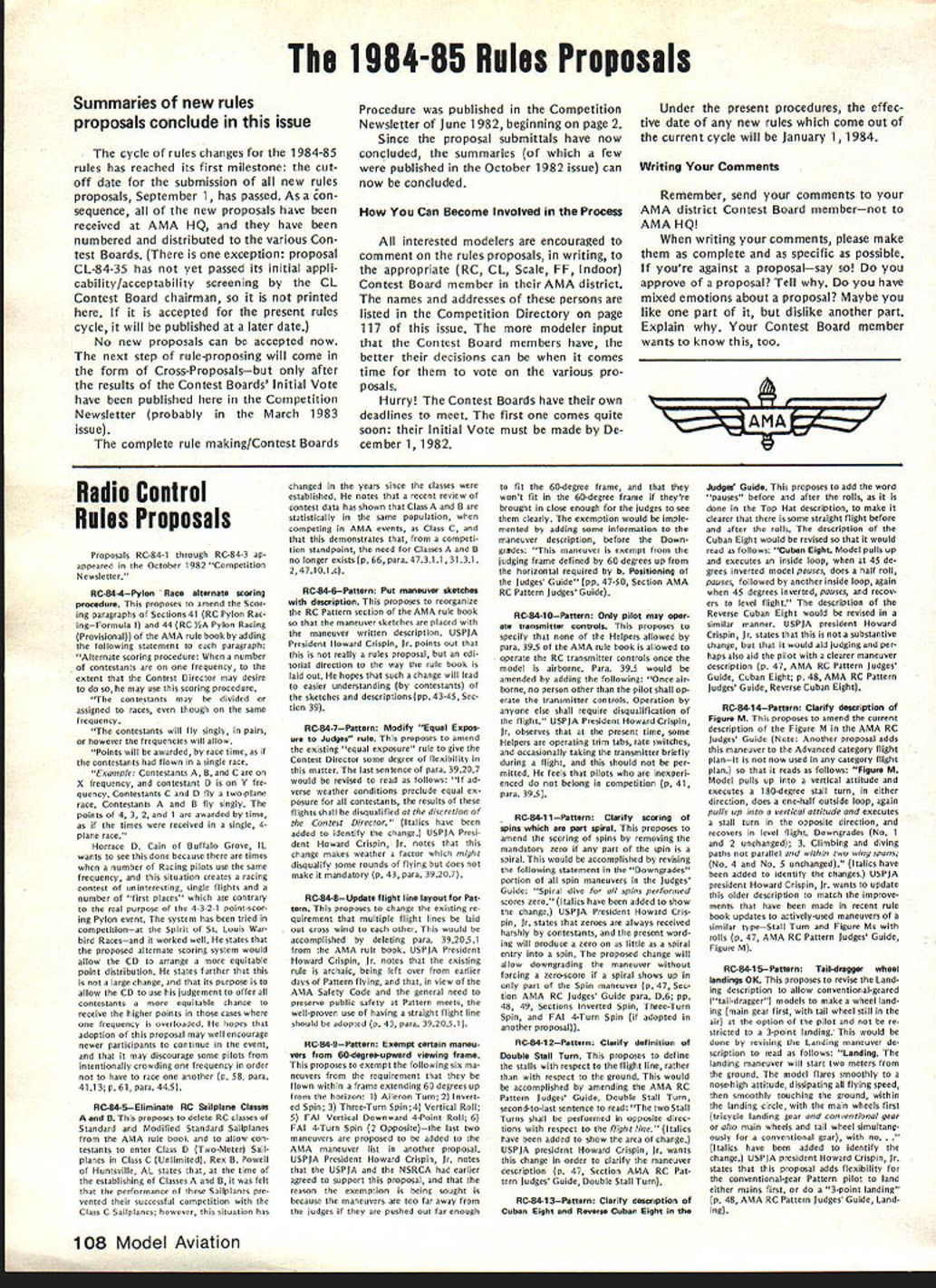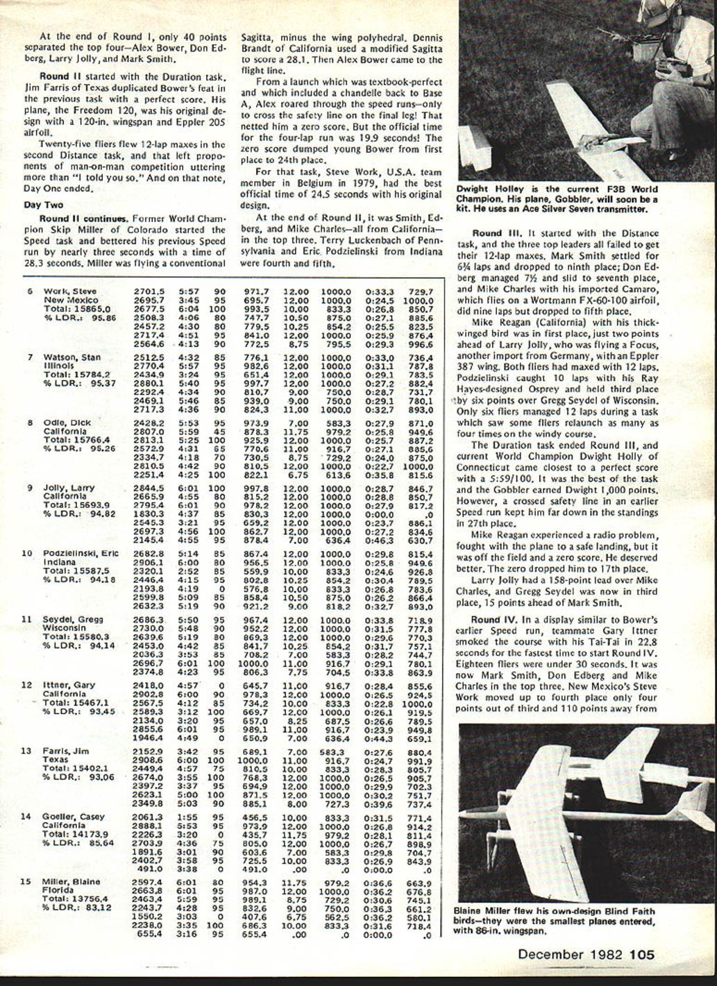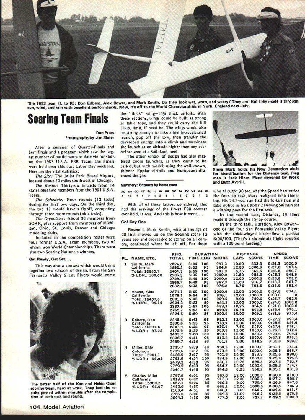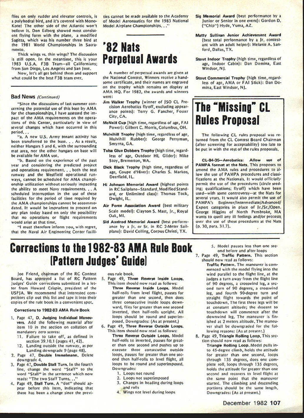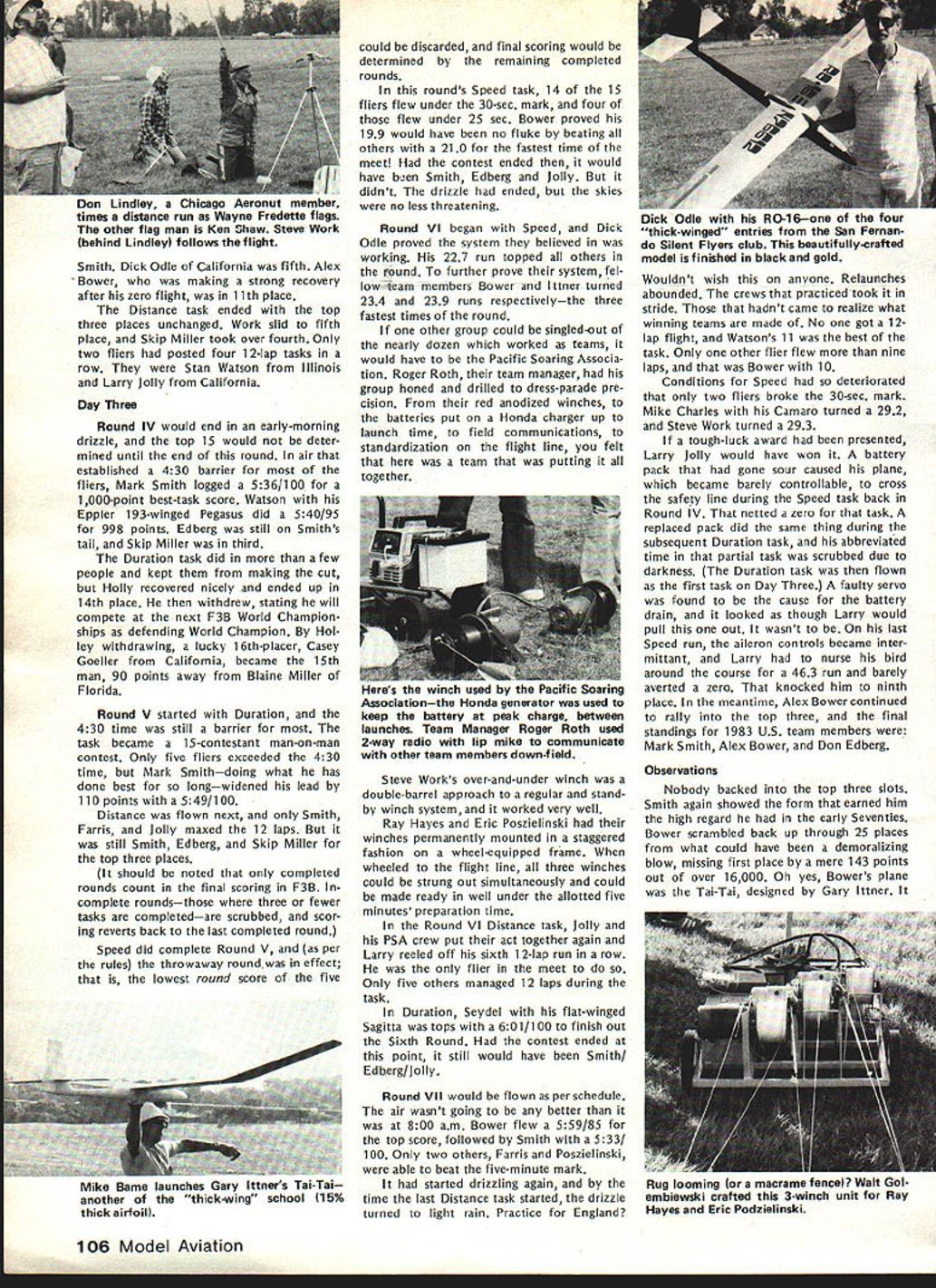 COM PETI TW~ NE WSLETTERW ACADEMY OF MODEL AERONAUTICS 1983FF World Championships Set Australia September 28 through October 4 1983 Goulburn New South Wales Australia Thats worlds Free Flight aero modelers will heading 1983 FF World Championships first time prestigious World Championships will leave Northern Hemisphere Perhaps com petition will see participation Asian Indonesian modeling fraternity Goulburn New South Wales appears Readers Digest Great World At/as AMA HQ located approximately 95 miles southwest Sydney approximate ly 370 miles northeast Melbourne approximately 7500 statute miles Los Angeles CA New Dist X Rep FAI NC Aerobatic Team Selection Committee 815 FIFTEENTH STREET NW log No RCi 02 meet availability require ments AMA rules competition Quarter Midget Pylon Racing Attention CDs Contest Coordinators August 1981 meeting AMA Executive Council directed certain changes should made handling sanction applications new procedure involving deadlines adopted used first time 1982 Since change radical has used once before felt should brought attention CDs Contest Coordi nators again year Protecting Dates Traditional Meets Contest Directors must submit sanction applications traditional meets before January 1 1983 order have assurance date being protected Sanction Applications AMA Executive Council expressed its desire other sanction applications should also submitted January 1 possible WASHINGTON DC 20005 Nats Trophies pubi shed st Nats w nne s n last months issue name appearing list represents competitor should have received Nats trophy name appears did pick up trophy Nats can still get Send name address AMA number event/place trophy AMA HQ Attention Frank Ehling Include check money order $10 cover post age handling offer cannot ex tended past January 31 1983 Contest Coordinator Deadline AMA District X vice-president Jim Scar borough recently ratified selection Jim Kimbro new District X representative FAI RC Aerobatics team selection committee Jim replaces Rick Horn re tired post Acting according established guidelines committee chairman Dave Brown caused ballot distributed program partici pants elected Jim post subject Jims district vice-presidents approval Quarter Midget Pylon Racing Nelson 15 Carb Legal recent letter AMA President John C Grigg Henry Nelson manufacturer Nelson 1 5G competition engine asserted 240-bore RC carburetor Catalog No RCGO2 its associated adapter ring Cata Except meets scheduled first quarter 1983 Contest Coordinators have until February 1 1983 coordinating before required ap prove sanction applications Firstquarter sanction applications should hand led expeditious manner possible course Contest Coordinators urged send approved sanction applications AMA HQ immediately after February 1 deadline meets can listed big all-i 983 Contest Calendar May issue Sanction applications arriving AMA HQ after February 181982 will probably get 83 Contest Calendar Bad News Lakehurst Available 1983 Nats Site esponse lette f om AMA Ass st ant Executive Director Vince Mankowski dated August 27 1982 Captain RM Kraft Second Call Masters Tournament Site Bids published invitation Masters Tournament site bids back September 1982 issue date bid has received AMA HQ Clubs still considering submitting bid should reminded deadline receiving bids AMA HO December 1 1982 Th bid received drafted Burnis R Fields Jr president Gate way RC Club Jacksonville FL site location would club field 103rd Street Jacksonville club now hosts two annual meets field Glen Sig Memorial Pattern Meet Rebel Rally Commanding Officer Lakehurst Naval Air Engineering Center sent letter concern ing availability Lakehurst facility 1983 Nats site letter said part continued page 107 December 1982 103 FLASH Indoor World Champs Results Slanic-Prahova salt RomaniaMorar Aurel led Romanian team victory Indoor World Championships Dave Pymm Great Britain finished second did British team Jim Richmond third USA team other national teams competing finished follow ing order Poland4th JapanSth Yugo slavia6th Hungary7th West Germany 8th Finland9th CanadalOth Italyi ith Netherlandsi 2th Switzerlandi 3th complete report will published future issue 1983 team L R Don Edberg Alex Bower Mark Smith look wet worn weary made through sun wind rain excellent performances Now its off World Championships York England next July Soaring Team Finals Dan Pruss Photographs Jim Siater After summer Quarter-Finals Semifinals program saw larg est number participants date vie slots 1983 USA F3B Team Finals held over past Labor Day weekend vital statistics Site Joliet Park Board Airport located about 50 miles southwest Chicago Roster Thirty-six finalists 14 states plus two members 1981 USA Team Schedule Four rounds 12 tasks durIng first two days third day top 15 would have flyoff competing through three rounds nine tasks Organizers About 30 members SOAR plus support members Michi gan Ohio St Louis Denver Chicago modeling clubs Included competition roster four former USA Team members two won World Championships also two Soaring Nationals winners Get Reedy Get Set. also contest would bring together two schools design San Fernando Valley Silent Flyers would come better half Ken Helen Olsen scoring team hard work re suIts posted within minutes after comple tion task round thick wing15% thick airfoils sections wings could built strong table tops could carry full 11-lb limit need wings would also strong enough take highly-accelerated launch pop off tow transfer developed energy climb terminate launch altitude higher ever before seen Sailplane meet other school design also mas tered zoom launches came called models using well-known thinner Eppler airfoils Eui-opean-influ enced designs Summuy Entranu home state AL CA CO CT FL IL Wi Wi OIC PA Tx VA WA WI 1152 I21 211I2212 factors considered makings finest F3B contest ever held went Gol Dey Round Mark Smith age 20 first showed up Soaring scene 12 years ago proceeded stomp com ers continued left off Pt. NAME ETC SmIt