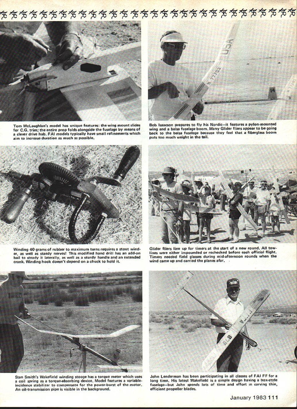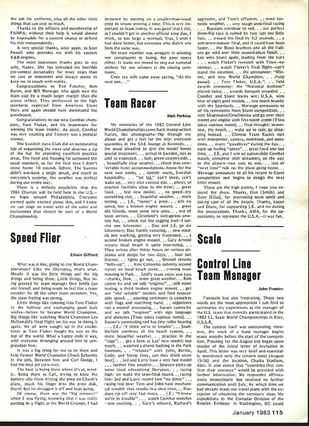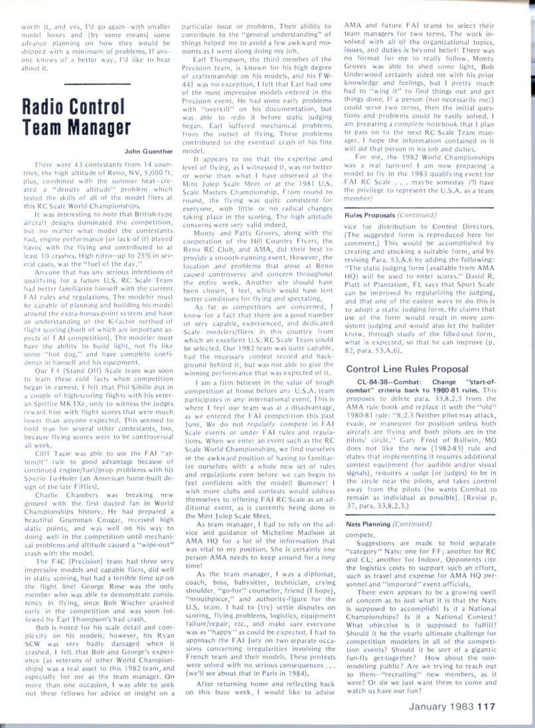 NE WSLET ACADEMY OF MODEL AERONAUTICS Indoor Bad News Indoor community verge losing its favorite flying sites Northwood Institute West Baden IN AMA HQ has learned Northwood Institute going cease operations September 1983 Whether means atrium fly ing site will permanently closed model ers known however contestant lodging meals packages have offered big Indoor events recent years will available after closing date wonder other heretoforeundiscovered Indoor sites left East Midwest US Bids tor 83 NC Aerobatics World Champs Subject final approval FAIs ClAM December 1982 1983 RC Aero batics World Championship will held Pensacola FL October will publish information date site location contes tant/supporter housing time time information becomes available NC Soaring Team Manager unanimous vote members 1983 US RC Soaring team have elected Richard Odle Simi Valley CA team manager team will travel World Championships England sometime 1983 exact date location will available until after FAIs ClAM meeting Decem ber 1982 Planning Future AMA Nats December 11 1982 AMA Execu tive Council Nationals Executive Committee will meet discuss future Na tional Contests 815 FIFTEENTH STREET NW recent years has become obvi ous very serious problems must solved Nats continue its historical style organization/operation example 1982 Nats switchedalmost last minutefrom Lakehurst Naval Air Station New Jersey Lincoln NE year before site changed San Antonio USAF Auxiliary Field Seguin TX Lincoln Nats has impossible hold FF events anywhere near same site CL RC Indoor fliers have expressed dissatisfac tion low-ceiling site Some AMA officials believe lastminute Nats site selections have discouraged attendance Nats modelers point WASHINGTON DC 20005 out sites selected late season make very difficult plan vacation time allow attend Some dis appointed unpopular sites chosen Seguin TX Lincoln NE Lake Charles LA Veteran Nats competitors appear favor traditional sites areas near Chicago Los Angelels Philadelphia Dayton exam pie Voices heard cry out es tablishment permanent Nats site Some points made against suggestionthe fact recruiting Nats officials would soon become difficult and/or expensive since local fliers would soon tire having work ever having chance continued page 117 Competition Directory CONTEST COORDINATORS FF Pat Englsh 823 Broadway Vincennes IN 47591 I Bernice Williams 347 Southwitk Rd. Westfield MA 01085 VII enents entire district except Mishigani II R SobrinO 87-26 88th St. Woodhaven Queens NY 11421 Gregg Seydel 3625 East lone Terrace Cudany WI 53110 RC Ernest Nikodem 407 Willow St Lockoort NY 14094 Michigan RC Bill Fuori 28 Fernwood Dr. Commacit NY 11725 RC Wayne Yeager 38235 Castle Romulus Ml 48174 Ill Ken Reber 427 Elm Dr Nazareth PA 18064 Eastl CL & FP Paul Smith 11112 Dill Or. Sterling Hgts. Ml 48077 M Weisenbach 4568 W 146th cleveland OH 44135 IStestI VIII Randy Randolph PD Boa 271046 Dallas TX 75227 IV Warren Sanders Jr 9735 52nd Avenue College Park MD lx Sill Bieda UNIVAC Bldg 7100 W Center Rd No 420 20741Omaha NE 85106 RC Ed BycrIaF 200 Commander Cove Stafford VA 22554RC George Hunter 6962 5 Lamar St Littleton CO 80123 V RC HR Norchaser l2Ol6OueensPI. Huntsville AL35803 X James Caughran 27818 Ormond Ave Hayward CA 94544 FP Wallace JohnsOn 4112 White Acres Rd Montgomery ALINorthl 36106Harry Apoan 27704 Saddle Rd Rolling Hill CA 90274 CL Marilyn Duane 862 Colonial Ct West Jacksonville FL Soushl 32211Frank Gomas 2241 Noah Street Honolulu HI 96816 HI VI RC Charles Gray 201 Hulman Salem Rd Terre Haute meensl IN 47803Xl Tom Cope 23262 SE 57th St Rt 3 Issaqoas WA 98027 RC Soaring Helen Olsen 820 010 Sonhomme university City RC James McCarty 18958 Marine View Seattle WA MO 63132 98166 CL WR Bodzioch Jr 235 W Glade Palatine IL 60067 RC Pylon & Soaring RC Pattern other RC RC lencept Soarngl Bald Face Below Indicates Chairosan af Contest Board FREE FLIGHT CONTEST BOARDVI Chris Mansano 8576 Ginger John MO 63114 Henry Struce RPD 2 Hamburg Old Lvme CT 06371VII Sill ShailOr 13596 Montrose Detro Ml 48227 IIBradley Bane 60 Lake Ave Lyndonniile NY 14098VIII Mark Valerius 1627 Overland Pass Sugarland TX 77478 IllRudy Kluber 2021 Lakeland Ave Lalsemood OH 44107IX Jerald Murphy 2432 Astron Colorado Springs CO 80906 IVJoe Boyle Jr 219 Shenandoalt Rd Hampton VA 23361X Joe Norcross P0 Sot 65 Hanford CA 93232 VBonny Jenkins 3112 8 Ranes Rd Memphis TN 38118Xl Kevin Collins 2320 Sahalee Dr S Rvdmond WA 98052 RADIO CONTROL CONTEST BOARD V J Davis Jr 1813 5 Lakeshore Dr. Birmingham AL 35218 Lance Murphy 29 HightopCir. C Hamden CT 06514 VI Paul Proefrock 3989 Wnber Way Lexington KY 40514 II Joe Friend 41 Carriage Hill Dr. Colts Neck NJ 07722 VII Peter Waters 7420 7Mile Rd Northvlle Ml 48167 Ill Ron Hesselbrock 6320 Blueberry Hill Ct Cincinnati OH VIII Win Thomas 331 SE RocvwoOd Sartlessille OK 74003 45211 IX Lorne Tregellas 3003 S Everett Wictita KS 67217 IV W Aberneshy 9205 CarendoC 3 Upper Marlboro MD X Sill Northrop Jr 621 W iStIt SI. Costa Mesa CA 92627 20870Xl Charles Davenport 1441S SE 268tn St. Kent WA 98031 CONTROL LINE CONTEST BOARDVI Bob BurpS 7032 N Sioun Chicego IL 60646 George Higgins P0 BOx 482 North Pembroke MA 02358VII James Sinton 4941 WisconSin N New Hope MN 55428 II Sill Boss 7706 269th St New Hyde Park NY 11040 VIII Win Lee 3522 Tamarisk Lane Missouri City TX 77459 Ill Lard Jackson 1025 Walnut St. Philadelphia PA 19107 IX Michael Talman 3014 Eachange Wichita KS 67217 IV Ron McNally 6118 Barda Axe Springfield VA 22152 X Vip Garner P0 Boa 573 Livermore CA94550 V Dave Hemstraughs P0 Box 171 Moecks Corner SC 29441 Xl John Thompson 1411 Sryant Ave. Cottage Grove OR 97424 SCALE CONTEST BOARD VI Bob Underwood 4109 Concord Oaks St Louis MO 63128 Ire Sean 52 Langholm Dr Nagissia NH 03060 VII Claude McCullough RR 1 Boa 487 Montezuma IA 50171 II Robert Clemens 95 Shoremay Dr Rochester NY 14612 VIII Buddy Irwin 922 Sundown LO Desoto TX 75115 Ill Edward Wisser 1521 Summt St MpKeesport PA 15130 IX bean Copeland 7817 Seward St. Omah