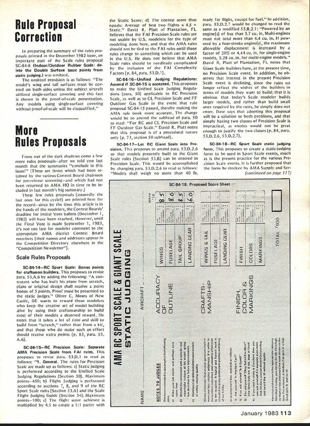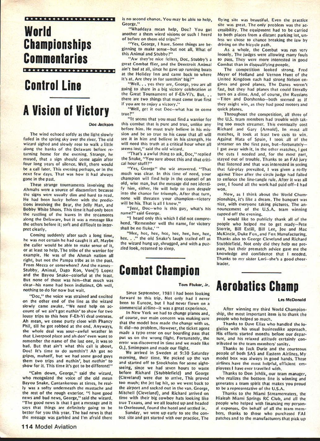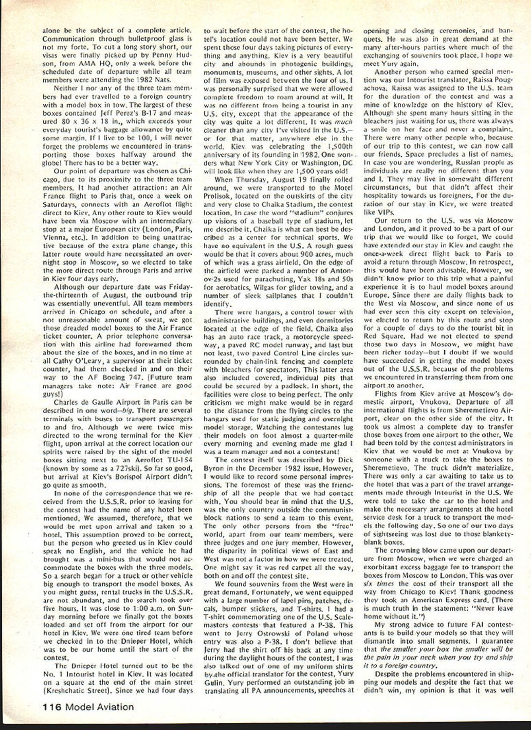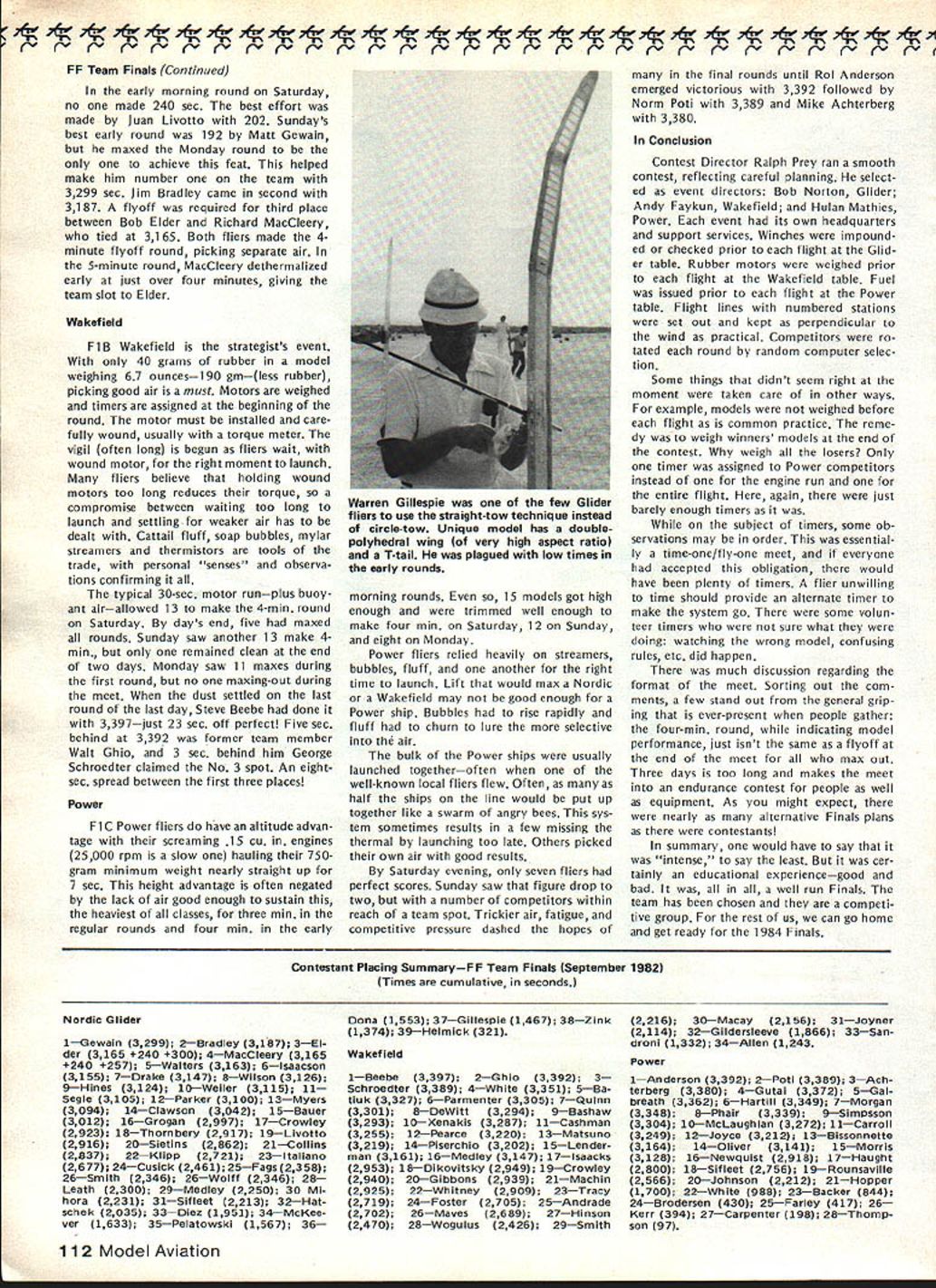 NE WSLET ACADEMY OF MODEL AERONAUTICS Indoor Bad News Indoor community verge losing its favorite flying sites Northwood Institute West Baden IN AMA HQ has learned Northwood Institute going cease operations September 1983 Whether means atrium fly ing site will permanently closed model ers known however contestant lodging meals packages have offered big Indoor events recent years will available after closing date wonder other heretoforeundiscovered Indoor sites left East Midwest US Bids tor 83 NC Aerobatics World Champs Subject final approval FAIs ClAM December 1982 1983 RC Aero batics World Championship will held Pensacola FL October will publish information date site location contes tant/supporter housing time time information becomes available NC Soaring Team Manager unanimous vote members 1983 US RC Soaring team have elected Richard Odle Simi Valley CA team manager team will travel World Championships England sometime 1983 exact date location will available until after FAIs ClAM meeting Decem ber 1982 Planning Future AMA Nats December 11 1982 AMA Execu tive Council Nationals Executive Committee will meet discuss future Na tional Contests 815 FIFTEENTH STREET NW recent years has become obvi ous very serious problems must solved Nats continue its historical style organization/operation example 1982 Nats switchedalmost last minutefrom Lakehurst Naval Air Station New Jersey Lincoln NE year before site changed San Antonio USAF Auxiliary Field Seguin TX Lincoln Nats has impossible hold FF events anywhere near same site CL RC Indoor fliers have expressed dissatisfac tion low-ceiling site Some AMA officials believe lastminute Nats site selections have discouraged attendance Nats modelers point WASHINGTON DC 20005 out sites selected late season make very difficult plan vacation time allow attend Some dis appointed unpopular sites chosen Seguin TX Lincoln NE Lake Charles LA Veteran Nats competitors appear favor traditional sites areas near Chicago Los Angelels Philadelphia Dayton exam pie Voices heard cry out es tablishment permanent Nats site Some points made against suggestionthe fact recruiting Nats officials would soon become difficult and/or expensive since local fliers would soon tire having work ever having chance continued page 117 Competition Directory CONTEST COORDINATORS FF Pat Englsh 823 Broadway Vincennes IN 47591 I Bernice Williams 347 Southwitk Rd. Westfield MA 01085 VII enents entire district except Mishigani II R SobrinO 87-26 88th St. Woodhaven Queens NY 11421 Gregg Seydel 3625 East lone Terrace Cudany WI 53110 RC Ernest Nikodem 407 Willow St Lockoort NY 14094 Michigan RC Bill Fuori 28 Fernwood Dr. Commacit NY 11725 RC Wayne Yeager 38235 Castle Romulus Ml 48174 Ill Ken Reber 427 Elm Dr Nazareth PA 18064 Eastl CL & FP Paul Smith 11112 Dill Or. Sterling Hgts. Ml 48077 M Weisenbach 4568 W 146th cleveland OH 44135 IStestI VIII Randy Randolph PD Boa 271046 Dallas TX 75227 IV Warren Sanders Jr 9735 52nd Avenue College Park MD lx Sill Bieda UNIVAC Bldg 7100 W Center Rd No 420 20741Omaha NE 85106 RC Ed BycrIaF 200 Commander Cove Stafford VA 22554RC George Hunter 6962 5 Lamar St Littleton CO 80123 V RC HR Norchaser l2Ol6OueensPI. Huntsville AL35803 X James Caughran 27818 Ormond Ave Hayward CA 94544 FP Wallace JohnsOn 4112 White Acres Rd Montgomery ALINorthl 36106Harry Apoan 27704 Saddle Rd Rolling Hill CA 90274 CL Marilyn Duane 862 Colonial Ct West Jacksonville FL Soushl 32211Frank Gomas 2241 Noah Street Honolulu HI 96816 HI VI RC Charles Gray 201 Hulman Salem Rd Terre Haute meensl IN 47803Xl Tom Cope 23262 SE 57th St Rt 3 Issaqoas WA 98027 RC Soaring Helen Olsen 820 010 Sonhomme university City RC James McCarty 18958 Marine View Seattle WA MO 63132 98166 CL WR Bodzioch Jr 235 W Glade Palatine IL 60067 RC Pylon & Soaring RC Pattern other RC RC lencept Soarngl Bald Face Below Indicates Chairosan af Contest Board FREE FLIGHT CONTEST BOARDVI Chris Mansano 8576 Ginger John MO 63114 Henry Struce RPD 2 Hamburg Old Lvme CT 06371VII Sill ShailOr 13596 Montrose Detro Ml 48227 IIBradley Bane 60 Lake Ave Lyndonniile NY 14098VIII Mark Valerius 1627 Overland Pass Sugarland TX 77478 IllRudy Kluber 2021 Lakeland Ave Lalsemood OH 44107IX Jerald Murphy 2432 Astron Colorado Springs CO 80906 IVJoe Boyle Jr 219 Shenandoalt Rd Hampton VA 23361X Joe Norcross P0 Sot 65 Hanford CA 93232 VBonny Jenkins 3112 8 Ranes Rd Memphis TN 38118Xl Kevin Collins 2320 Sahalee Dr S Rvdmond WA 98052 RADIO CONTROL CONTEST BOARD V J Davis Jr 1813 5 Lakeshore Dr. Birmingham AL 35218 Lance Murphy 29 HightopCir. C Hamden CT 06514 VI Paul Proefrock 3989 Wnber Way Lexington KY 40514 II Joe Friend 41 Carriage Hill Dr. Colts Neck NJ 07722 VII Peter Waters 7420 7Mile Rd Northvlle Ml 48167 Ill Ron Hesselbrock 6320 Blueberry Hill Ct Cincinnati OH VIII Win Thomas 331 SE RocvwoOd Sartlessille OK 74003 45211 IX Lorne Tregellas 3003 S Everett Wictita KS 67217 IV W Aberneshy 9205 CarendoC 3 Upper Marlboro MD X Sill Northrop Jr 621 W iStIt SI. Costa Mesa CA 92627 20870Xl Charles Davenport 1441S SE 268tn St. Kent WA 98031 CONTROL LINE CONTEST BOARDVI Bob BurpS 7032 N Sioun Chicego IL 60646 George Higgins P0 BOx 482 North Pembroke MA 02358VII James Sinton 4941 WisconSin N New Hope MN 55428 II Sill Boss 7706 269th St New Hyde Park NY 11040 VIII Win Lee 3522 Tamarisk Lane Missouri City TX 77459 Ill Lard Jackson 1025 Walnut St. Philadelphia PA 19107 IX Michael Talman 3014 Eachange Wichita KS 67217 IV Ron McNally 6118 Barda Axe Springfield VA 22152 X Vip Garner P0 Boa 573 Livermore CA94550 V Dave Hemstraughs P0 Box 171 Moecks Corner SC 29441 Xl John Thompson 1411 Sryant Ave. Cottage Grove OR 97424 SCALE CONTEST BOARD VI Bob Underwood 4109 Concord Oaks St Louis MO 63128 Ire Sean 52 Langholm Dr Nagissia NH 03060 VII Claude McCullough RR 1 Boa 487 Montezuma IA 50171 II Robert Clemens 95 Shoremay Dr Rochester NY 14612 VIII Buddy Irwin 922 Sundown LO Desoto TX 75115 Ill Edward Wisser 1521 Summt St MpKeesport PA 15130 IX bean Copeland 7817 Seward St. Omah