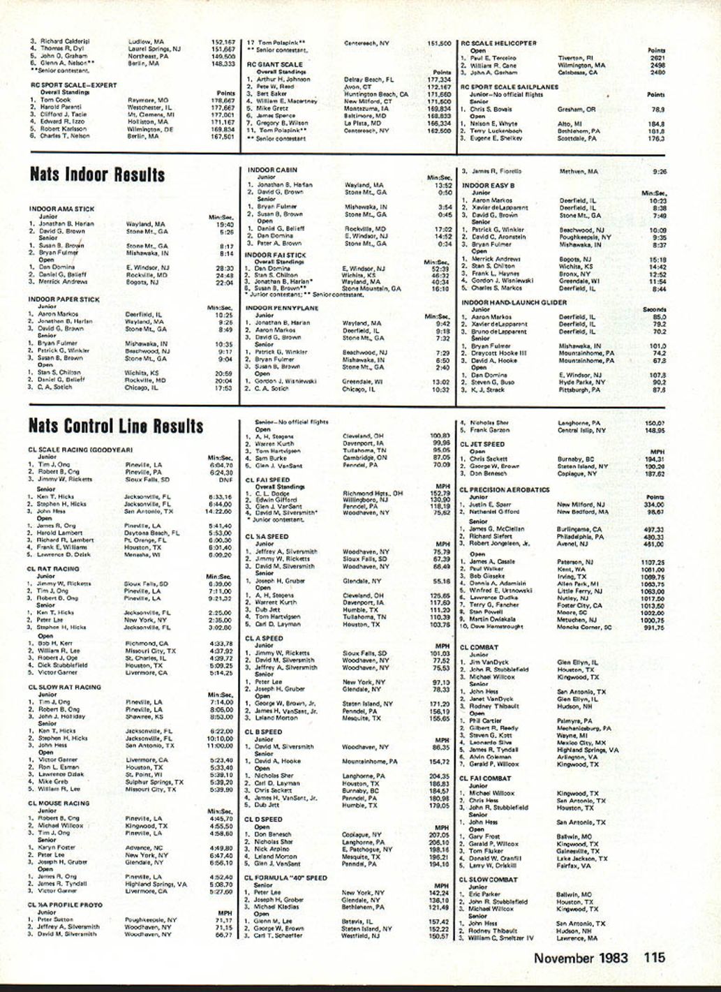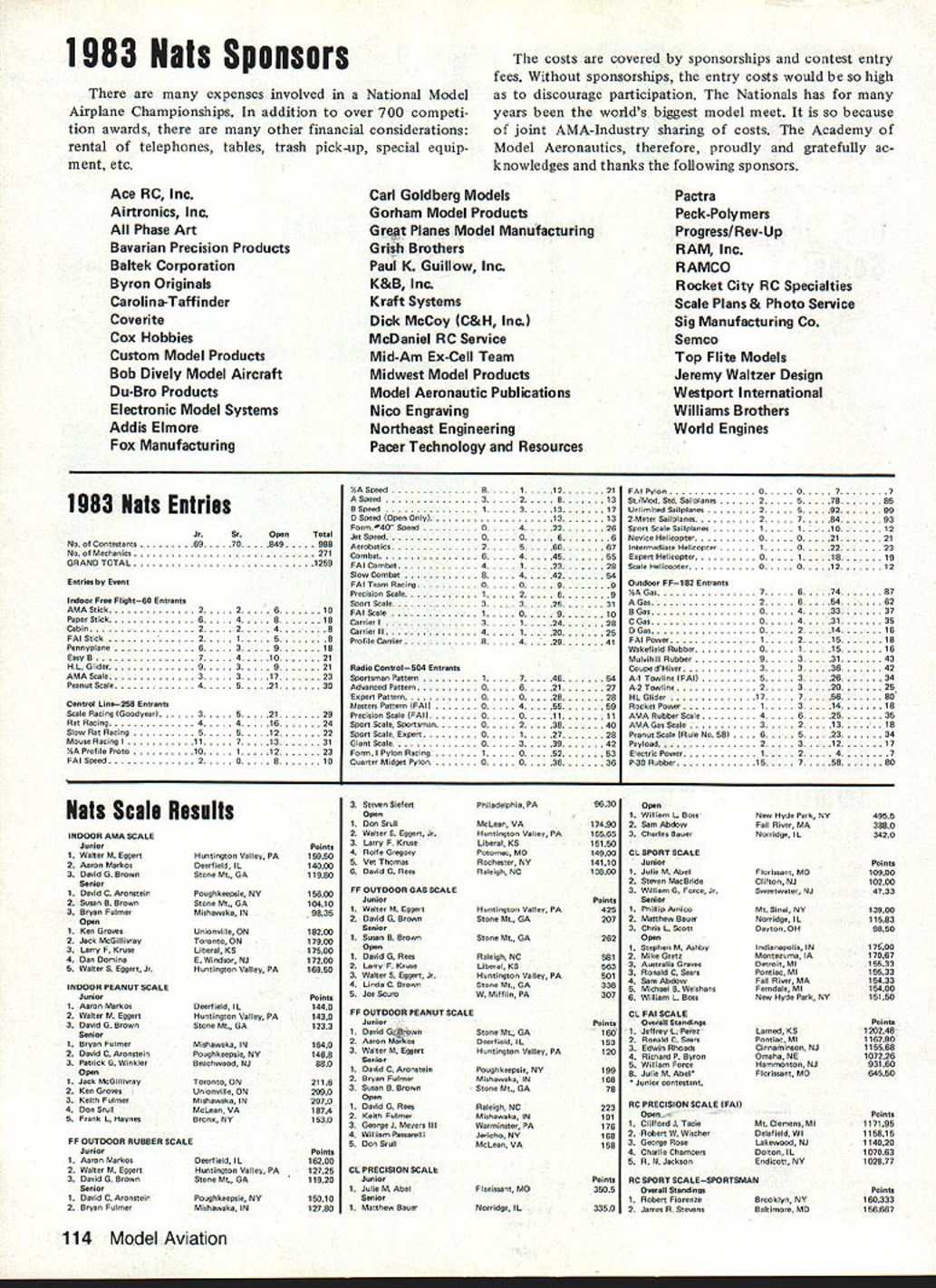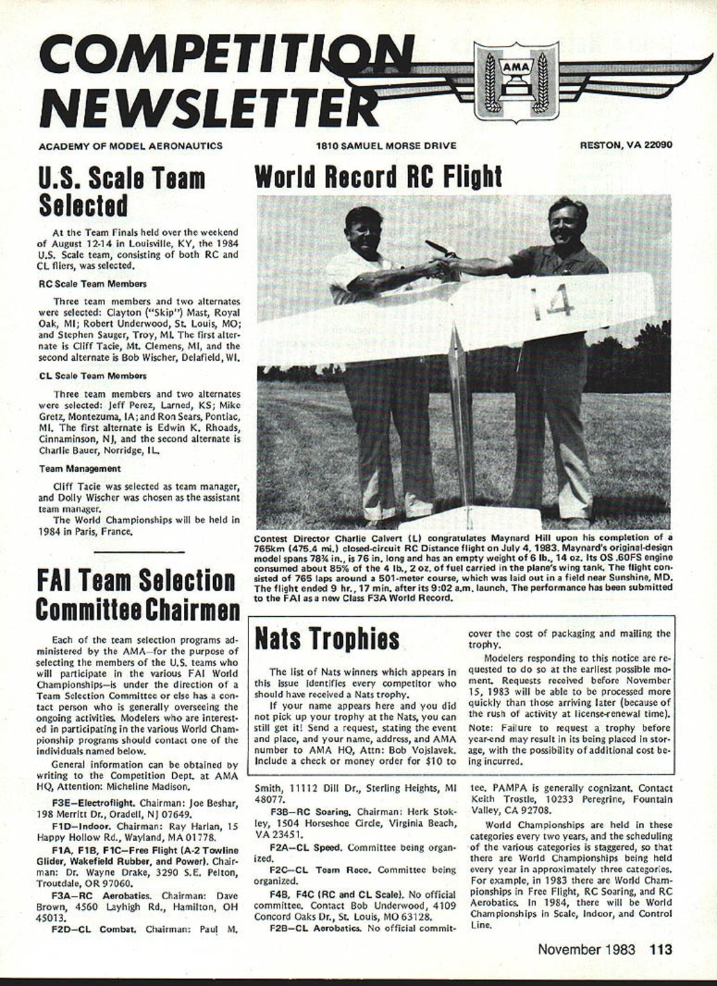 COM PETITIQ~gAM NE WSLETTEW1F~ ACADEMY OF MODEL AERONAUTICS 1810 SAMUEL MORSE DRIVE US Scale Team Selected Team Finals held over weekend August 12-14 Louisville KY 1984 US Scale team consisting both RC CL fliers selected RC Scale Team Members Three team members two alternates selected Clayton Skip Mast Royal Oak MI Robert Underwood St Louis MO Stephen Sauger Troy Ml first alter nate Cliff Tacie Mt Clemens Ml second alternate Bob Wischer Delafield WI CL Scale Team Members Three team members two alternates selected Jeff Perez Lamed KS Mike Gretz Montezuma IA Ron Sears Pontiac Ml first alternate Edwin K Rhoads Cinnaminson NJ second alternate Charlie Bauer Norridge IL Team Management Cliff Tacie selected team manager Dolly Wischer chosen assistant team manager World Championships will held 1984 Paris France FAl Team Selection Committee Chairmen team selection programs ad ministered AMAfor purpose selecting members US teams will participate various FAI World Championshipsis under direction Team Selection Committee else has con tact person generally overseeing ongoing activities Modelers interest ed participating various World Cham pionship programs should contact individuals named below General information can obtained writing Competition Dept AMA HQ Attention Micheline Madison F3EElectroflight Chairman Joe Beshar 198 Merritt Dr Oradell NJ 07649 FiDIndoor Chairman Ray Harlan 15 Happy Hollow Rd Wayland MA 01778 FlA FiB FiCFree Flight A-2 Towline Glider Wakefield Rubber Power Chair man Dr Wayne Drake 3290 SE Pelton Troutdale OR 97060 F3ARC Aerobatics Chairman Dave Brown 4560 Layhigh Rd Hamilton OH 45013 F2DCL Combat Chairman Paul M World Record DC Flight Hats Trophies list Nats winners appears issue identifies competitor should have received Nats trophy name appears did pick up trophy Nats can still get Send request stating event place name address AMA number AMA HQ Attn Bob Voislavek Include check money order $10 Smith 11112 Dill Dr Sterling Heights Ml 48077 F3BRC Soaring Chairman Herk Stok ley 1504 Horseshoe Circle Virginia Beach VA 23451 F2ACL Speed Committee being organ ized F2CCL Team Race Committee being organized F4B F4C RC CL Scale No official committee Contact Bob Underwood 4109 Concord Oaks Dr St Louis MO 63128 F28CL Aerobatics No official commitcover cost packaging mailing trophy Modelers responding notice re quested earliest possible mo ment Requests received before November 15 1983 will able processed quickly arriving later because rush activity license-renewal time Note Failure request trophy before year-end may result its being placed stor age possibility additional cost ing incurred tee PAMPA generally cognizant Contact Keith Trostle 10233 Peregrine Fountain Valley CA 92708 World Championships held categories two years scheduling various categories staggered World Championships being held year approximately three categories example 1983 World Cham pionships Free Flight RC Soaring RC Aerobatics 1984 will World Championships Scale Indoor Control Line November 1983 113 RESTON VA 22090 Contest Director Charlie Calvert L congratulates Maynard Hill upon nes compieman 01 765km 4754 mi closed-circuit RC Distance flight July 4 1983 Maynards original-design model spans 78% 76 long has empty weight 6 lb 14 oz Its OS 60F5 engine consumed about 85% 4 lb 2 oz fuel carried planes wing tank flight con sisted 765 laps around 501-meter course laid out field near Sunshine MD flight ended 9 hr 17 mm after its 902 am launch performance has submitted FAI new Class F3A World Record 1983 Hats Sponsors expenses involved National Model Airplane Championships addition over 700 competi tion awards other financial considerations rental telephones tables trash pick-up special equip ment etc costs covered sponsorships contest entry fees Without sponsorships entry costs would high discourage participation Nationals has years worlds biggest model meet because joint AMA-Industry sharing costs Academy Model Aeronautics therefore proudly gratefully ac knowledges thanks following sponsors Ace RC Inc Airtronics Inc Phase Art Bavarian Precision Products Baltek Corporation Byron Originals Carolina-Taffinder Coverite Cox Hobbies Custom Model Products Bob Dively Model Aircraft Du-Bro Products Electronic Model Systems Addis Elmore Fox Manufacturing 1903 Nuts Entries JrSrOpenTotel No Contestants6970849988 No Meshonics271 GRANOTOTAL1259 Entries Ersent Indoor Free FlightSO Entrants AMA Stick22610 Paper Stick64818 Cabin2248 FAI Stick2I58 Fcenyplorsr63918 Easy B41021 HL Glider3921 AMA Stoic331723 Feonutocole4S2130 Control Line258 Entrants Stoic Racing IGoodyrori3S2129 Rot Rocing24 Slow Rot Racing551222 Moose Rocirrg I71331 YeA Profile Pratt1011223 PAiSpend2iS Carl Goldberg Models Gorham Model Products Great Planes Model Manufacturing Grish Brothers Paul K Guillow Inc K&B Inc K raft Systems Dick McCoy C&H Inc McDaniel RC Service Mid-Am Ex-Cell Team Midwest Model Products Model Aeronautic Publications Nico Engraving Northeast Engineering Pacer Technology Resources Speed8121 Opted32913 B Spend131312 O Spned Open Only13 Forrn40 Spend042226 Jet SpendS86 Arroba286062 Cowbat644555 PAl Coerbet412328 Slow Combat844254 FAlTeern Racing099 Precision Scale1269 Sport Scale332531 PAl Stole110 Carrier I312428 Carrierli12025 Profile Carrier842941 Radio Control984 Entrants Sporecoran Pattern1254 AdvonoedPottere062127 hopert Pattoro002828 Masters Pattern FAllo89 Precision Scale PAll0011 Sport Scale SportenranII240 Sport Scale Sopert0128 Giant Scale033942 Fore Pylon Racing105253 Guarter Midget Pylon036 Pactra Peck-Polymers Progress/Rev-Up RAM Inc RAMCO Rocket City RC Specialties Scale Plans & Photo Service Sig Manufacturing Co Semco Top Flite Models Jeremy Waltzer Design Westport International Williams Brothers World Engines PAl Pylon 027 St/Mod Sed Sailplanes2S7888 Unlirnitod Soilplanes59299 2Meter Sailplane379493 Sport Scale Sailplants11012 Notion Helicopter02121 lnterendiato Helicopter23 Expert Helicopter Scale Helicoptnr0S1312 Ootdoor PF1B2 