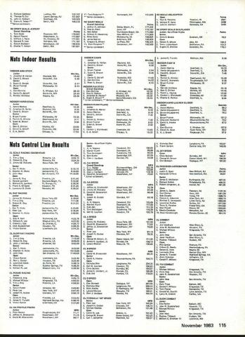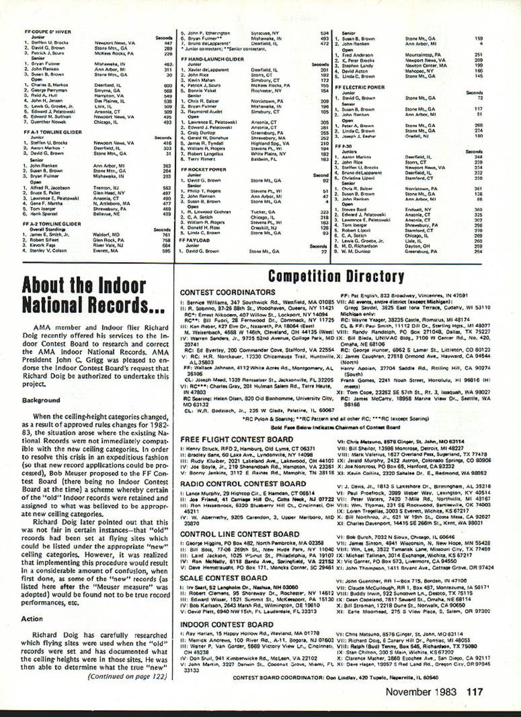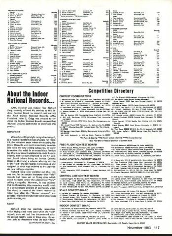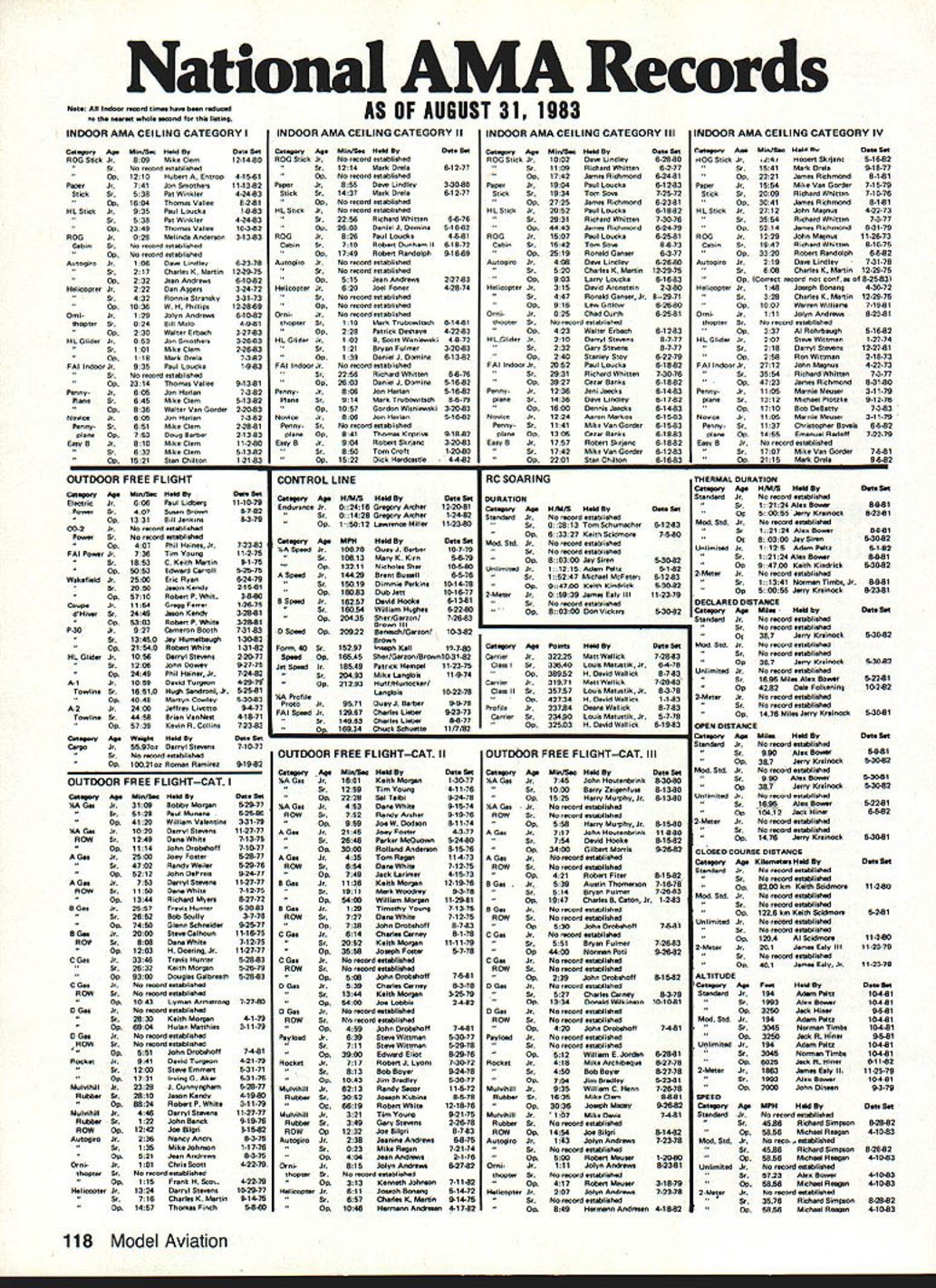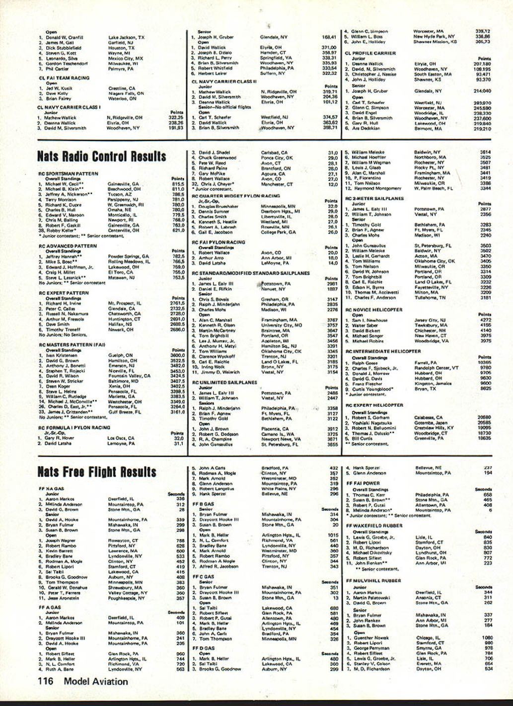 COM PETITIQ~gAM NE WSLETTEW1F~ ACADEMY OF MODEL AERONAUTICS 1810 SAMUEL MORSE DRIVE US Scale Team Selected Team Finals held over weekend August 12-14 Louisville KY 1984 US Scale team consisting both RC CL fliers selected RC Scale Team Members Three team members two alternates selected Clayton Skip Mast Royal Oak MI Robert Underwood St Louis MO Stephen Sauger Troy Ml first alter nate Cliff Tacie Mt Clemens Ml second alternate Bob Wischer Delafield WI CL Scale Team Members Three team members two alternates selected Jeff Perez Lamed KS Mike Gretz Montezuma IA Ron Sears Pontiac Ml first alternate Edwin K Rhoads Cinnaminson NJ second alternate Charlie Bauer Norridge IL Team Management Cliff Tacie selected team manager Dolly Wischer chosen assistant team manager World Championships will held 1984 Paris France FAl Team Selection Committee Chairmen team selection programs ad ministered AMAfor purpose selecting members US teams will participate various FAI World Championshipsis under direction Team Selection Committee else has con tact person generally overseeing ongoing activities Modelers interest ed participating various World Cham pionship programs should contact individuals named below General information can obtained writing Competition Dept AMA HQ Attention Micheline Madison F3EElectroflight Chairman Joe Beshar 198 Merritt Dr Oradell NJ 07649 FiDIndoor Chairman Ray Harlan 15 Happy Hollow Rd Wayland MA 01778 FlA FiB FiCFree Flight A-2 Towline Glider Wakefield Rubber Power Chair man Dr Wayne Drake 3290 SE Pelton Troutdale OR 97060 F3ARC Aerobatics Chairman Dave Brown 4560 Layhigh Rd Hamilton OH 45013 F2DCL Combat Chairman Paul M World Record DC Flight Hats Trophies list Nats winners appears issue identifies competitor should have received Nats trophy name appears did pick up trophy Nats can still get Send request stating event place name address AMA number AMA HQ Attn Bob Voislavek Include check money order $10 Smith 11112 Dill Dr Sterling Heights Ml 48077 F3BRC Soaring Chairman Herk Stok ley 1504 Horseshoe Circle Virginia Beach VA 23451 F2ACL Speed Committee being organ ized F2CCL Team Race Committee being organized F4B F4C RC CL Scale No official committee Contact Bob Underwood 4109 Concord Oaks Dr St Louis MO 63128 F28CL Aerobatics No official commitcover cost packaging mailing trophy Modelers responding notice re quested earliest possible mo ment Requests received before November 15 1983 will able processed quickly arriving later because rush activity license-renewal time Note Failure request trophy before year-end may result its being placed stor age possibility additional cost ing incurred tee PAMPA generally cognizant Contact Keith Trostle 10233 Peregrine Fountain Valley CA 92708 World Championships held categories two years scheduling various categories staggered World Championships being held year approximately three categories example 1983 World Cham pionships Free Flight RC Soaring RC Aerobatics 1984 will World Championships Scale Indoor Control Line November 1983 113 RESTON VA 22090 Contest Director Charlie Calvert L congratulates Maynard Hill upon nes compieman 01 765km 4754 mi closed-circuit RC Distance flight July 4 1983 Maynards original-design model spans 78% 76 long has empty weight 6 lb 14 oz Its OS 60F5 engine consumed about 85% 4 lb 2 oz fuel carried planes wing tank flight con sisted 765 laps around 501-meter course laid out field near Sunshine MD flight ended 9 hr 17 mm after its 902 am launch performance has submitted FAI new Class F3A World Record 1983 Hats Sponsors expenses involved National Model Airplane Championships addition over 700 competi tion awards other financial considerations rental telephones tables trash pick-up special equip ment etc costs covered sponsorships contest entry fees Without sponsorships entry costs would high discourage participation Nationals has years worlds biggest model meet because joint AMA-Industry sharing costs Academy Model Aeronautics therefore proudly gratefully ac knowledges thanks following sponsors Ace RC Inc Airtronics Inc Phase Art Bavarian Precision Products Baltek Corporation Byron Originals Carolina-Taffinder Coverite Cox Hobbies Custom Model Products Bob Dively Model Aircraft Du-Bro Products Electronic Model Systems Addis Elmore Fox Manufacturing 1903 Nuts Entries JrSrOpenTotel No Contestants6970849988 No Meshonics271 GRANOTOTAL1259 Entries Ersent Indoor Free FlightSO Entrants AMA Stick22610 Paper Stick64818 Cabin2248 FAI Stick2I58 Fcenyplorsr63918 Easy B41021 HL Glider3921 AMA Stoic331723 Feonutocole4S2130 Control Line258 Entrants Stoic Racing IGoodyrori3S2129 Rot Rocing24 Slow Rot Racing551222 Moose Rocirrg I71331 YeA Profile Pratt1011223 PAiSpend2iS Carl Goldberg Models Gorham Model Products Great Planes Model Manufacturing Grish Brothers Paul K Guillow Inc K&B Inc K raft Systems Dick McCoy C&H Inc McDaniel RC Service Mid-Am Ex-Cell Team Midwest Model Products Model Aeronautic Publications Nico Engraving Northeast Engineering Pacer Technology Resources Speed8121 Opted32913 B Spend131312 O Spned Open Only13 Forrn40 Spend042226 Jet SpendS86 Arroba286062 Cowbat644555 PAl Coerbet412328 Slow Combat844254 FAlTeern Racing099 Precision Scale1269 Sport Scale332531 PAl Stole110 Carrier I312428 Carrierli12025 Profile Carrier842941 Radio Control984 Entrants Sporecoran Pattern1254 AdvonoedPottere062127 hopert Pattoro002828 Masters Pattern FAllo89 Precision Scale PAll0011 Sport Scale SportenranII240 Sport Scale Sopert0128 Giant Scale033942 Fore Pylon Racing105253 Guarter Midget Pylon036 Pactra Peck-Polymers Progress/Rev-Up RAM Inc RAMCO Rocket City RC Specialties Scale Plans & Photo Service Sig Manufacturing Co Semco Top Flite Models Jeremy Waltzer Design Westport International Williams Brothers World Engines PAl Pylon 027 St/Mod Sed Sailplanes2S7888 Unlirnitod Soilplanes59299 2Meter Sailplane379493 Sport Scale Sailplants11012 Notion Helicopter02121 lnterendiato Helicopter23 Expert Helicopter Scale Helicoptnr0S1312 Ootdoor PF1B2 