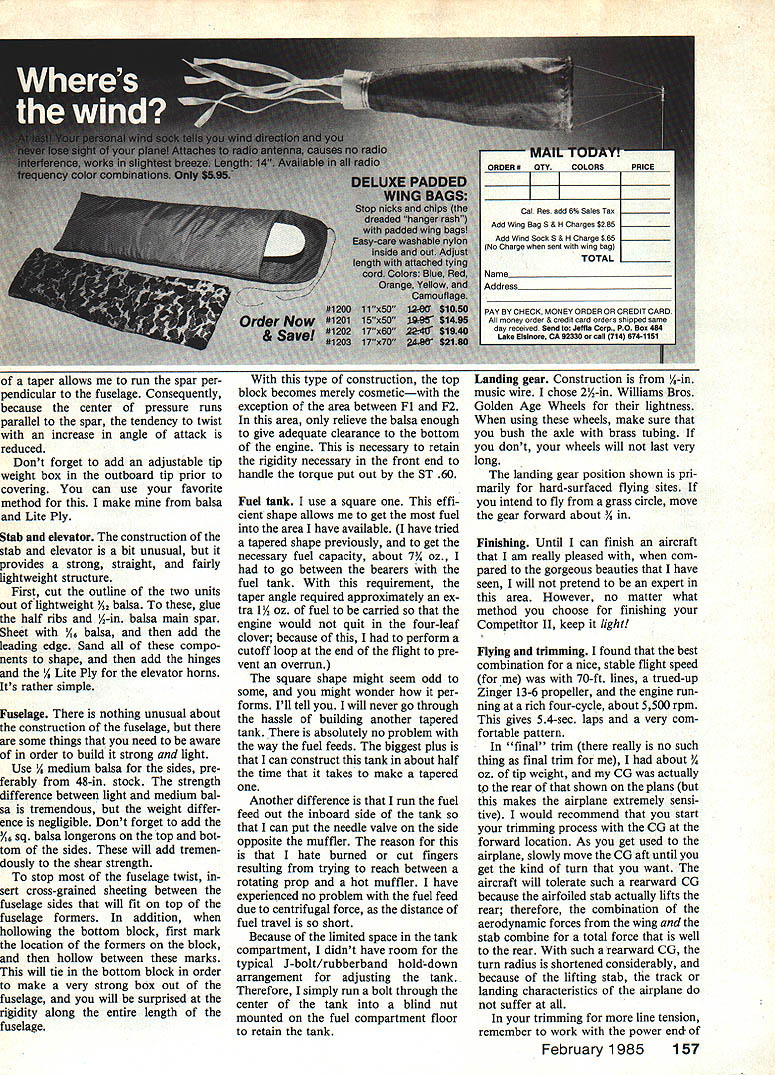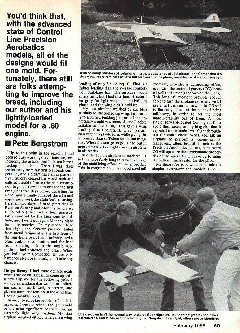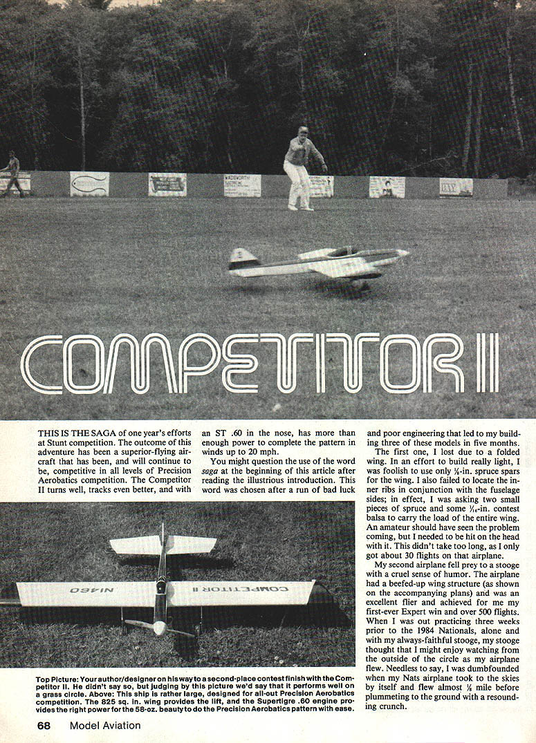 THIS IS THE SAGA years efforts Stunt competition outcome adventure has superior-flying air craft has will continue competitive levels Precision Aerobatics competition Competitor II turns well tracks better ST 60 nose has enough power complete pattern winds up 20 mph might question use word saga beginning article after reading illustrious introduction word chosen after run bad luck poor engineering led build ing three models five months first lost due folded wing effort build really light foolish use A-in spruce spars wing also failed locate ner ribs conjunction fuselage sides effect asking two small pieces spruce some /6-in contest balsa carry load entire wing An amateur should have seen problem coming needed hit head didnt take too long got about 30 flights airplane second airplane fell prey stooge cruel sense humor airplane beefed-up wing structure shown accompanying plans excellent flier achieved first-ever Expert win over 500 flights out practicing three weeks prior 1984 Nationals alone always-faithful stooge stooge thought might enjoy watching outside circle airplane flew Needless say dumbfounded Nats airplane took skies itself flew almost mile before plummeting ground resound ing crunch 68Model Aviation Top Picture Yourauthor/designer hiswayto second-place conteatfinish Com petitor II didnt say judging picture wed say performs well grass circle Above ship rather large designed all-out Precision Aerobatics competition 825 sq wing provides lift Supertigre 60 engine pro vides right power forthe 58-oz beautyto Precision Aerobatics pattern ease Youd think advanced state Control Line Precision Aerobatics models designs would fit mold tunately still folks attemp ting improve breed including author lightly-loaded model 60 engine Pete Bergstrom Up point season busy working various projects including article did have backup plane built three weeks away first Nationals com petition didnt have airplane fly quickly cleared workbench enlisted aid some friends Construc tion began flew model first time just three days before departing Reno finally finished trim appearance work night before leaving put two days hard practicing Reno Sunday Monday found out unneces sarily spooked high density alti tude went out again Monday night practice second flight night elevator pushrod failed metal fatigue after first loop four-leaf clover foolishly used brass quik-link connector heat soldering music wire pushrod softened brass build Competitor II use hardened steel link dont take chances Design theory some definite goals sat down last fall come up new airplane following year wanted airplane would turn blind ing corners track well penetrate give line tension wind could possibly need order solve problem blind ing turn went what thought would significant contribution extremely light wing loading first airplane weighed 49 oz giving wing loading 85 oz/sq ft lighter loading average competi tion Sailplane has airplane would surely turn sacrificed structural integrity light weight building phase wing didnt hold up next airplane weighed 57 oz due partially beefed-up wing ly rushed building job un necessary weight removed lacked suitable contest balsa gave wing loading 101 oz/sq ft provid ed very acceptable turn giving ship sufficient structural integ rity stooge let go put approximately 175 flights airplane six weeks order airplane track well left nose fairly long take advantage stabilizing effect propeller conjunction good-sized tail moment provides dampening effect center gravity CG locat ed well rear shown plans long tail moment provides enough force turn airplane extremely well prefer fly airplanes CG well rear almost point being tail-heavy order get maneuverability out nice stable forward-located CG great sport flier racer anything else expected maintain level flight through out entire circle ask airplane perform violent set maneuvers albeit beautiful such Precision Aerobatics pattern rearward CG will optimize aerodynamic proper ties aircraft make performing pattern much easier pilot theory good wind penetration simple overpower model could February 198569 Stunters today offering appearance jet aircraft Competitor Ils side view reminiscent full-size aerobatics plane provides welcome relief Upside-down isnt normal way start Supertigre 60 contest jitters dont get em helped cause flooded engine Bergstrom right others unidentified have sharpened leading edge would have degraded turning ability created early stall point fore opted go thick wing sec tion blunt nose allow airplane perform expectations simply put enough horsepower bully way through overhead figures pattern wind ST 60 chosen because brute horsepower 05 Max 45 has horsepower ST 60 rather because has usable power torque speed Stunt fliers like run engines size Competitor II allows run 13-in props associated yaw problems common large pro pellersand calm conditions 14-in props well does wonders line tension well turning usable power wind penetration subject line ten sion will notice have cluded movable rudder plane nor rudder offset time feel need either features build crooked fuselage straight fuselage rudder trim adds unwanted yawing motion makes difficulty trimming model phases flight Cowl design provides adequate cooling line tension comes engine power True adjusting lead-outs can provide some tension certain parts pattern cannot man ufacture line tension method same light can add pounds tip weight improve tension top will able avoid dropping wing good hard corner Its simple dont have line tension basic airframe/power plant combination will never manufacture will always have settle compromised situation best Construction Although airplane difficult build designed beginner Rather designed expert flier wants edge competition advanced flier looking move expert ranks Therefore am going clude blow-by-blow description construction rather Ill highlight im portant points Wing wing basic D-tube construc tion landing gear blocks secured 1A ply doublers W4 W6 lead-ou