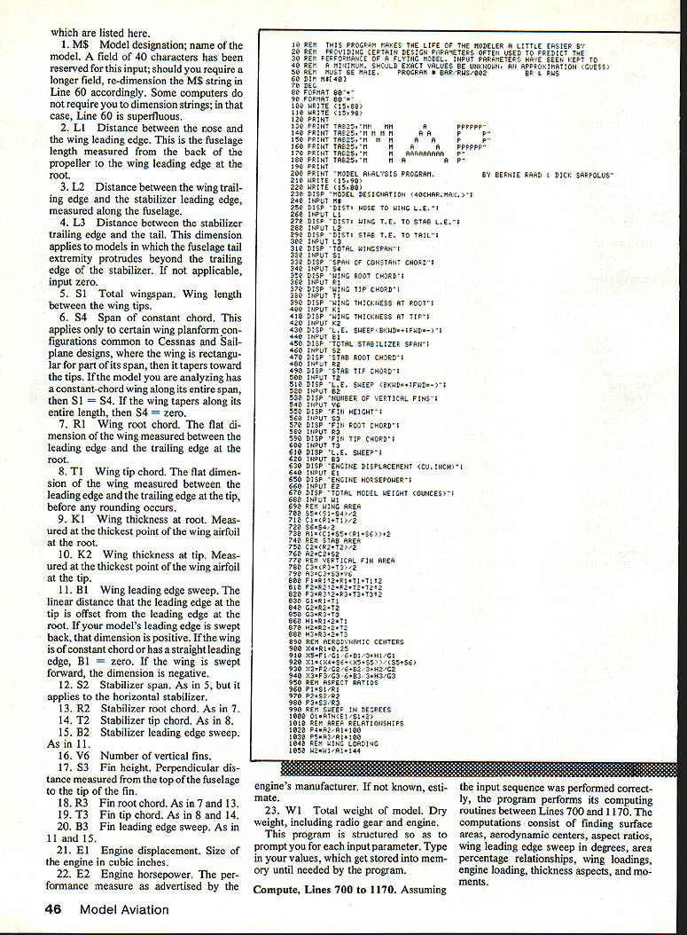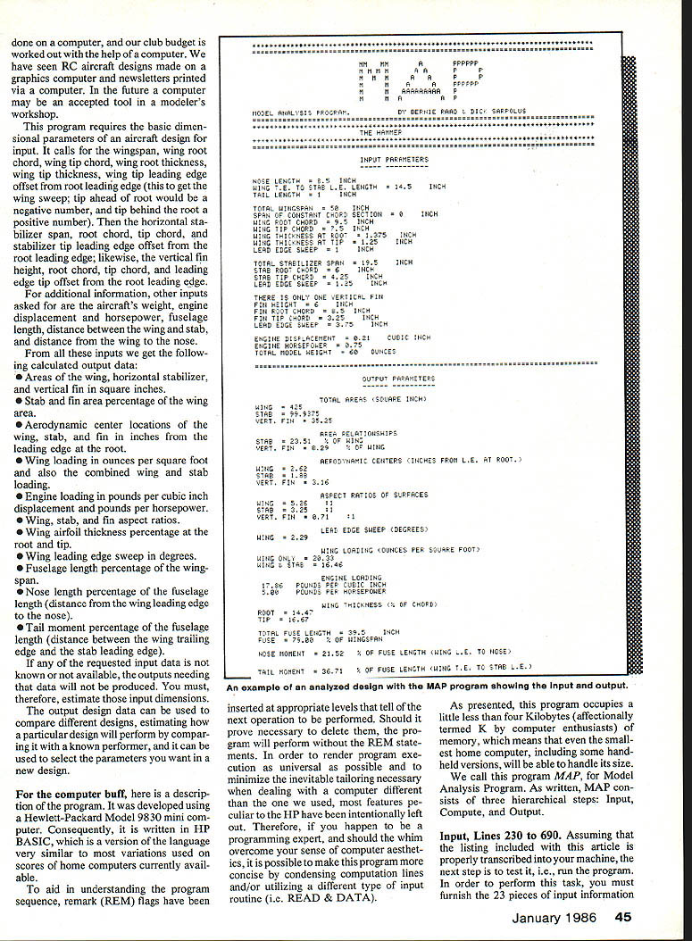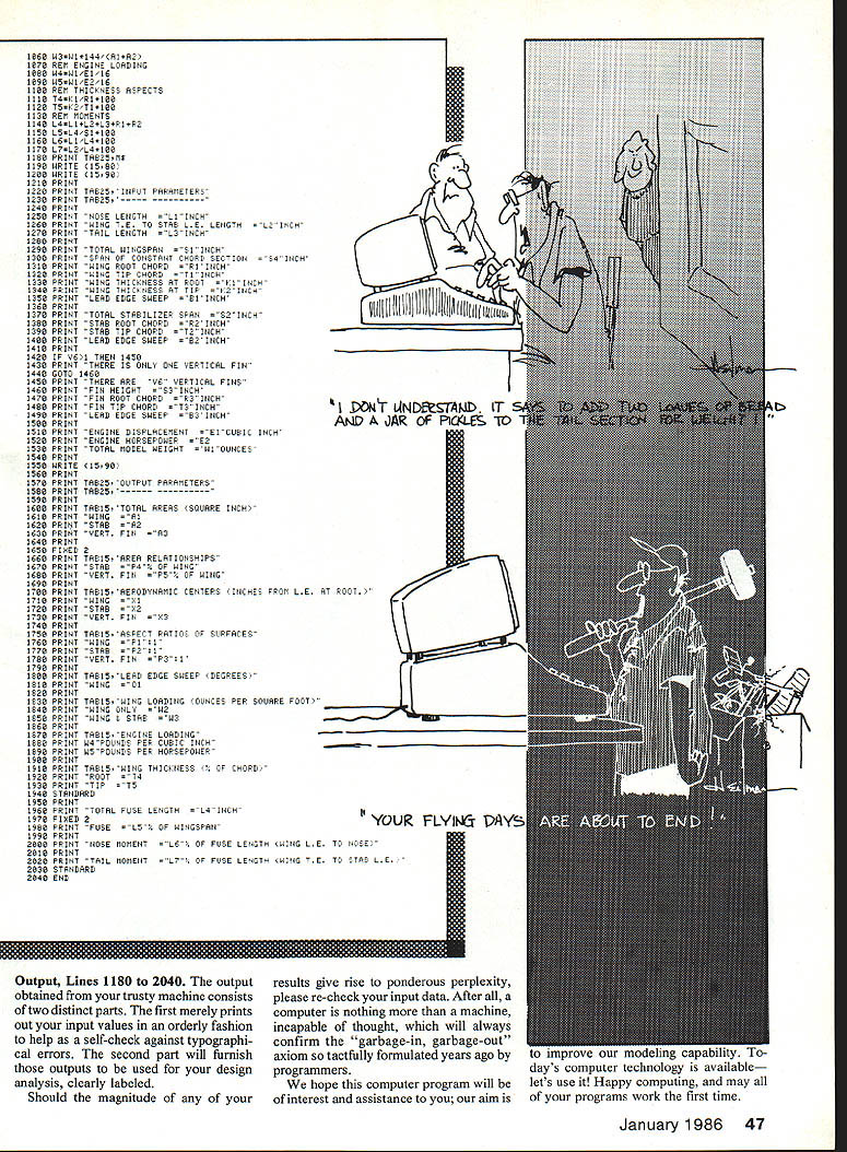 EillhAEiTEEN [N[LWIll ForAnalysis Comparison OtAircraft Designs programusing parameters RC airplane analyze its characteristics relative othersmay have dusting off keyboard firing up printer again dont have computer read anyway information may give insight important factors RC aircraft design U Dick Sarpolus Bernie Raad RESPONSE computer program canard aircraft design assistance present ed June 1984 issue ModelAvia tion has positive enthusiastic Apparently assumption modelers have home computers want use modeling purposes cor rect program put good use assisting design new canard Pattern aircraft published Flying Models magazine Since have developed another computer program feel can helpful modelers does airplane perform better another What changes design make better Which airplane should build next Whether scratch-build magazine plans design own aircraft build kits questions prob ably familiar ones form another theyre basis discussions flying field club meetings hobby shops modelers workshops answers found dimensions aircraft analysis dimensions Looking aircraft designs known good performers can determine surface areas relationships areas other wing loading power loading surface aspect ratios thick nesses moment arm lengths etc answers gain observations can used compare different aircraft designs determine design characteristics whichever type aircraft prefer can look other aircraft designs having similar characteristics expect perform similarly can also basis own design work providing known set characteristics safe work Having design points start can vary particular design parameters pursue type performance want Rather design ing eyeball little effort can done using some known design points youll have better chance success deviating standard de signs may come up better aircraftor may find experience proven parameters still best Design analysisdetermining areas ratios percentages etcisnt difficult can done hand help simple calculator rapid pro liferation home computers thought worth effort develop simple com puter program design analysis work us would save time make possible analyze designs quickly establishing larger data base program written simple form BASIC can handled home computer capable accepting BASIC langnage developed using Hewlett-Packard computer some commands may have changed de pending what type system have efforts aimed RC aircraft design program could tailored other modeling categories including particular design characteristics important performance certain model type own club typical computers getting homes modelers club newsletters mailing labels 44 Model Aviation AccoRDING TO ITS OWN FIGURES IT SHOULr MAKE PFECT PL4SNEP computer club budget worked out help computer have seen RC aircraft designs made graphics computer newsletters printed via computer future computer may accepted tool modelers workshop program requires basic dimen sional parameters aircraft design input calls wingspan wing root chord wing tip chord wing root thickness wing tip thickness wing tip leading edge offset root leading edge get wing sweep tip ahead root would negative number tip behind root positive number horizontal sta bilizer span root chord tip chord stabilizer tip leading edge offset root leading edge likewise vertical fin height root chord tip chord leading edge tip offset root leading edge additional information other inputs asked aircrafts weight engine displacement horsepower fuselage length distance between wing stab distance wing nose inputs get follow ing calculated output data Areas wing horizontal stabilizer vertical fin square inches Stab fin area percentage wing area Aerodynamic center locations wing stab fin inches leading edge root Wing loading ounces per square foot also combined wing stab loading Engine loading pounds per cubic inch displacement pounds per horsepower Wing stab fin aspect ratios Wing airfoil thickness percentage root tip Wing leading edge sweep degrees Fuselage length percentage wing span Nose length percentage fuselage length distance wing leading edge nose Tail moment percentage fuselage length distance between wing trailing edge stab leading edge requested input data known available outputs needing data will produced must therefore estimate input dimensions output design data can used compare different designs estimating particular design will perform compar ing known performer can used select parameters want new design computer buff descrip tion program developed using Hewlett-Packard Model 9830 mini com puter Consequently written HP BASIC version language very similar variations used scores home computers currently avail able aid understanding program sequence remark REM flags have ,********#*********************** ============ MMMM MMMM MMM MM MM MM PPPPPP AA P P A P P A PRPPPP AAAAAAAAA P A A P MODEL ANALYSIS PROOFANBY BERNIE FAME C DICK SHFFOUS THE HAMMEP IAPLIT PARAMETERS NOSE LENGTH CH WING TE TO STAB LE LENGTH NCH TAIL LENGTH 1INCH TOTAL WINGSPAN CH SPAN OF CONSTANT CHOPS SECTION H WING ROOT CHORD CH WING TIP CHORD CH WING THICKNESS AT ROOT 1375INCH WING THICKNESS AT TIP NCH LEAD EDGE SWEEP 1INCH TOTAL STABILIZER SPAN NCH STAB ROOT CHORD H STAB TIP CHORD * 425INCH LEAD EDGE SWEEP NCH THERE IS ONLY ONE VERTICAL PIN FIN HEIGHT H FIN ROOT CHORD CH FIN TIP CHORD NCH LEAD EDGE SWEEP NCH ENGINE DISPLACEMENT 821CUBIC INCH ENGINE HORSEPOWEP TOTAL MODEL WEIGHT 88OUNCES OUTPUT FARAVETERS WING 425 STAB999275 SEPT FIN s 2525 TOTAL AREAS SOUA9E INCH APEN RELATIONSHIPS STAB OF WING SEPT FIN OF WING WING 282 STAB 188 SEPTFIN314 AERODYNAMIC CENTERS INCHES PROM L B AT ROOT ASPECT RATIOS OF SURFACES 1 8711 WING 528 STAB 225 VERT FIN LEAD EDGE SWEEP COEGREES WING WING LOADING OUNCES PER SOLIARE FOOT WING ONL2833 WING V STAB 1848 ENGINE LOADING 1784 POUNDS PER CUBIC INCH 588 POUNDS PEP HOPSEPOWER ROOT 1447 TIP WING THICKNESS HORD TOTAL FUSE LENGTH NCH PUSE7988OP WINGSPAN NOSE MOMENT 21525 OR FUSE LENGTH WING LE TO NOSE TAIL MOMENT 38715 OF FUSE LENGTH WING TB TO STAB