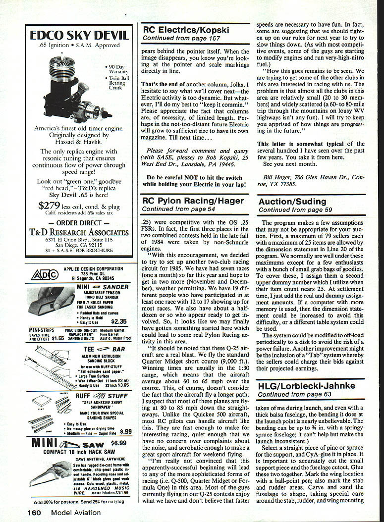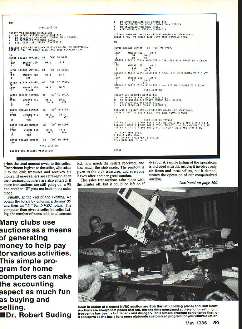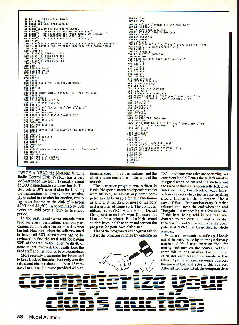 13 REM NYIC AUCTION PROGRAM 20 DIM P9825 13 PRINT TAEI1SNVRC AUCTION 40 PRINT 50 RINTERLECT THE DESIRED OPERATION 69 PRINTS TO INTER SELLERS AND AMOUNT DID 70 P118CM TO OALCULATE THE MONEY COMING TO SELLER Op PRINCNTO CALCULATE TEA NYRO HAUL 90 PRINTVIII CLEAR ALL RiLES CRAINSLI ie PRINT 113 PRINTSRLLRRS 179 GET GRE AND SELLERS 80GB ARE DONATIONS 120 PRuNE EATER 99 TO DUkE DACE INTO THIS COMMAND MODE 110 PRINT 140 INPUT A$ 153 ID A$ R TARN GOTO 210 160 ID *S TEEN GOTO 310 173 ID jM TERN GOTO 140 180 17 APN THEN GUTO 760 193 GOTO 33 200 REM 210 POE R1 TO GE 223 FOR 01 TO 25 230 LET PRD0 240 NEXT D 253 NEXT H 260 PRINT 270 PRINT ALL RILES NAVE DEEN CLEARED 280 PRINT 293 9020 30 NTER SELLER HOMIER CA99 TO STOP 320 INPUT H 333 LET DINTD 343 IT R98 THEN SOTO TO 353 SE 1U TEEN GOTO 30 360 LET D1 33 PRINT ITEM AMOUNT RID GA E 10 T 183 LET QPDI 390 IF 90 THEN IQYC 440 430 PRINT RTAH6QTAH6Q*Go*1 410 LET DD1 423 IF D25 THzA 450 430 GaTE 380 440 IF D26 TEEN 480 450 PRINT 460 PRINT SELLERIR ALRADY HAS 25 ITEMS SOLO 473 PRINT 403 GOTO 30 490 PRINT DTAD6 500 INPUT PRD Ill PRINT 523 GOTO 310 530 REM 540 PRINT ENTER ELLER NUMEEDCR 99 TO STOP 553 INPUT D 560 LET RINTRA 570 SR 198 THEN AUTO 30 583 IF 1H TARN GUTO 30 593 LET D1 600LET20 610 LET PS 620 PRINTIYZM"AMOGNT 15DTAD6GO 630 LET QPiD 643 SF 9B THEN GUTS 700 650PRINT DTi16QTAReQ'G 663LETTTQ 670LETPPQ*9 680LET191 6800020 630 700PHSNTSELLERH EAERIJ STEMS SOLE ROE $T 700PRINT GO C COMES TO P 720INPUT 733LETRINTR 740IFR0 THEN SUTO 140 753GOTO 570 763PRINT TAR15NMRC AUCTION TOTALS 770LETHi 703LHT30 790LETK0 000LET50 010LETH0 020LET81 030LET20 840LETQPIA 853 IV G3 TEEN 980 680 SR D1 THEN GOO 070 LET DR1 880 IV HGG THEN GOTO 020 890GOTO1090 BOO IV R79 TEEN 0020 1020 910 PHINTSALLERR SOLDD1 ITEMS POE UT 920PRINT OTT*9 AND NERO $T*o 930LET I1D1 940LET JJT 950LET ET*9 960LET HRT*1 8700020 870 980LIT 229 990LET DS*1 1000IA026THEN0020840 1010OCTO875 1020 PRINTOONATIONR SJLDAA1 STEMS FOR 9T 1030 PRINT NOEC ORT TEE 0 T 1040LET1151 1050LET332 1060 LET EET 1070 0020 870 1660 REM 1080 PRINT 1100 PAINT ITAMS HERA SOLE 1110 PRINT PRINTTOR URILERS RECEOEE9E 1130 PRINYRHC AECEIRED 1140 PRINT 1150 PRINT 1160 PRINT 1170 END READY TWICE YEAR Northern Virginia Radio Control Club NVRC has very well-attended auction Typically about $5000 merchandise changes hands club gets 10% commission handling transactions items sim ply donated club auction result ing income club between $400 $1500 Approximately 300 items sold over four- five-hour period past handwritten records kept transaction pur chasers paid club treasurer won bid However sellers wanted leave 300 transactions reviewed find total sold paying 90% total seller 40 sellers involved results took tired staff another hour two complete recently computer has used keep track sales settlement phase reduced about 15 min utes sellers provided itemized copy transactions club treasurer received master copy records computer program written Basic No special machine-dependent tricks utilized almost home com puter should usable function long has 32K memory printer some sort computer utilized NVRC old Digital Group system 60 wpm Kleinschmidt klunker printer Find high school student club enter convert program own clubs use Use program takes no great talent start program running entering St indicate sales occurring As item sold enter sellers number assigned entered auction amount successfully bid Two aides manually keep track trans action cross check just case anything should happen computerlike power failure Transaction entry rather relaxed until near end real bargains start coming feverish rate item being sold donated club invent number between 80 98 tells com puter NVRC will getting whole amount seller wants settle up break out entry mode entering dummy number 99 next enter M money turn printer enter sellers number computer calculates transaction involving seller prints item sequence number amount bid 90% number After items listed computer a Model Aviation RUN NUEC AUCTION SELECT TEA DESIRUD OPERATION S TO ENTER SELLERS AND AMCUNT MID M TO CALCULATE TEE MORAY COMINA TO SELLEE N TO CALCULATE THE NMRC HAUL K VILL CLEAR ALL FILES CAIEFUEI SELLERS 179 GET 905 ARC SELLEAS RESR ARE DONATIONS ENTER 99 TO BREAK RACE INTO TillS COMMAND MOOR 7S ENTERSELLER HUMMER 71 ITEMAMOUNT MID 1 ENTEESELLER NUMBER 73 ITEM UNT BID 1721 ENTERSELLER NUMBER 72 ITEM UNT RID 1 150 OR99 TO SlOP 905195 OR99 TO STOP 905lBS OR TO STOP 905195 S TO ENTER SELLERS ARC AMCURT MID M TO CALCULATE TEE MORAY COMING TO SELLER N TO CALCULATE THE NVAC HAUL K VILL CLEAR AEL FILES CAREFUSI SELLERS 179 GET 995 AND SELLERS 99DR ARM DONATIONS ENTER 99 TO BREAK BACK INTO THIS COMMAND MODE TM ENTER SELLER NUMBER SR 99 TO STOP 71 ITEMAMOUNT DID99 5 134 96 289 2 SELLER 1RED 2115115 SOLD MOB114 AID 99 5 COMES TO $ 1026 72 ITEM AMOUNT RID 99 7 1 1 531 2Mb E4 SELLER 2MAD 2i7DME SOLD PUB $ 579 ASS DR S lAMES TO $ 9179 73 ITIM AMOUNT DES 99 0 121 89 23 SELLAS SHAD 2SYRMS SOL4 909 4 ASS 50 9 CuMES TO 2 216 299 NARO AUCTION ENTER SELLER iAOMBER 23 ITEM 2 ENTERSELLER NUMBER 72 ITEM UNT RED 1 11 2 56 ENTERSELLER NUMBER 71 ITEM UNT MID 1 34 2 799 ENTER SELLER NUMBER 299 OR99 TO STOP AMOUNT BIDYR 510 5 2119921 73 SE99 TO STOP 9g5105 13919 OR99 TO STOP 905195 30634 OR99 TO STOP SELECT SEE DESIRUD OPBMACION S TO ENTER SRLCRRS AND AMOUNT BID M TO CALCULATA TAR MONET ODMING TO SELLER ATO CALCULATE TEE NUAC AAL NILL CLEAR AEL FILMS CAREFUL SELLABS 179 SIT 99% AND SELLERS 89NA ARE DONATIONS SiTR 99 TO ARTAK MACK INTO THIS COMMAND MODE ASRO AUCTION TSTALS SEILSA S SOLD 2 ITEMS RCA 114 ER GOT $ 1026 AND NADO $ 114 SRLLRR S SOLD 2 IYRMS FOR $ 579 HE GOT 5175 AND NIRO $ 975 SELLER SOIl U ITEMS FOR 24 RE GOT 216 AND NIRE $ 24 S ITEM NEBE SuLD 5979 AREA RID IRA AELLERS RECEIVED $ 17999 NAAu RACAIRES $ 1SS NYRE AUCTION READS SELECT TEE DESIRES OPERATION prints total amount owed seller printout ivento seller takes club treasurer receives money sellers settling up assigned numbers also entered transactions still going