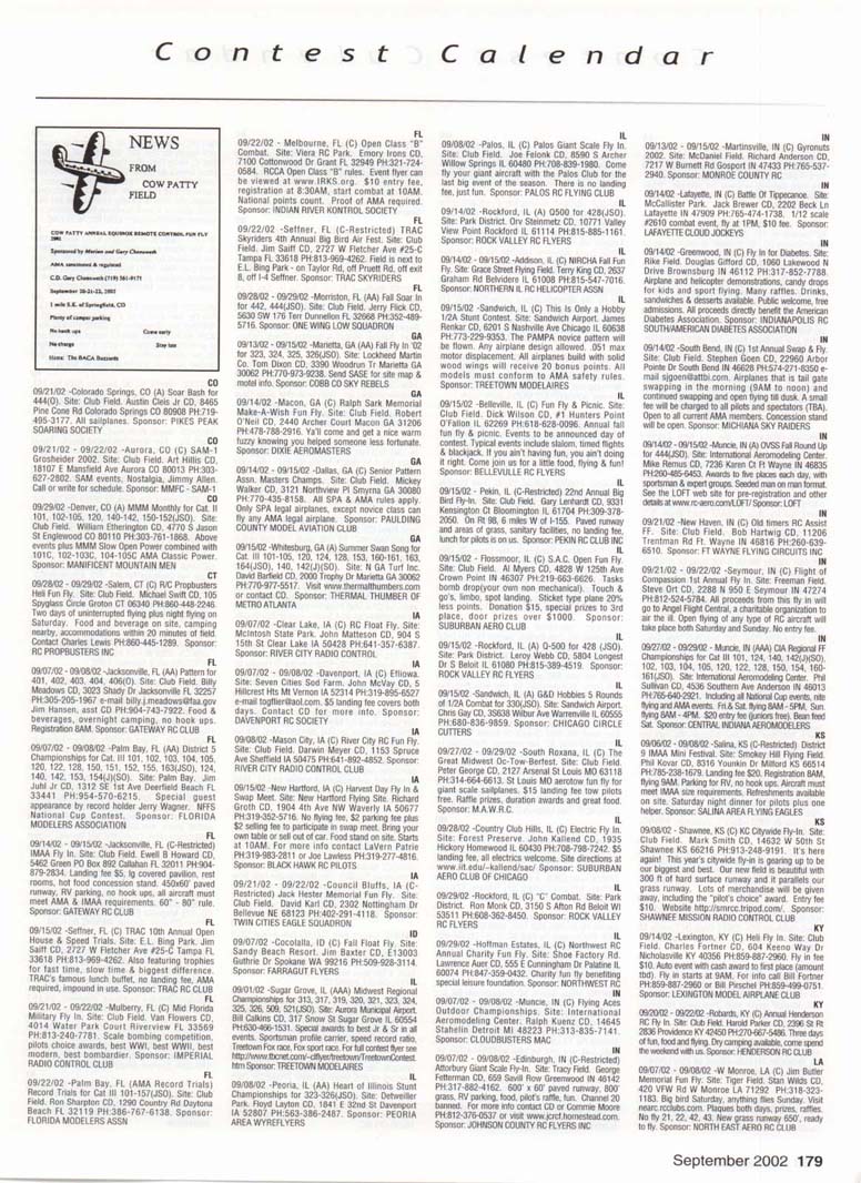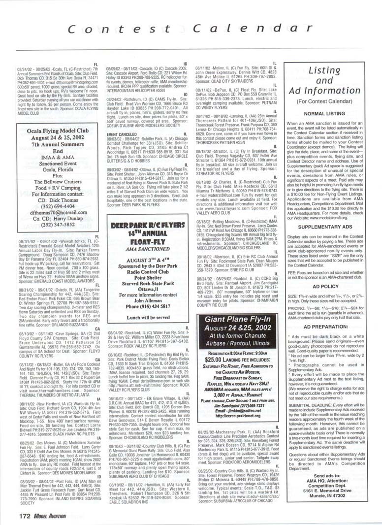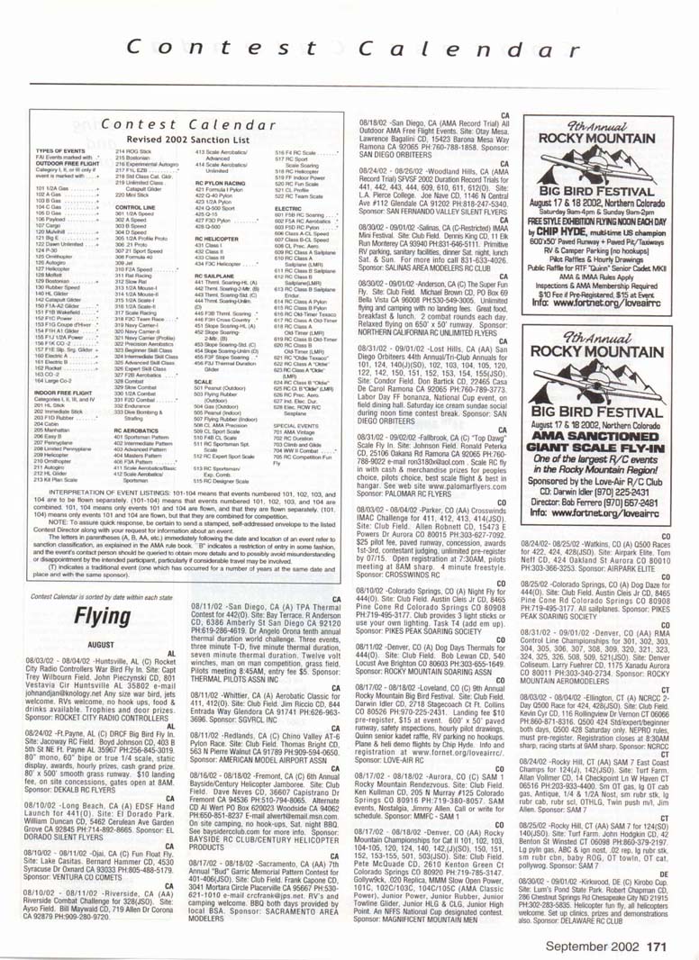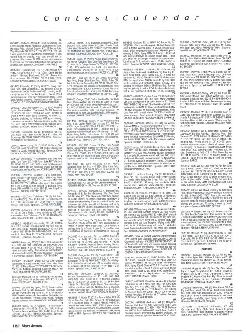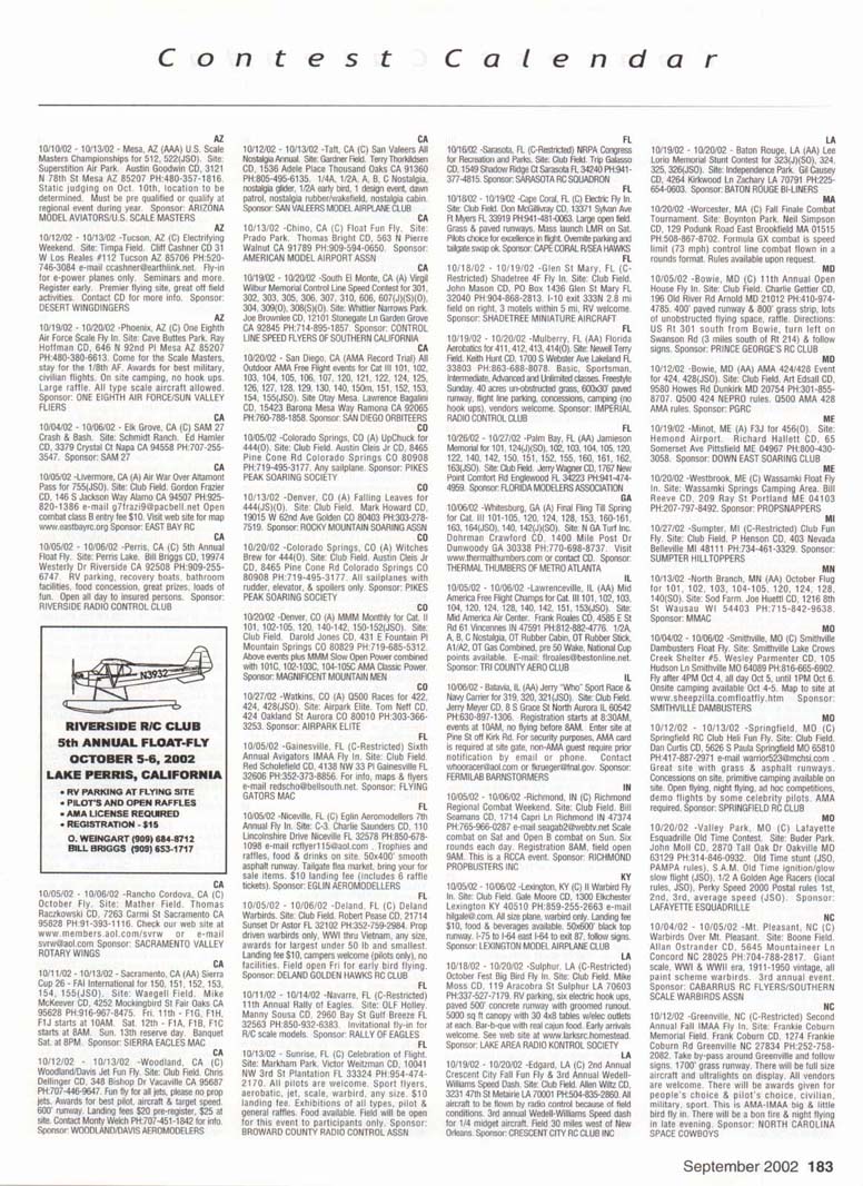 Contest Calendar Revised 2002 Sanction List TYPES OF EVENTS FAI Evenls marked wrth ' OUTDOOR FREE FLIGHT Category I, II, or III only if event is marked with * 101 1/2AGas .... 102AGas ....... . 103BGas ...... 104 C Gas ...... . 105 D Gas ....... 106 Payload .. ... - 107 Cargo 120 Mulvihill ....... . 121 Big E ...... . 122 Dawn Unlimited 124 P-30 125 Omithopler 126 Autogiro 127 Helicopter 128 Moflett 129 Bostonian ........+ 130 Rubber Speed 140 HL Glider 142 Catapult Glider 150 F A-A2 Glider . " 151 F B Wakefield . ." 152 F C Power ....... ' 153 F G Coupe tfHiver ' 154 F H Al Glider 155 F J 1/2A Power 156F KCO-2 . .. . 157 F E SJp. Srg. Glider + 160Eleclric A .........+ 161 EleclhcB .........+ 162 Rocket ..........+ 163 CO 2 164 Large Co-2 INDOOR FREE FLIGHT Categonesl.lt. III. and IV 201 HL Stick 202 Immediate Stick 203 F1D Rubber . . .' 204 Cabin 205 Manhattan 206 Easy B 207 Pennyplane 208 Limited Pennypiane 209 Helicopter 210Omithopter 211 Autogiro 212HLGlKter 213 Kit Plan Scale 214 HOG Stick 215Boslonian 216 Experimental Autogiro 217F1LEZB ..........' 218 Std Class Cat. GWr. 219UntimrtedQass. Catapult Glider 220 Mini Stick CONTROL LINE 301 1/2A Speed 302 A Speed 303 B Speed 304 D Speed 305 1/2A Profile Prolo 306 .21 Proto 307 21 Sport Speed 308 Formula 40 309 Jet 310 F2A Speed 311 Rat Racing 312 Slow Rat 313 1/2A Mouse-1 314 1/2A Mouse-11 315 1/2A Scate-l 316 1/2 A Scale-11 317 Sea le Racing 31B F2C Team Race 319 Navy Camer-l 320 Navy Camer-ll 321 Navy Carrier (Profile) 322 Precision Aerobatics 323 Beginner Skill Class 324 Intermedate Skill Class 325 Advanced Skill Class 326 Expert Skill Class 327 F2B Aerobatics 328 Combat 329 Stow Combal 330 1/2A Combat 331 F2D Combat. . ' 332 Endurance 333 Orve Bombing ft Slrafing RC AEROBATICS 401 Sportsman Pattern 402 Intermediate Pattern 403 Advanced Pattern 404 Masters Pattern 406 F3A Pattern . . . .' 411 Scale Aerobatics/Basic 412 Scate Aerobatcs/ Sportsman 413 Scale Aerobatics/ Advanced 414 Scale Aerobatics/ Unlimited RC PYLON RACING 421 Formula I Pylon 422 Q-40 Pylon 423 1/2A Pylon 424 Q-500 Sport 425Q-15 427 F3D Pylon . 428 Q-500 RC HELICOPTER 431 Class I 432 Class II 433 Class III 434 F3C Helicopter .....' RC SAILPLANE 441 Thrml. Soanng-HL (A) 442 Thrml Soanng-2-Mtr. (B) 443 Thrml. Soanng-Std. (C) 444 Thrrrt. Soaring-Unfm (D) 445 F3B Thrml Soanng • 446 F3H Cross Country / 451 Slope Soanng-HL (A) 452 Slope Soanng-2-Mtr. (B) 453 Slope Soanng-Std. (C) 454 Slope Soanng-Unkm (D) 455 F3F Slope Soanng .' 456 F3J Thermal Duration Glidei SCALE 501 Peanut (Outdoor) 503 Flying Rubber (Outdoor) 504 Gas (Outdoor) 505 Peanut (Indoor) 507 Flying Rubber (Indoor) 508 CL AMA Precision 509 CL Sport Scate 510 F4BCL Scale 511 RC Sportsman Spt Scale 512 RC Expert Sport Scale 513 RC Sportsman/ Exp. Comb. 515 RC Designer Scale 516 F4 RC Scale ......' 517 RC Sport Scale Soaring 518 RC Helicopter 519 FF Indoor Power 520 RC Fun Scale 521 CL Profile 522 RC Team Scale ELECTRIC 601 F5B RC Soanng . . . • 602 F5A RC Aerobatics ' 603 F5D RC Pyton . . . • 606 Class A-CL Speed 607 Class B-CL Speed 608 CL Prec. Aero 609 RC Class A Sailplane 610 RC Class A Sailplane (LMR) 611 RC Class B Sailplane 612 RC Class B SailplanelLMR) 613 RC Class B Sailplane Endur. 614 RC Class A Pylon 615 RC Class B Pylon 616RCOtd-TimerTexaco 6l7RCCIassAOId-Timer 618 RC Class A OkJ-Timer (LMR) 619RCCIassBCHd-Timer 620 RC Class B CHd-Timer (LMH) 621 RC "Oldie Texaco" 622 RC Class A "OWw" 623RCCIassA-Okfe" (LMR) 624 RC Class B "Oid.e11 625 RC a B"Otte"(LMR) 626 RC Prec Aero. 627 Ind. Etec Dur. 628 Etec. ROW RC Seaplane SPECIAL EVENTS 701 AMA Vintage 702 RC Duration 703 Climb and Glide 704 WWII Combat .....' 705 RC Competition Fun Fly INTERPRETATION OF EVENT LISTINGS: 101-104 means that events numbered 101. 102. 103, and 104 are to be flown separately. (101-104) means that events numbered 101, 102, 103. and 104 are combined. 101, 104 means only events 101 and 104 are flown, and that they are flown separately. (101, 104) means only events 101 and 104 are flown, but that they are combined for competition. NOTE: To assure quick response, be certain to send a stamped, self-addressed envelope to the listed Contest Director along with your request for information about an event. The letters in parentheses (A, B, AA, etc.) immediately following the date and location of an event refer to sanction classification, as explained in the AMA rule book B" indicates a restriction of entry in some fashion, and the event's contact person should be queried to obtain more details and to possibly avoid misunderstanding or disappointment by the intended participant, particularly if considerable travel may be involved. (T) indicates a traditional event (one which has occurred for a number of years at the same date and place and with the same sponsor) Contest Calendar is sorted by date within each state Flying AUGUST AL 08/03/02 - 08/04/02 -Huntsville. AL (C) Rocket City Radio Controllers War Bird Fly In. Site: Capt Trey Wilbourn Field. John Pieczynski CD. 801 Vestavia Cir Huntsville AL 35802 e-mail johnandjan@knology.net Any size war bird, jets welcome. RVs welcome, no hook ups, food & drinks available. Trophies and door prizes. Sponsor: ROCKET CITY RADIO CONTROLLERS AL 08/24/02 -Ft.Payne. AL (C) DRCF Big Bird Fly In. Site: Jacoway RC Field. Boyd Johnson CD, 403 B 5th St NE Ft. Payne AL 35967 PH:256-845-3019. 80" mono, 60" bipe or true 1/4 scale, static display, awards, hourly prizes, cash grand prize. 80' x 500' smooth grass runway. $10 landing fee, on site concessions, gates open at SAM. Sponsor: DEKALB RC FLYERS CA 08/10/02 -Long Beach, CA (A) EDSF Hand Launch for 441(0). Site: El Dorado Park-William Duncan CD, 5462 Cerulean Ave Garden Grove CA 92845 PH:714-892-8665. Sponsor: EL DORADO SILENT FLYERS CA 08/10/02 - 08/11/02 -Ojai. CA (C) Fun Float Fly. Site: Lake Casitas. Bernard Hammer CD, 4530 Syracuse Dr Oxnard CA 93033 PH:805-488-5179. Sponsor: VENTURA CO COMETS CA 08/10/02 - 08/11/02 -Riverside. CA (AA) Riverside 